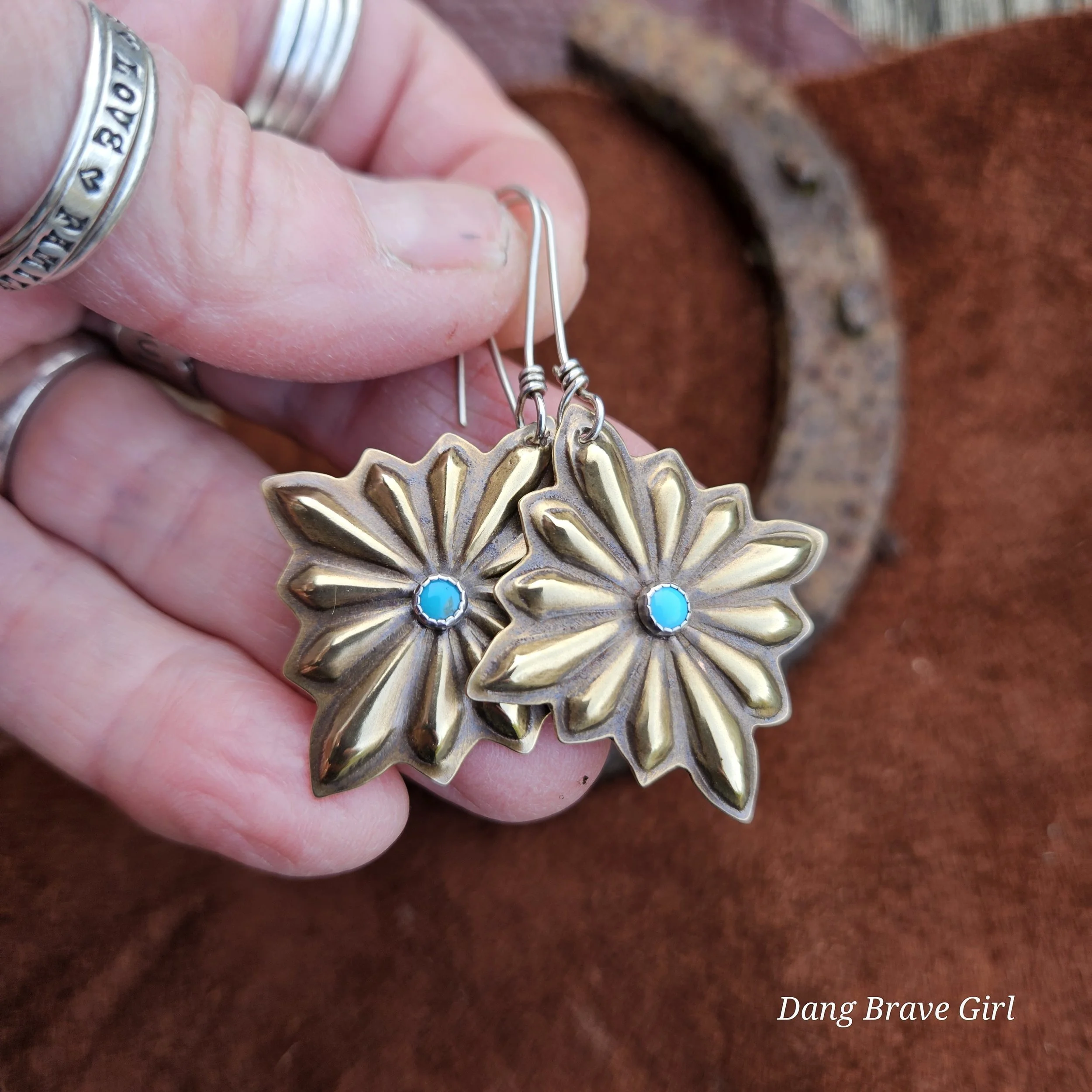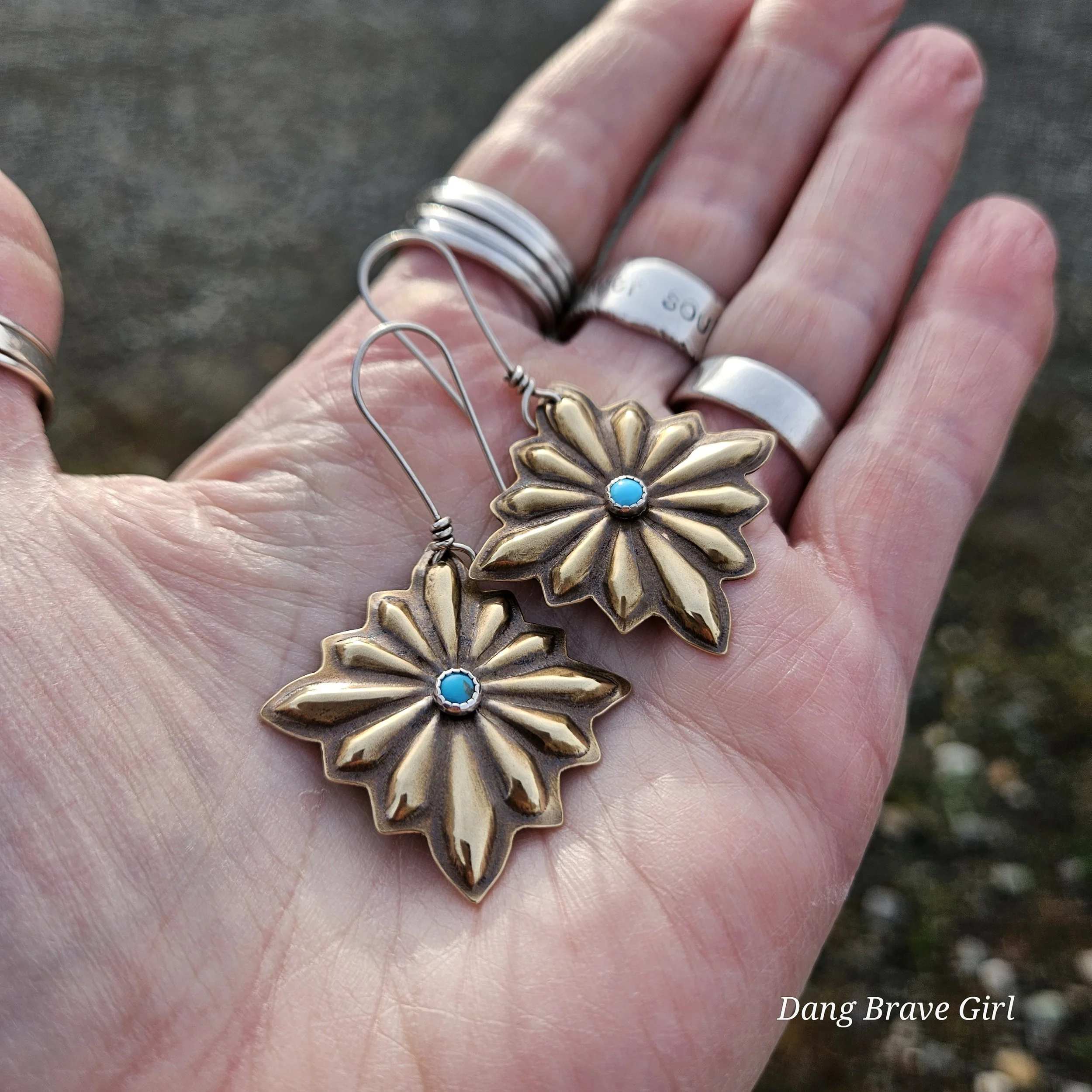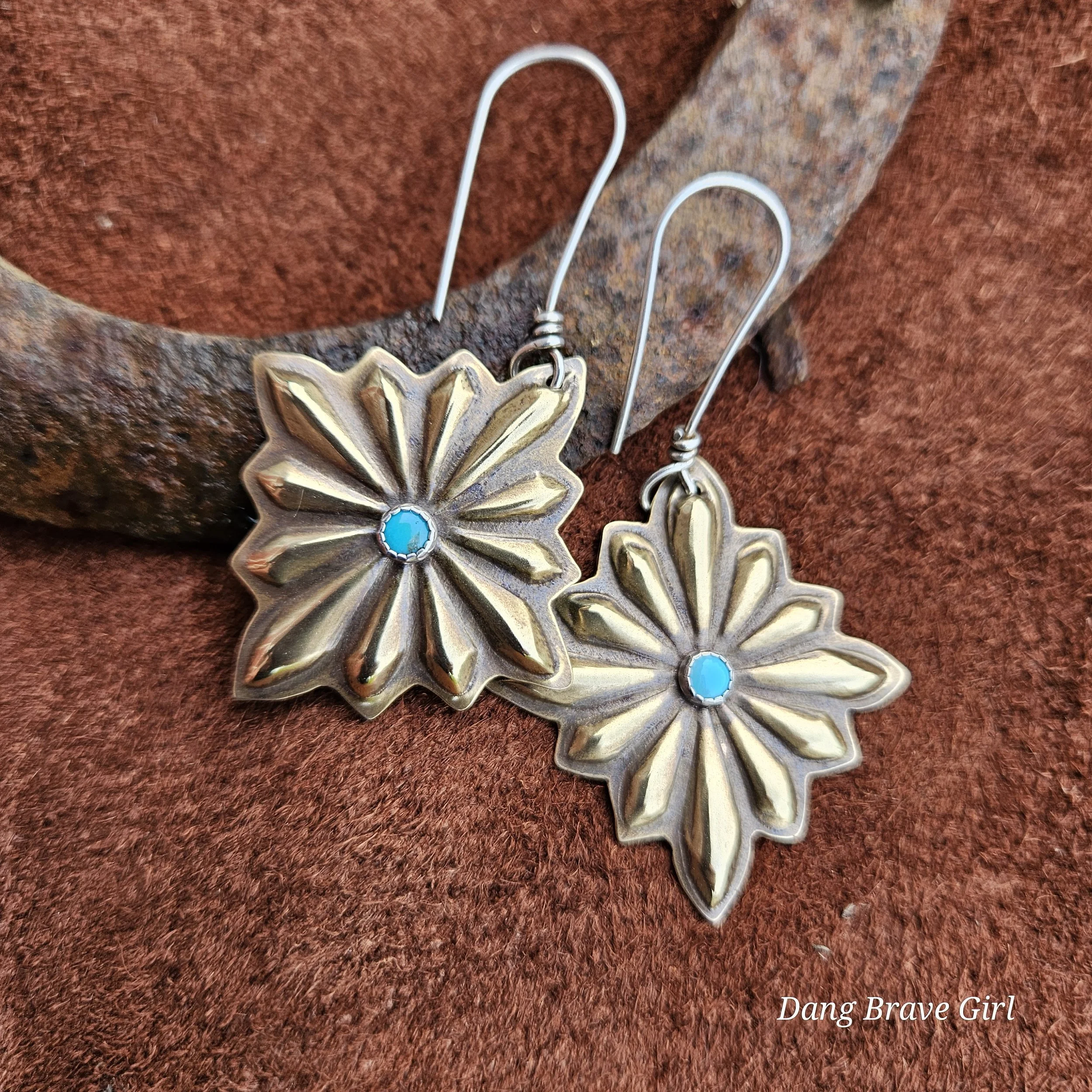 These concho earrings have American mined Kingman Turquoise set in silver and are finished with a rich patina and soft polish to highlight the depth and details.