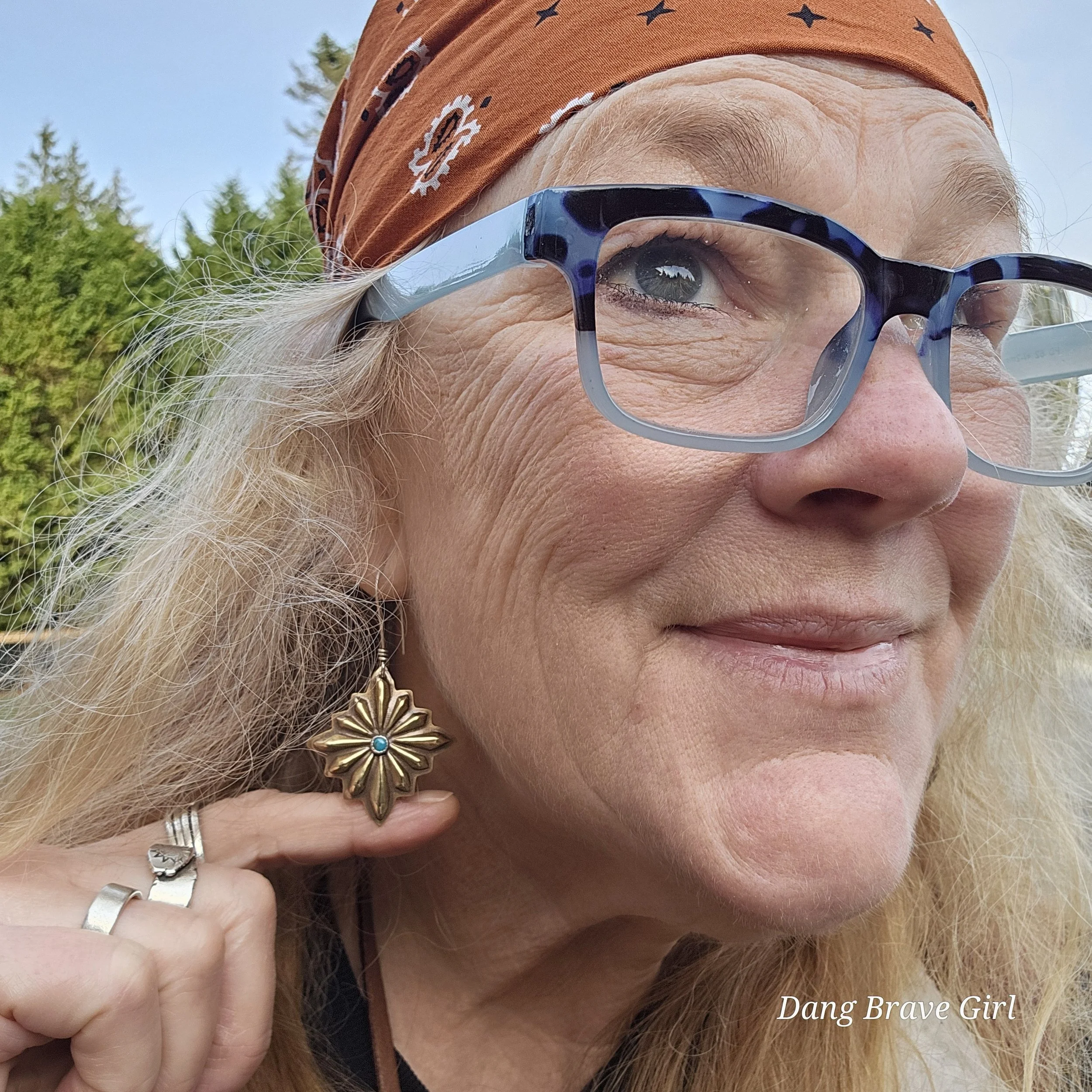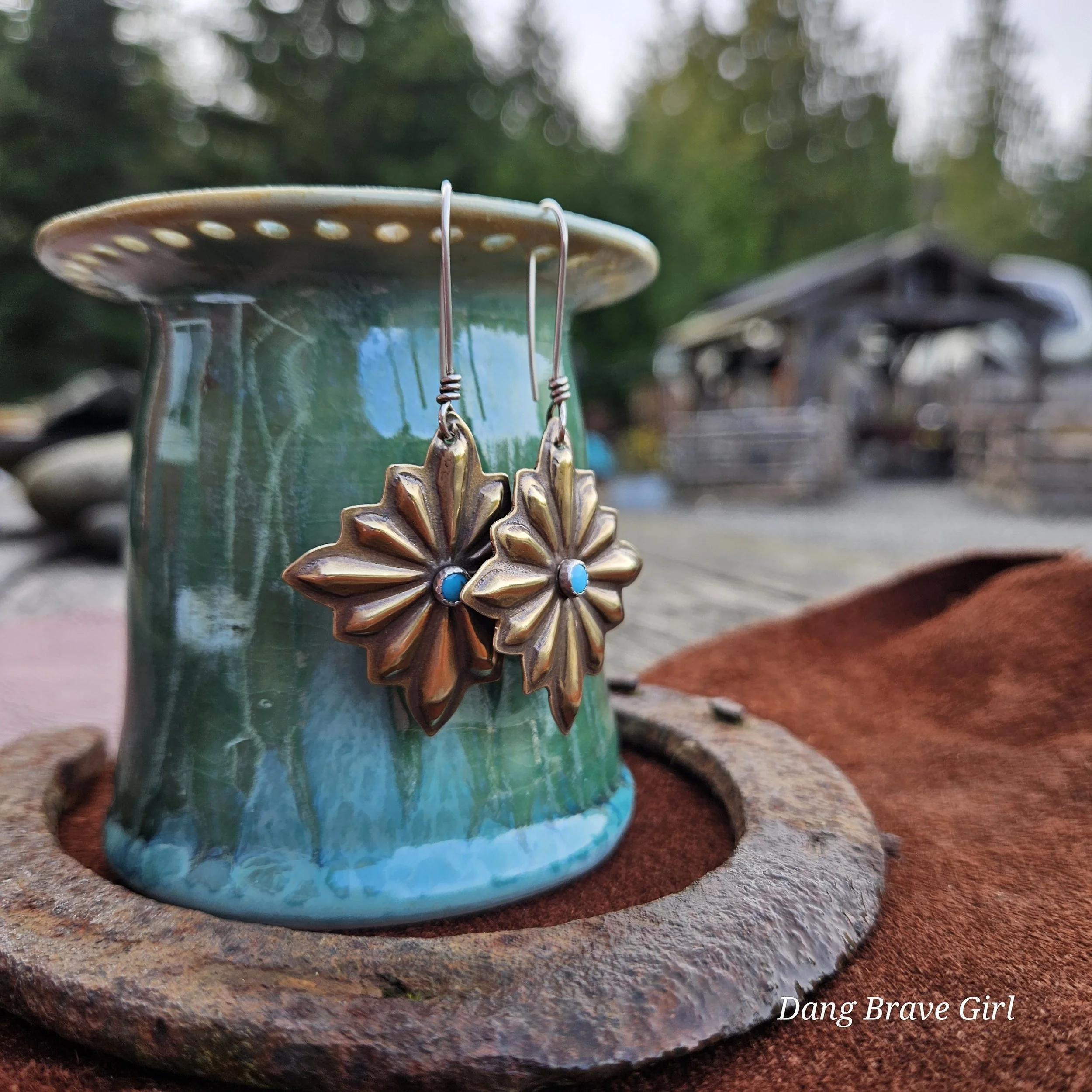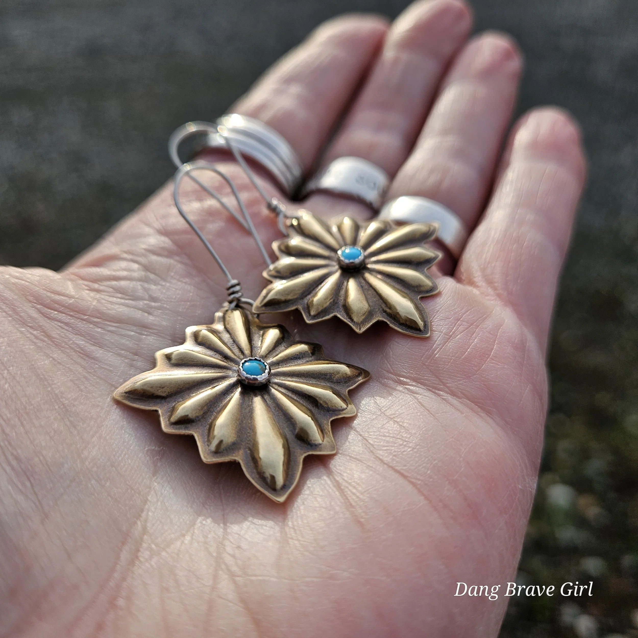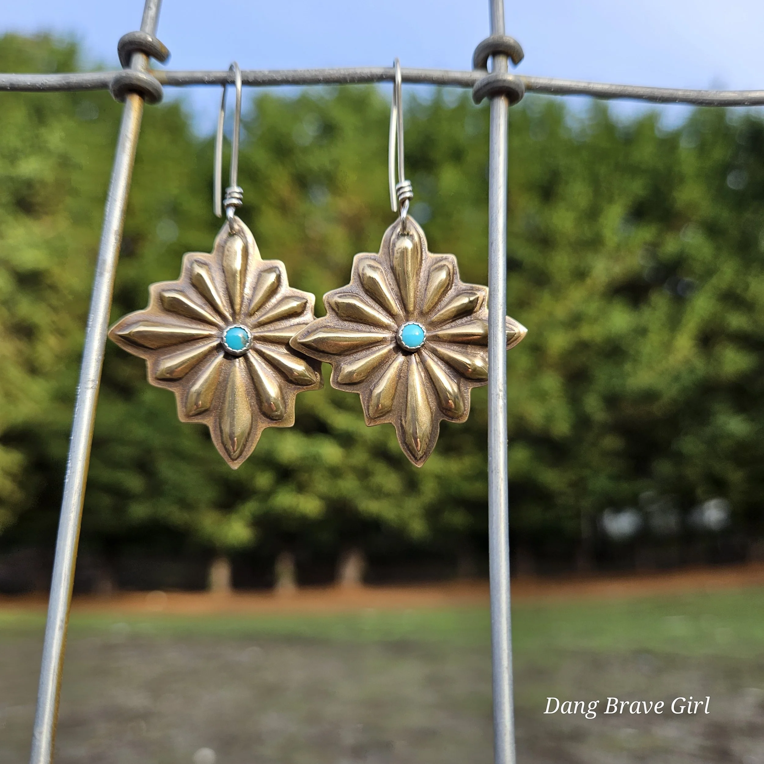 These concho earrings have American mined Kingman Turquoise set in silver and are finished with a rich patina and soft polish to highlight the depth and details.