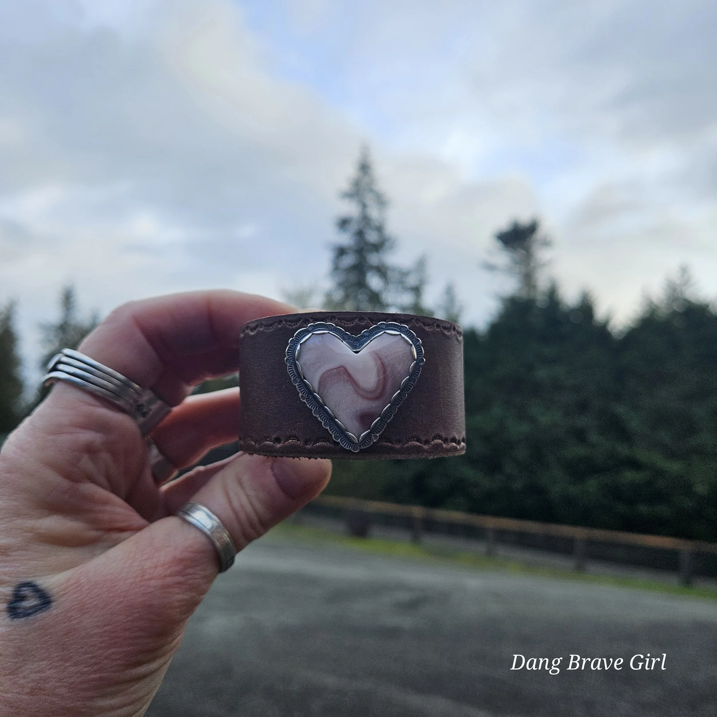 The setting measures 1 11/16” wide, is 1 3/8” tall and is finished with a rich patina and soft polish. The leather is 1 1/2” wide and has adjustable sizing options at 7”, 7.5” and 8”. For example if your wrist is 6.5”, you would likely find the 7” option the most comfortable for a snug fit, the 7.5” for a looser fit and so on. If you have any sizing questions, just message me and I’m happy to help.