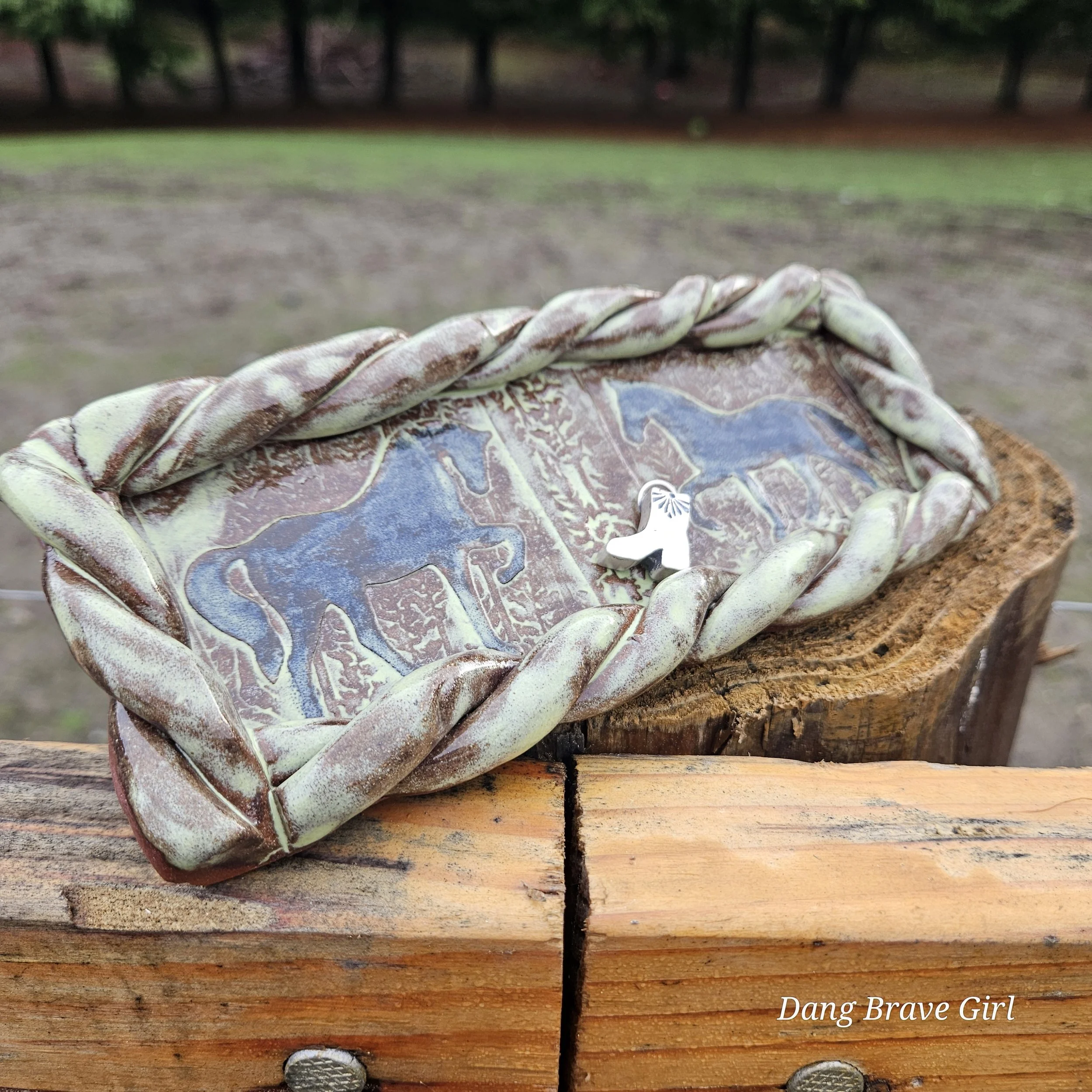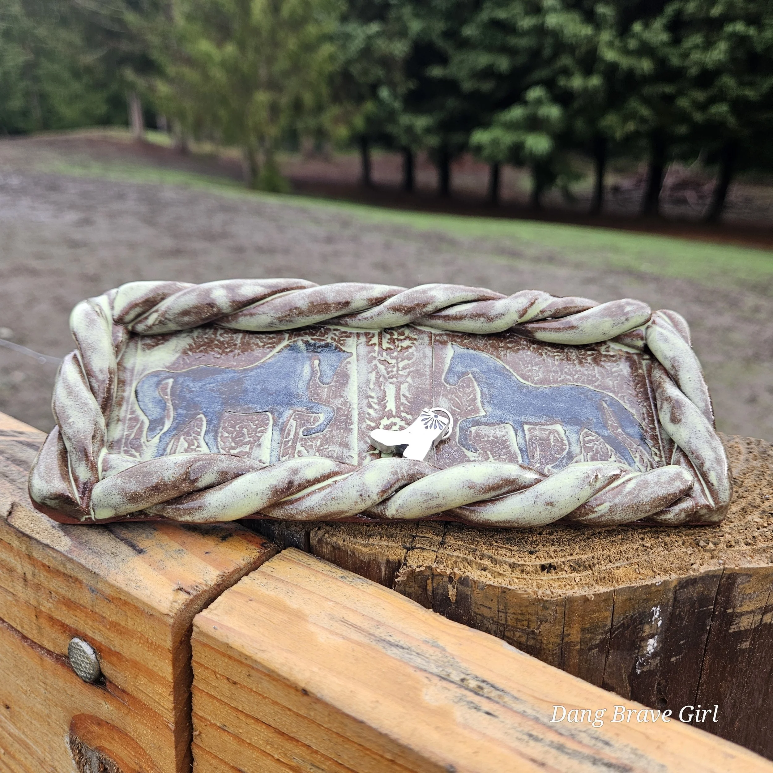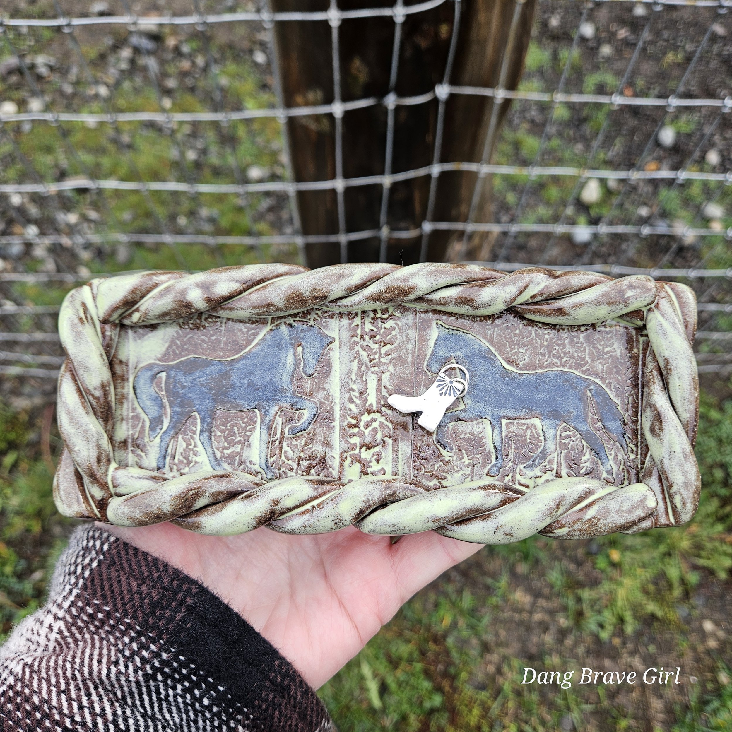 Handmade by the DBH with Oregon Red clay, it features 2 hand painted wild horses, some trees in the background and a thick twisted rope border framing it all. Glazed with a light green allowing for all the details to be highlighted.