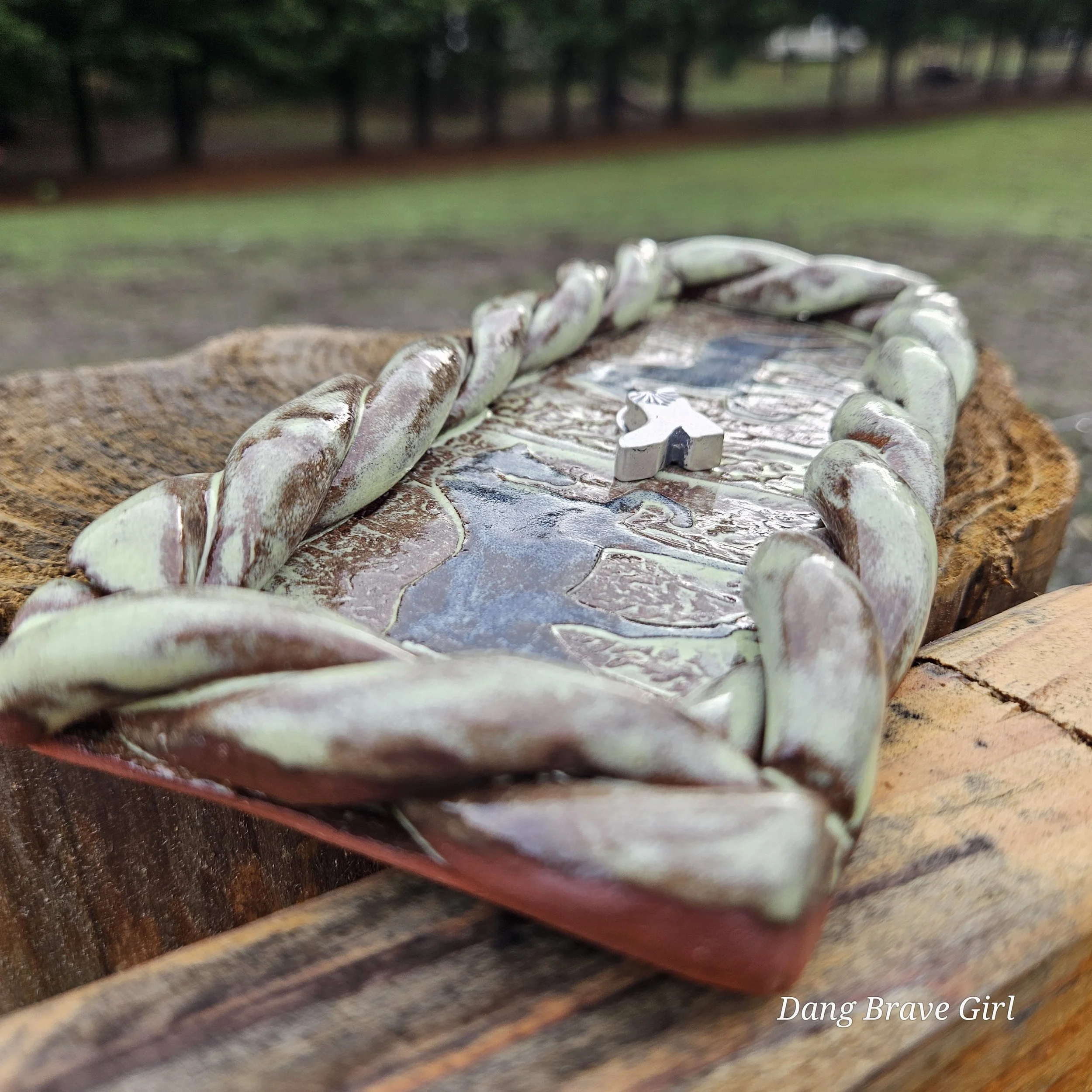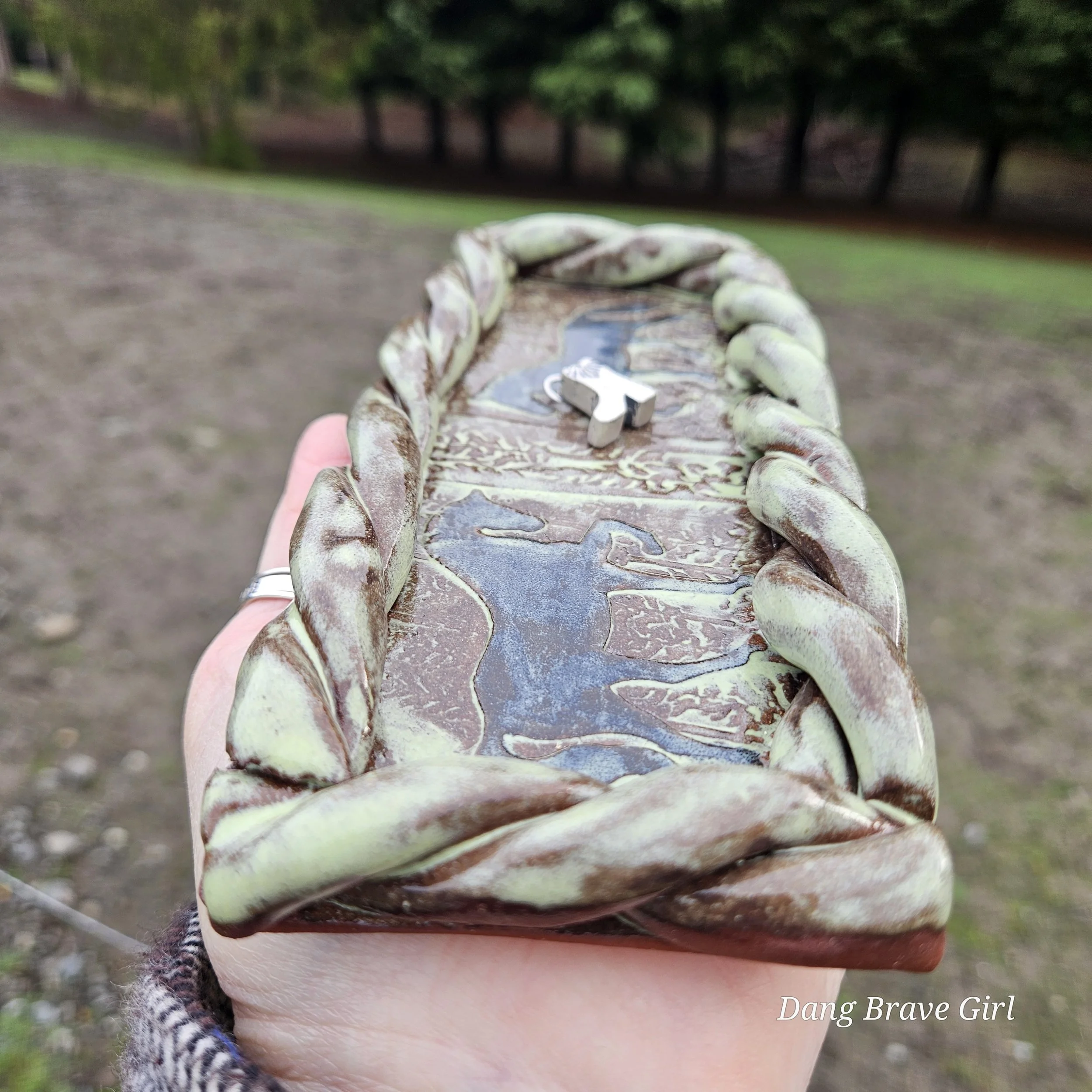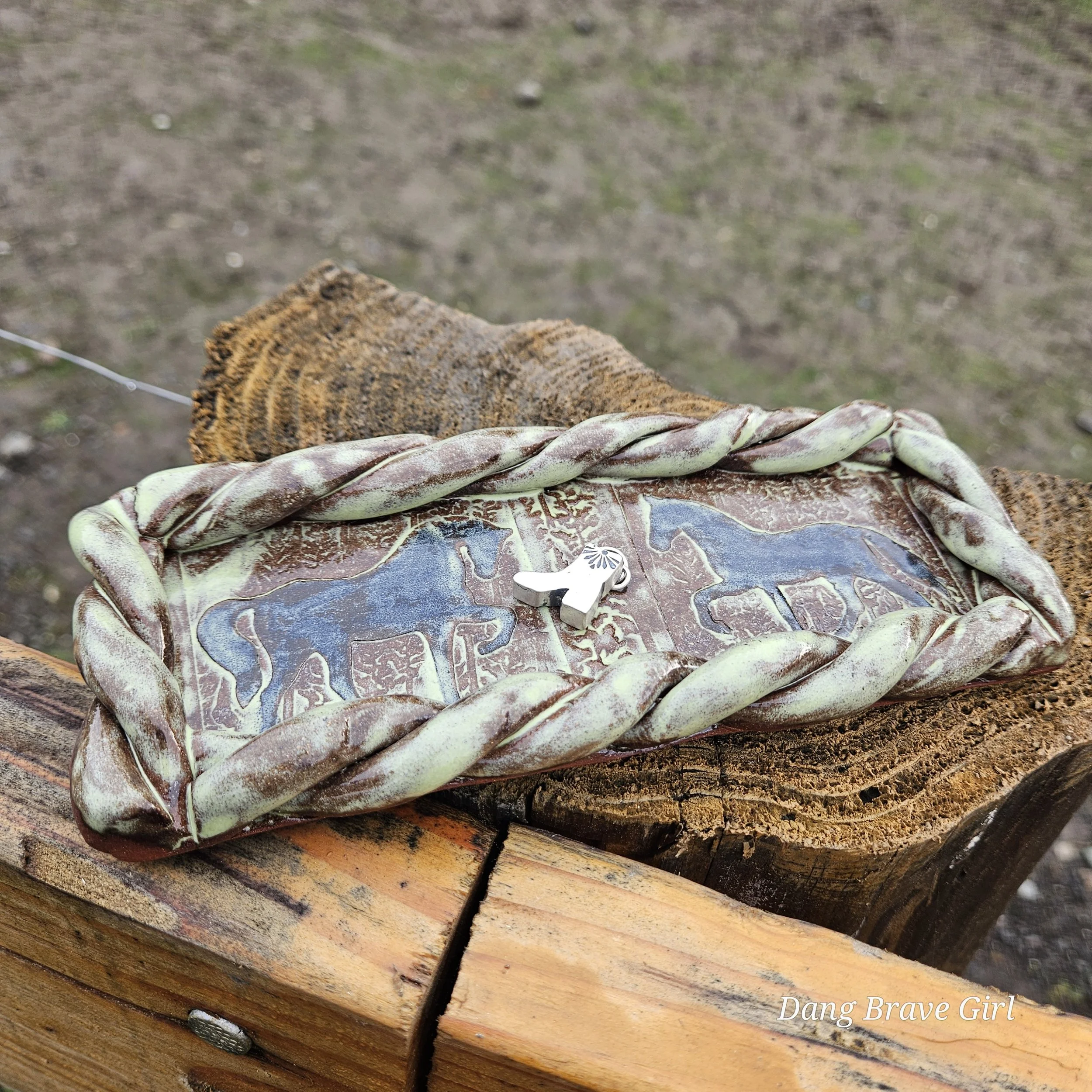 Handmade by the DBH with Oregon Red clay, it features 2 hand painted wild horses, some trees in the background and a thick twisted rope border framing it all. Glazed with a light green allowing for all the details to be highlighted.