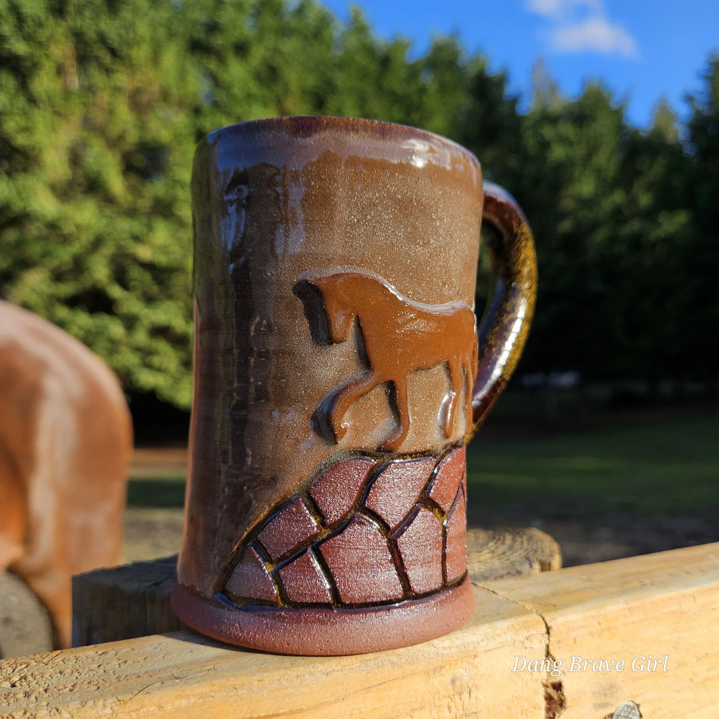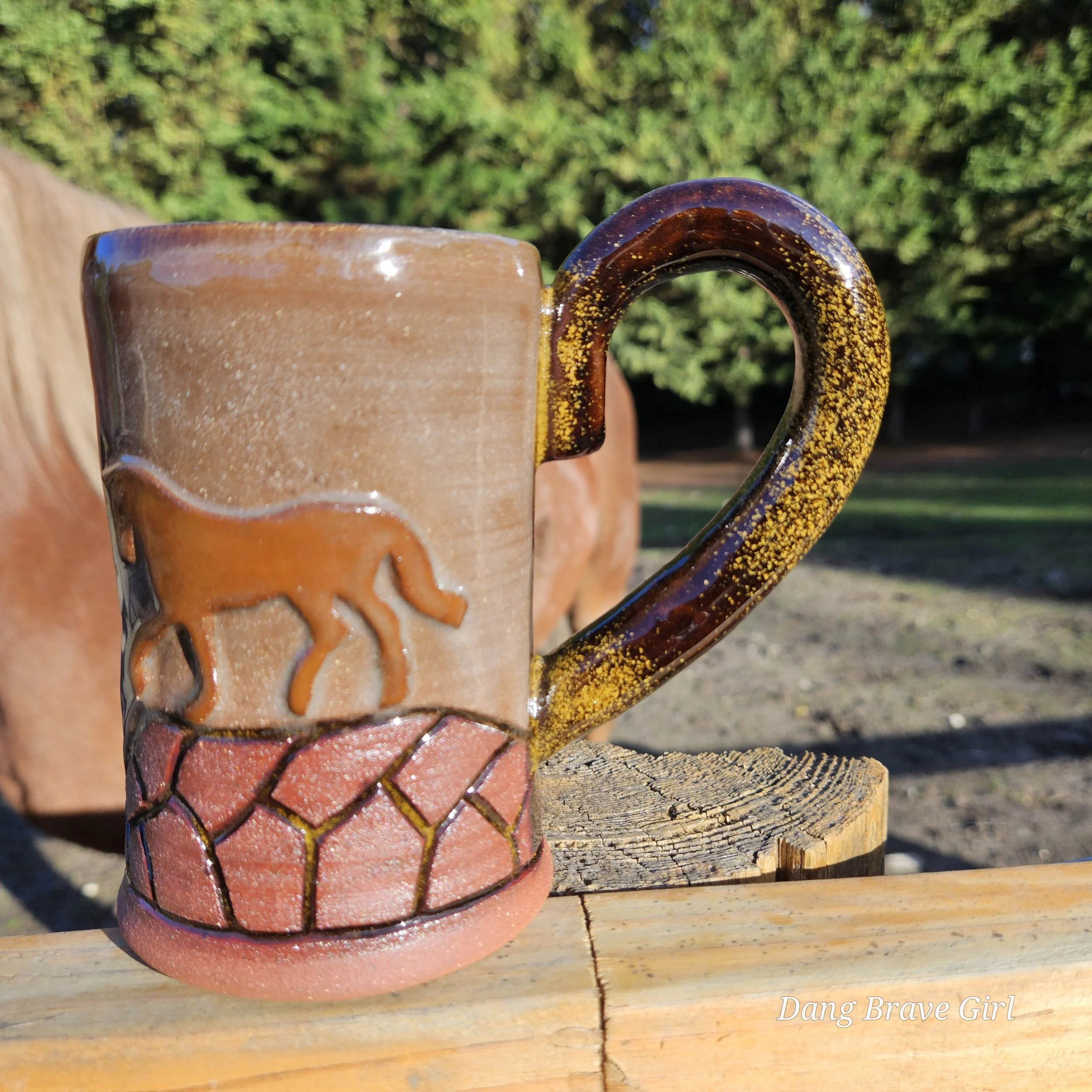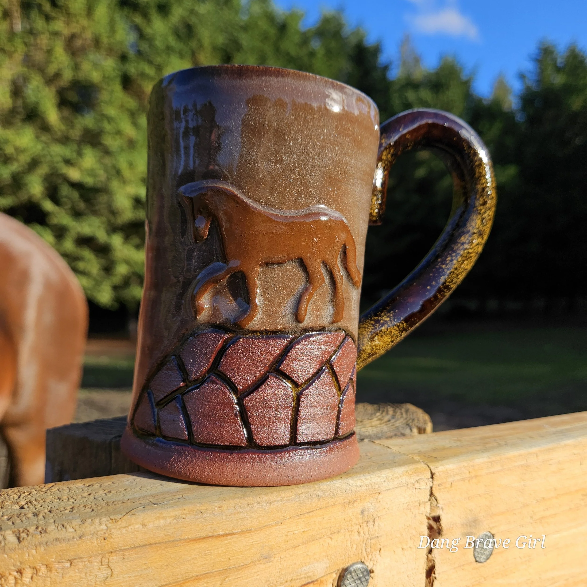 I love the earthy, softness of this one. This one of a kind mug handmade by the DBH is hand carved, hand painted and detailed with a layered on horse. Glazed with Stellar Rust outside and Turquoise inside.