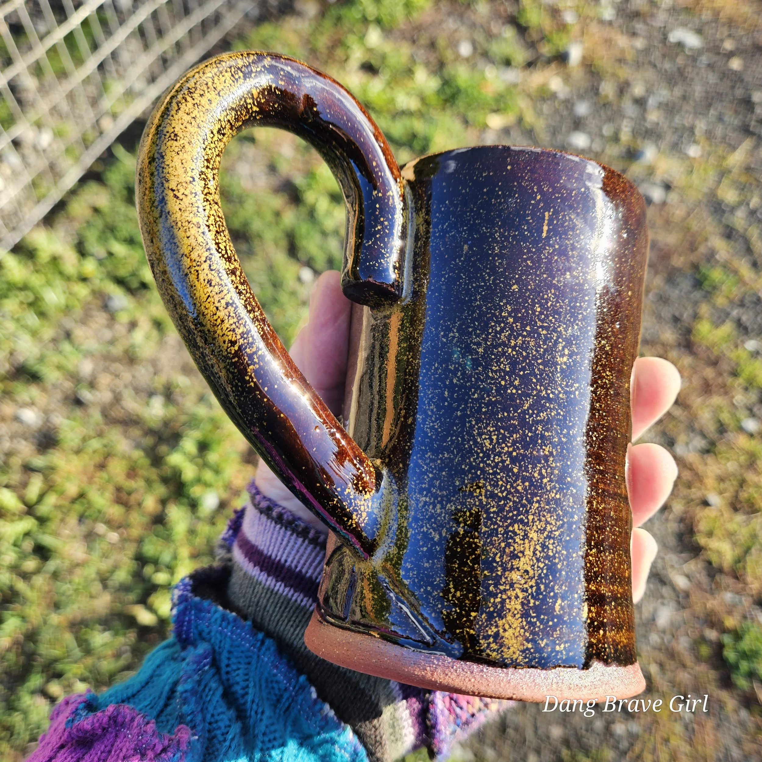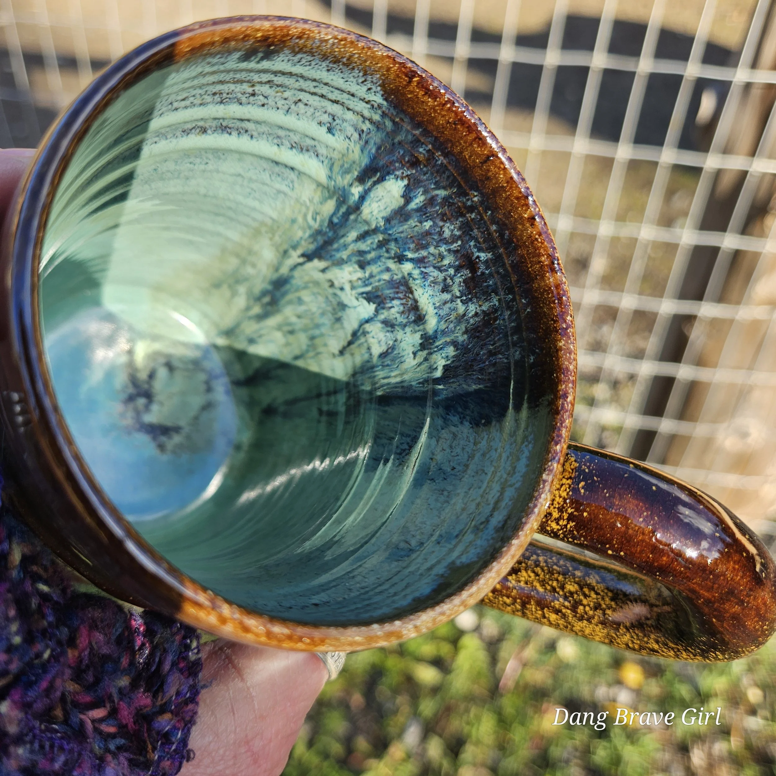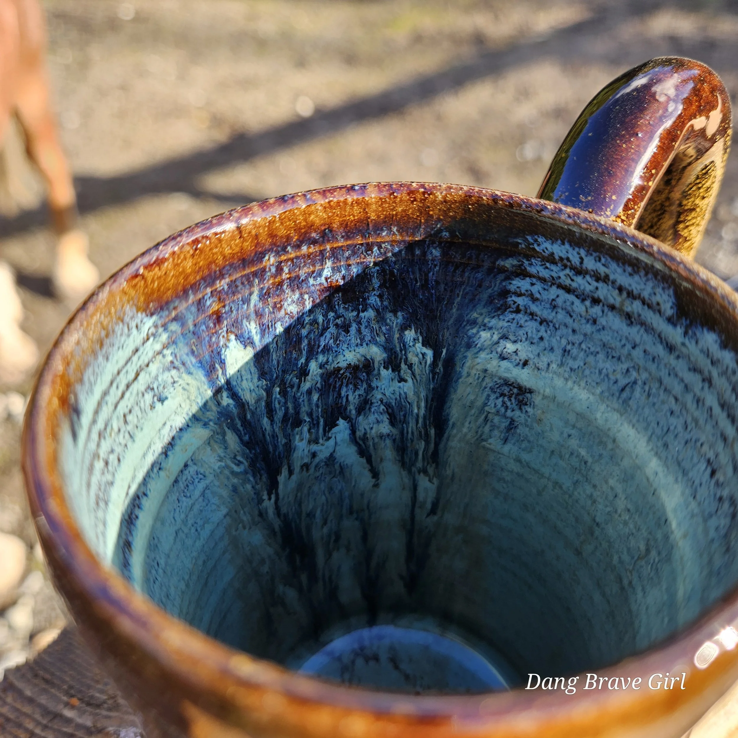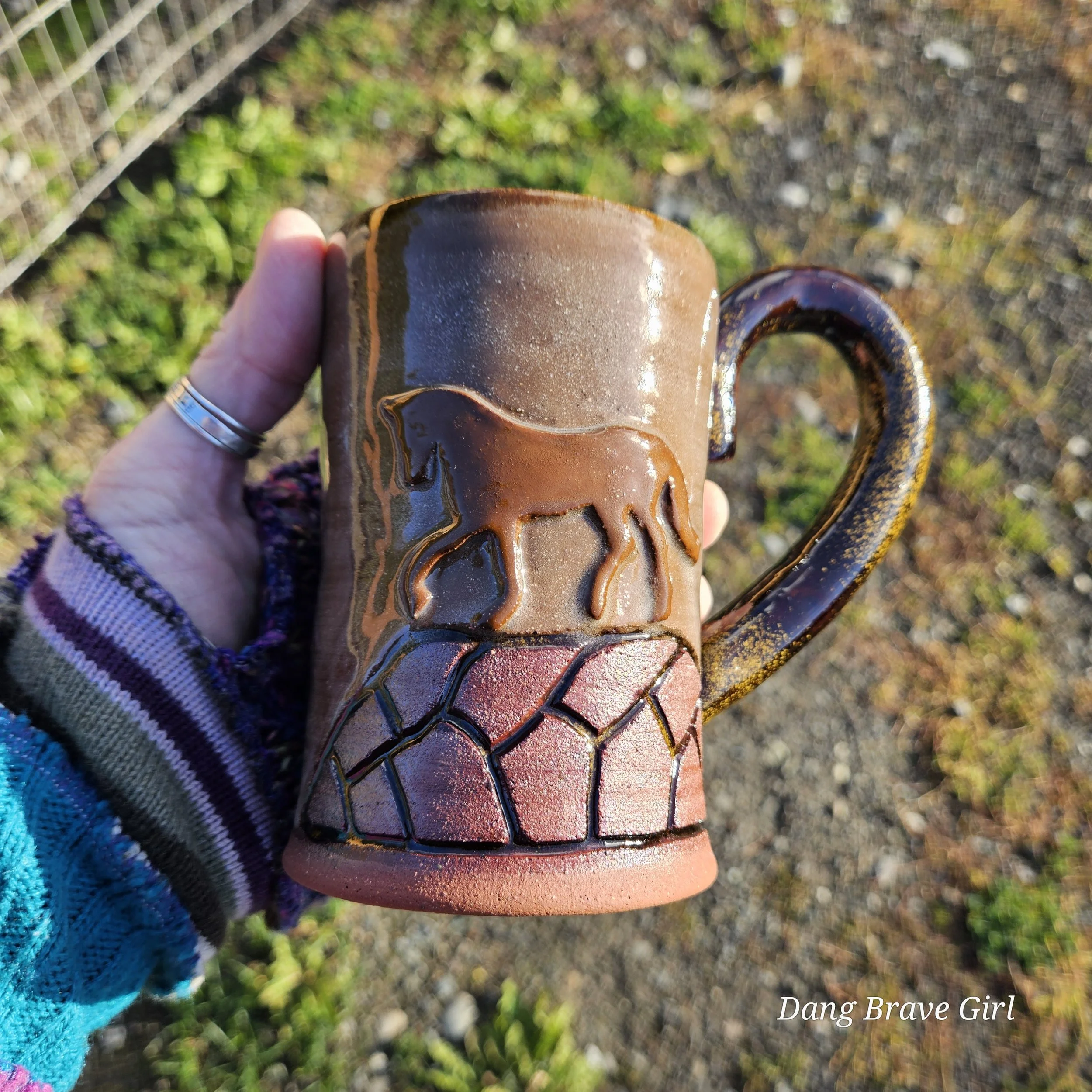 I love the earthy, softness of this one. This one of a kind mug handmade by the DBH is hand carved, hand painted and detailed with a layered on horse. Glazed with Stellar Rust outside and Turquoise inside.