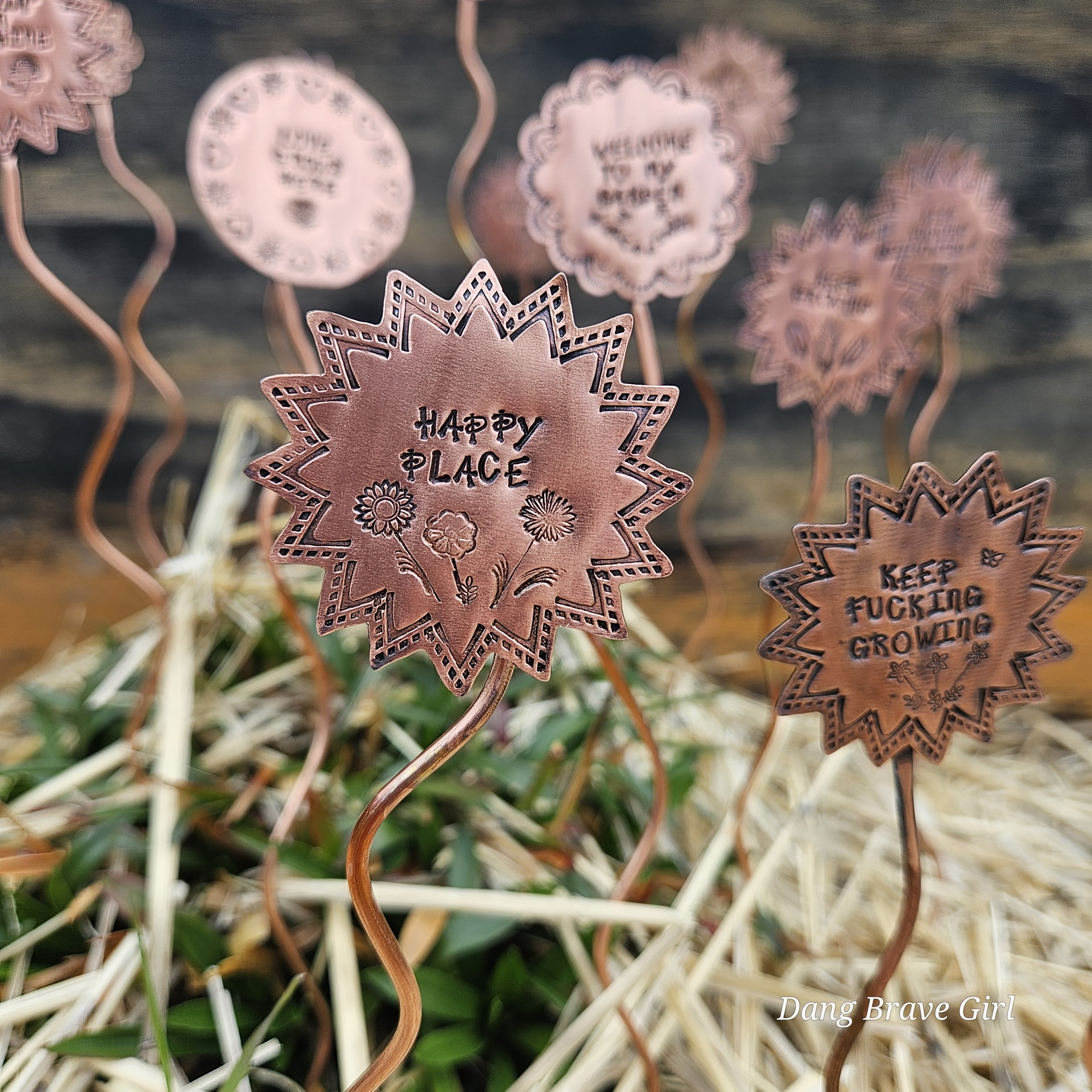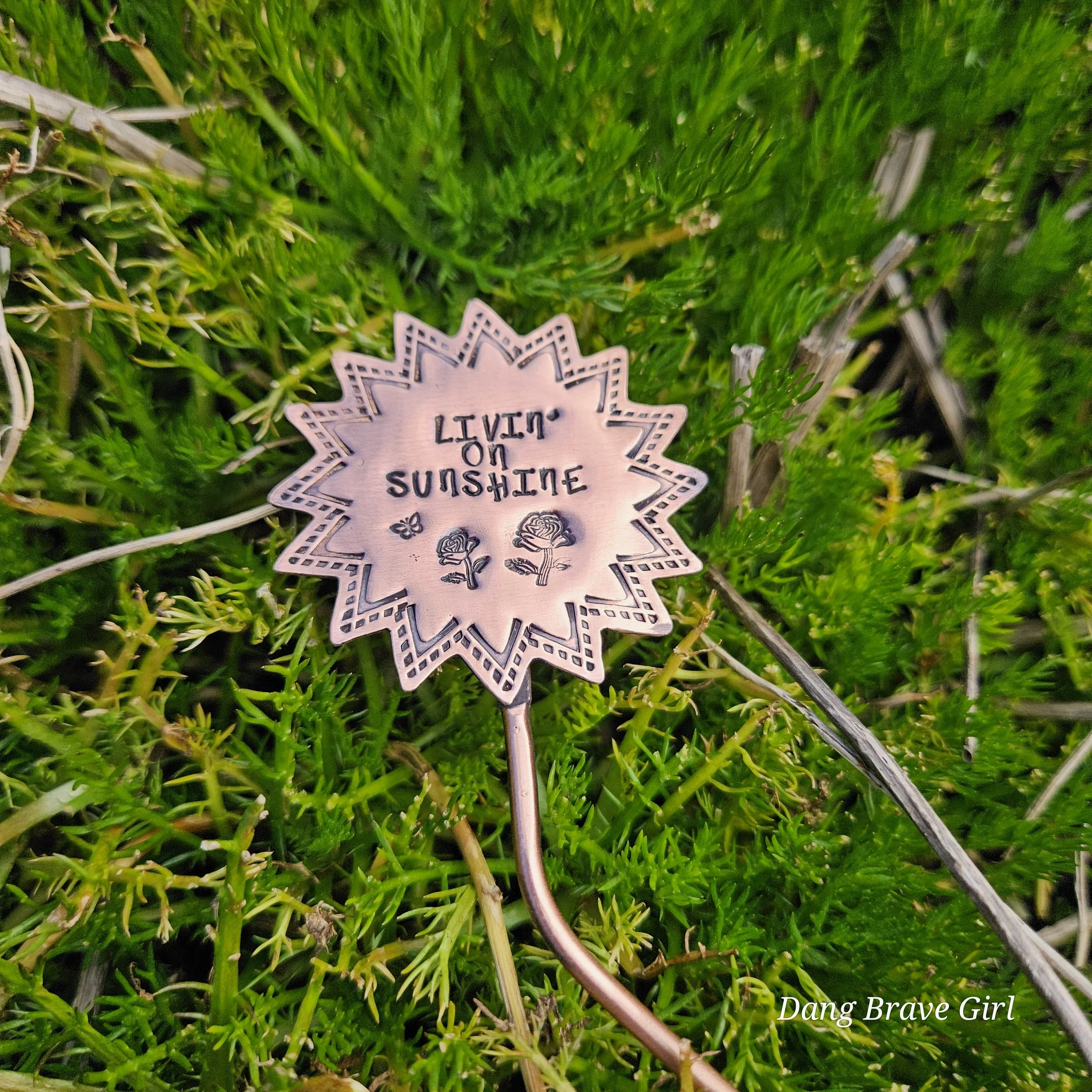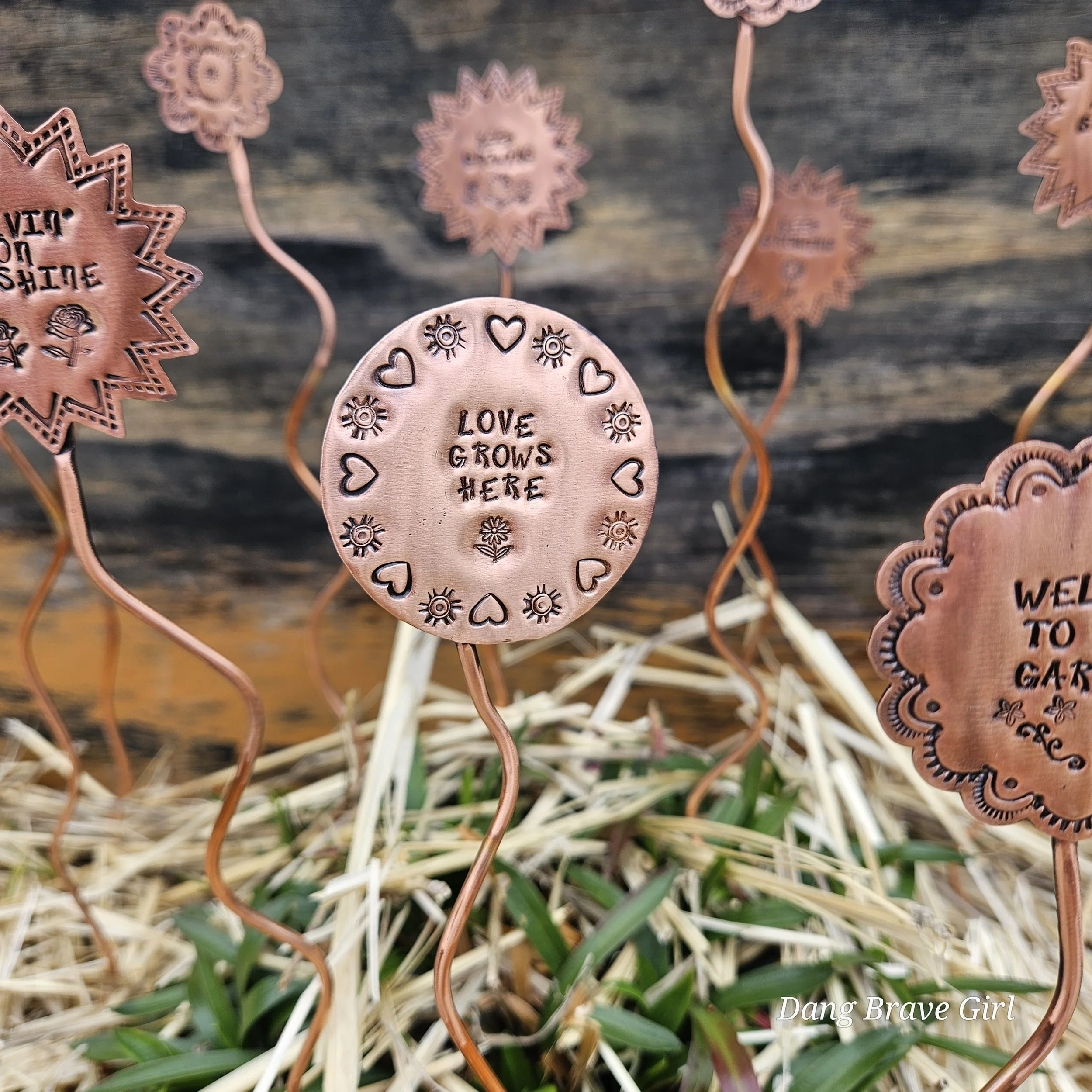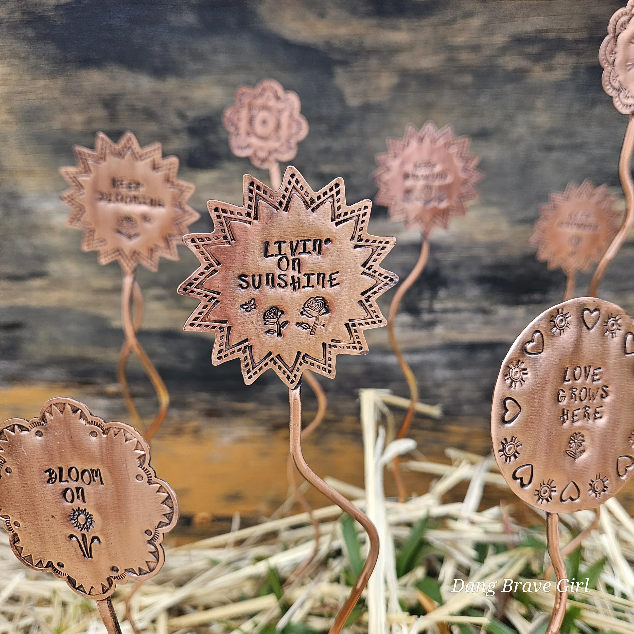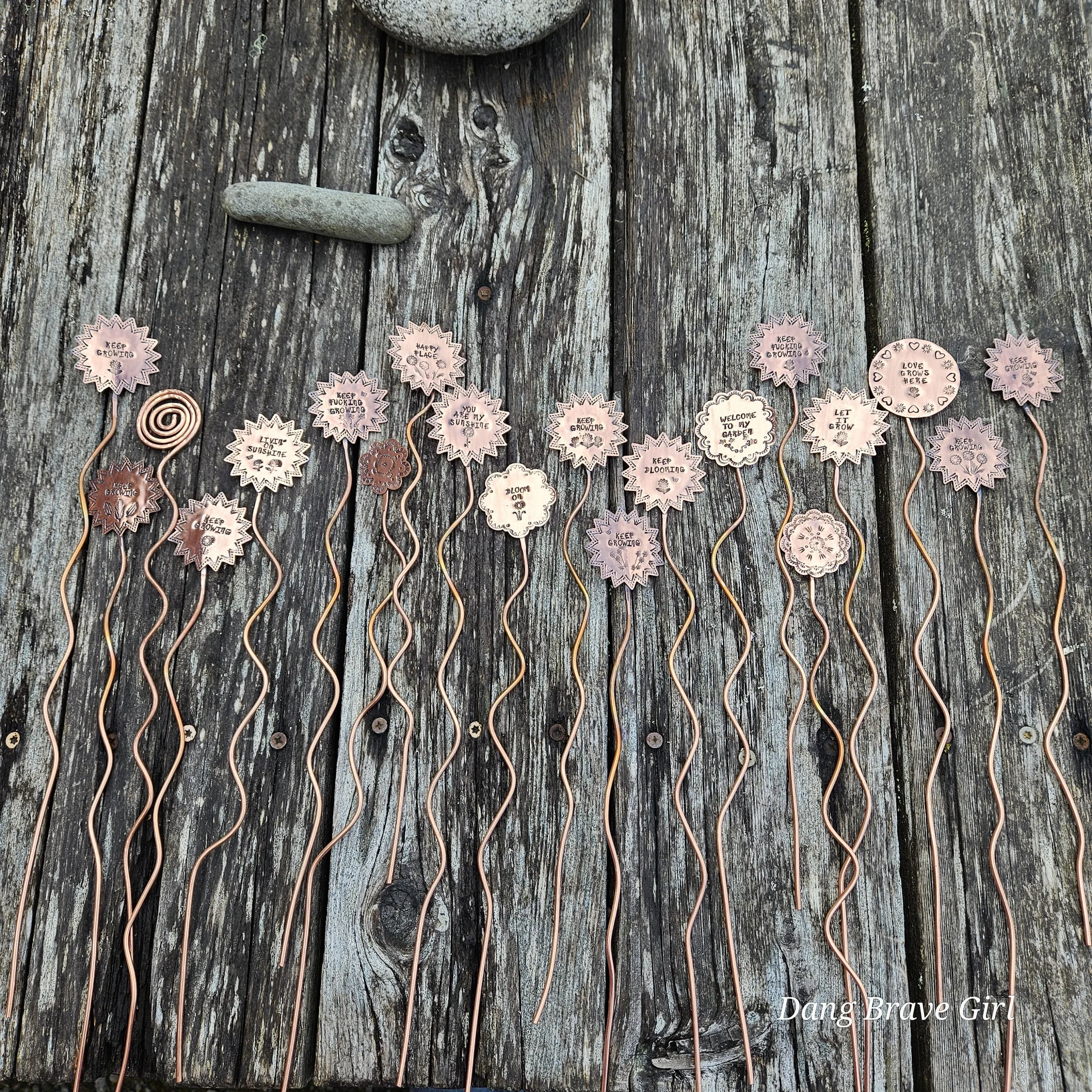 They are made with copper, detailed with sweet messages and sawed into sun and flower shapes. The tops are securely soldered to the copper ‘stems’ for a well built and long lasting garden adornment.