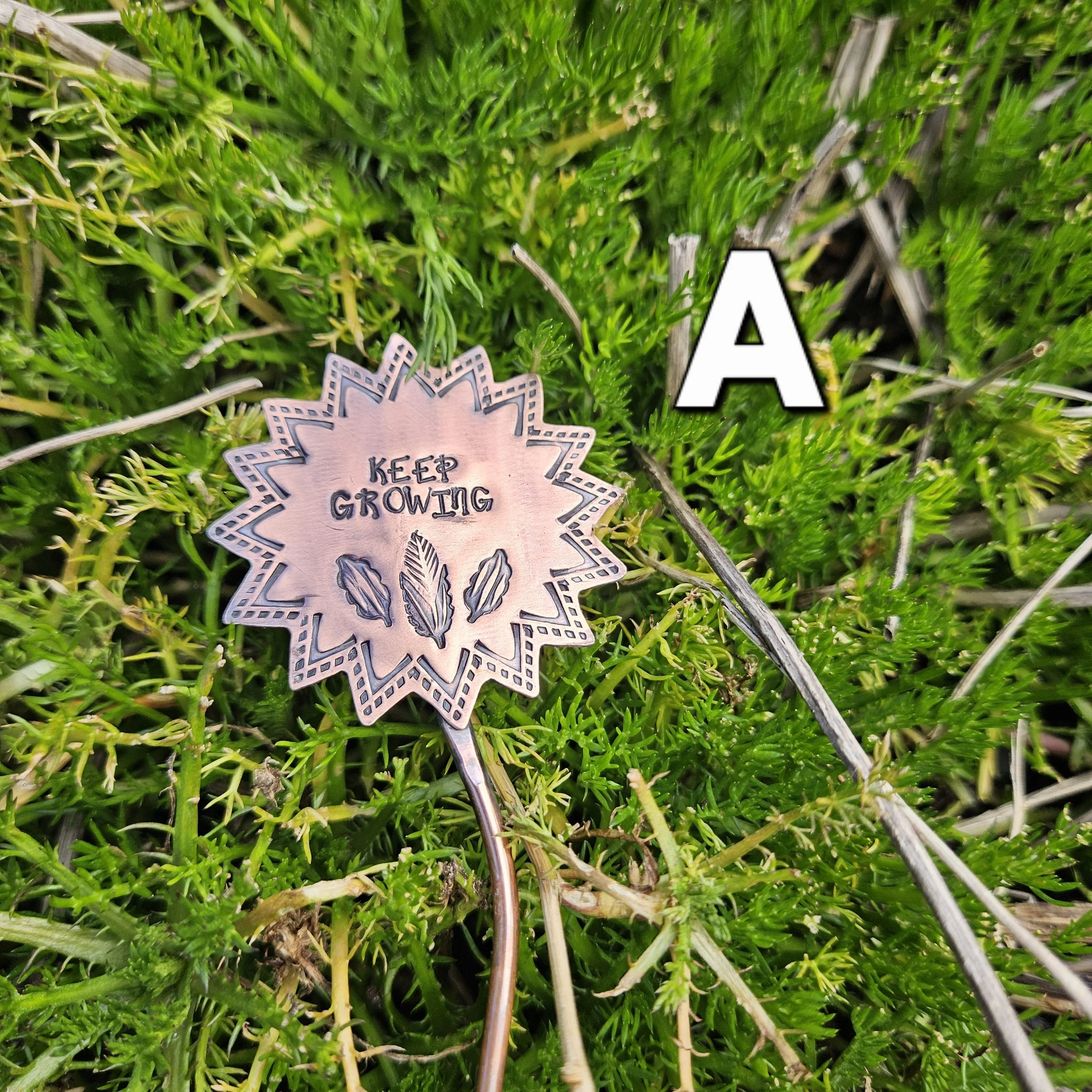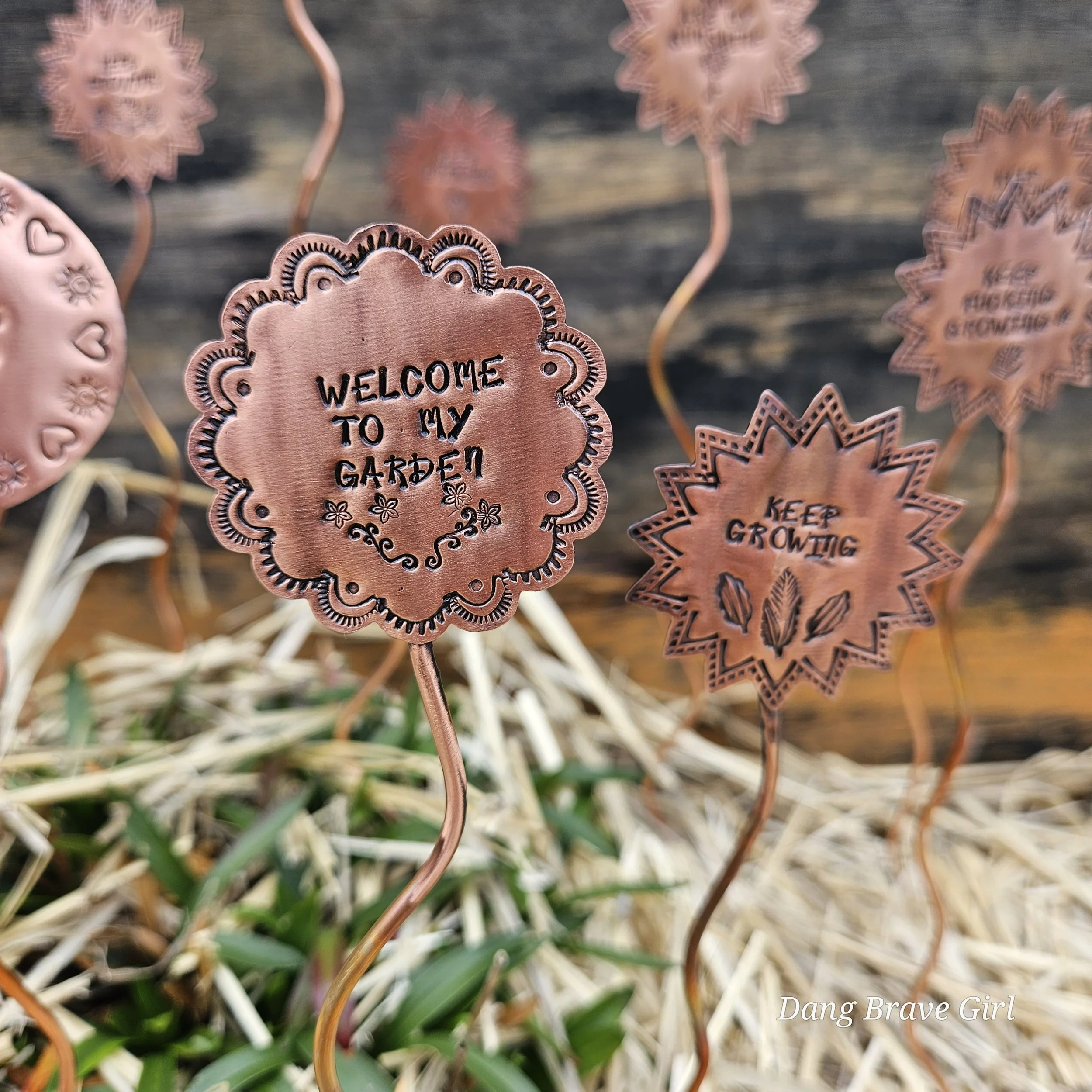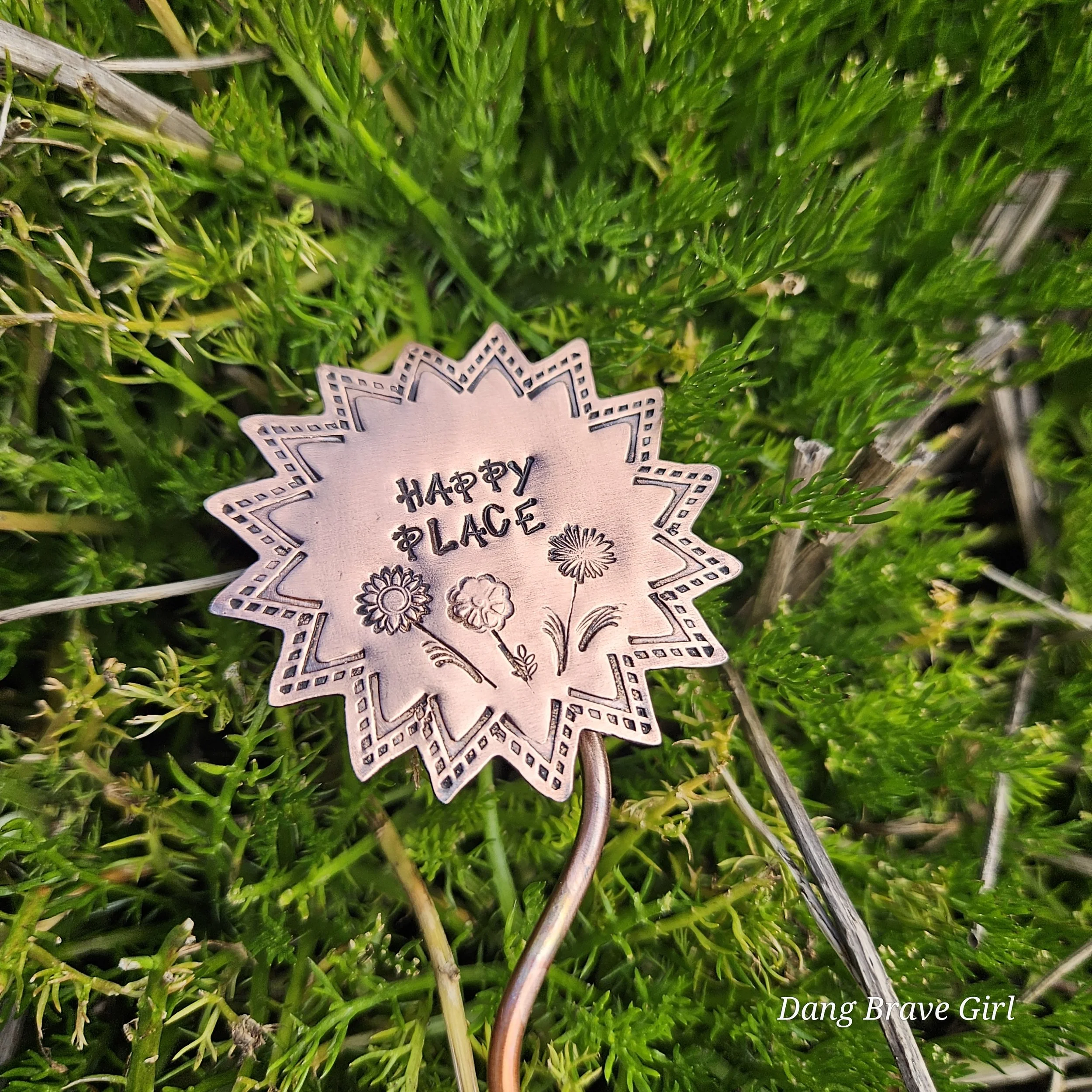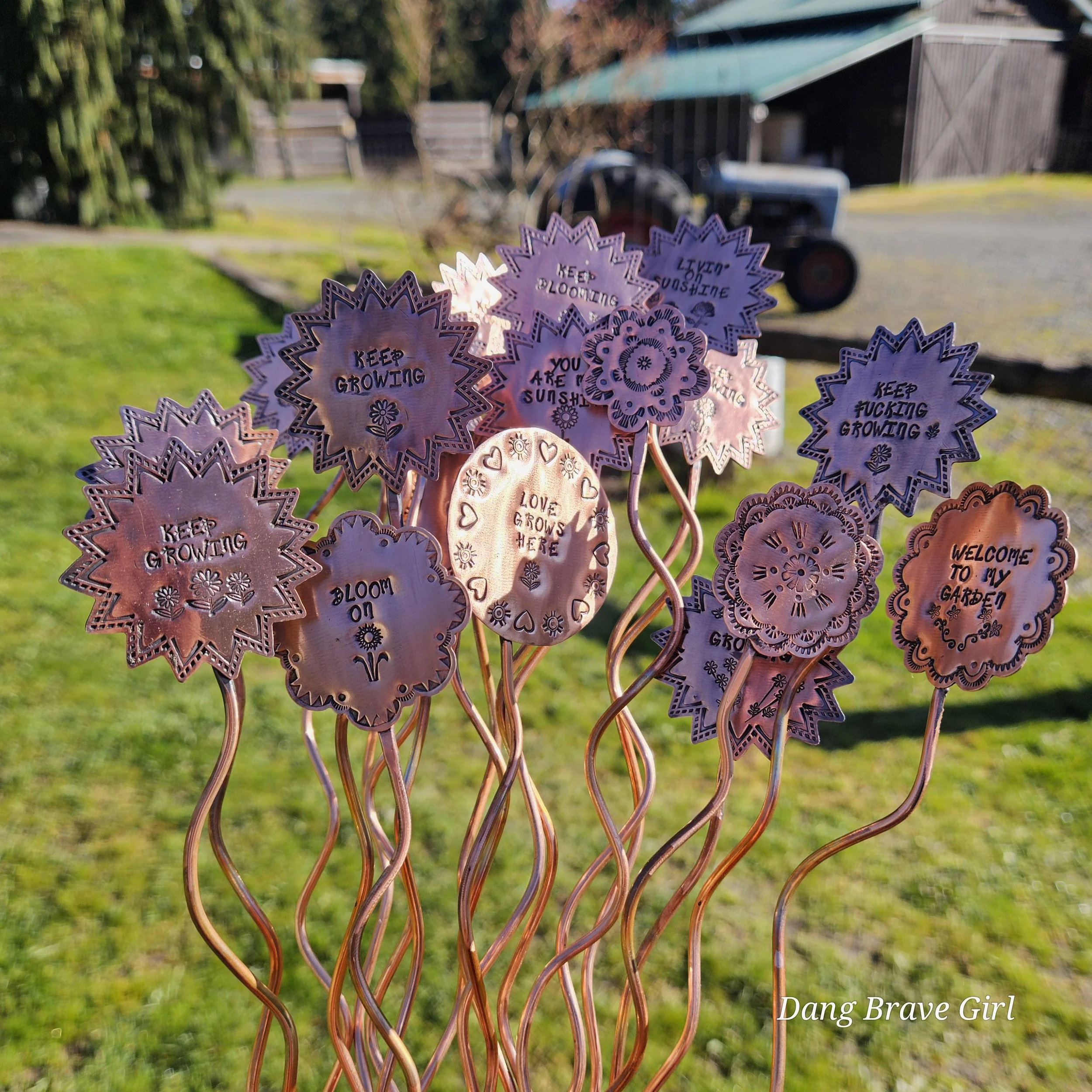 They are made with copper, detailed with sweet messages and sawed into sun and flower shapes. The tops are securely soldered to the copper ‘stems’ for a well built and long lasting garden adornment.