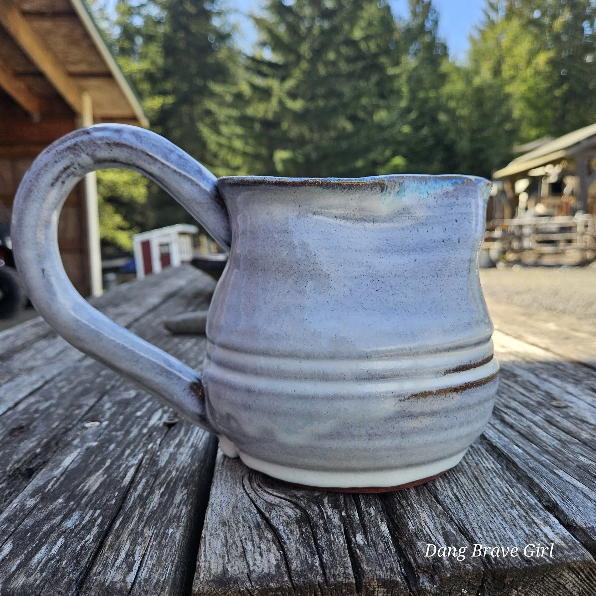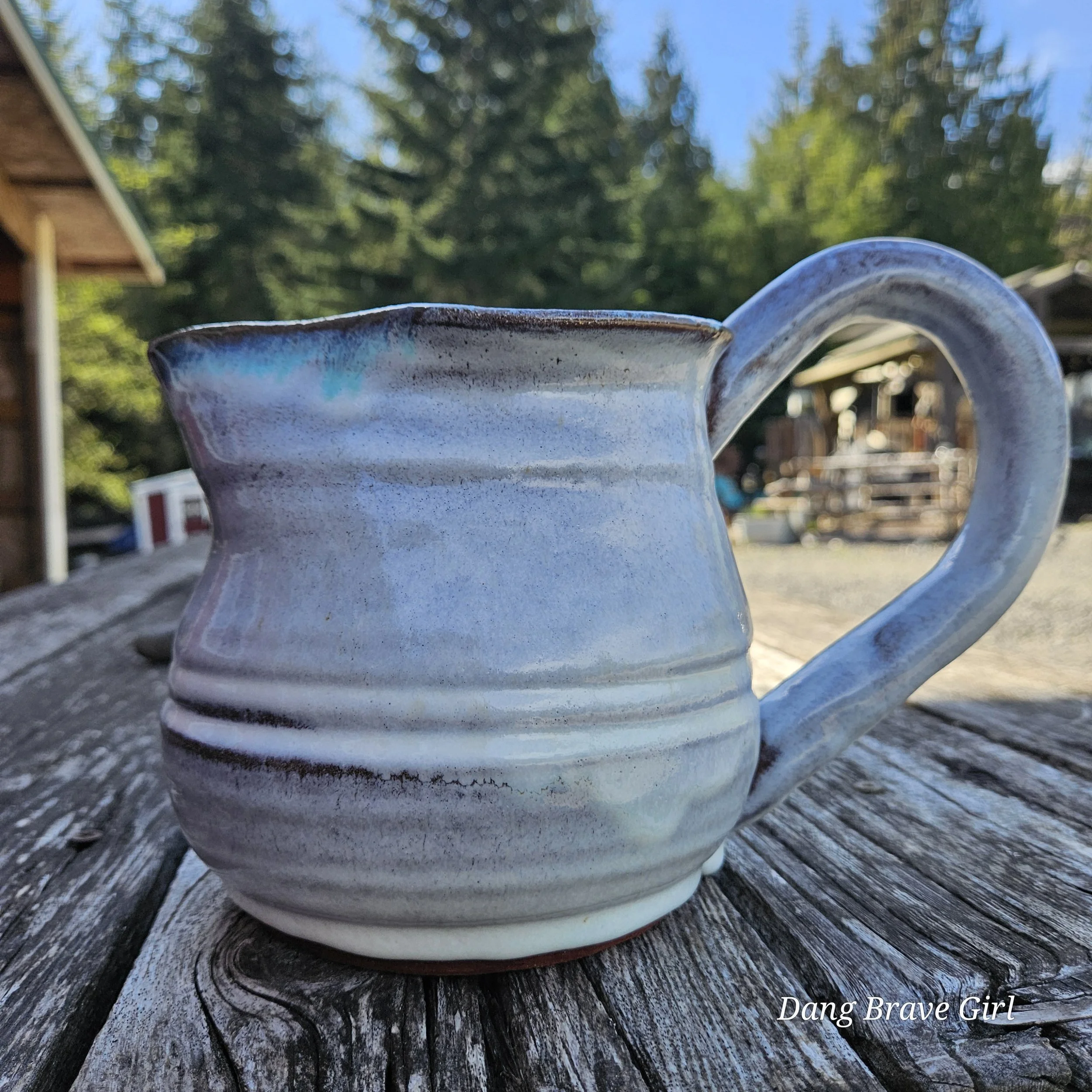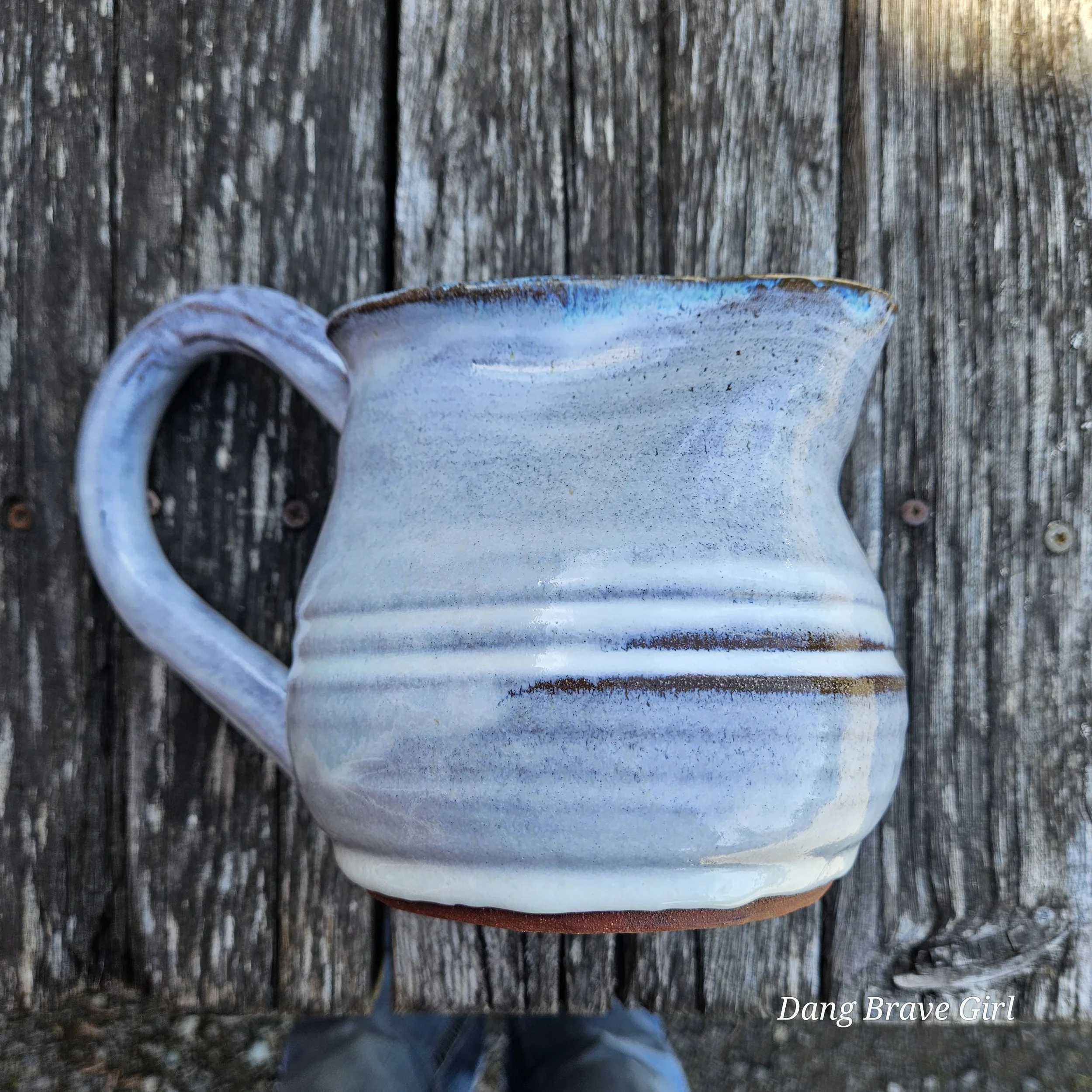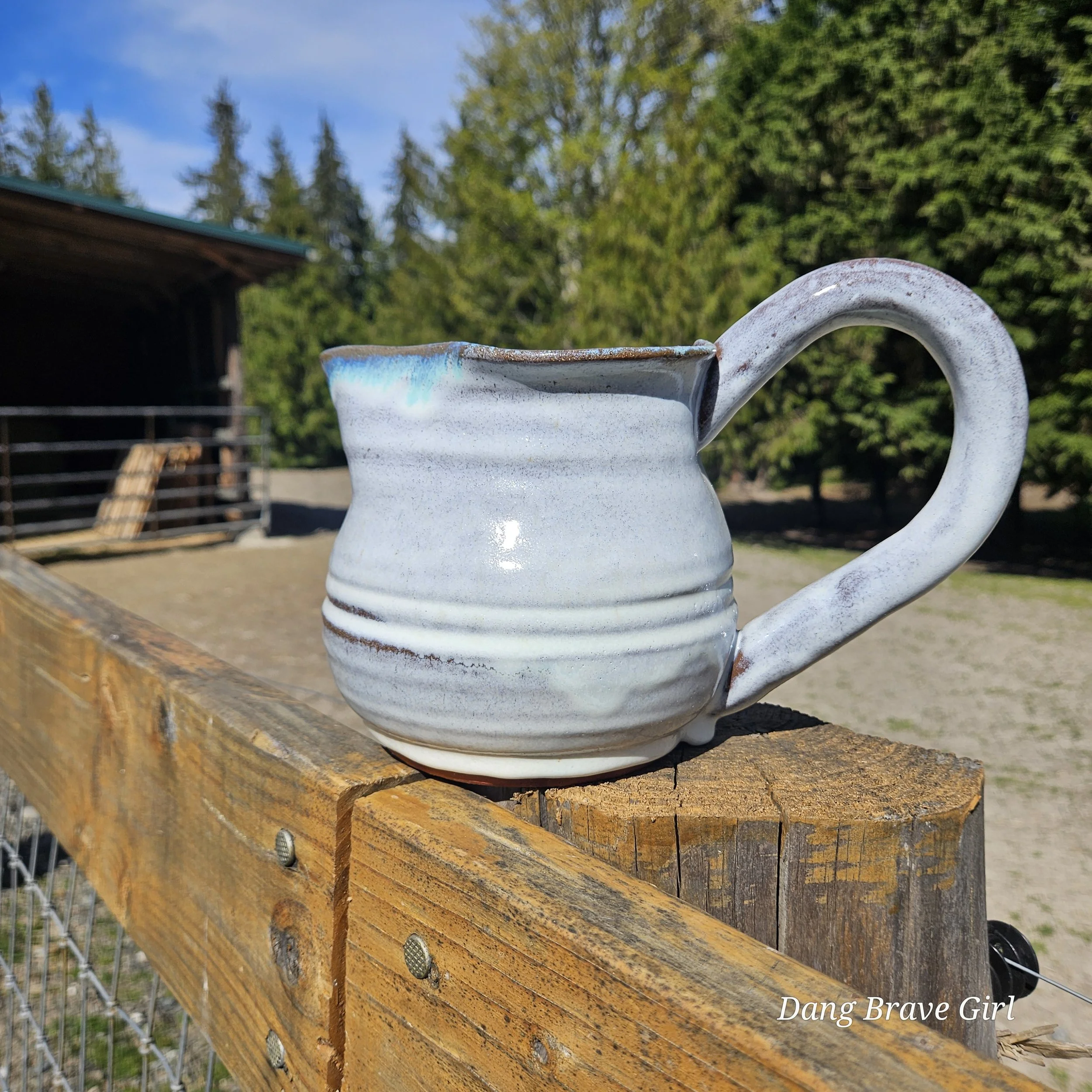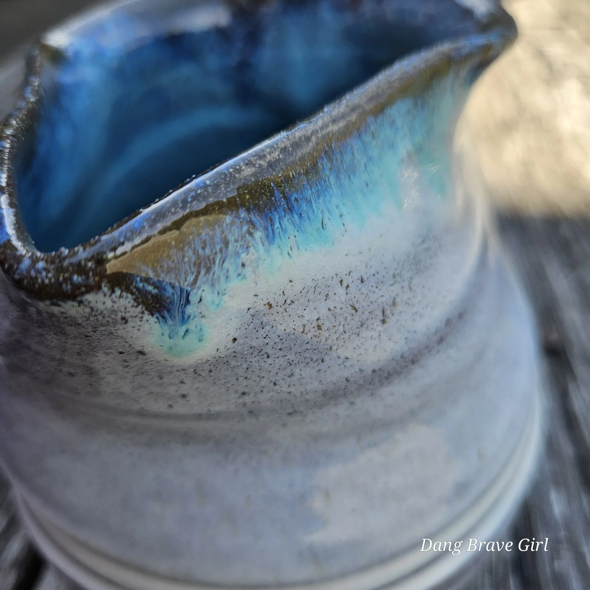Handmade by the DBH with Oregon Red, this creamy, milky white glaze looks incredible with the rustic red clay visible underneath it. Highlighted with Caribbean on the inside, with a touch of it coming over the rim and spout.
