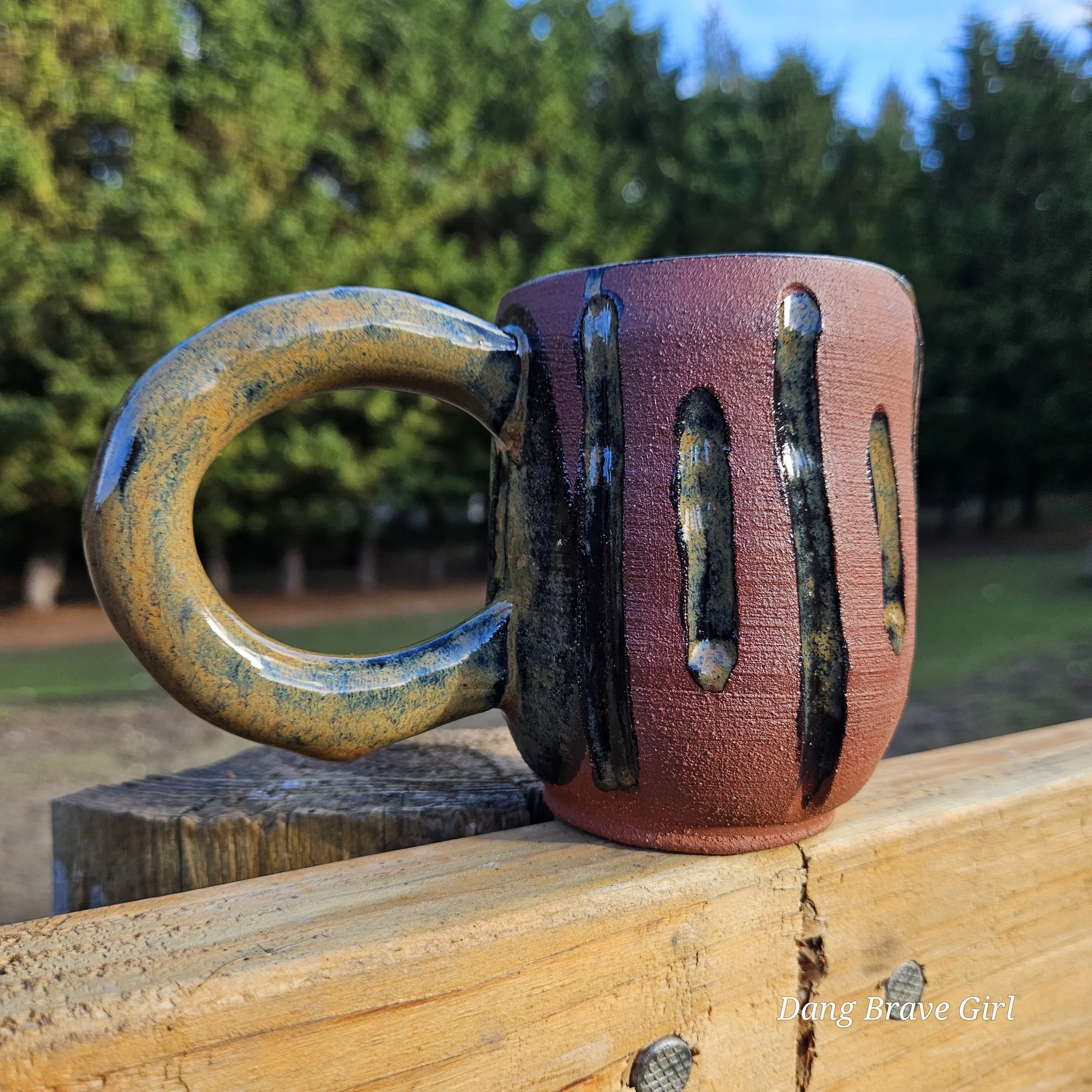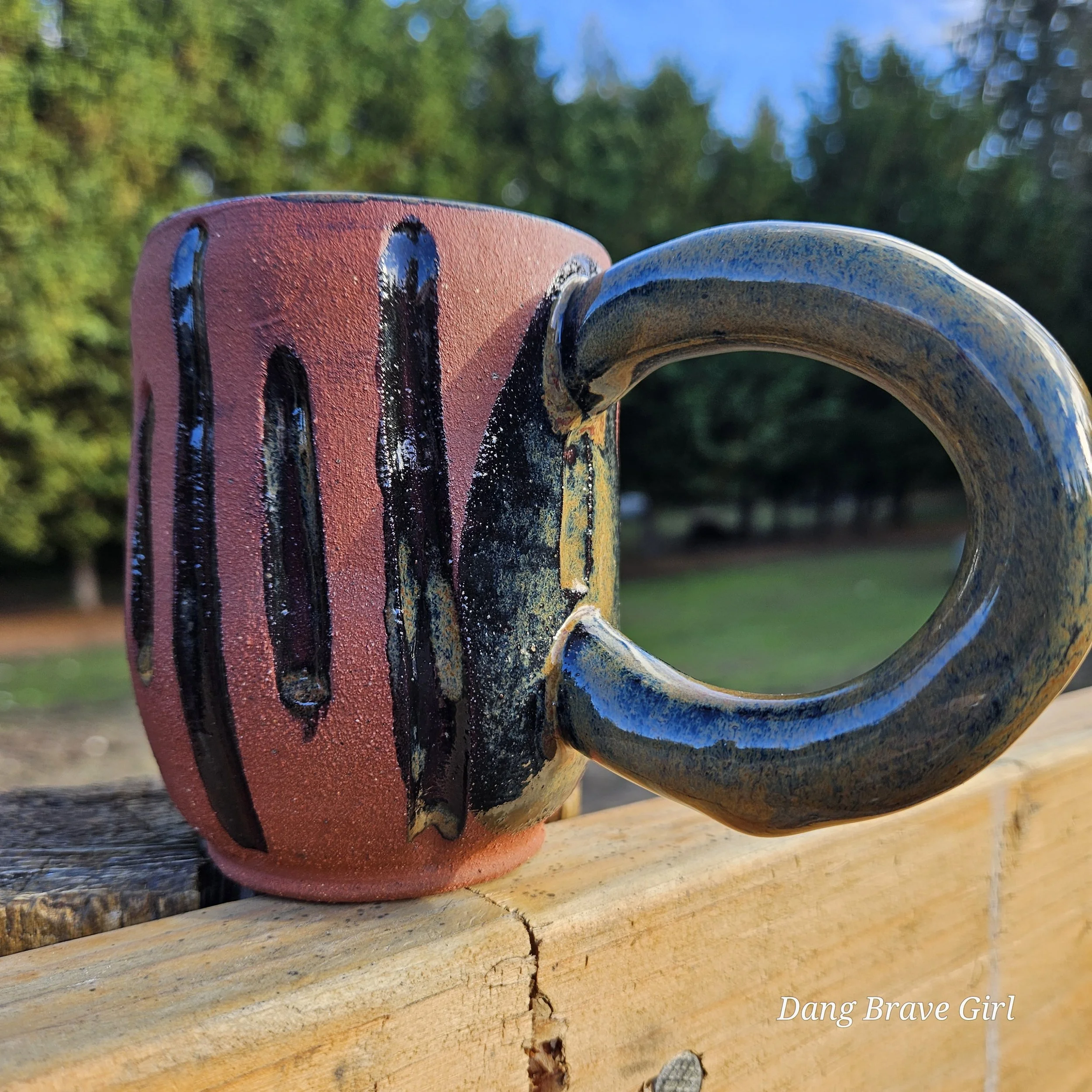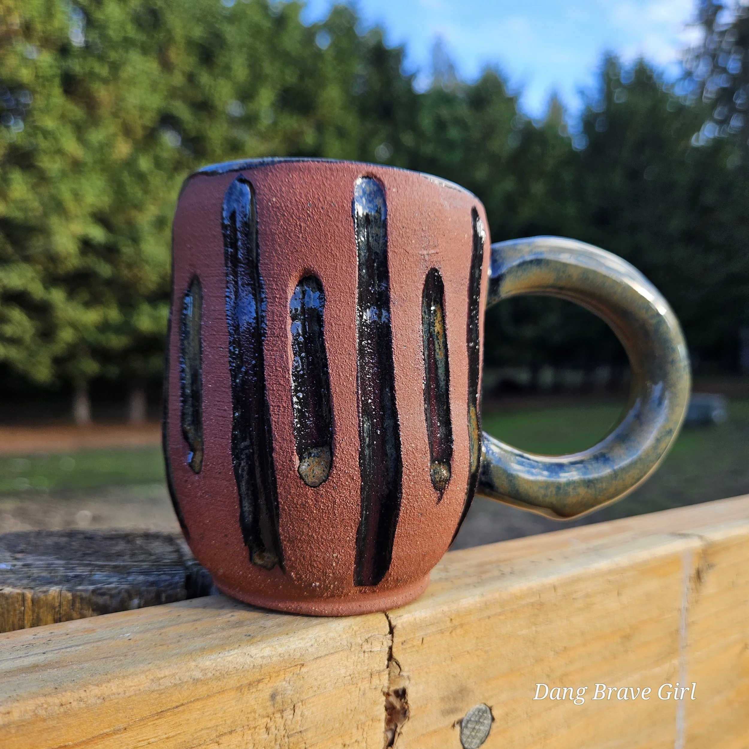 Handmade by the DBH with Oregon Red clay, this one of a kind hand carved mug has all the cool earthy vibes. Glazed with cola green.