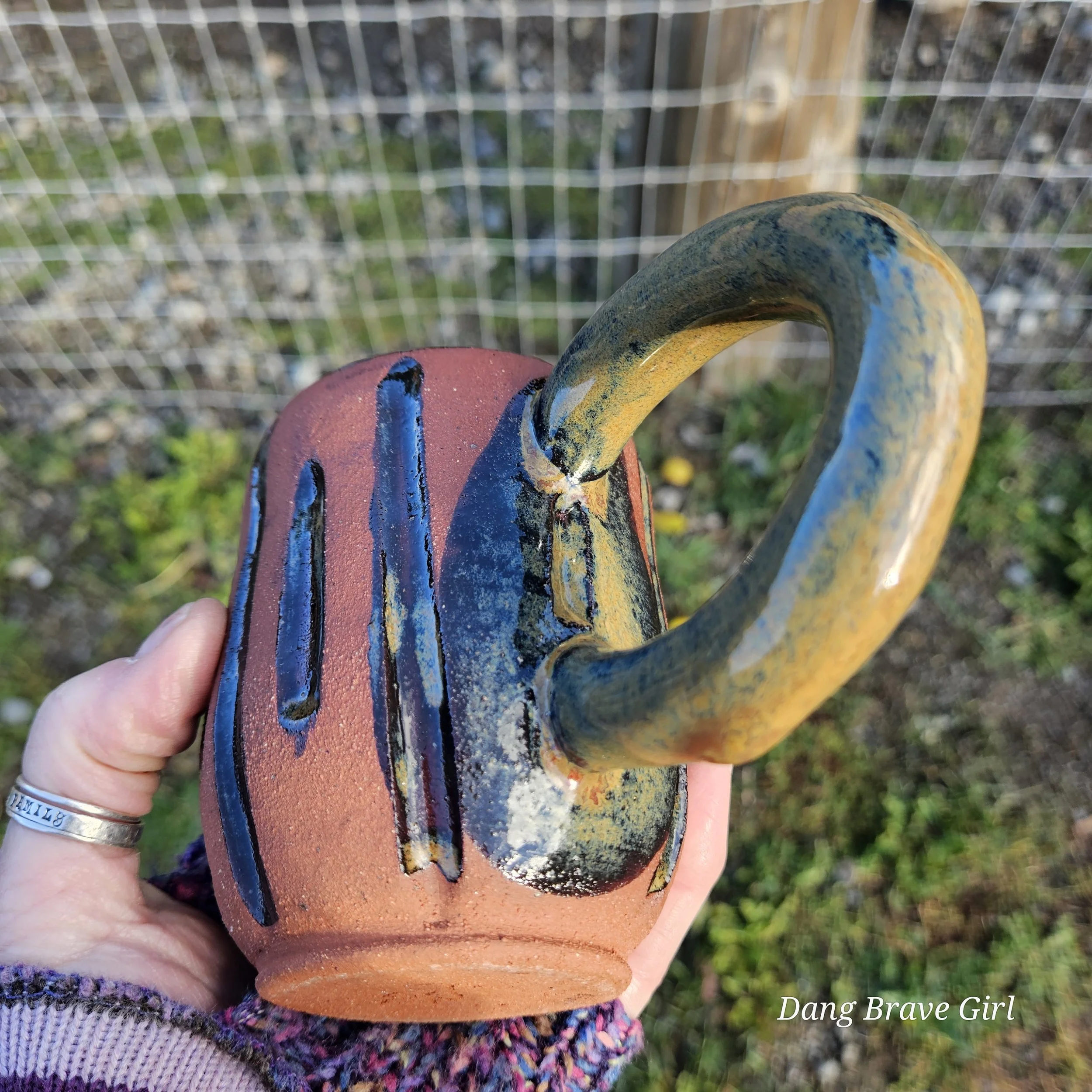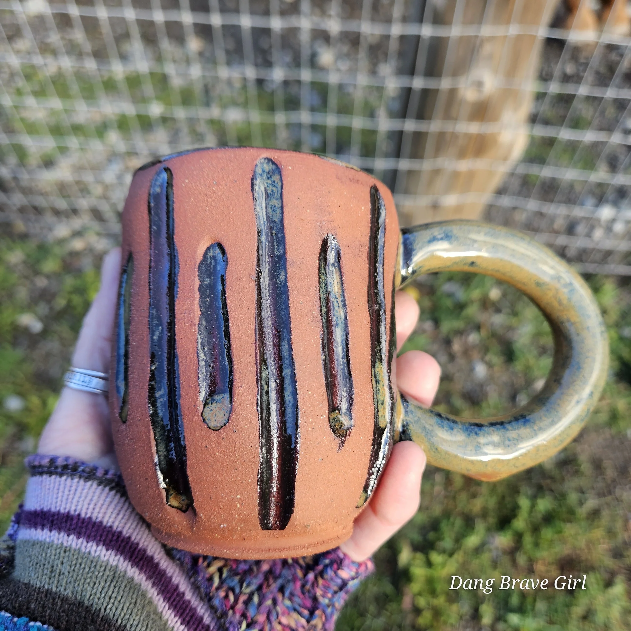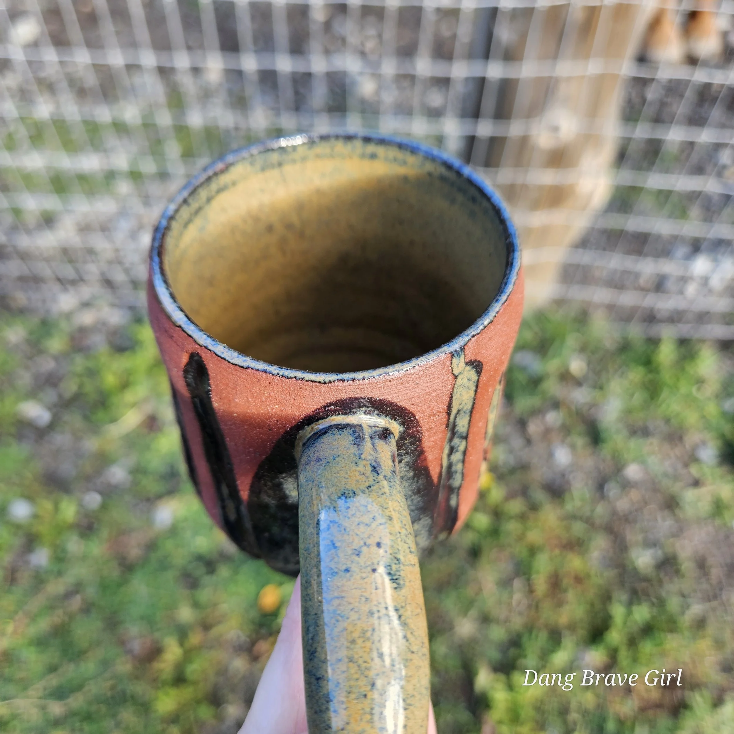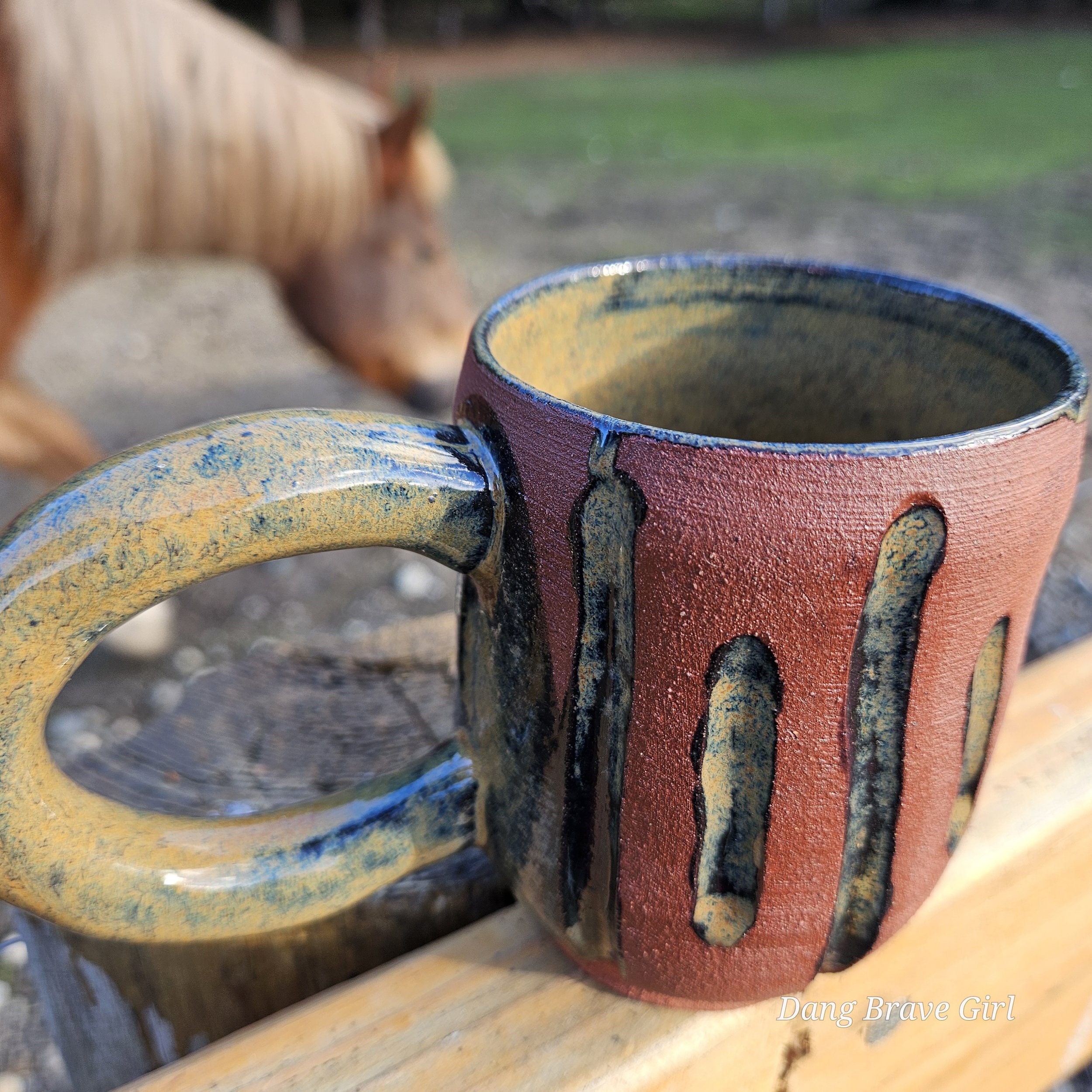 Handmade by the DBH with Oregon Red clay, this one of a kind hand carved mug has all the cool earthy vibes. Glazed with cola green.