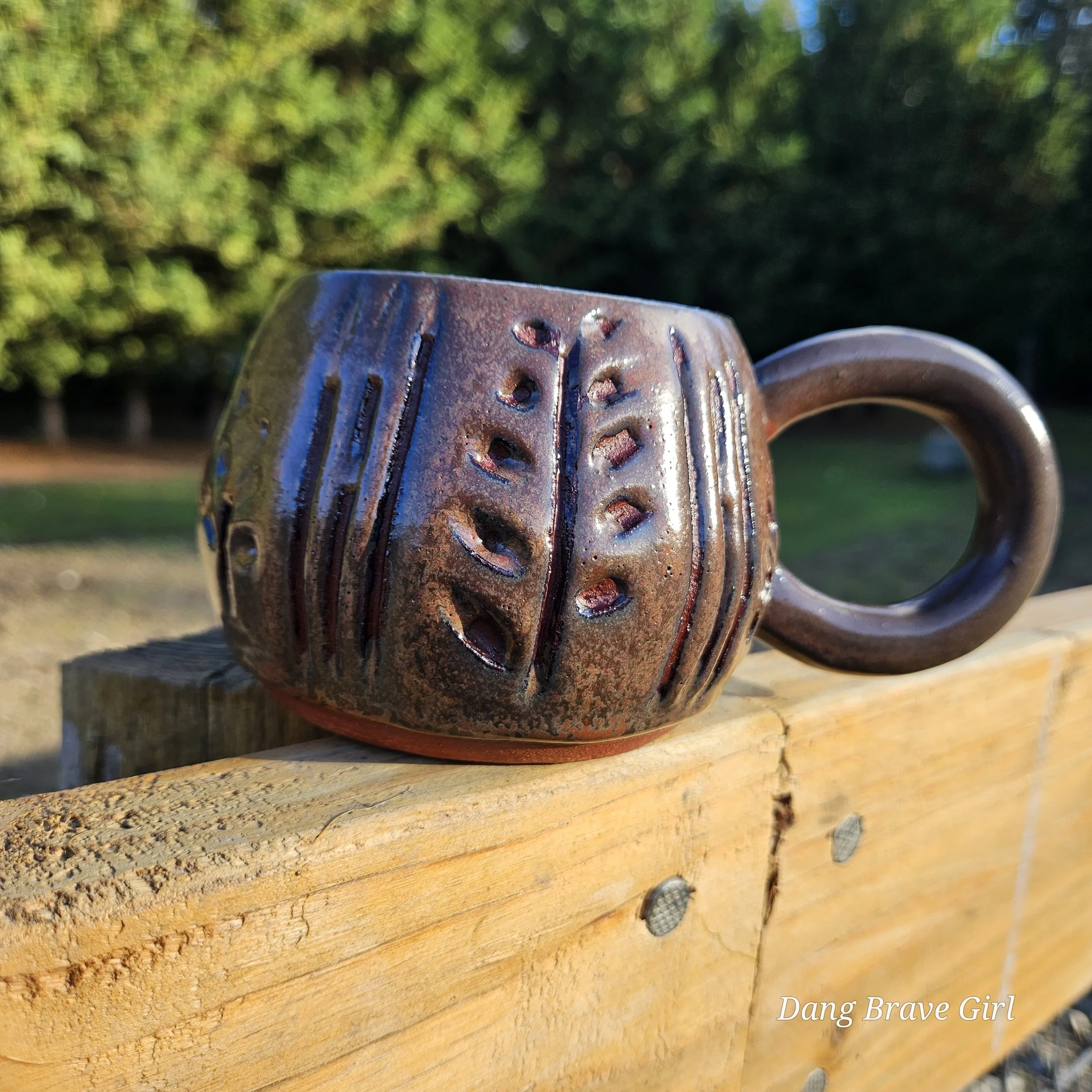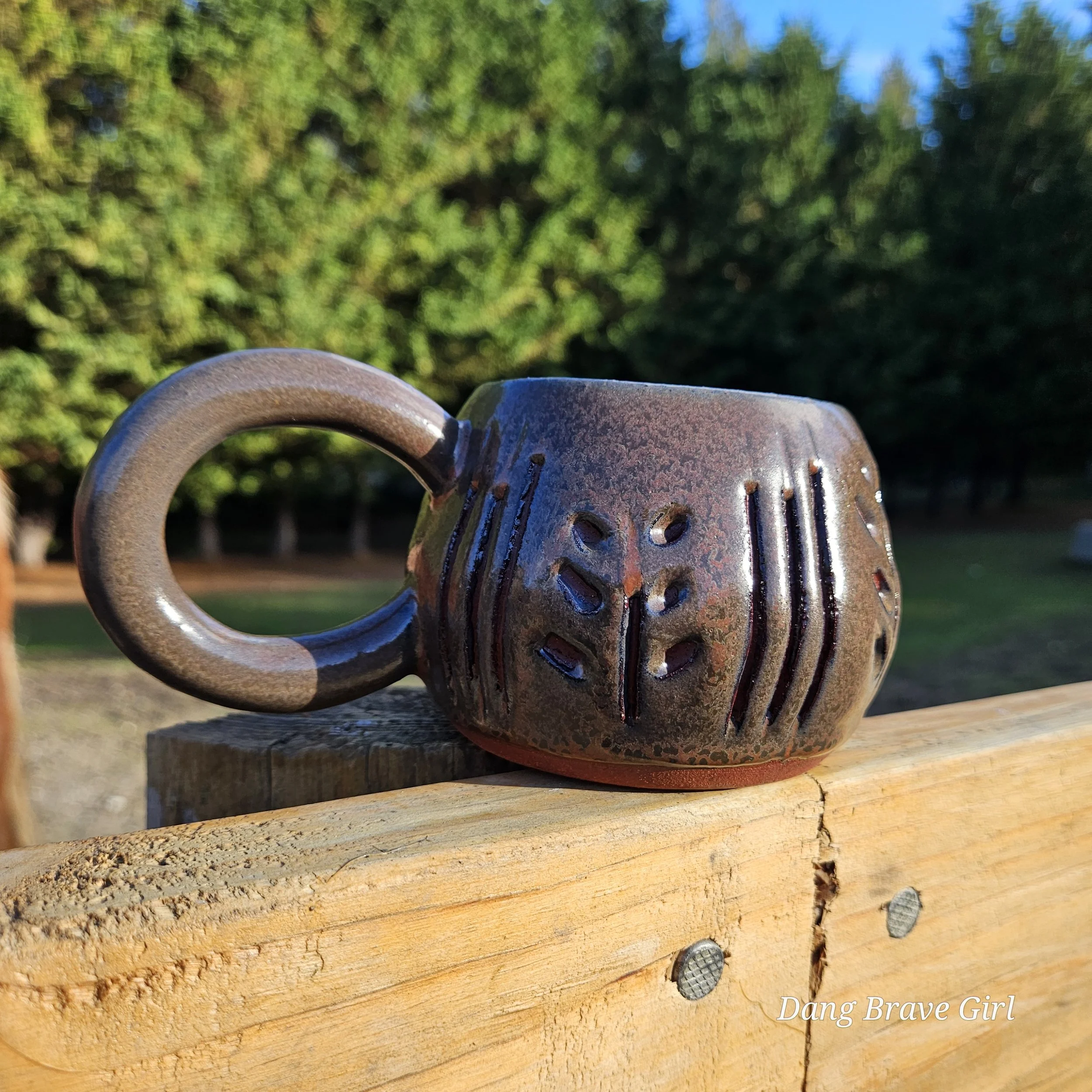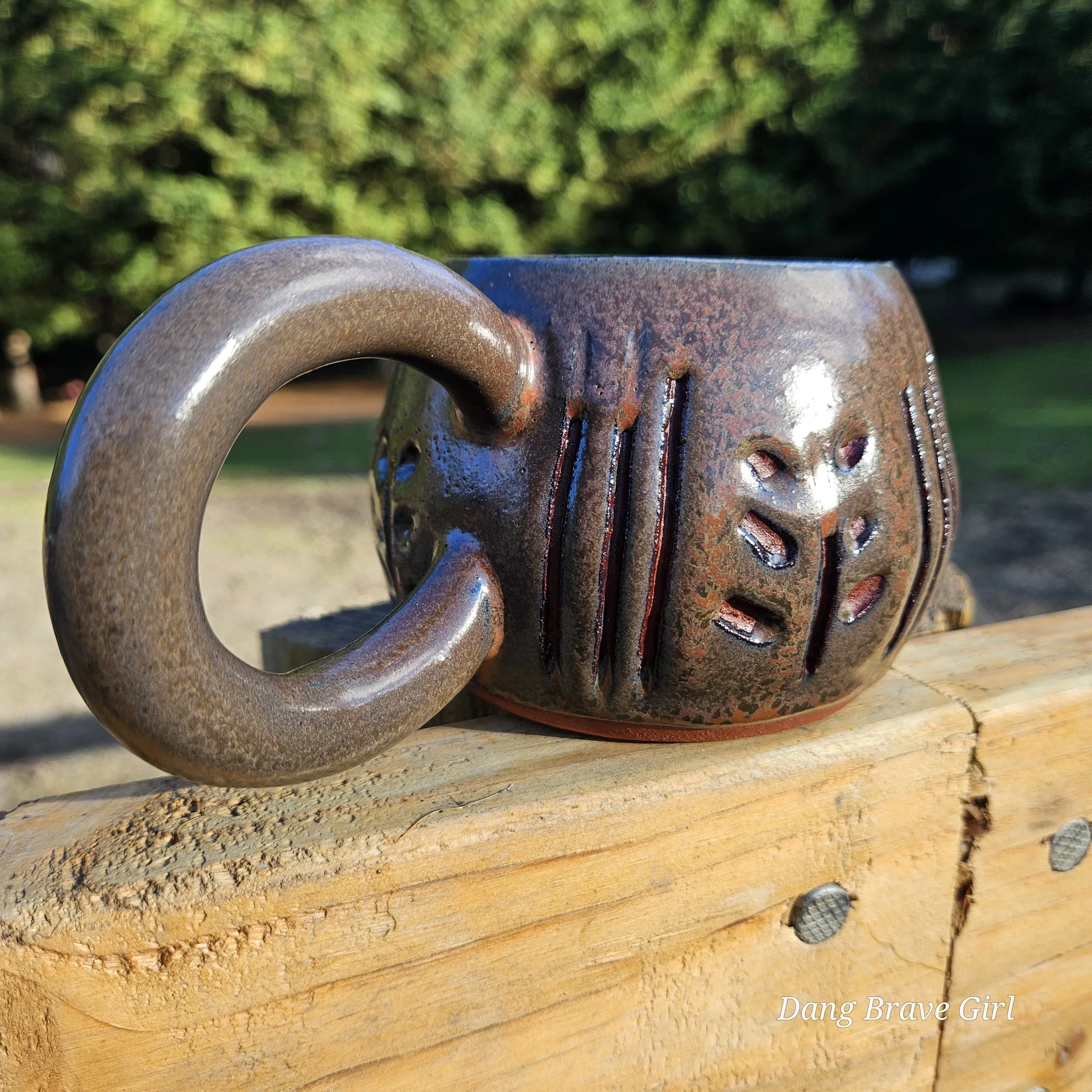 Handmade by the DBH with Oregon Red clay, this hand carved mug is wonderful size and has the coolest handle. Glazed with Ketchup (not heinz….).