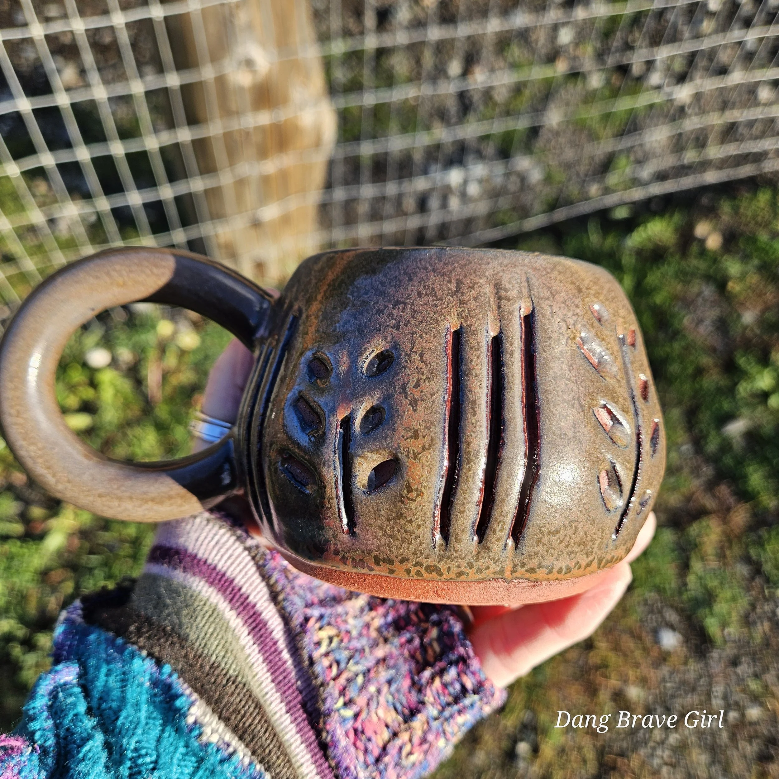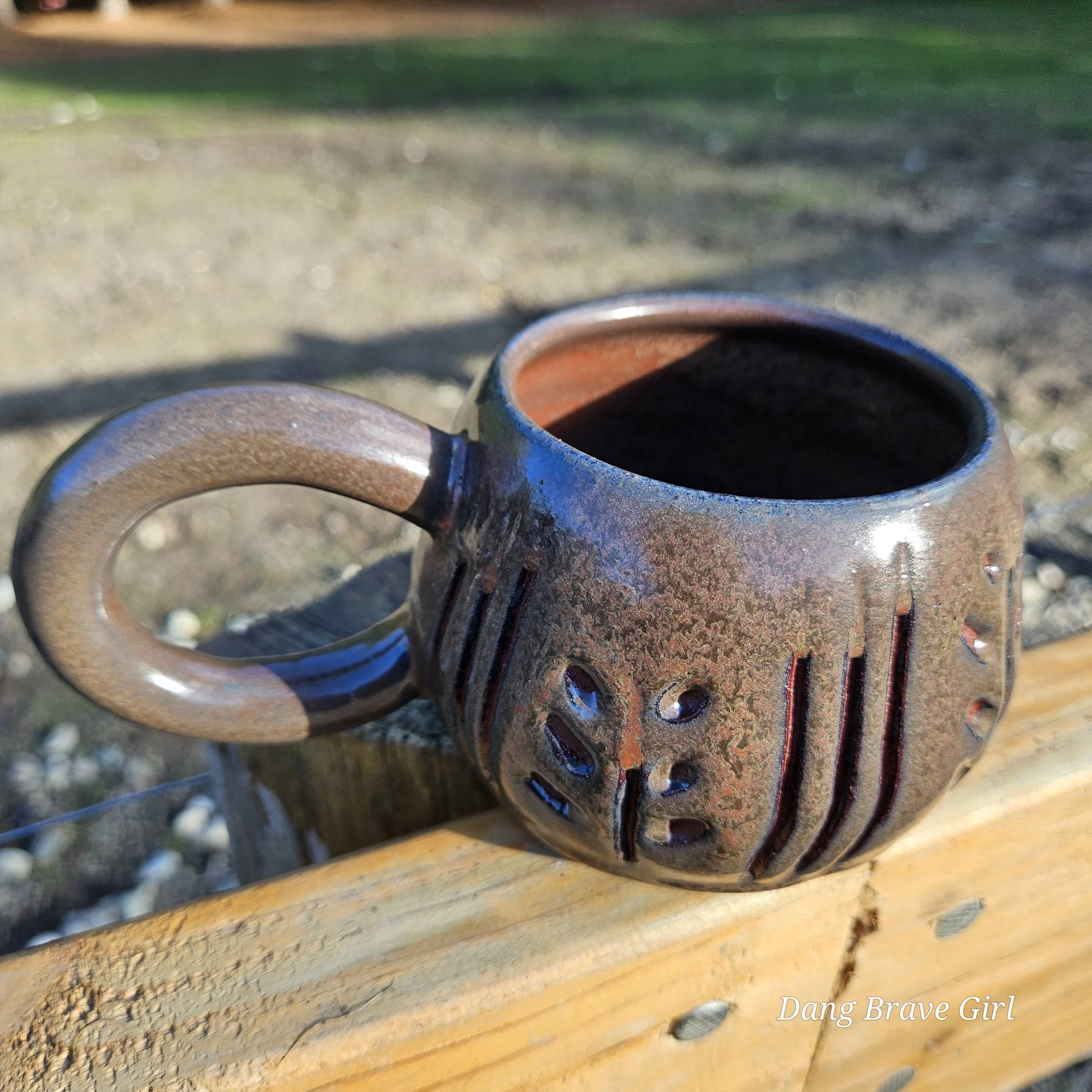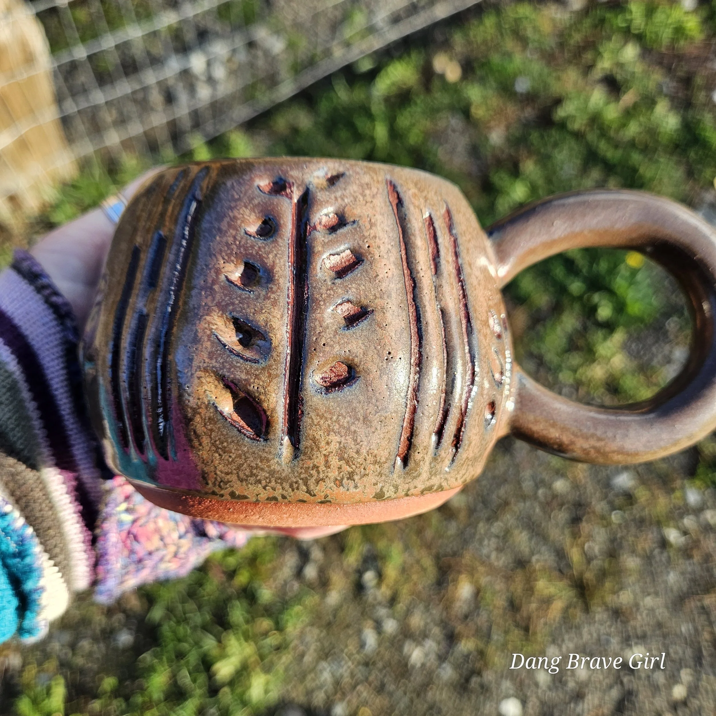 Handmade by the DBH with Oregon Red clay, this hand carved mug is wonderful size and has the coolest handle. Glazed with Ketchup (not heinz….).