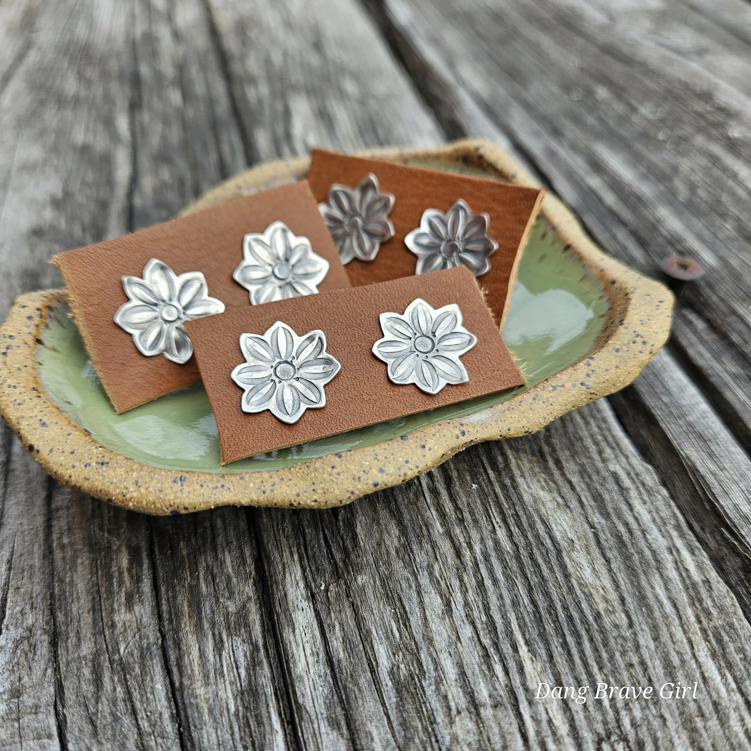 The size 7.5 band measures 7/16” wide and supports the 1 1/8” wide flower above. It’s all finished with a rich patina and soft polish to highlight the details.