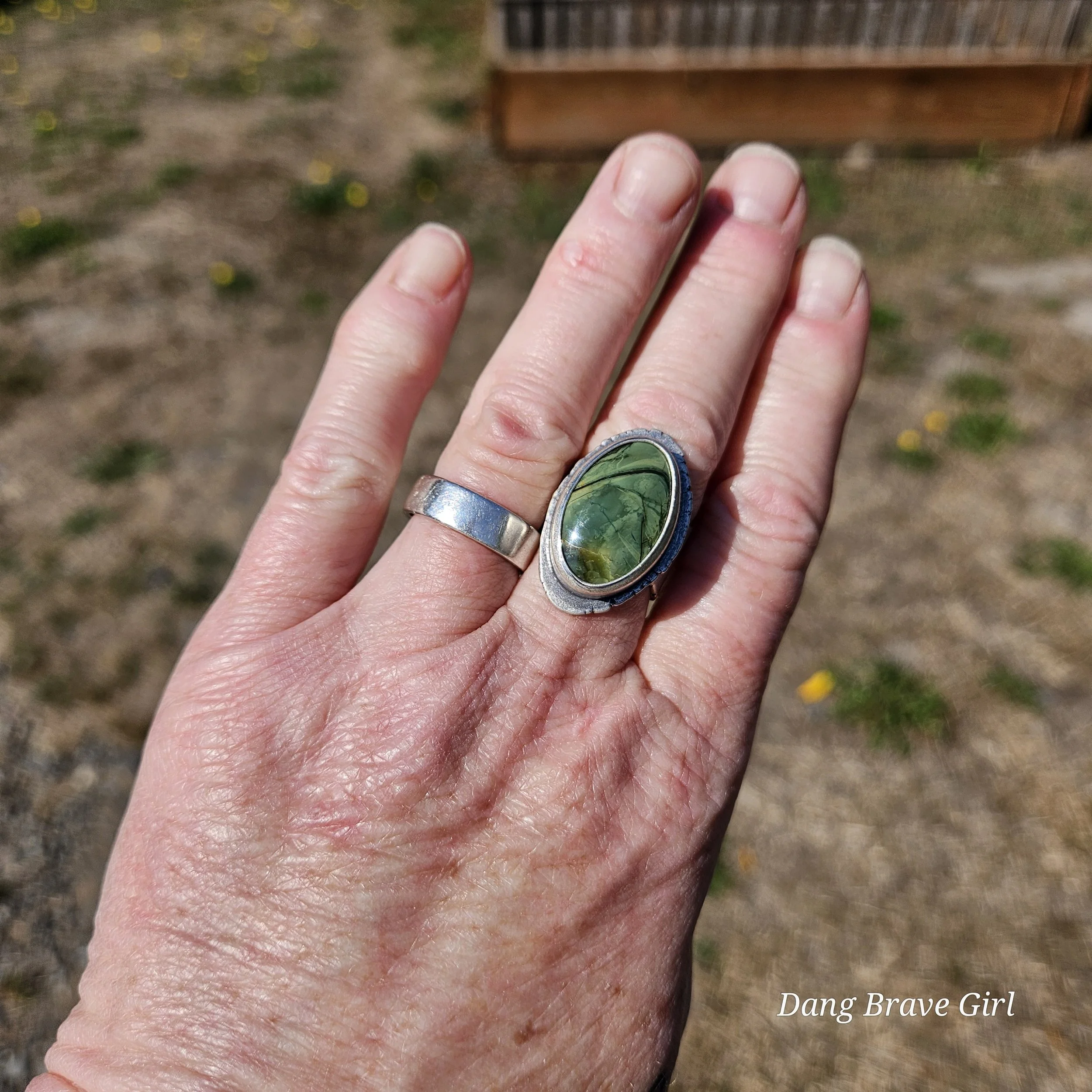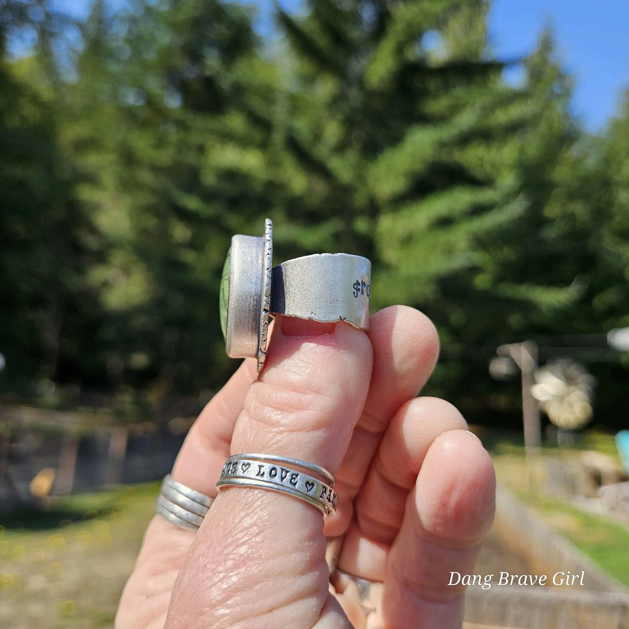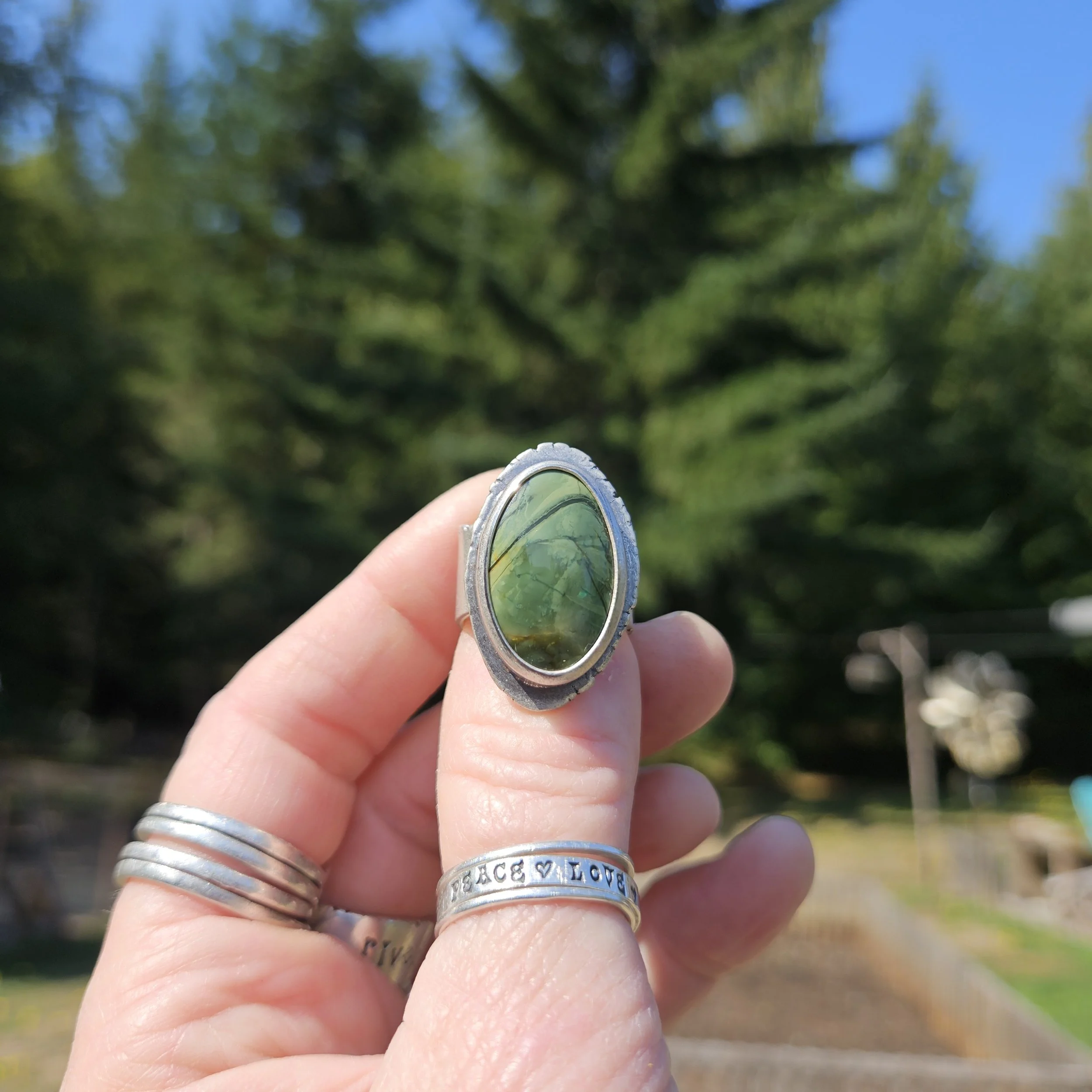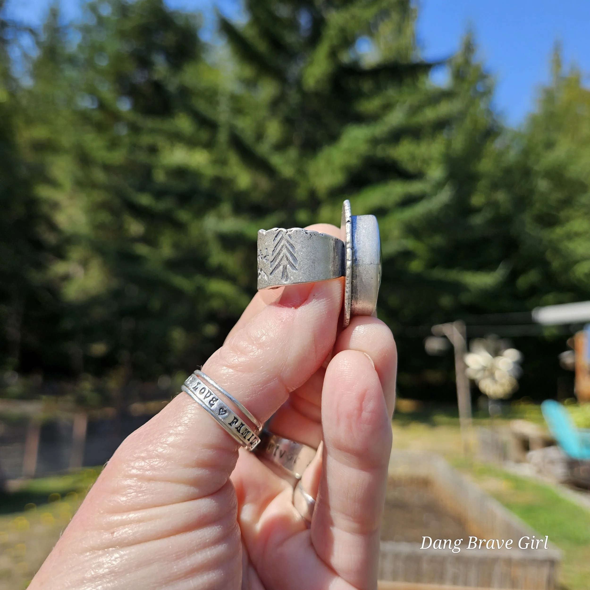 The ring is hand crafted with both bronze and silver…both in my 5R style of Repurposed, Recycled, Reclaimed, Redeemed and Reloved…the metals from broken jewelry, vintage silverware, scraps of my work…it’s all melted down and made lovable again.