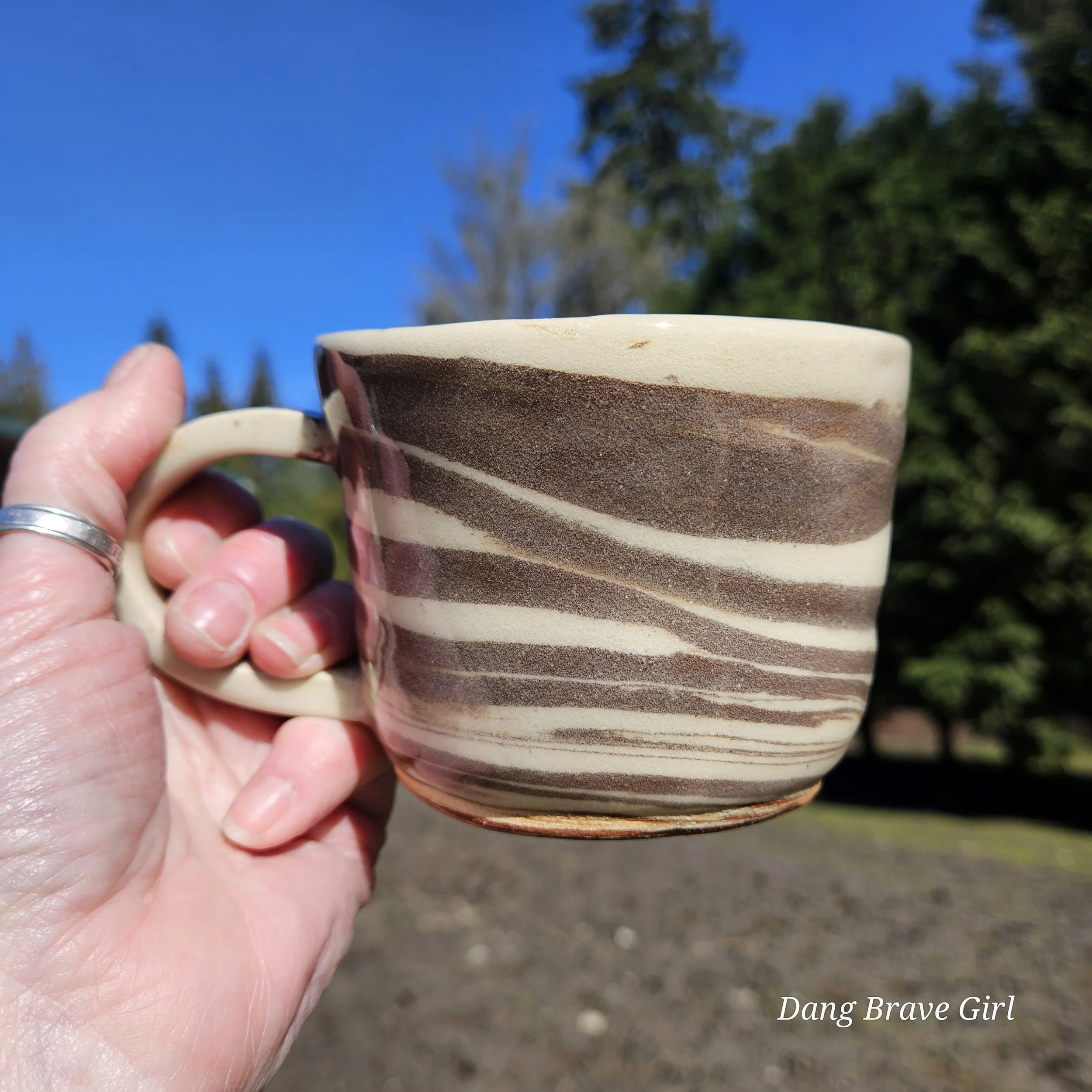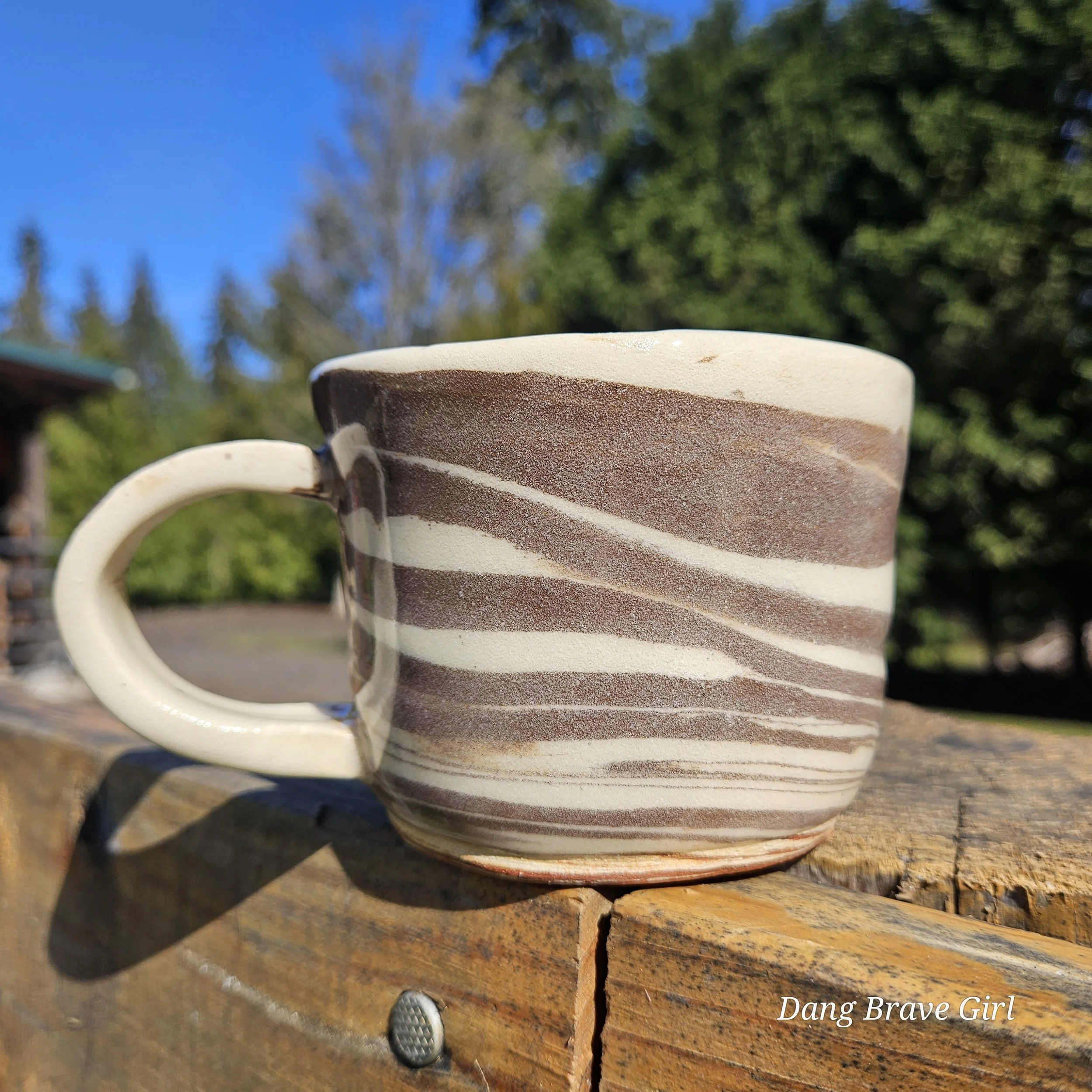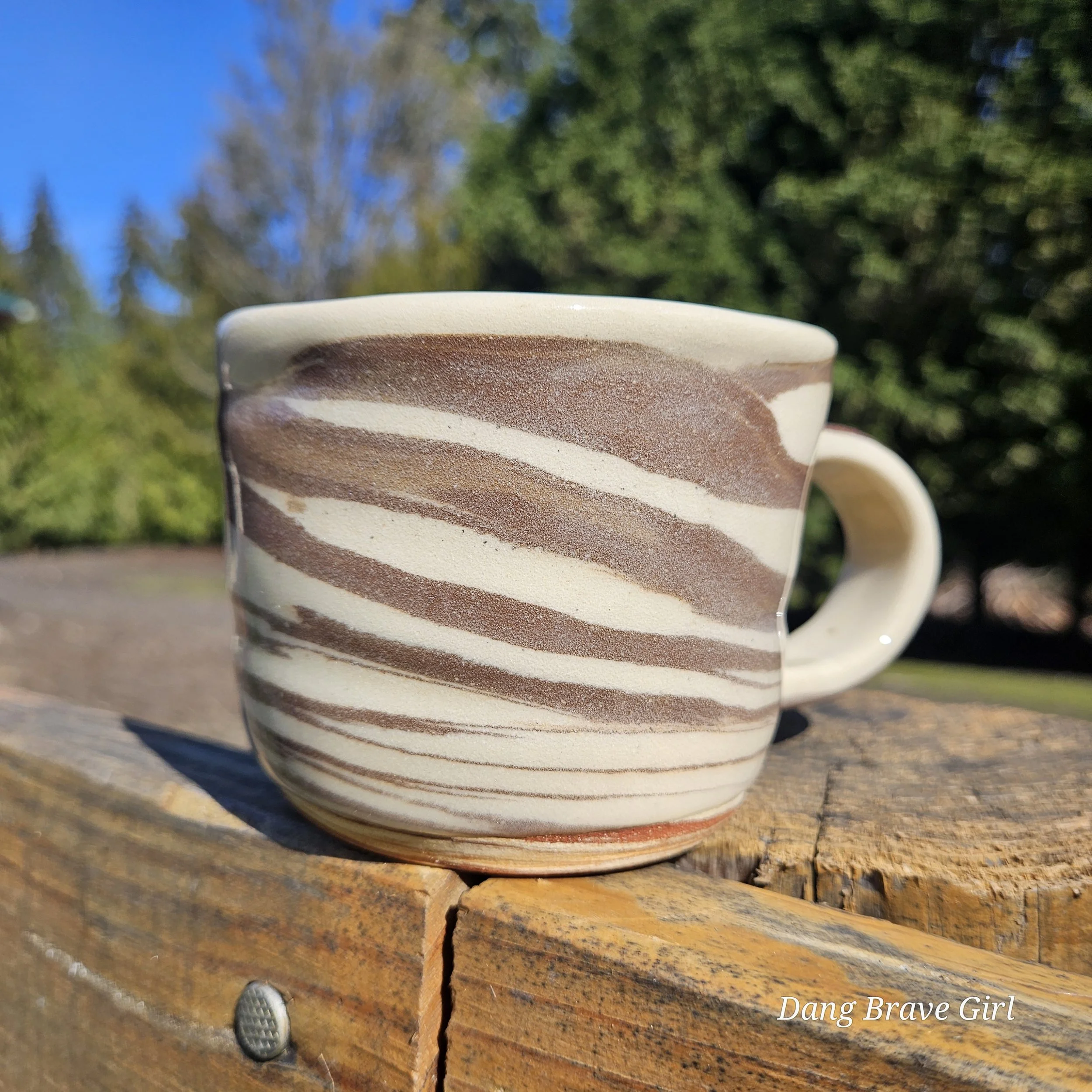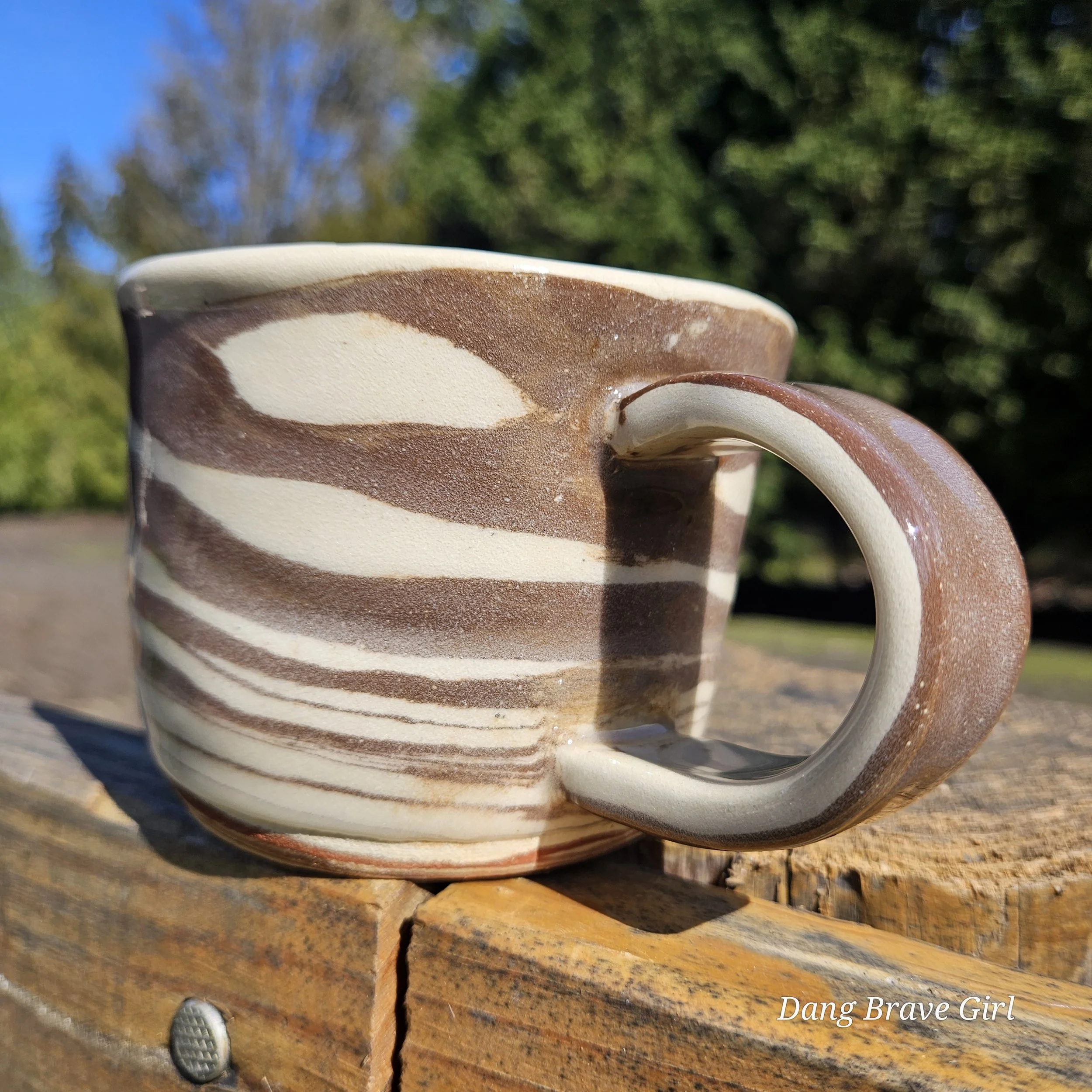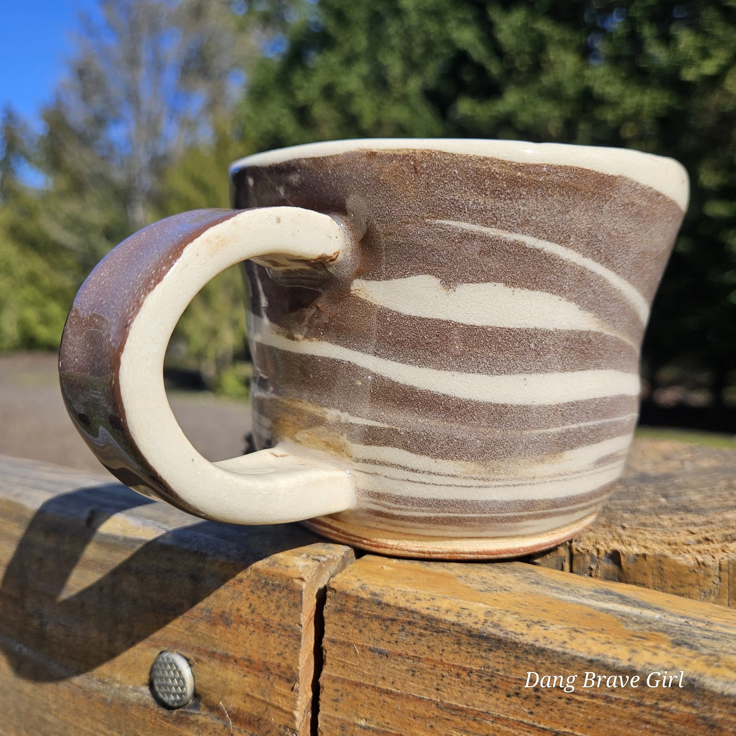 Handmade by the DBH with both Oregon Red clay and a creamy stoneware. Blending the 2 clays on the wheel created this swirl effect and I can’t help but see ice cream! Finished with a clear glaze, this is ready for your coffee (or ice cream).