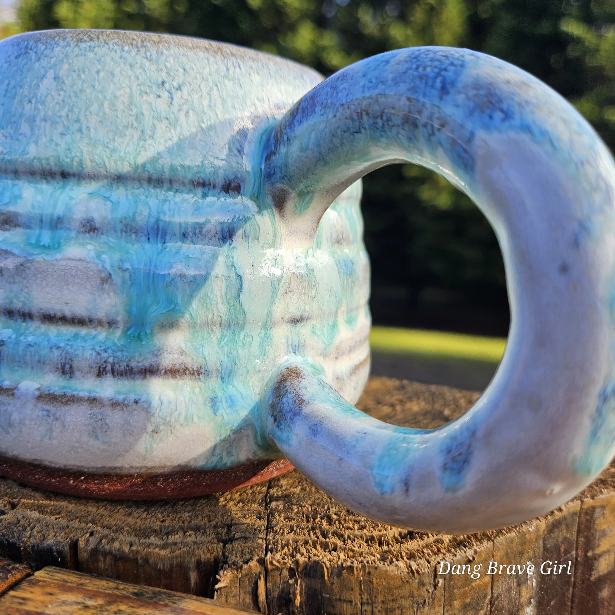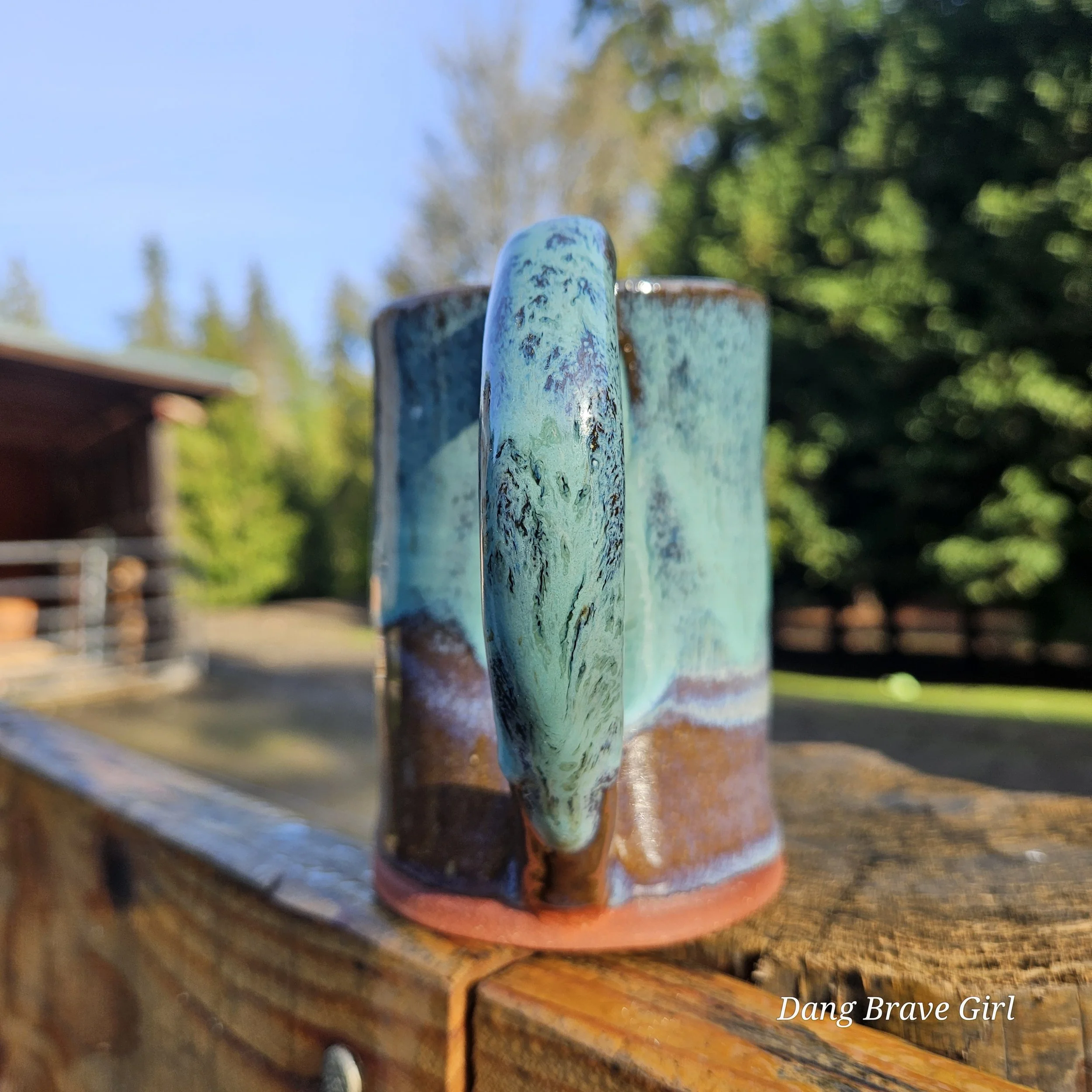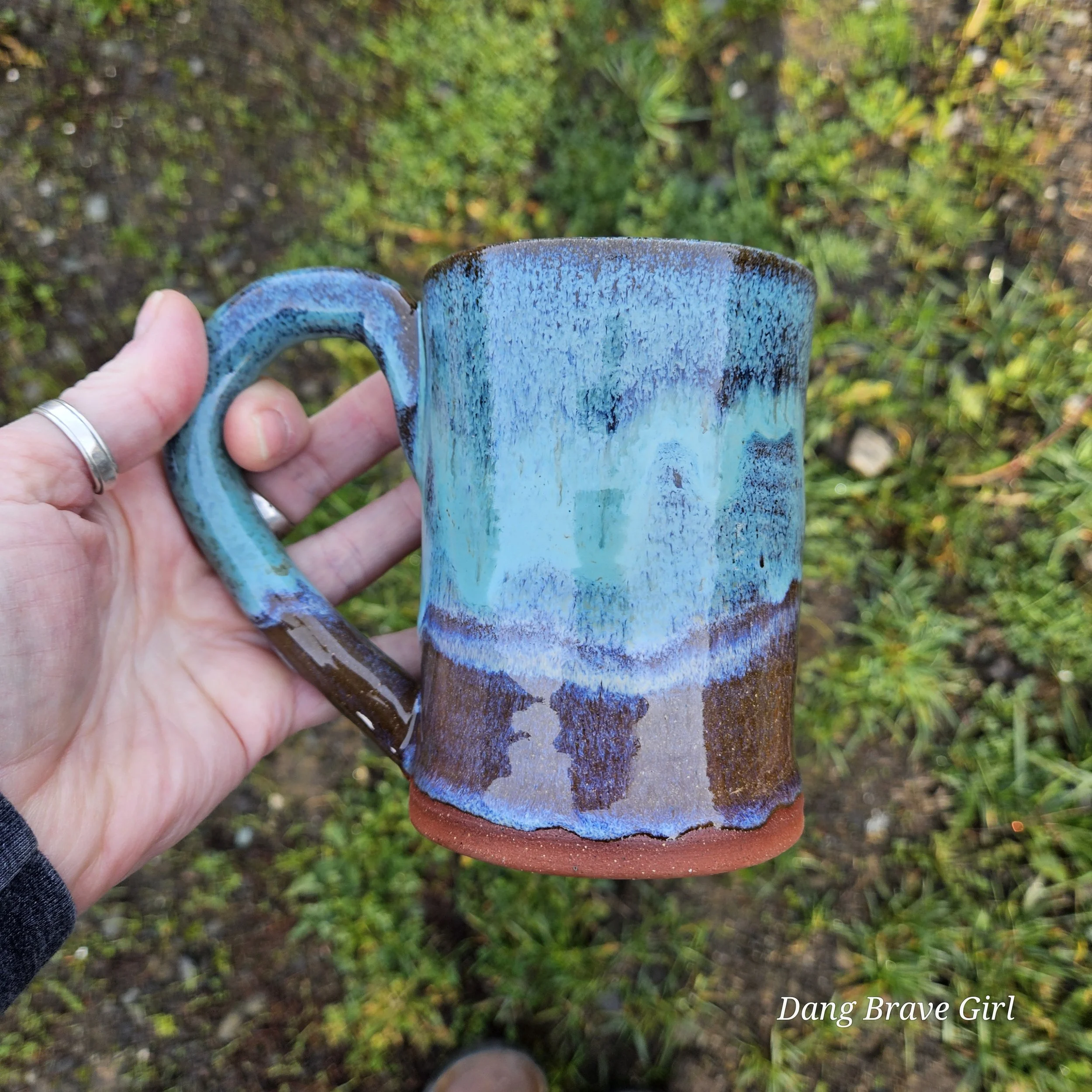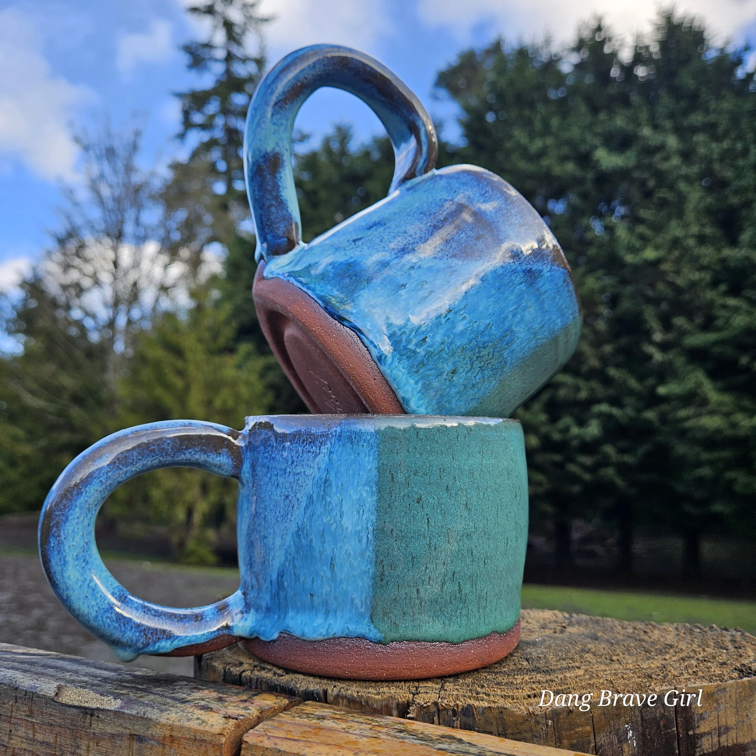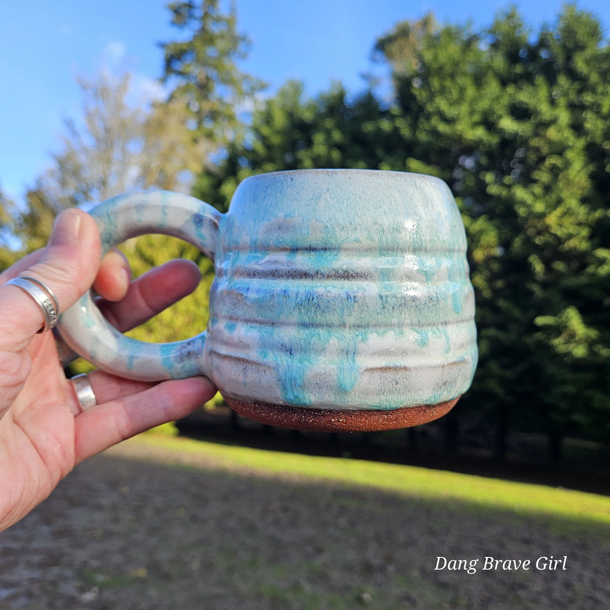 Handmade by the DBH with Oregon Red clay and I dare you not to fall in love with these colors. The perfect glaze drip of Caribbean over Milky Clear. And don’t forget to love on that great handle!