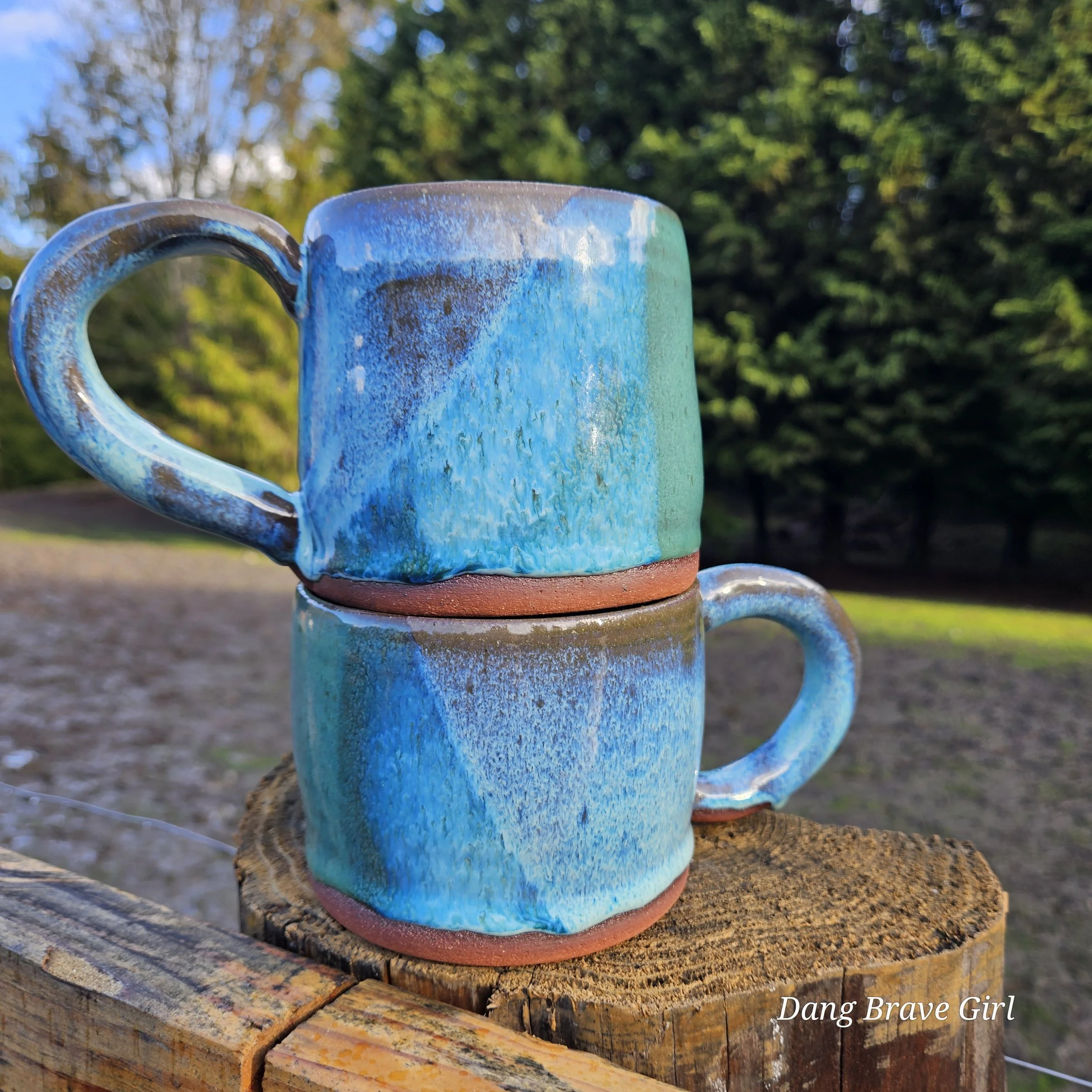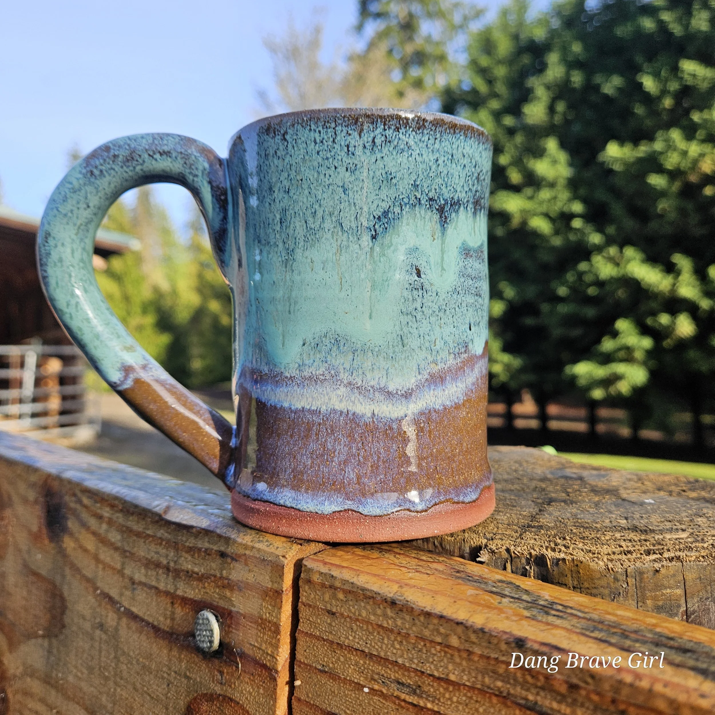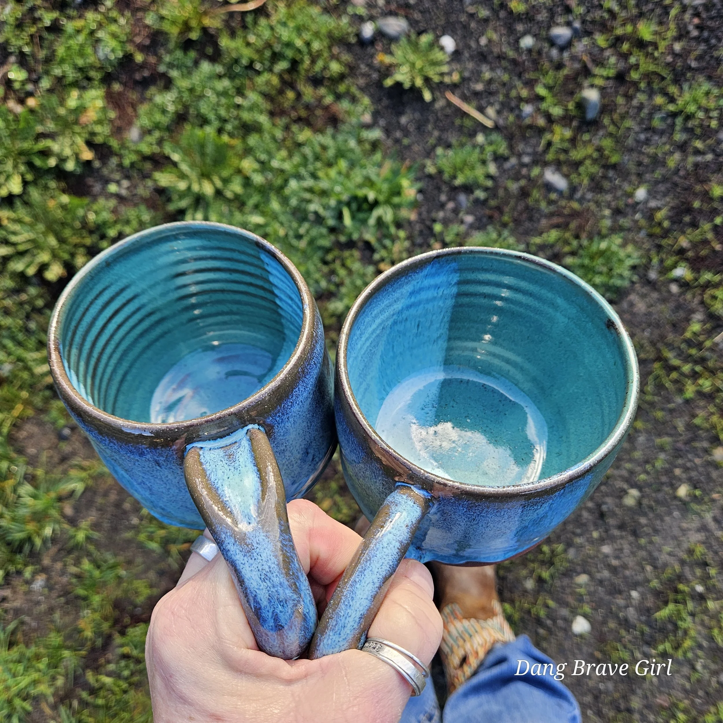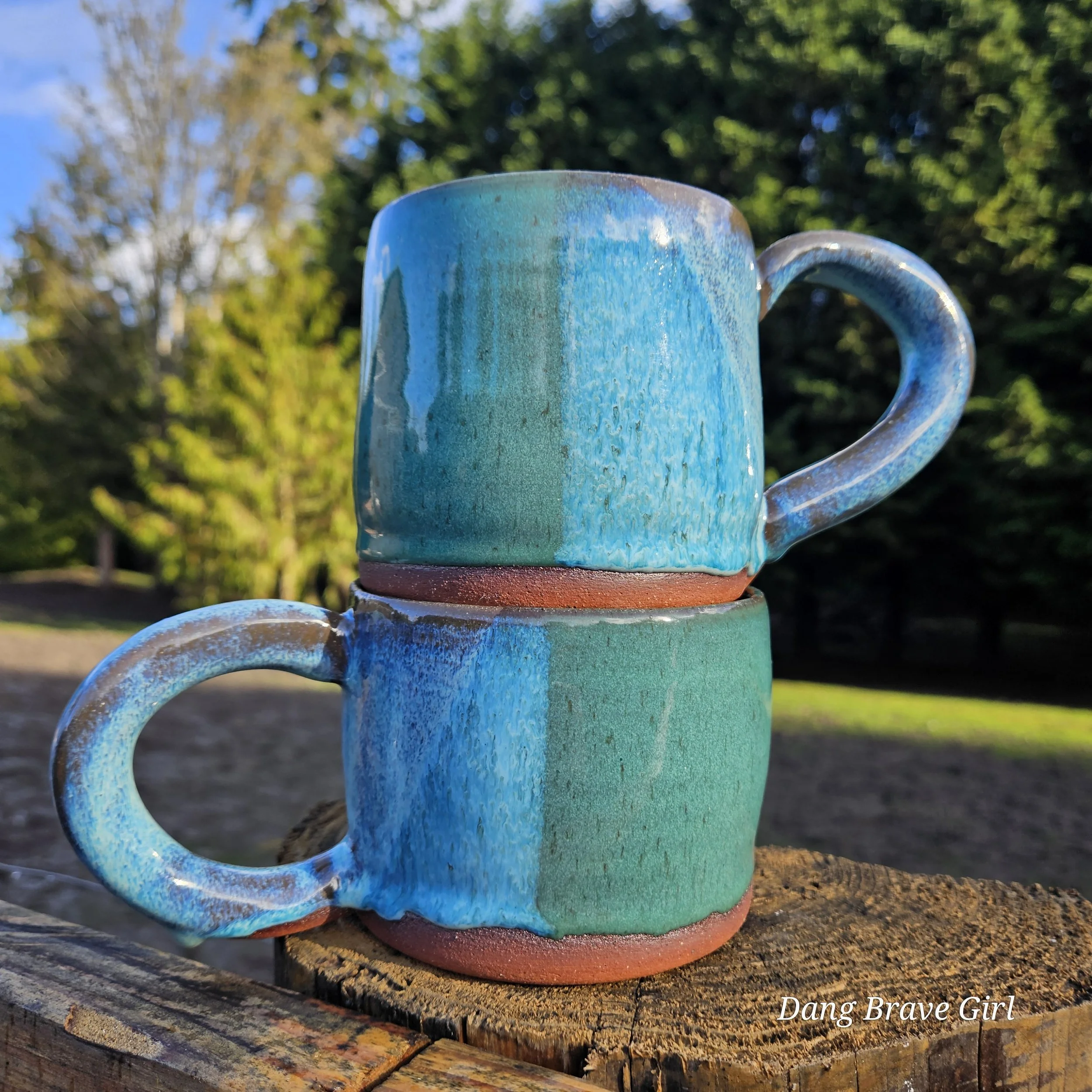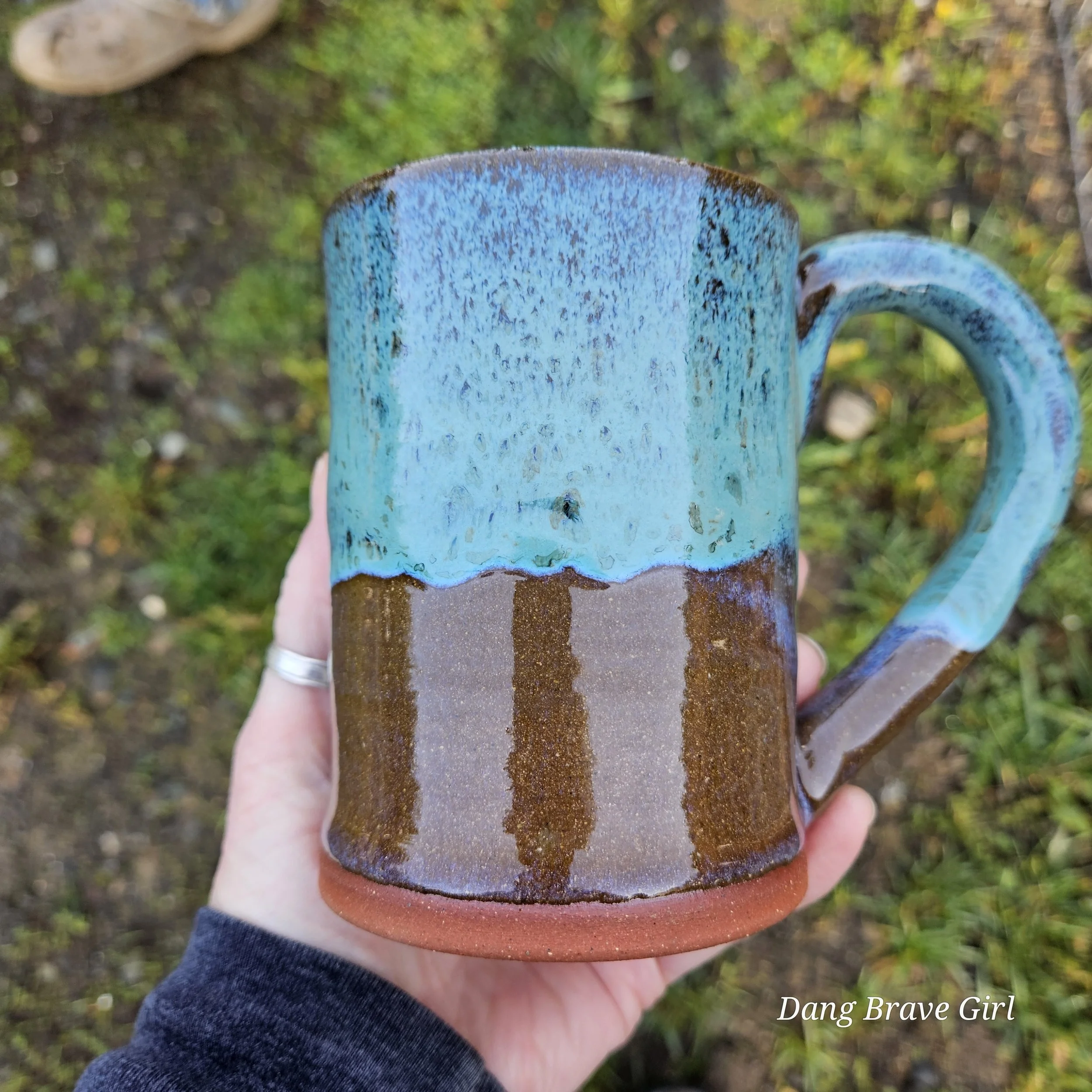 Handmade by the DBH with Oregon Red clay and I dare you not to fall in love with these colors. The perfect glaze drip of Caribbean over Milky Clear. And don’t forget to love on that great handle!