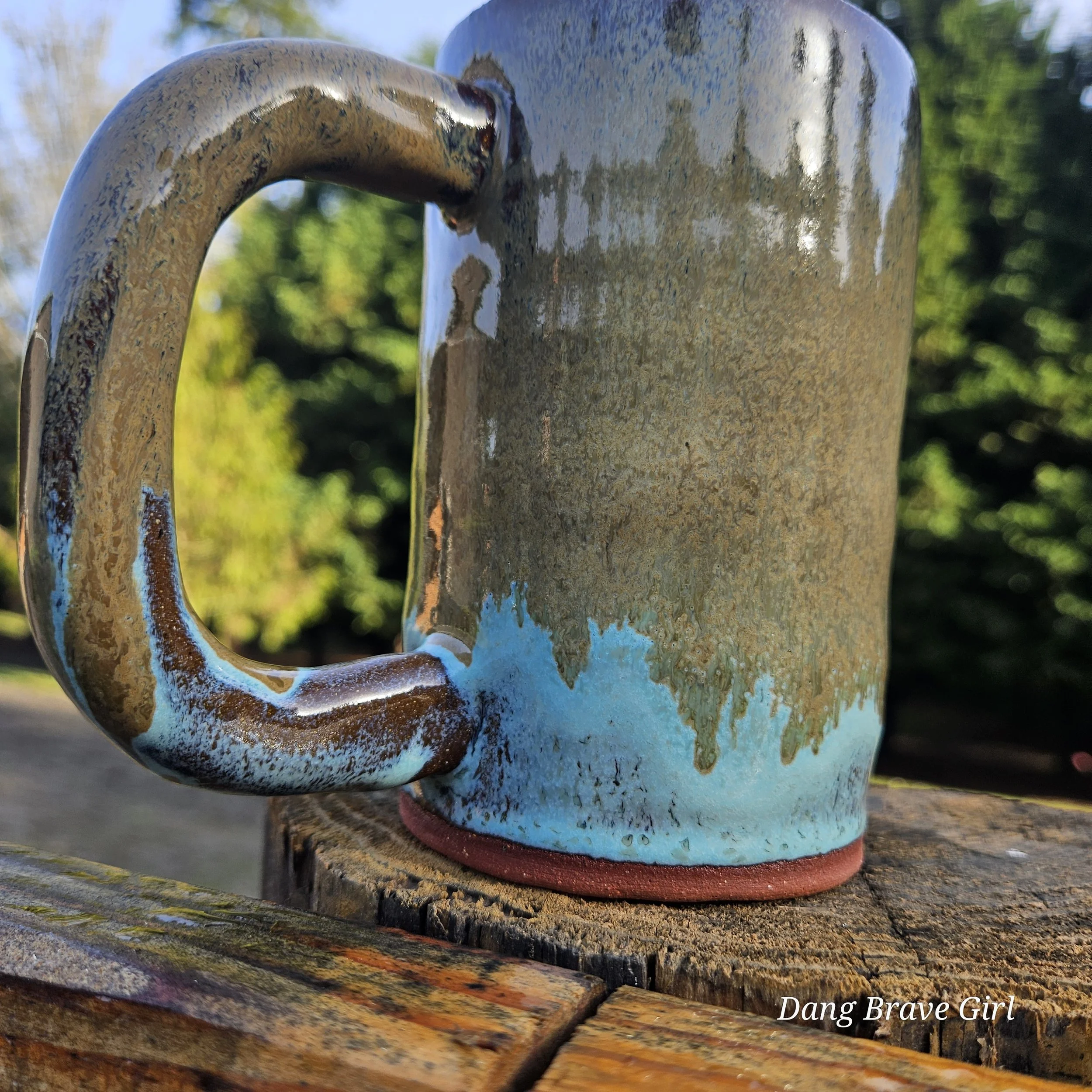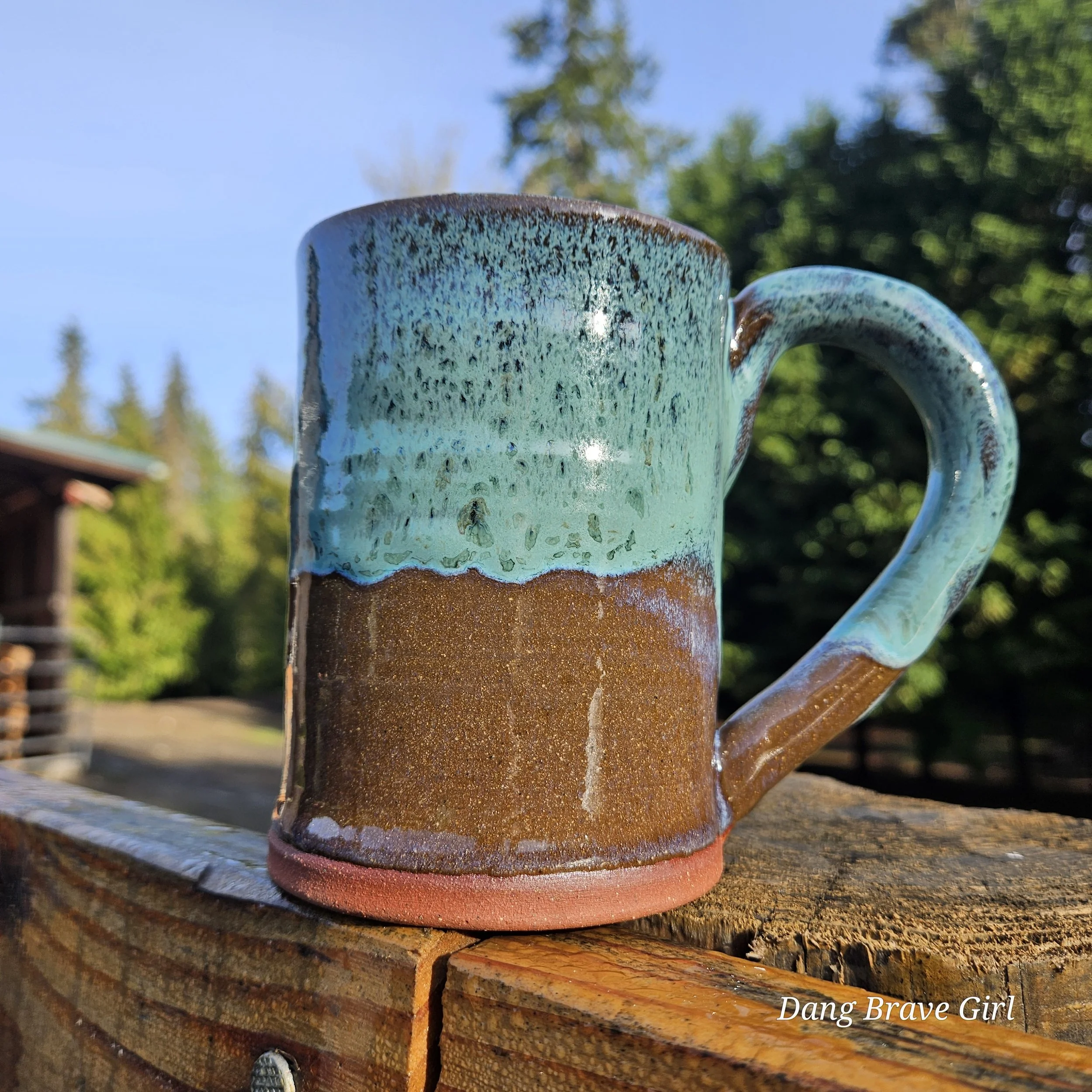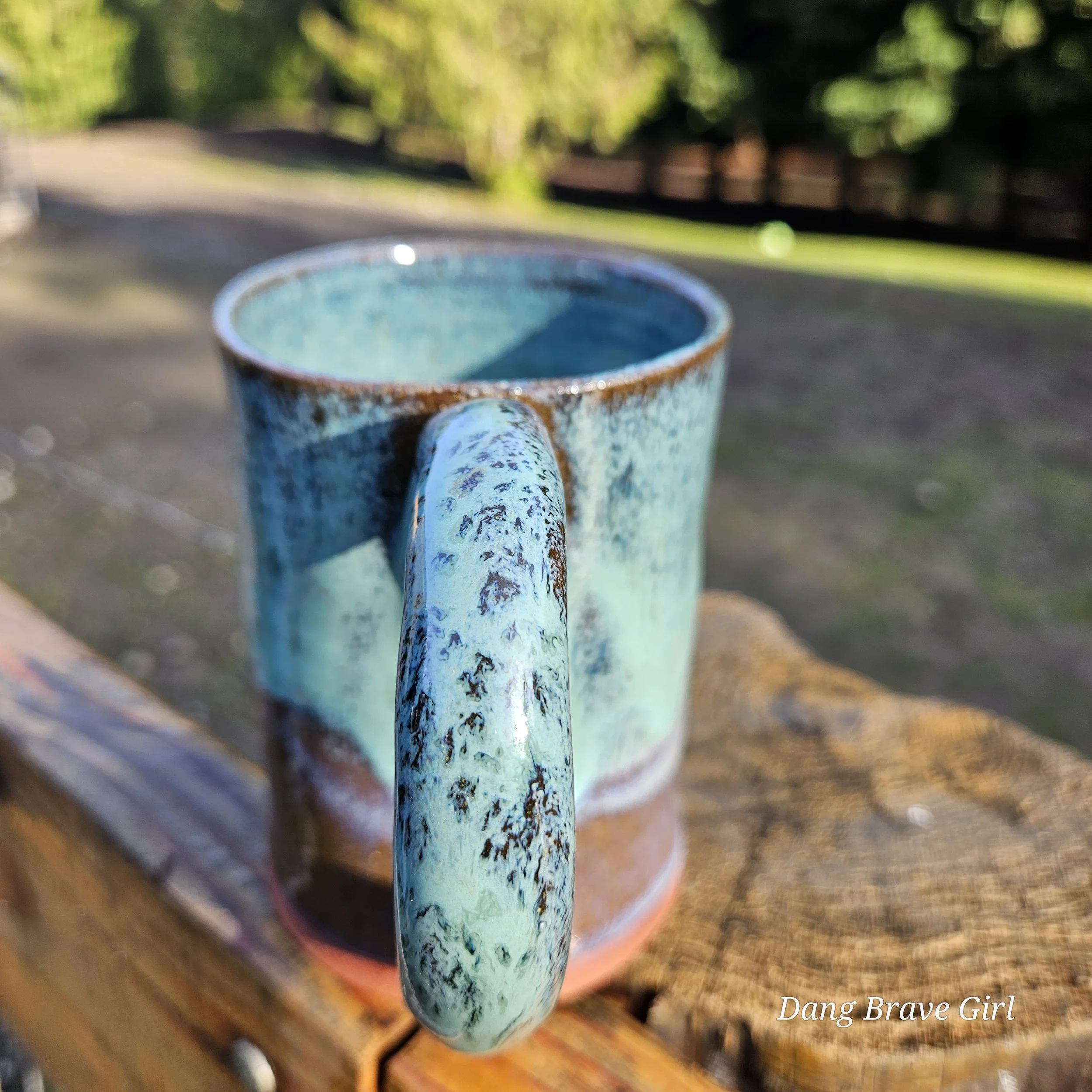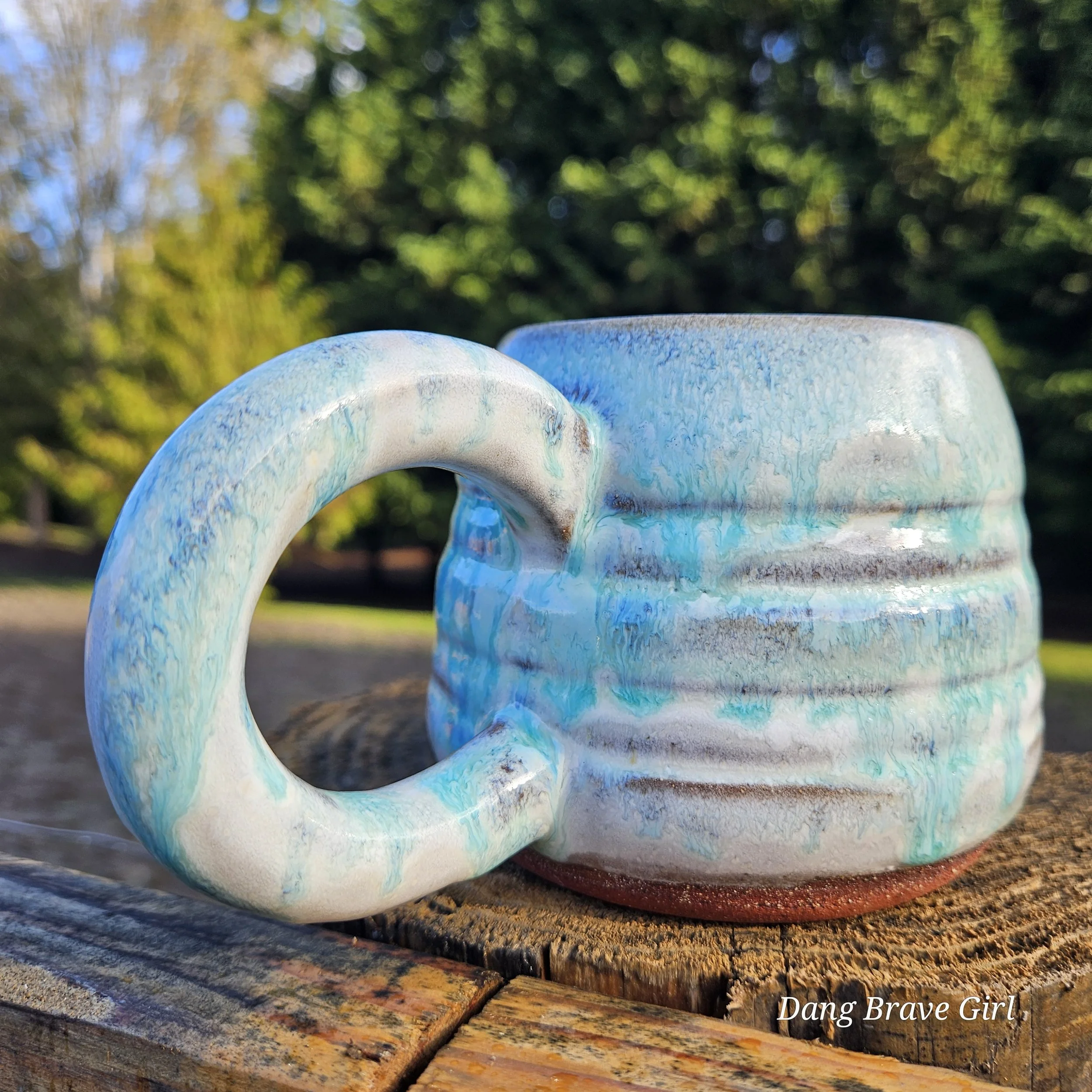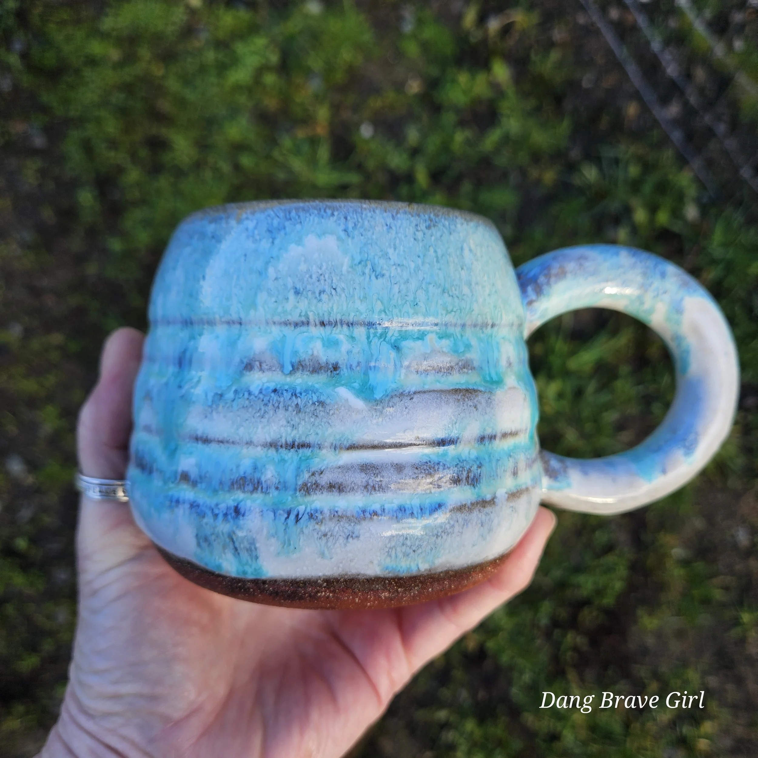 Handmade by the DBH with Oregon Red clay and I dare you not to fall in love with these colors. The perfect glaze drip of Caribbean over Milky Clear. And don’t forget to love on that great handle!