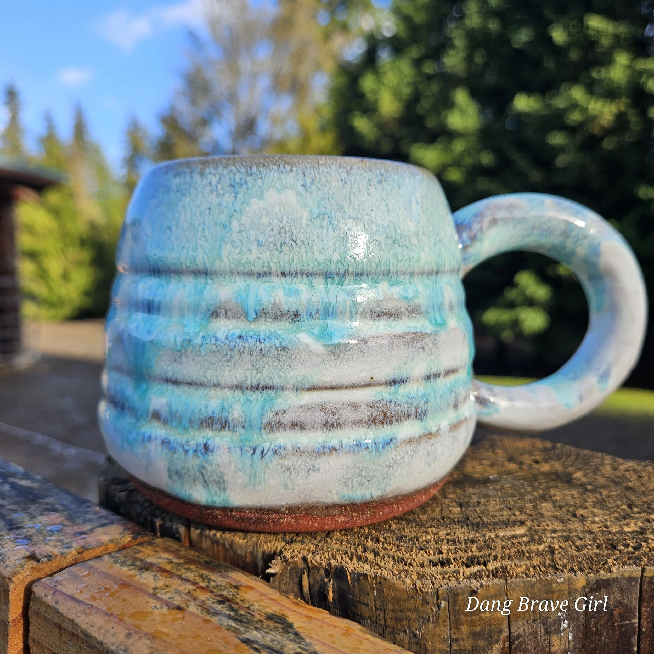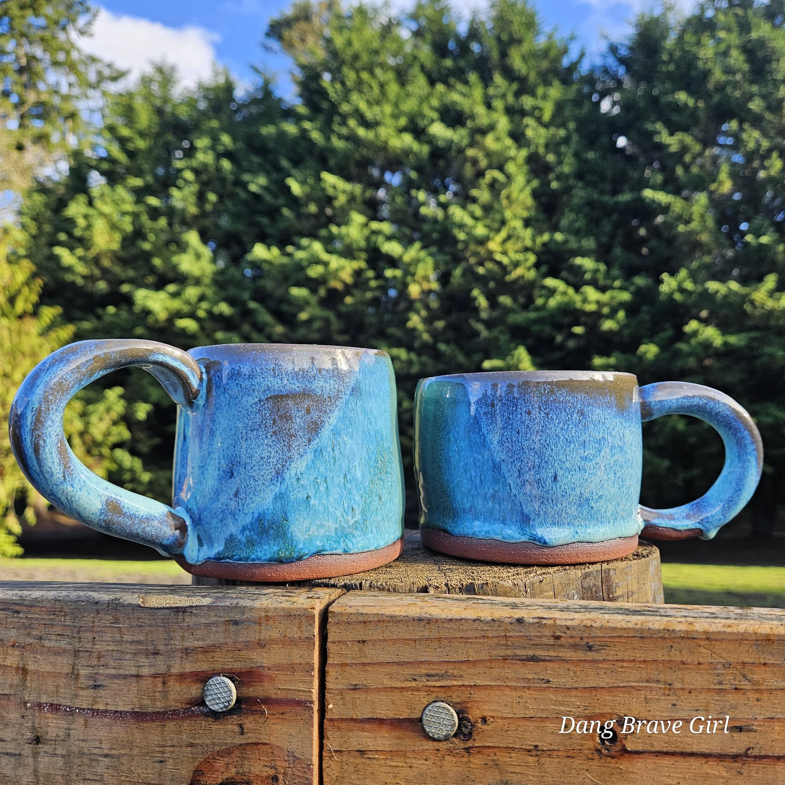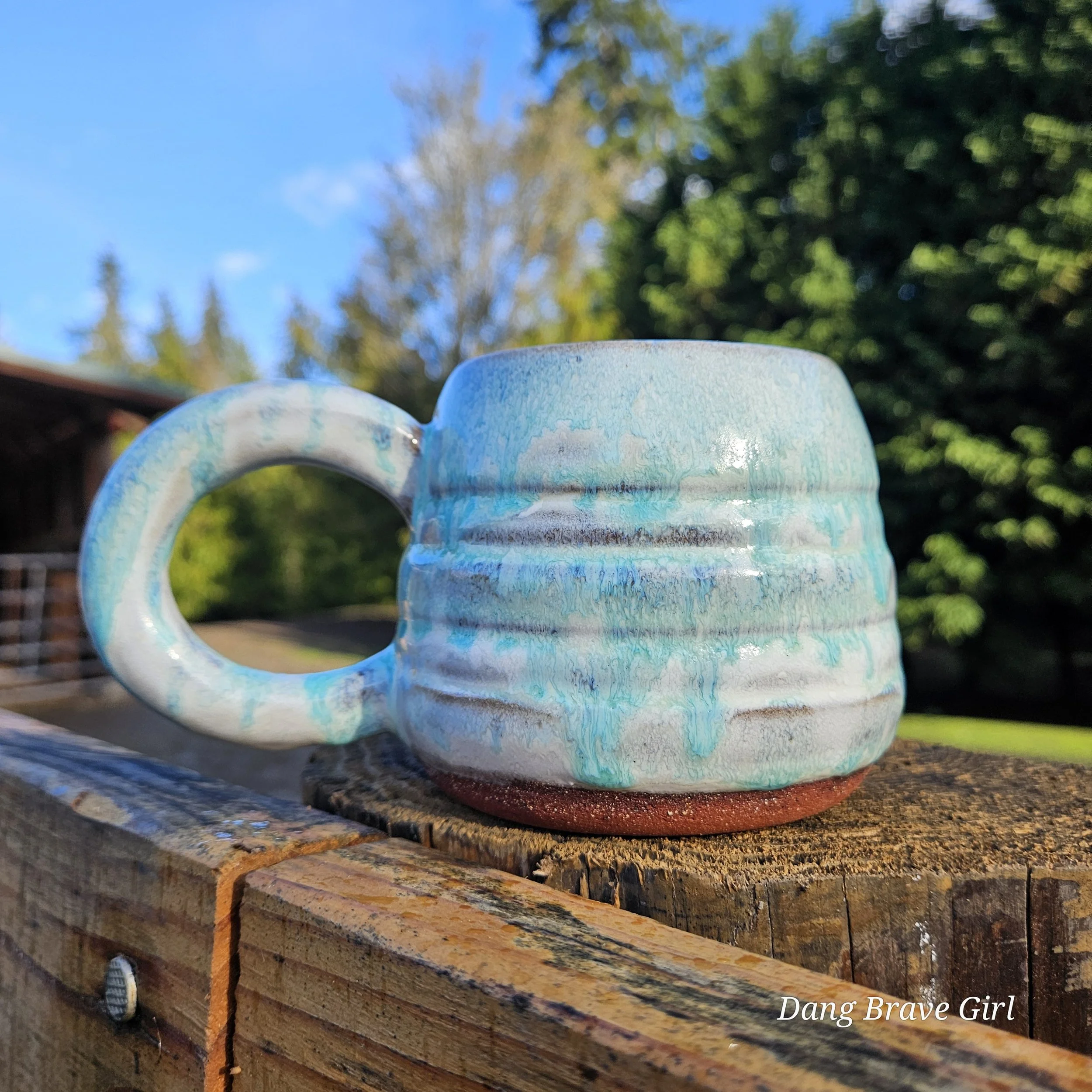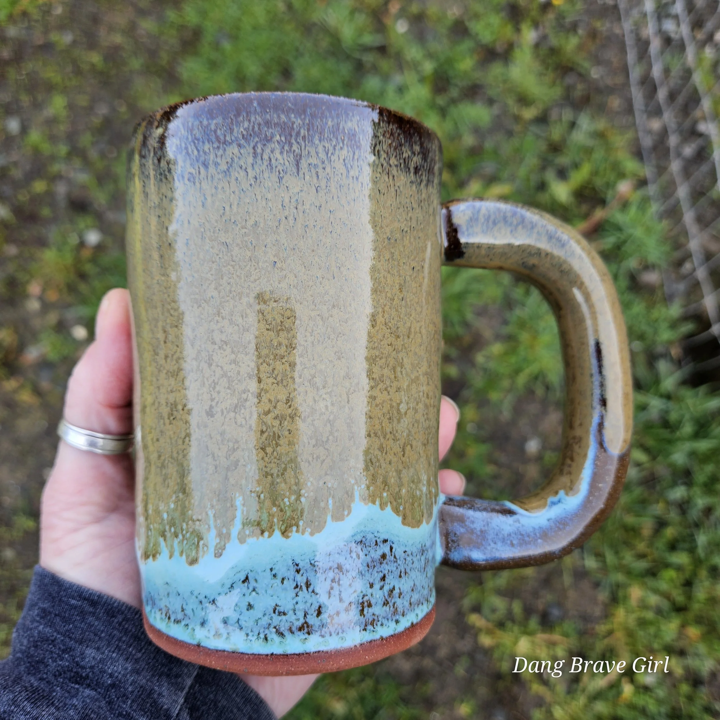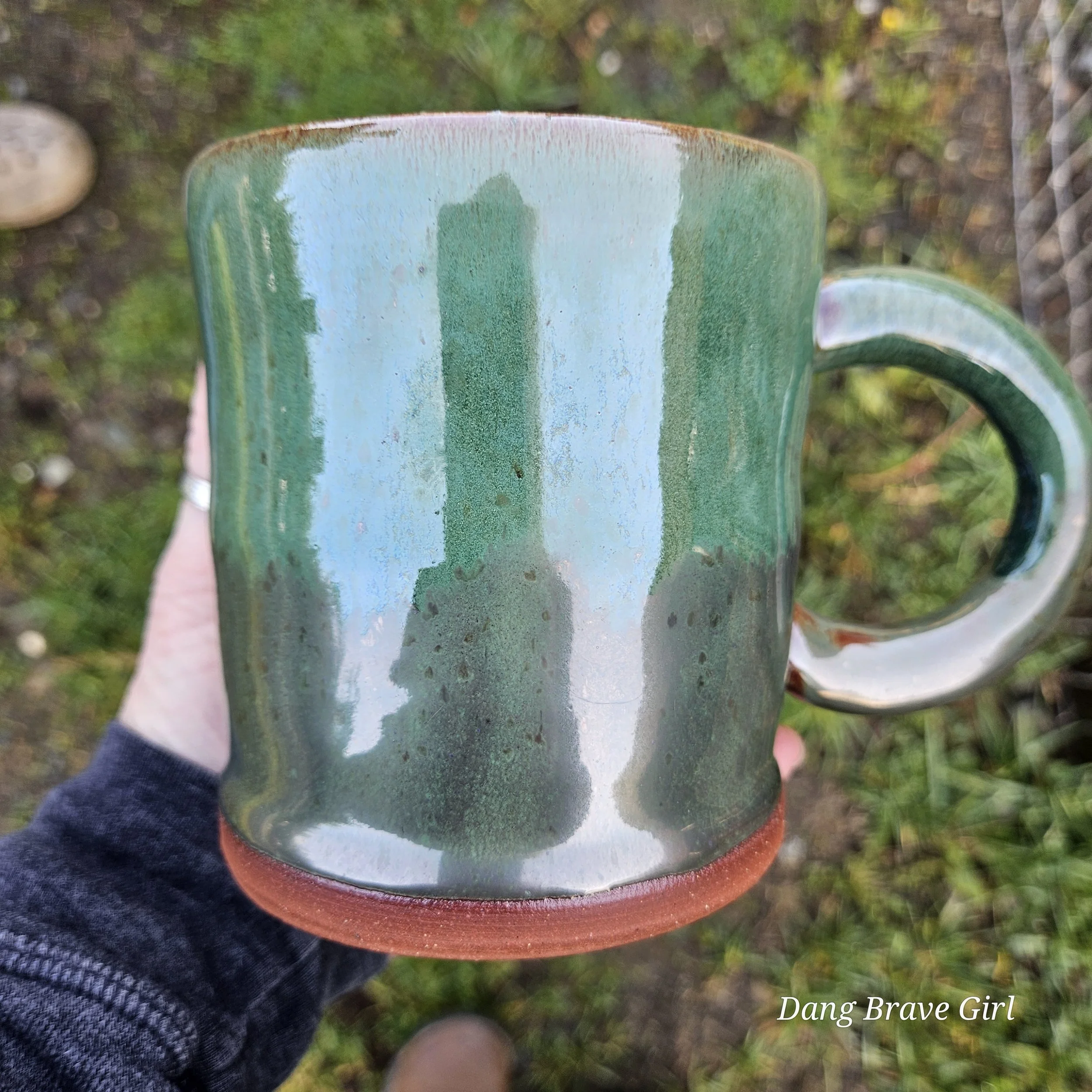 Handmade by the DBH with Oregon Red clay and I dare you not to fall in love with these colors. The perfect glaze drip of Caribbean over Milky Clear. And don’t forget to love on that great handle!