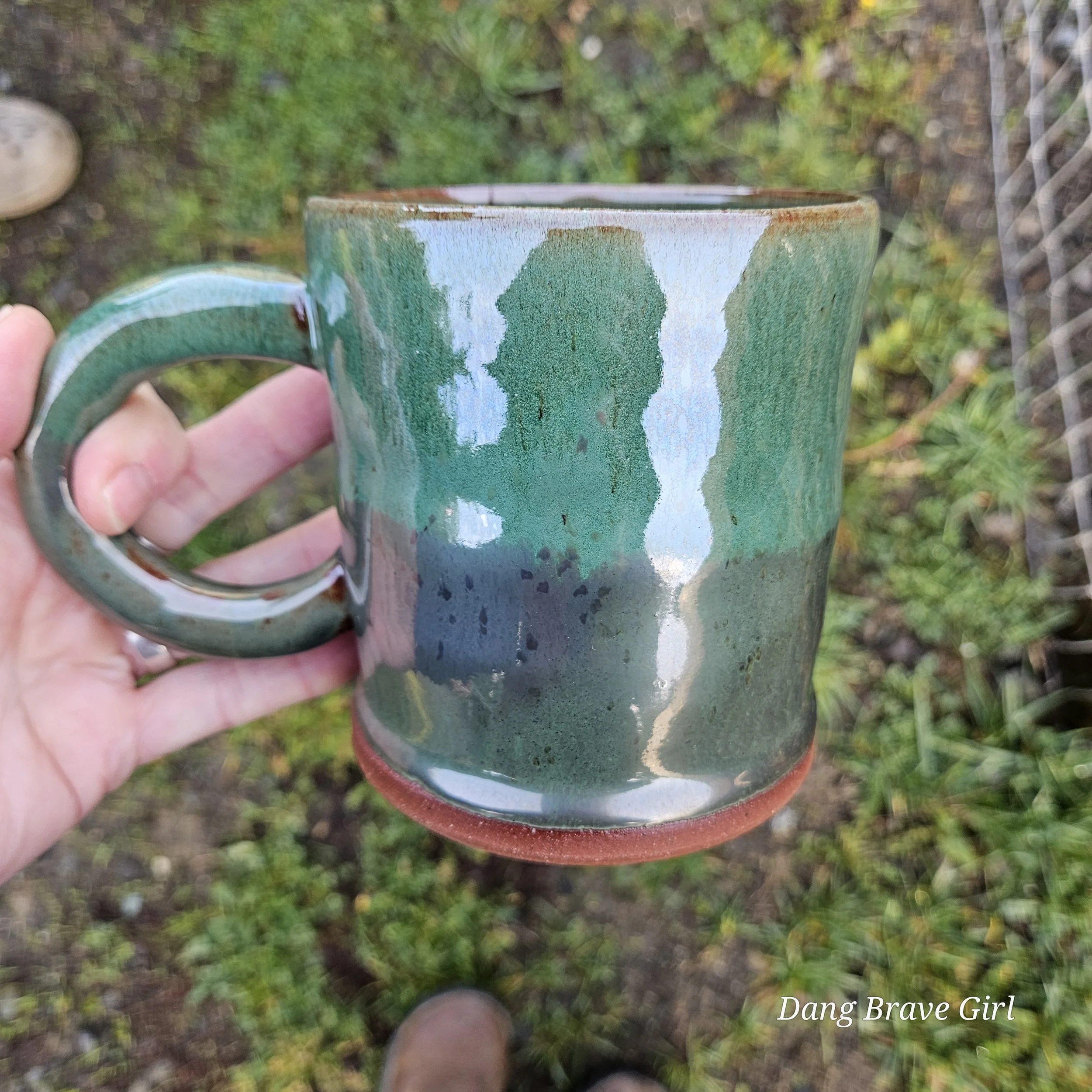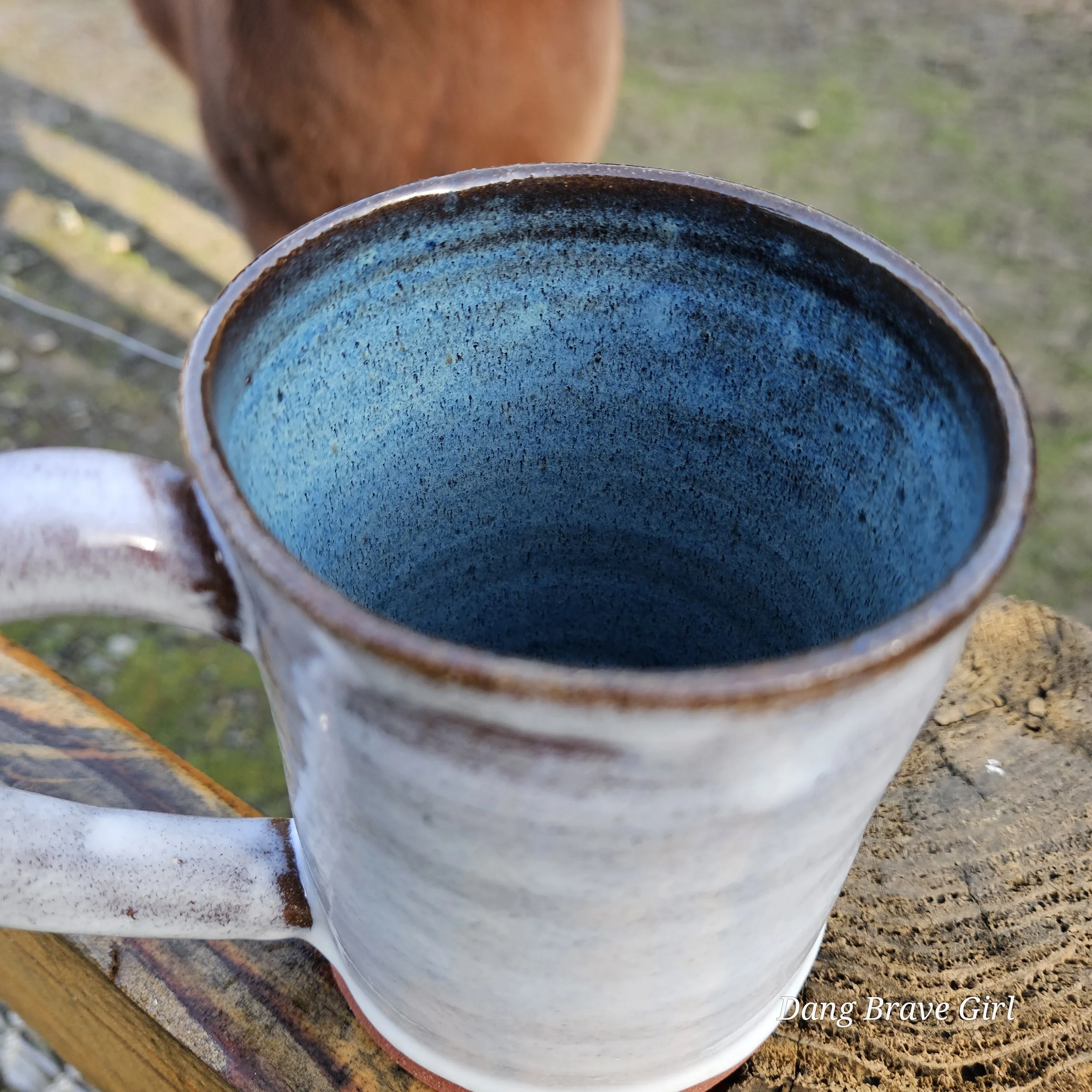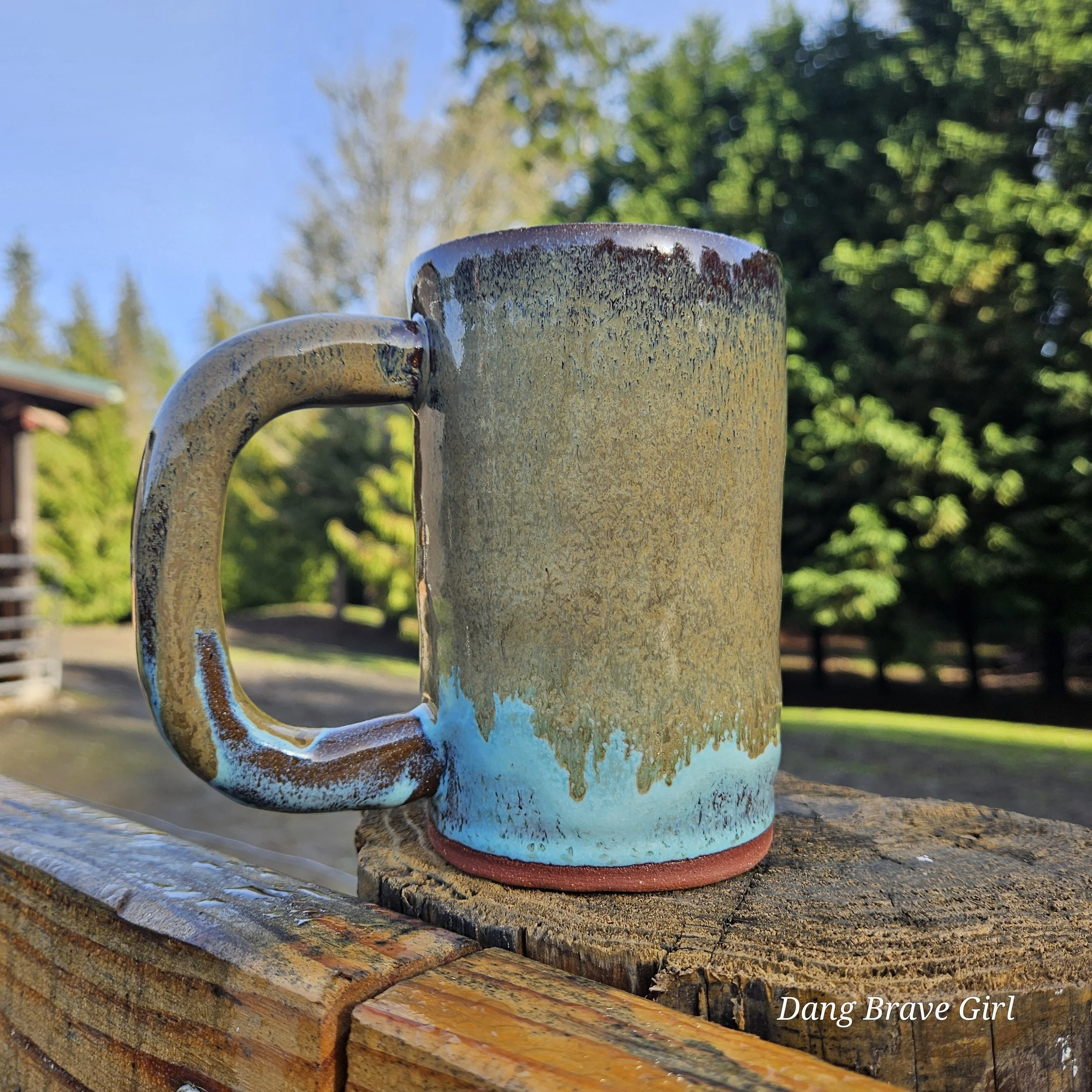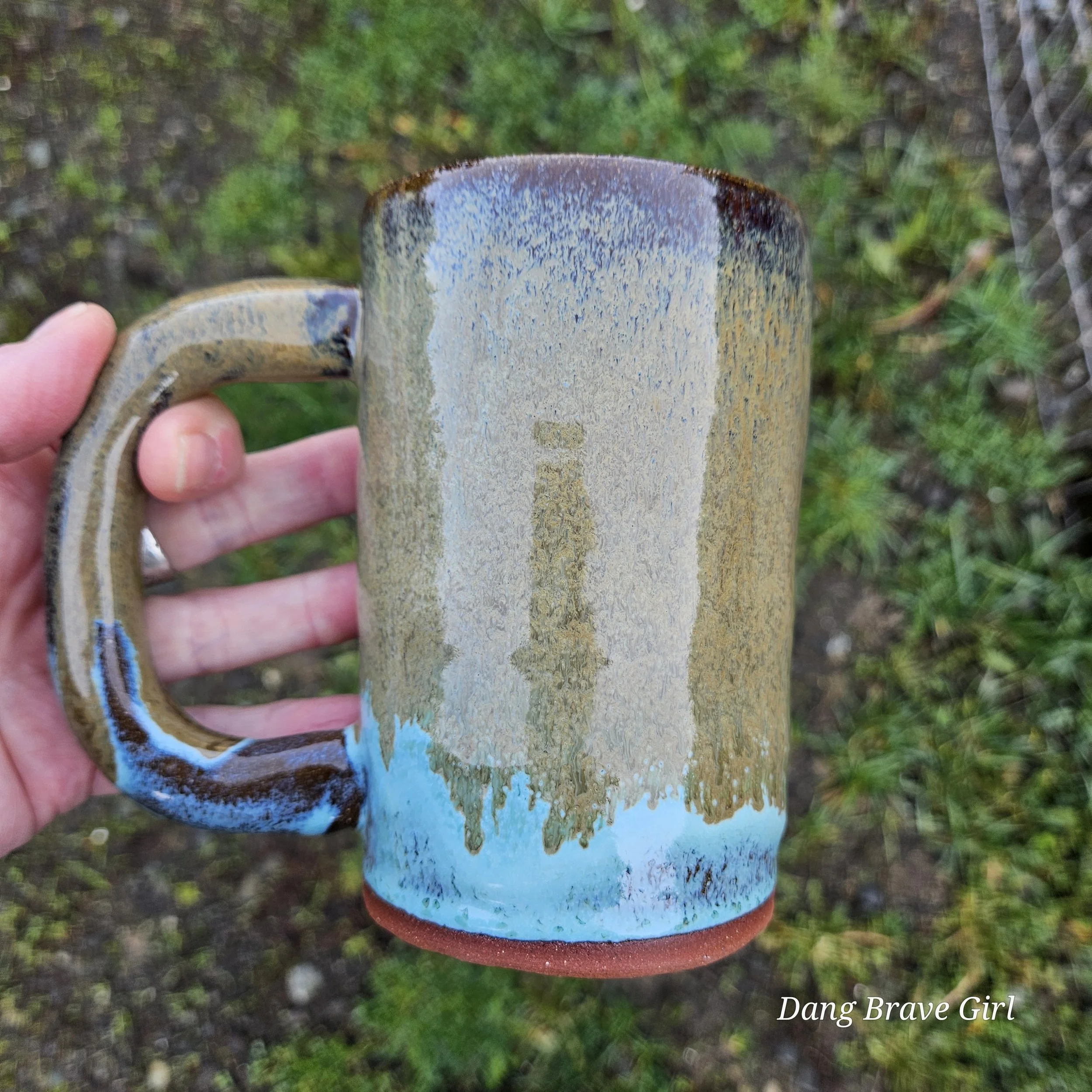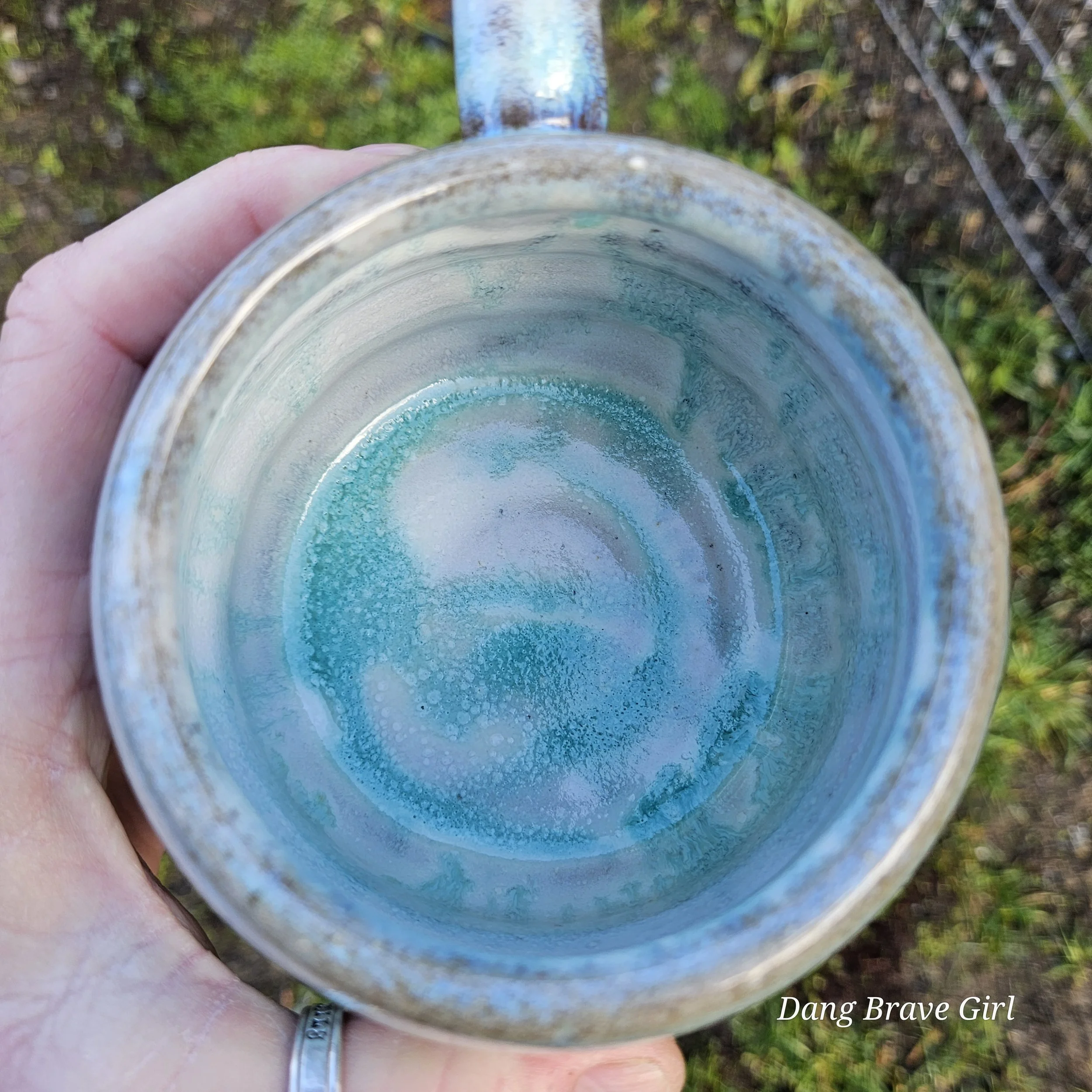 Handmade by the DBH with Oregon Red clay and I dare you not to fall in love with these colors. The perfect glaze drip of Caribbean over Milky Clear. And don’t forget to love on that great handle!