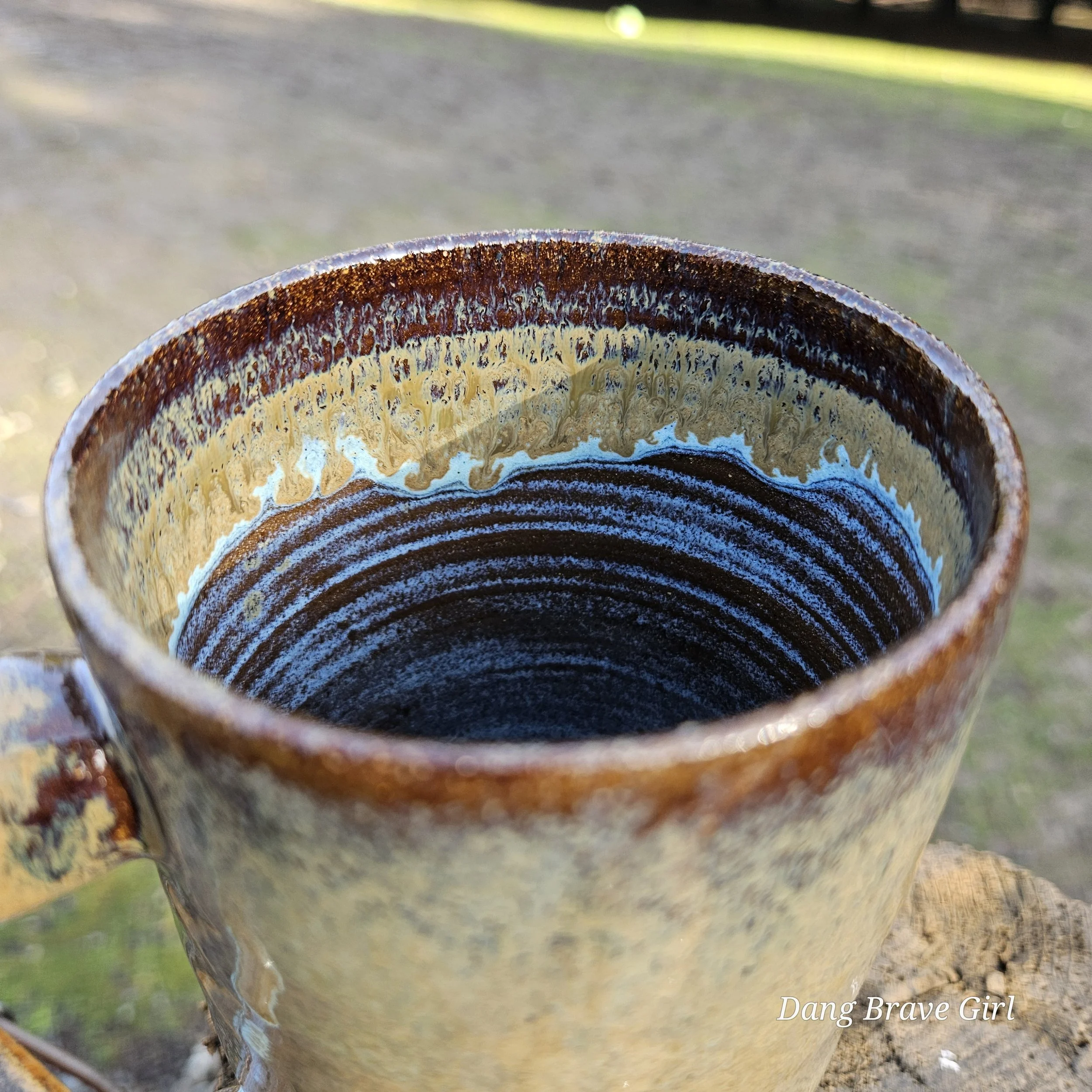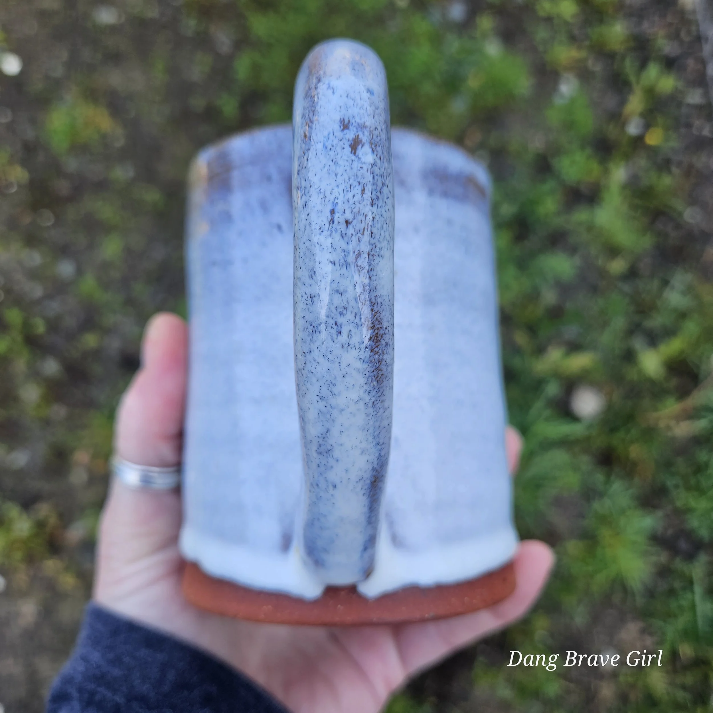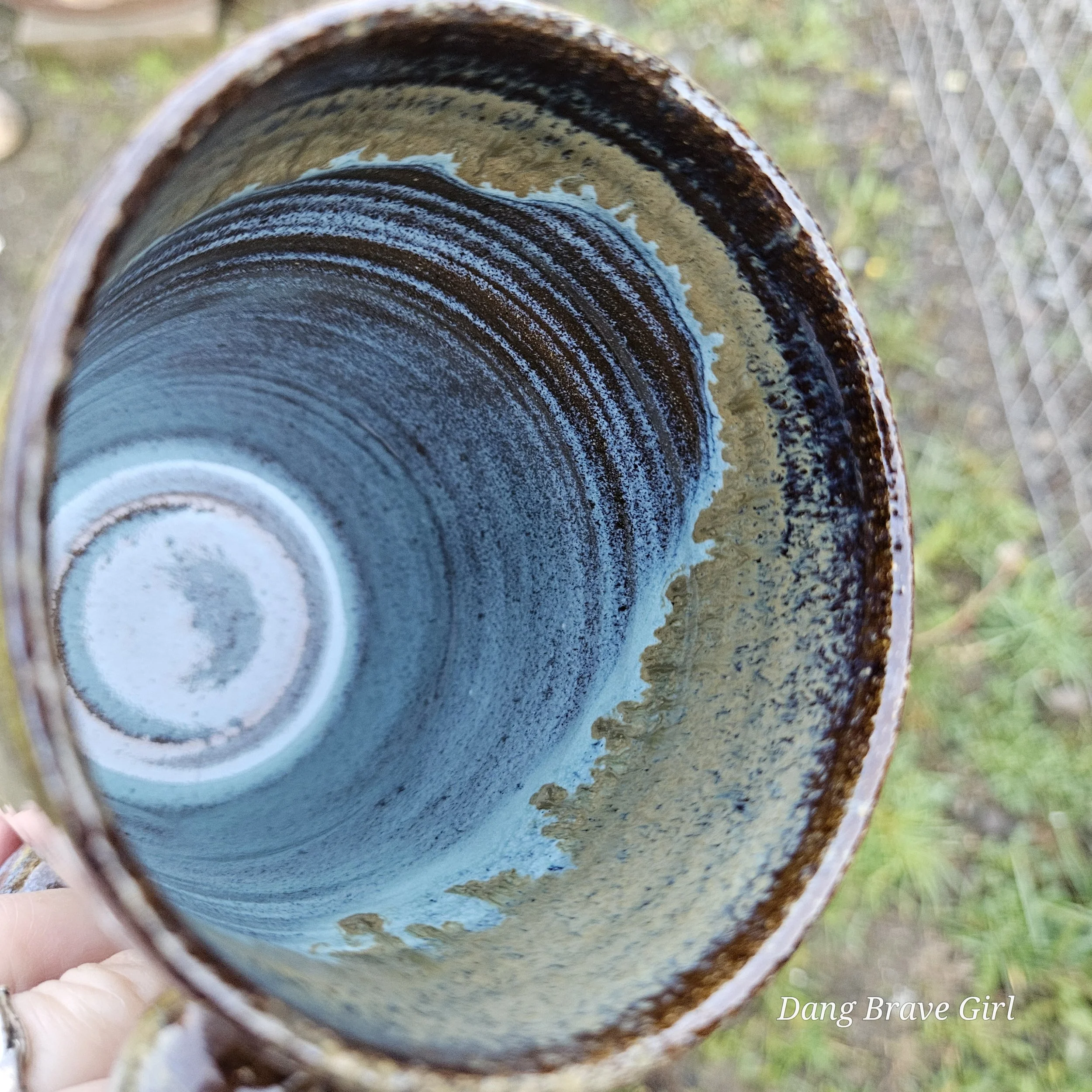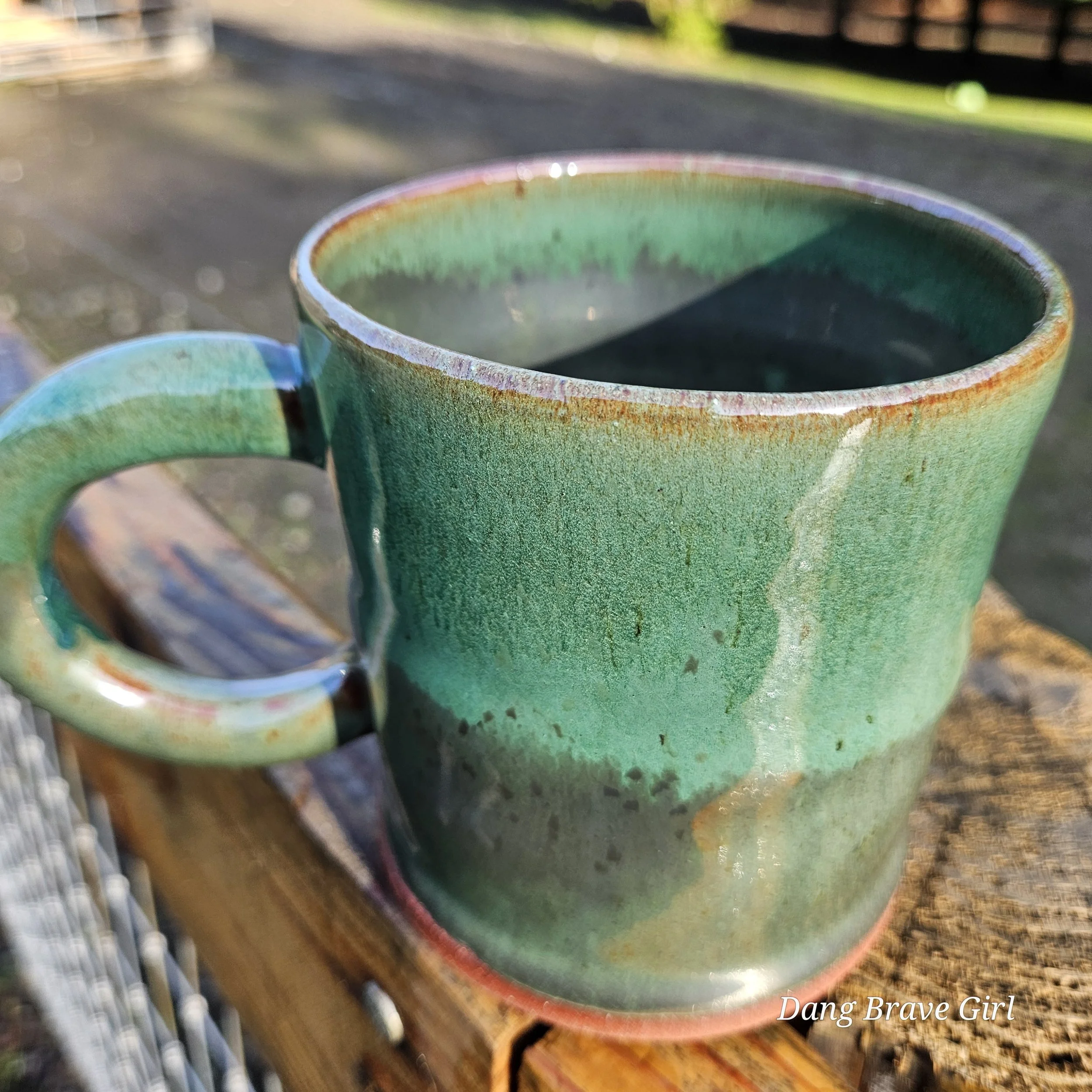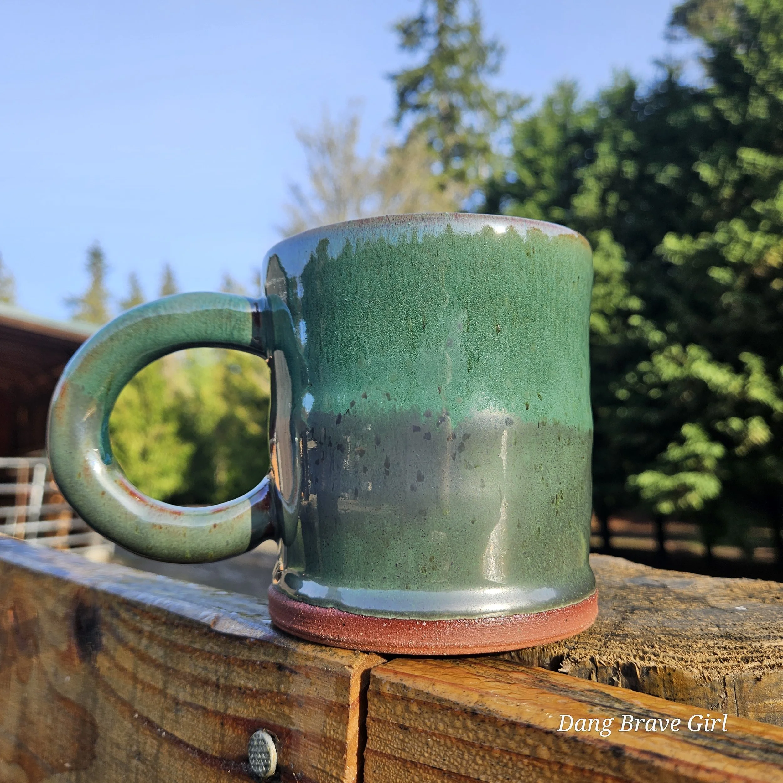 Handmade by the DBH with Oregon Red clay and I dare you not to fall in love with these colors. The perfect glaze drip of Caribbean over Milky Clear. And don’t forget to love on that great handle!