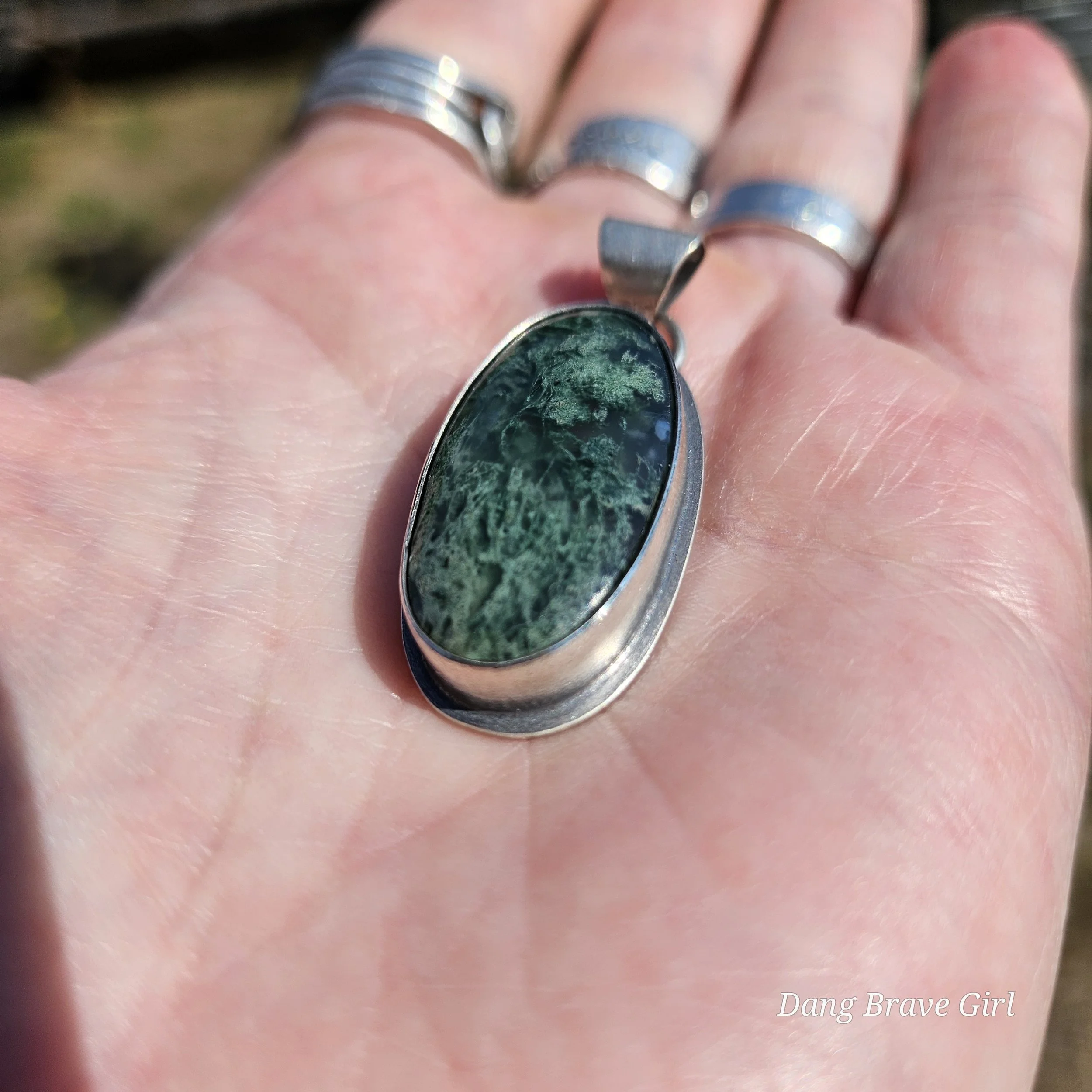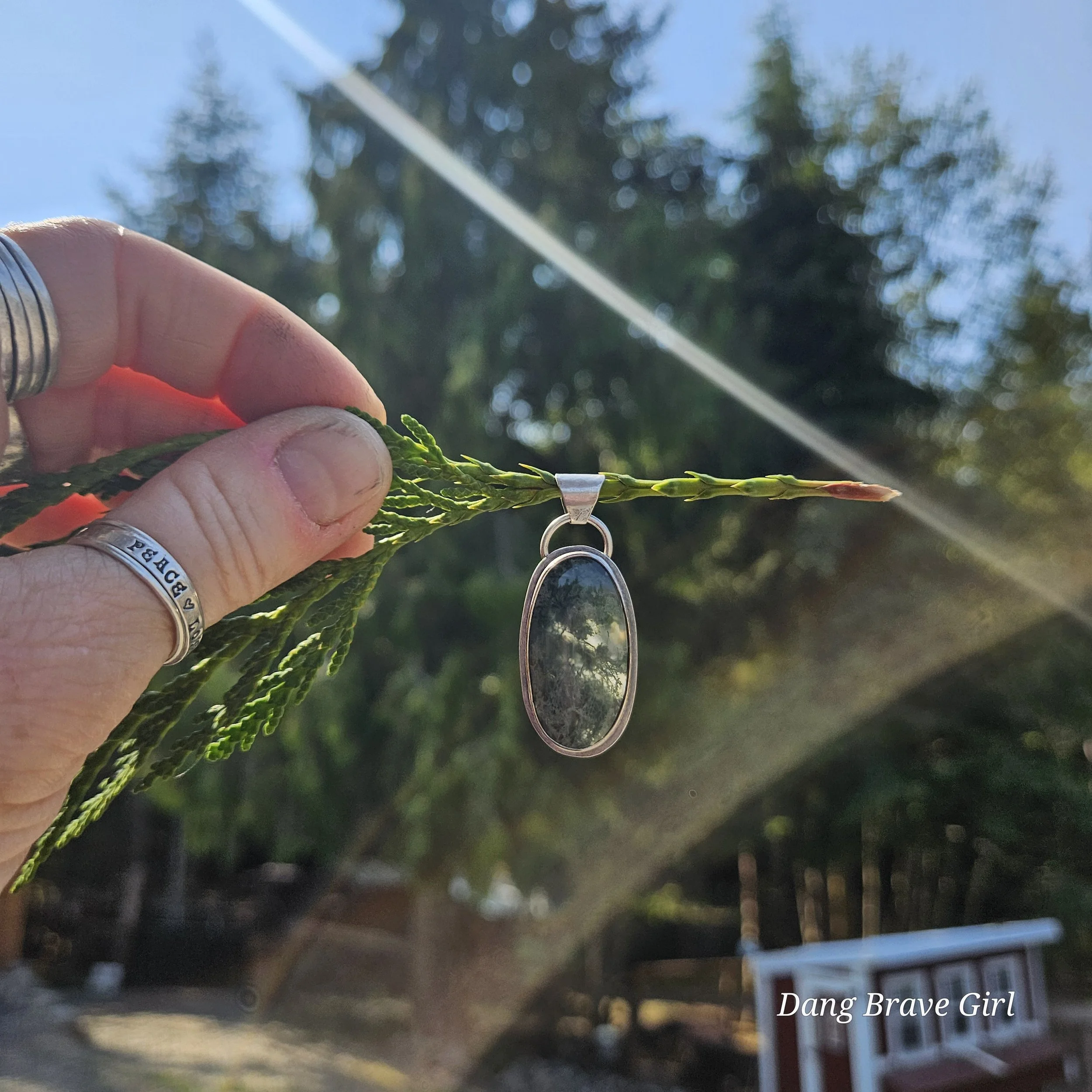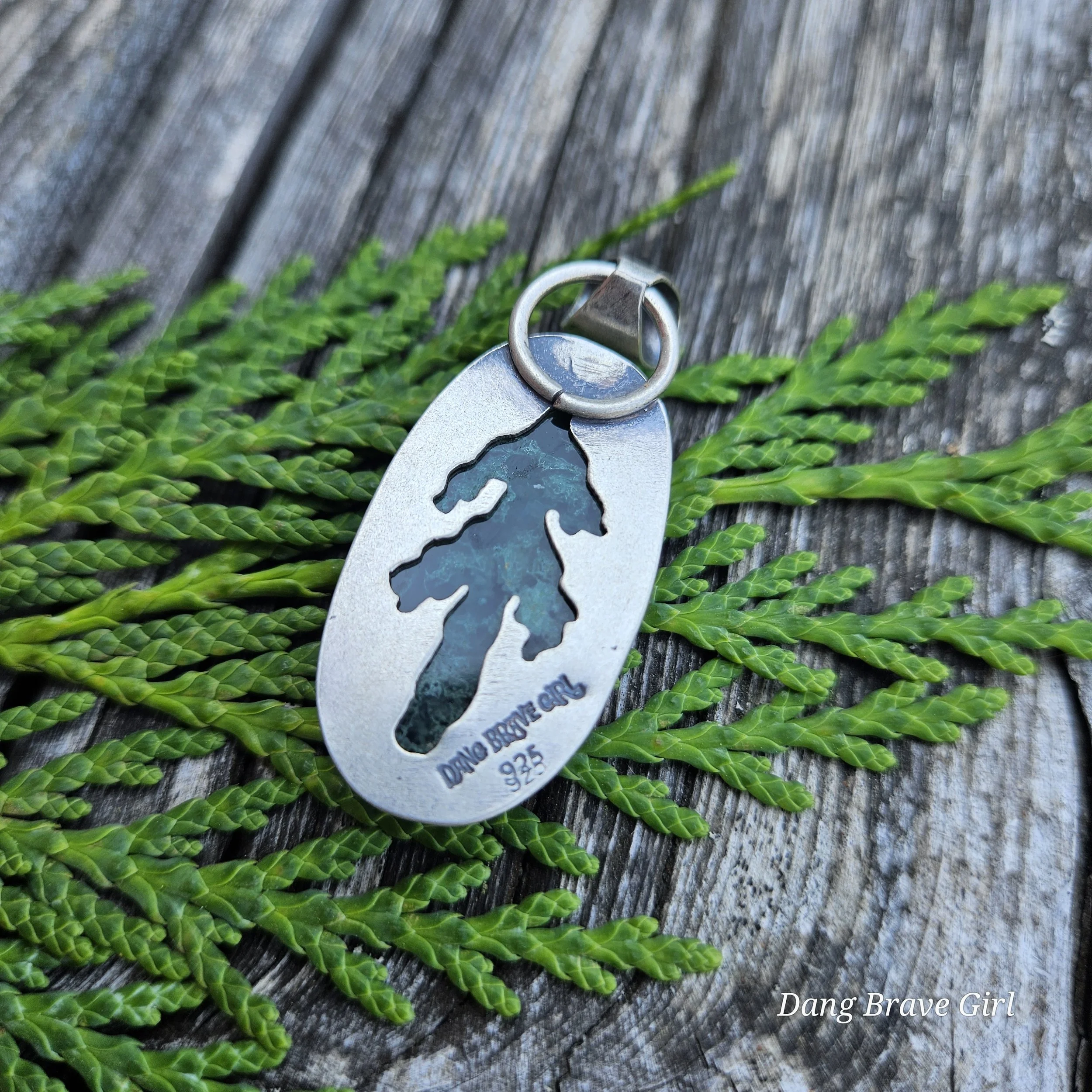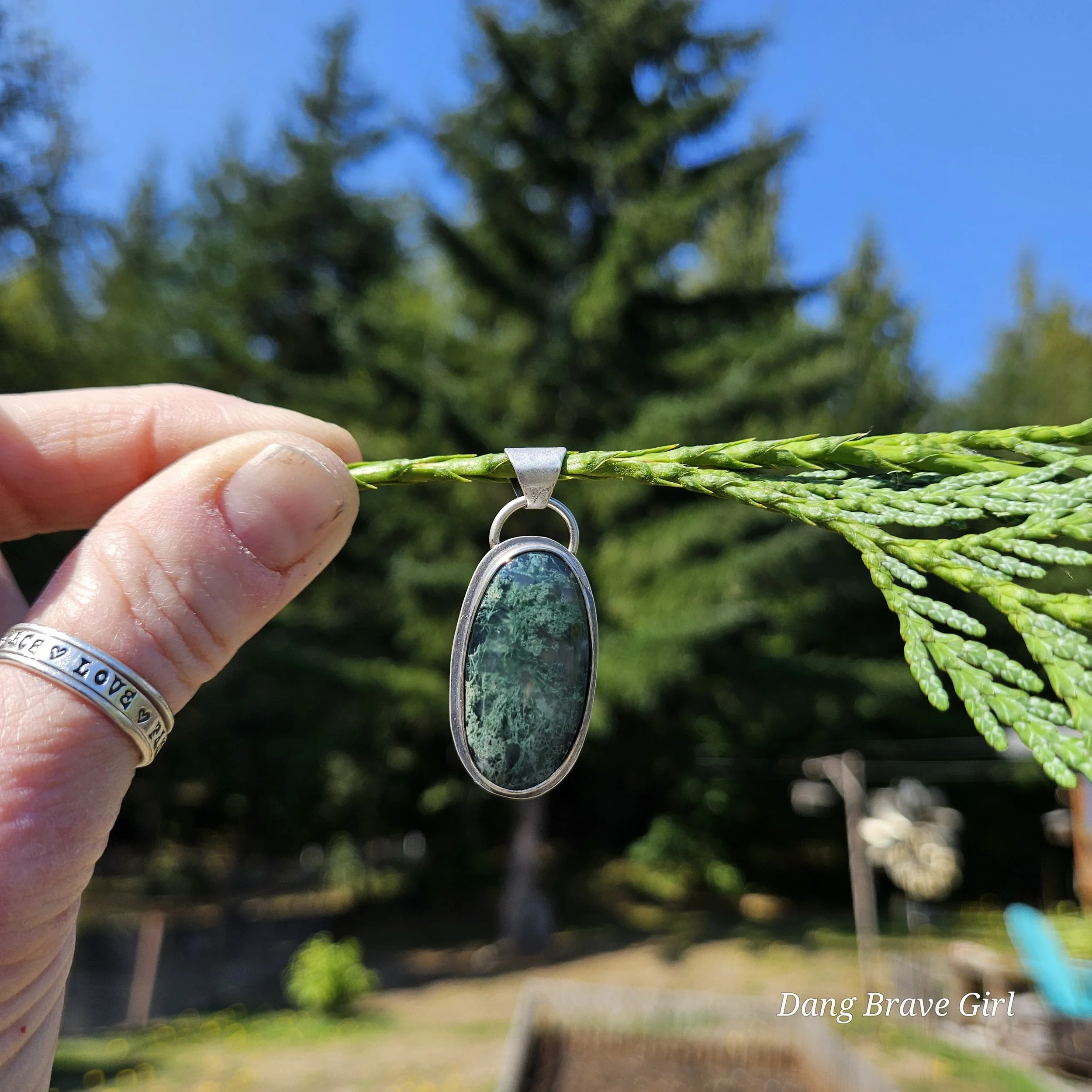Measures almost 1 1/8” wide, is 2 1/2” tall, including the bail. Generously sized, the bail can accommodate your favorite chunky chain or leather up to 5mm. If you need a chain like the one pictured, they are available in my shop.