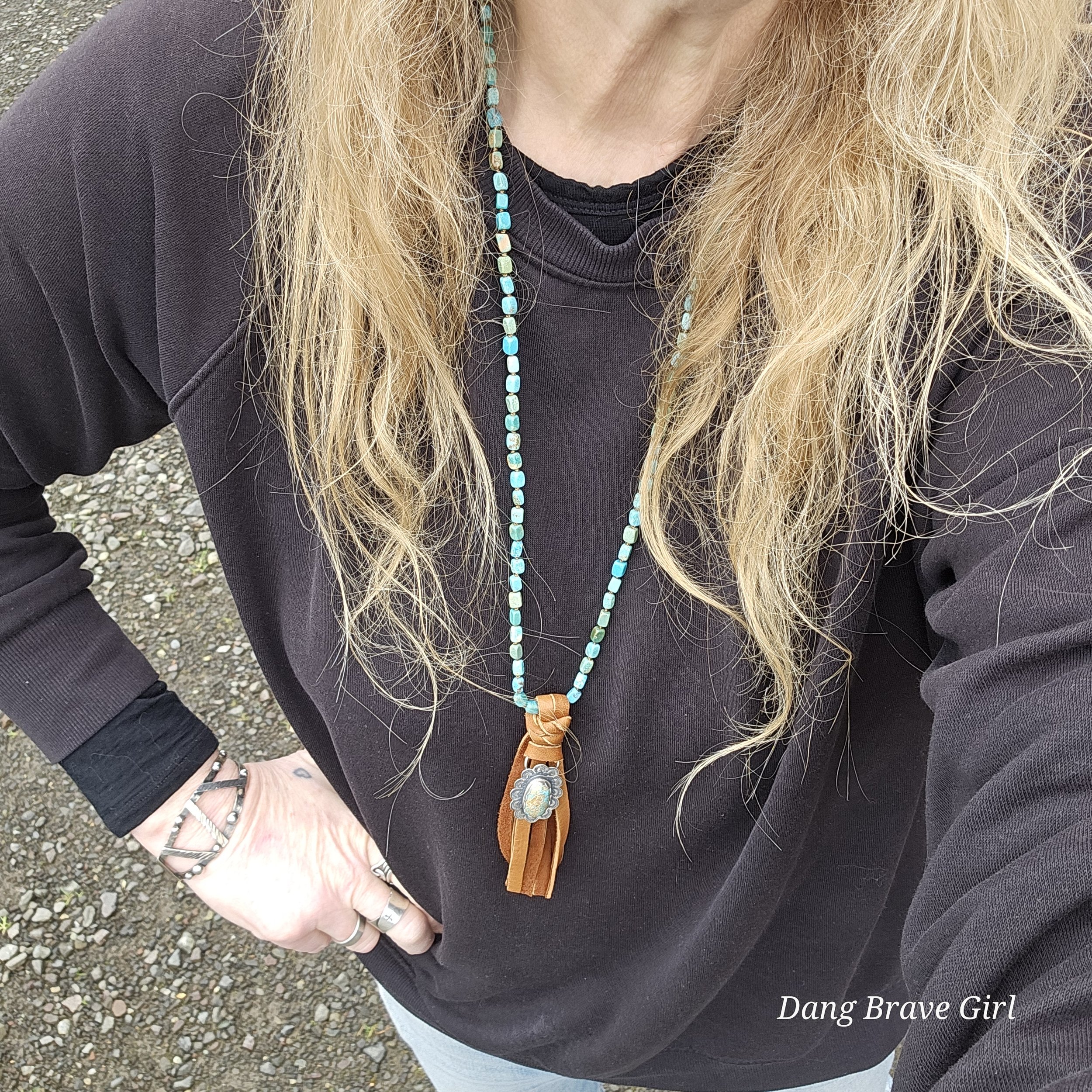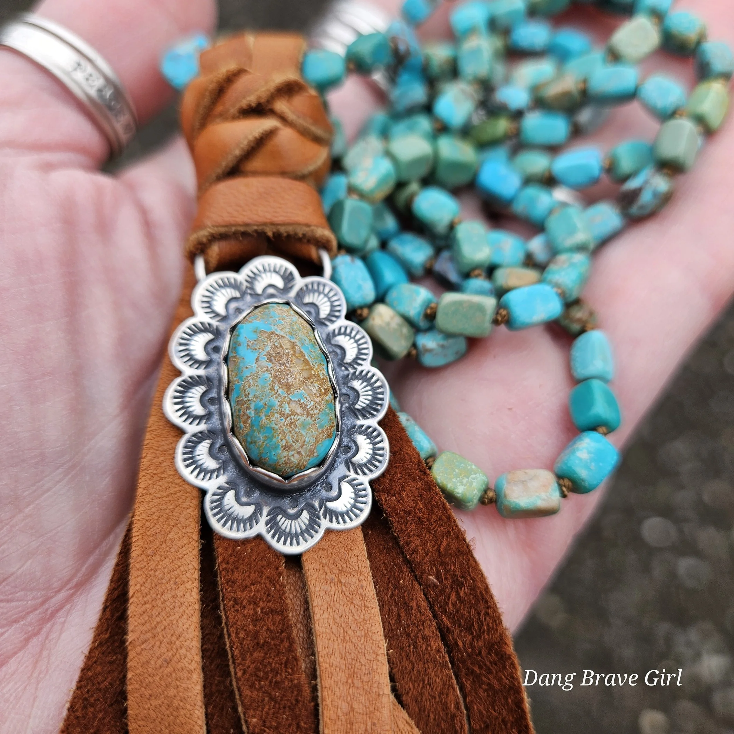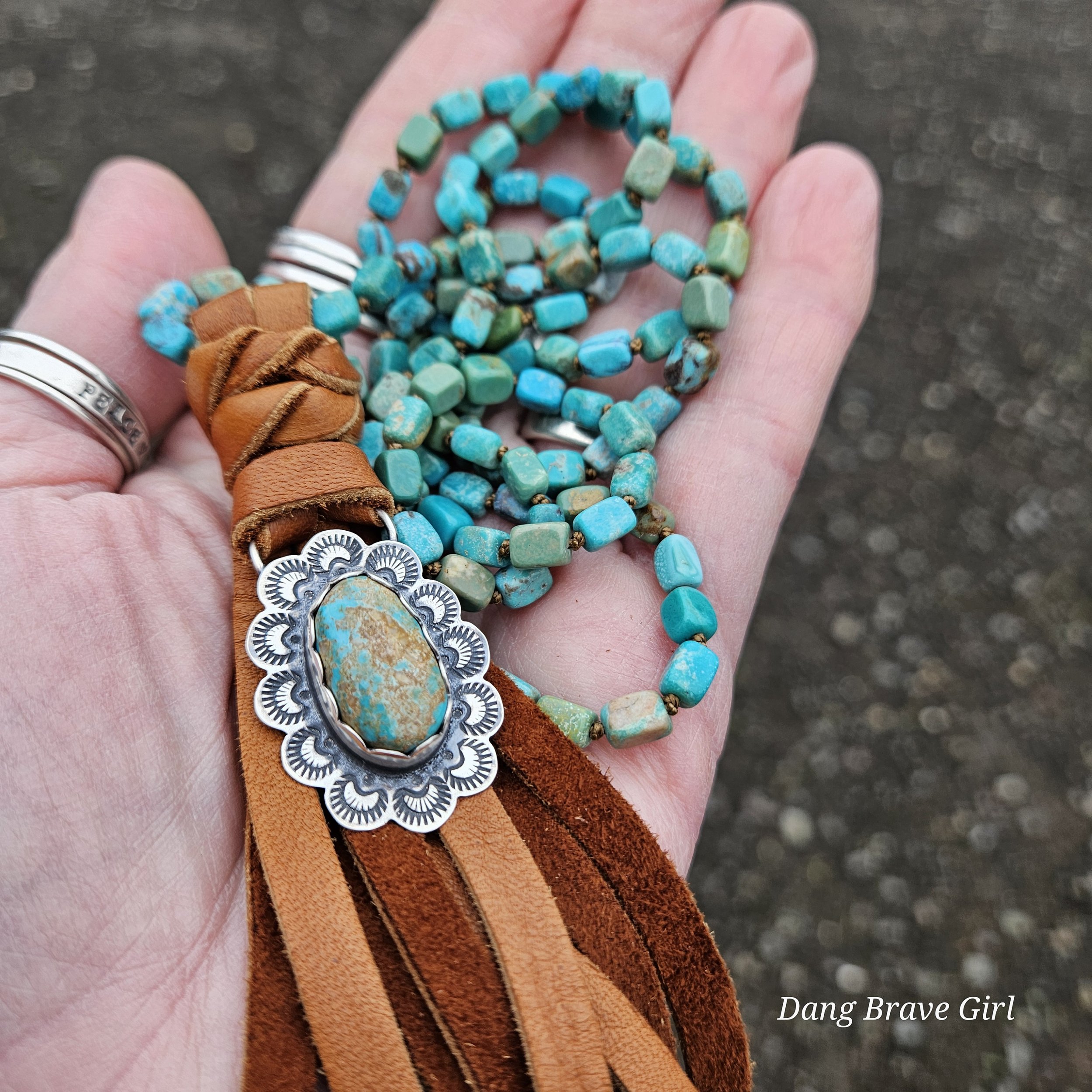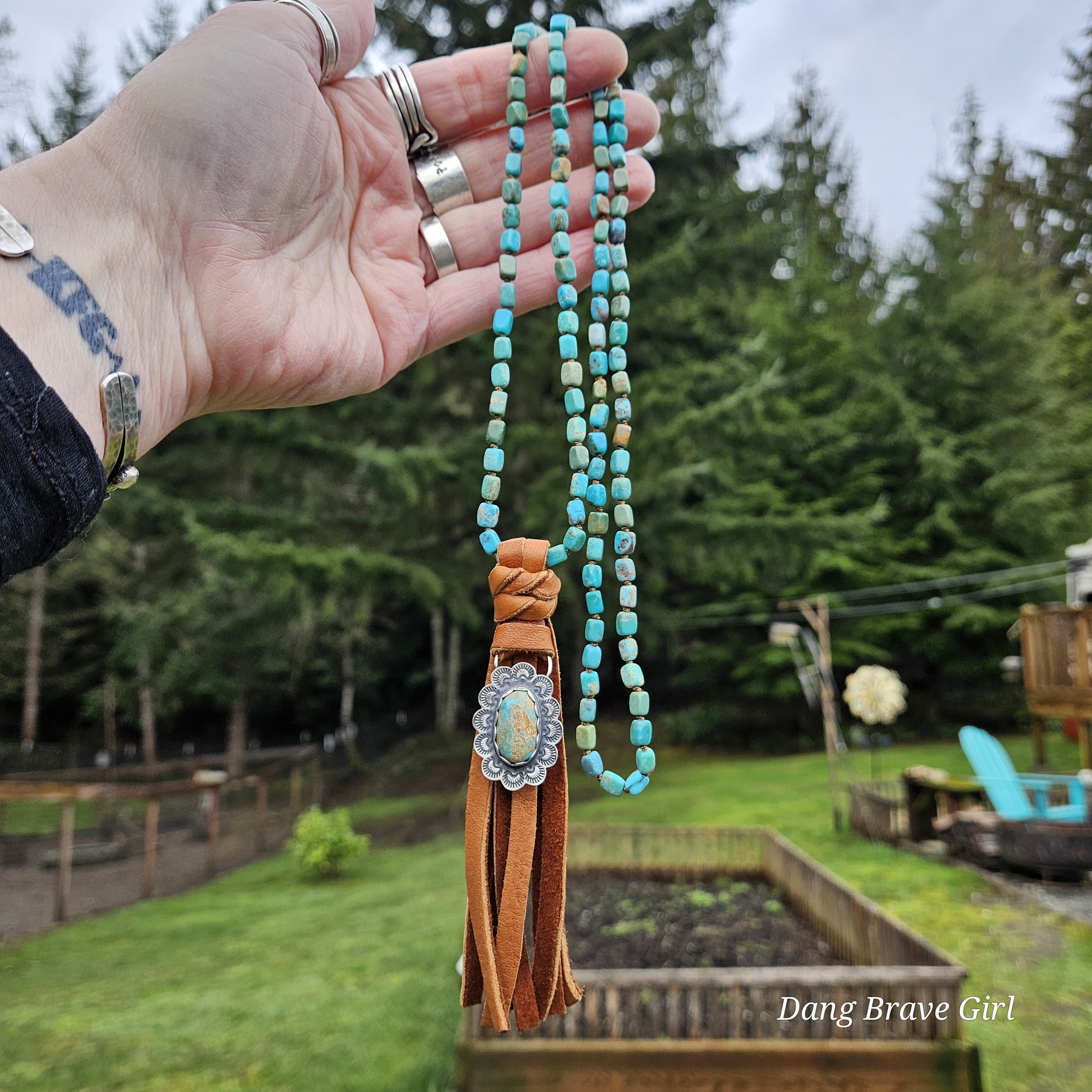 The beads are natural turquoise, 4 × 6 mm rectangle cubes in beautiful blues and gorgeous greens. I made the leather tassel with a luxurious and rich Colorado Buckskin in the Saddle color to highlight the turquoise beads and pendant.