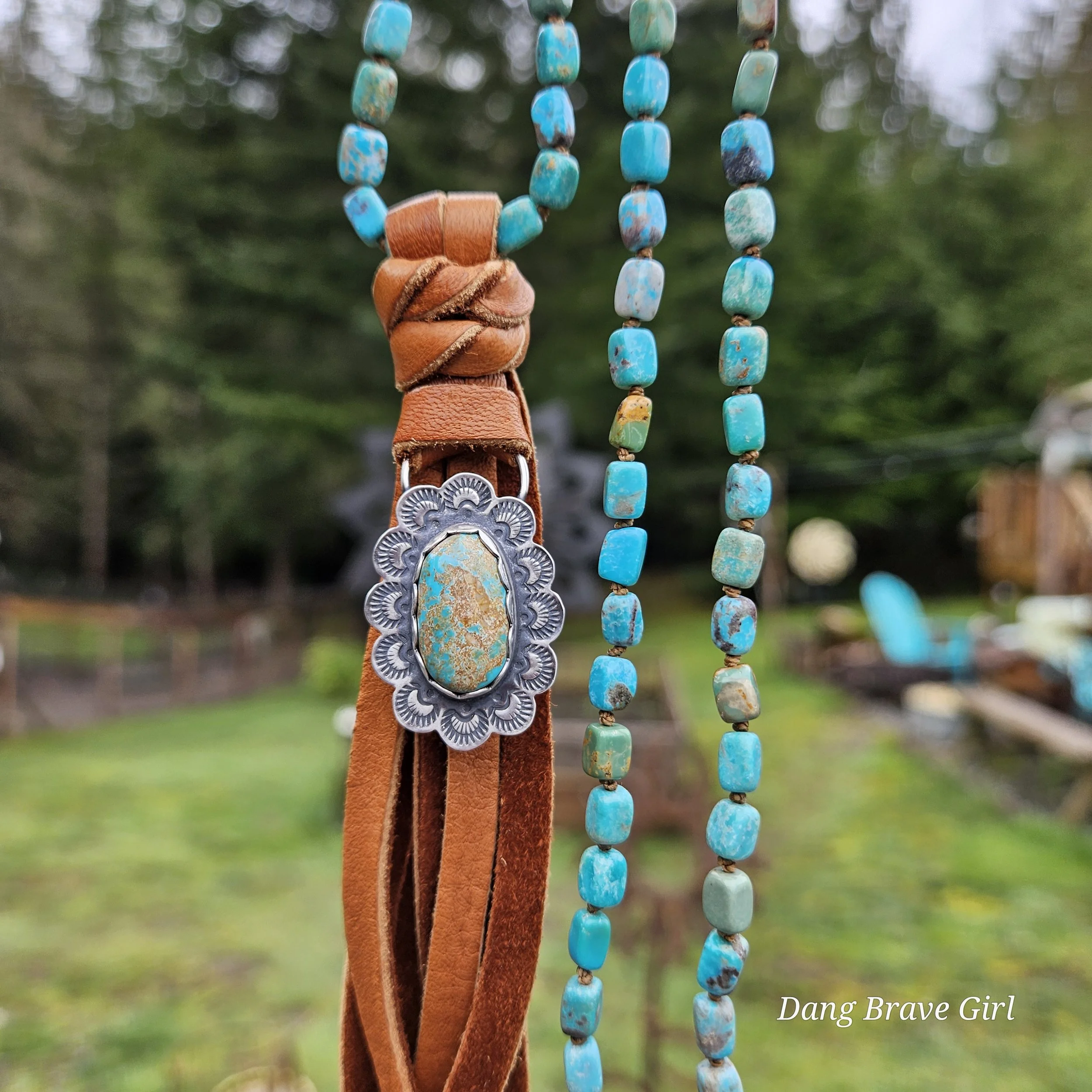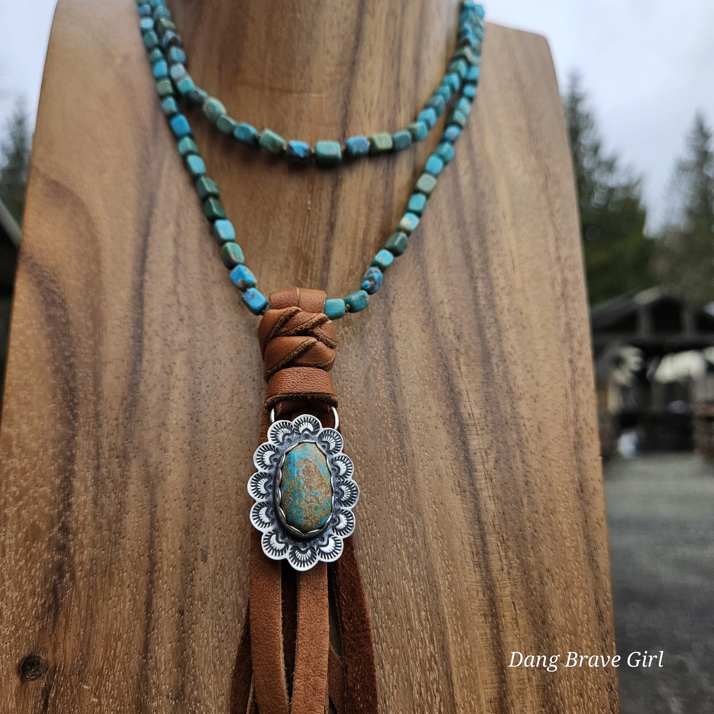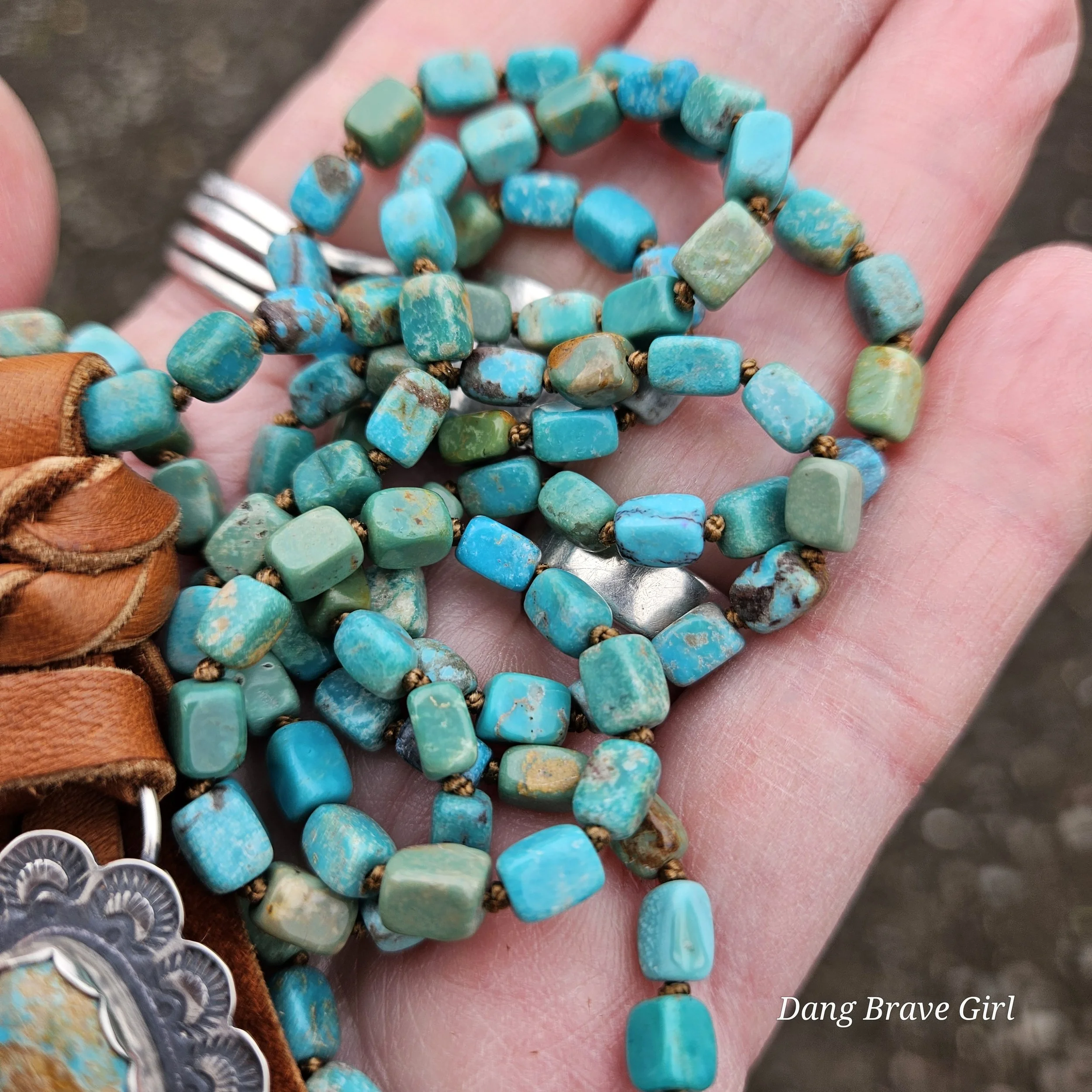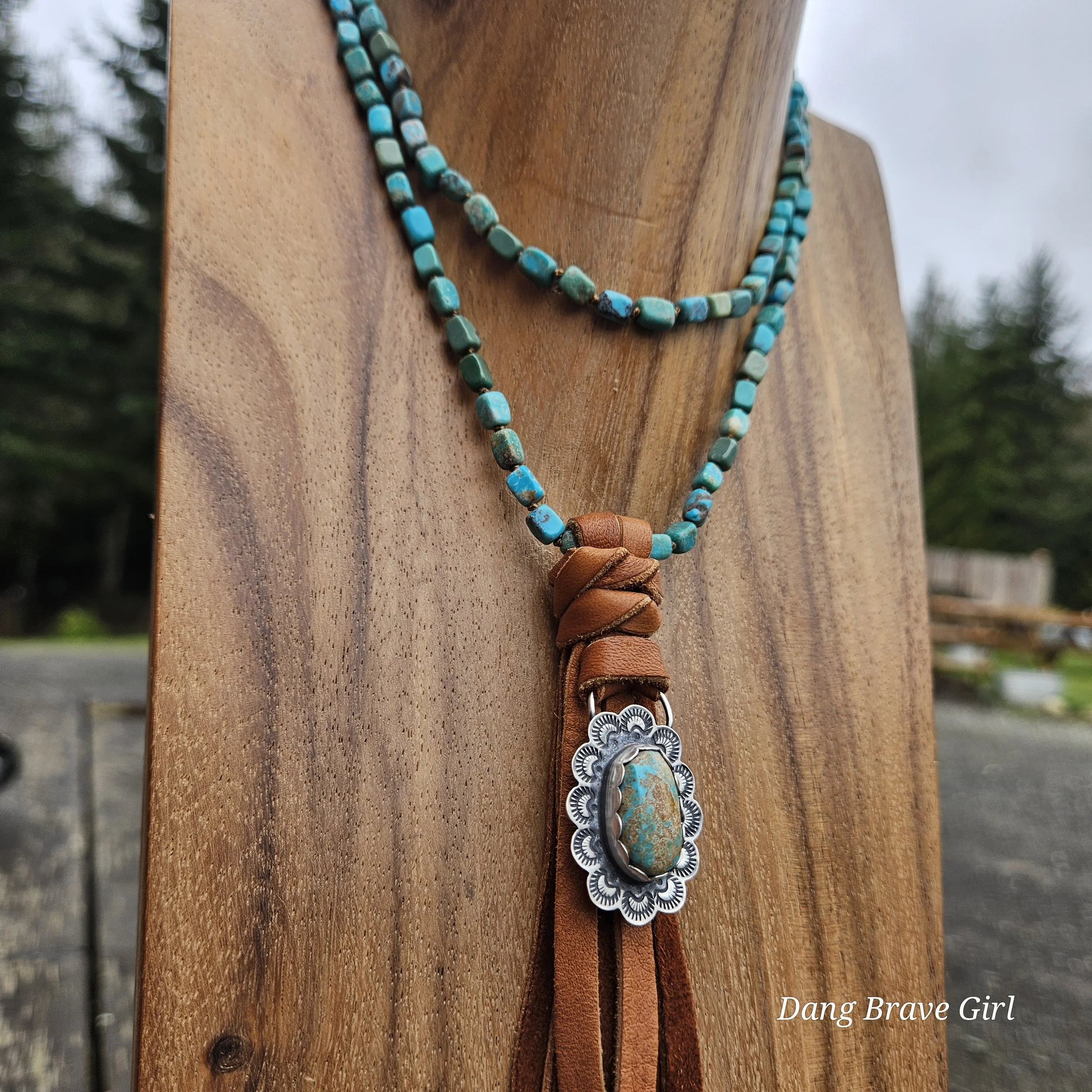 The beads are natural turquoise, 4 × 6 mm rectangle cubes in beautiful blues and gorgeous greens. I made the leather tassel with a luxurious and rich Colorado Buckskin in the Saddle color to highlight the turquoise beads and pendant.