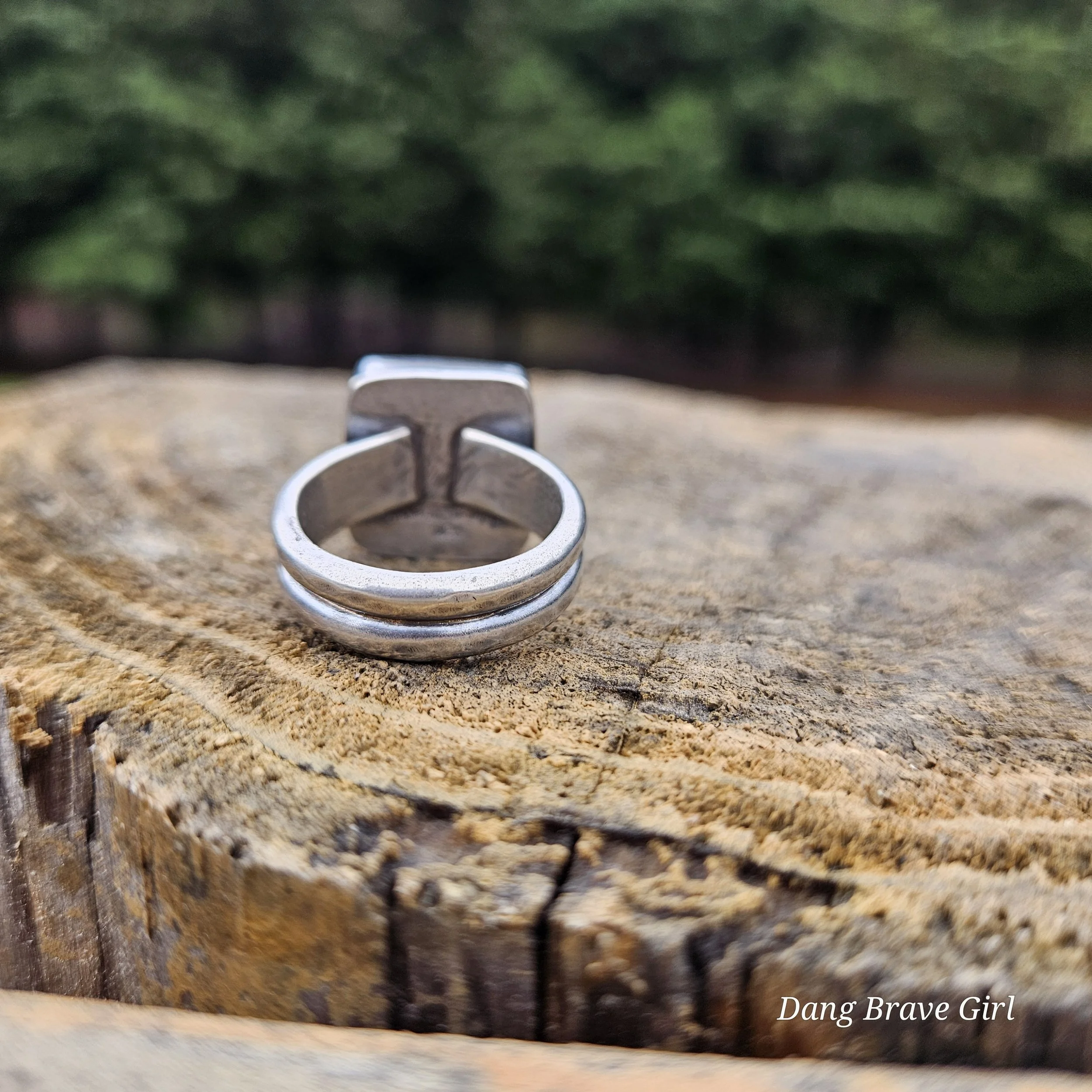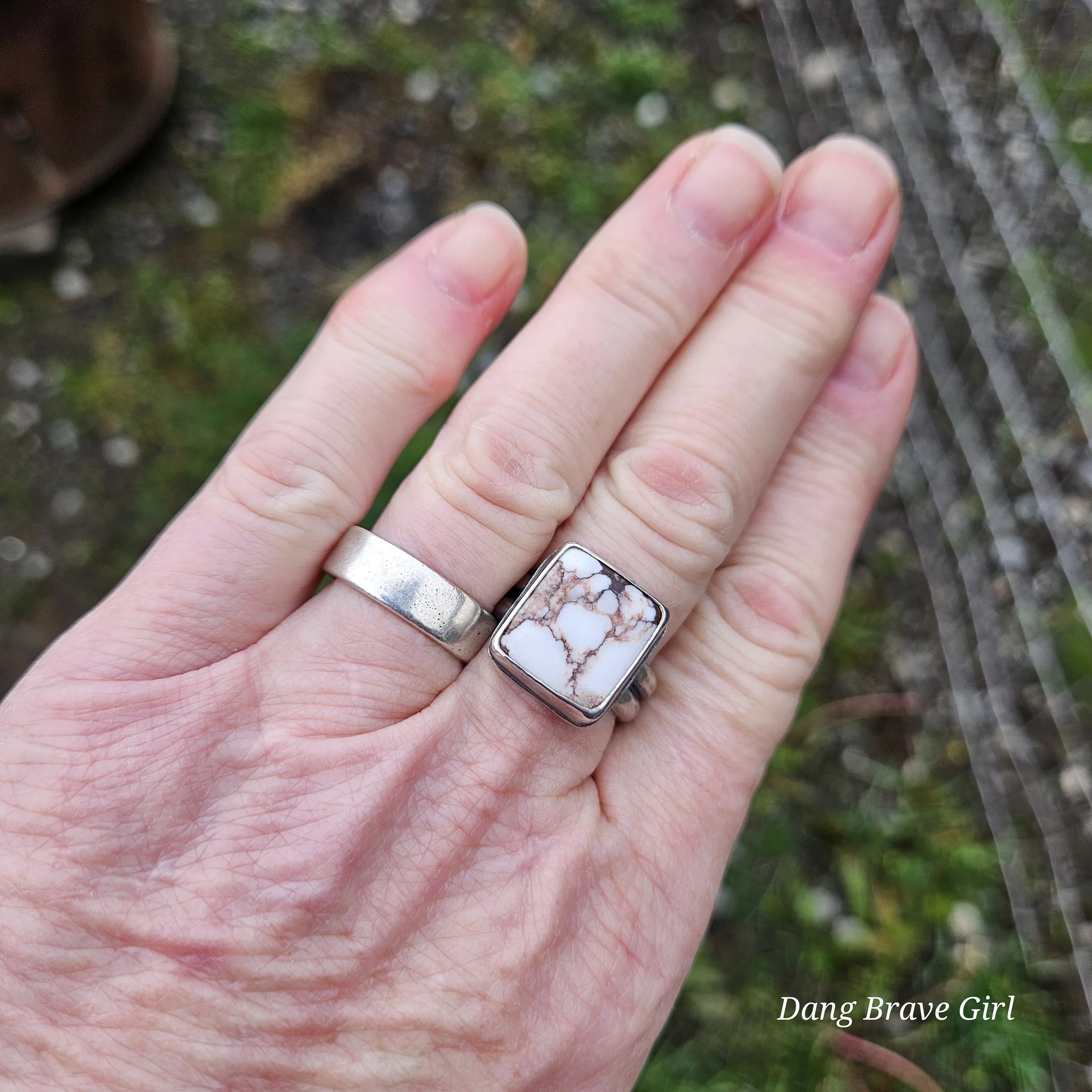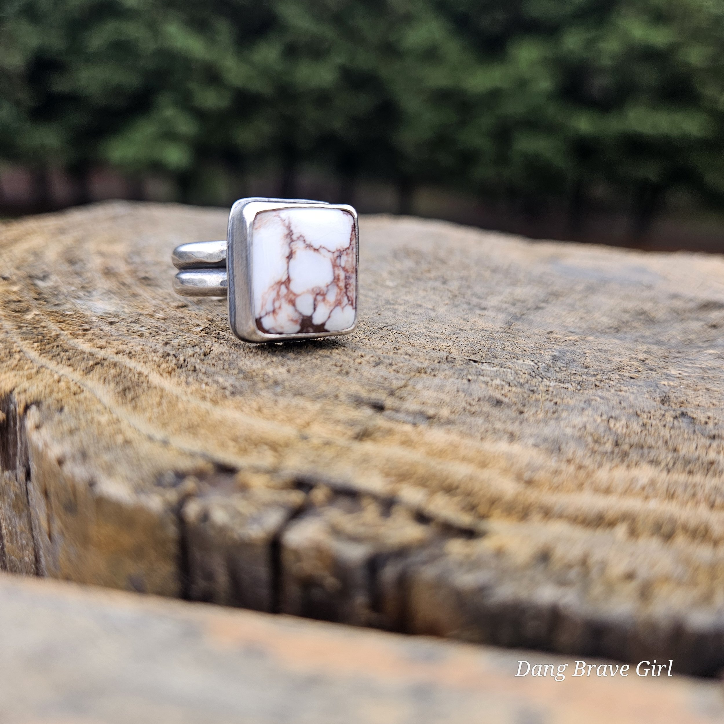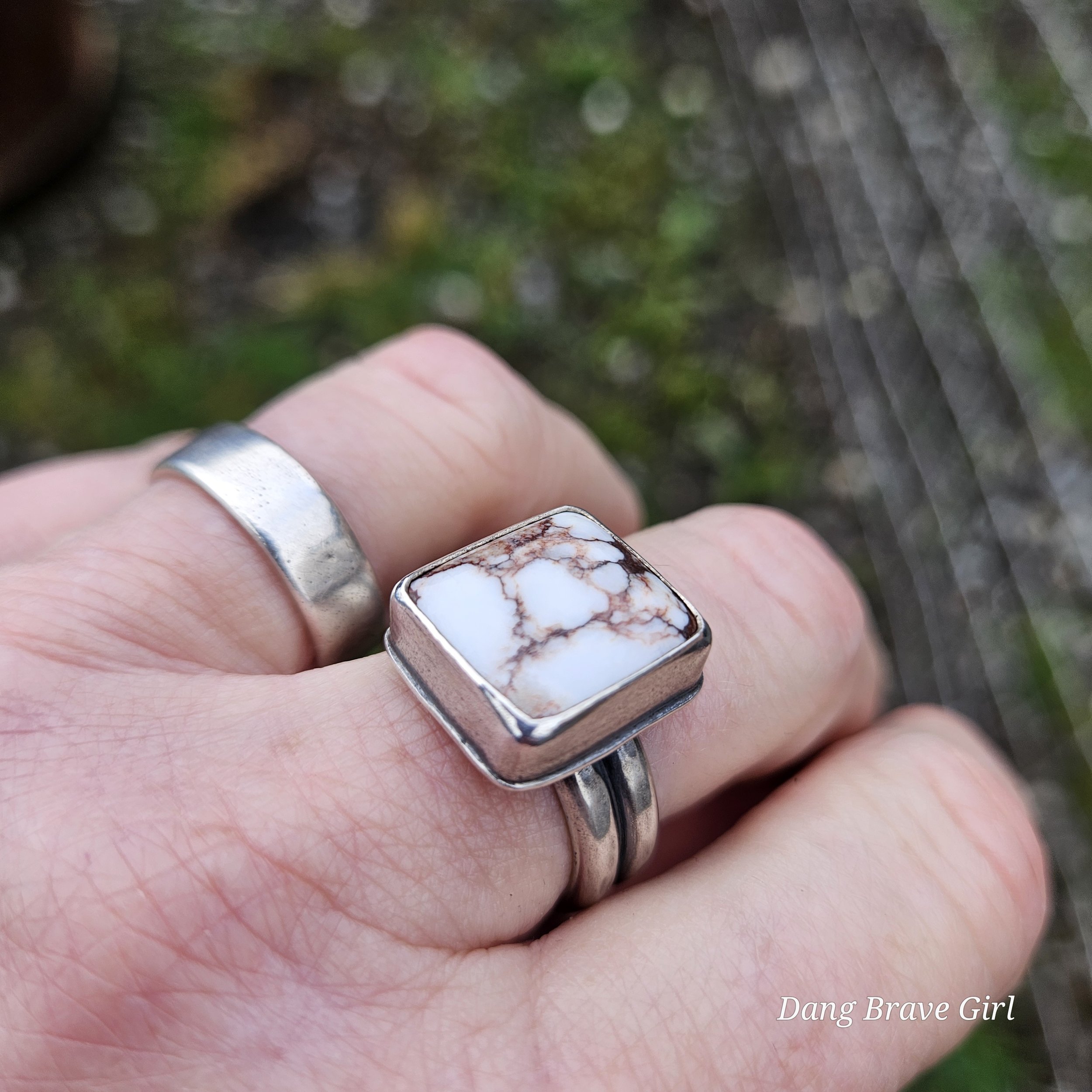 This great chunk of Wildhorse has a home in fine and sterling silver on top of a comfortable but sturdy shank in a size 8.5. It measures 5/8” wide and tall and is finished with a lightly hammered texture, rich patina and soft polish.