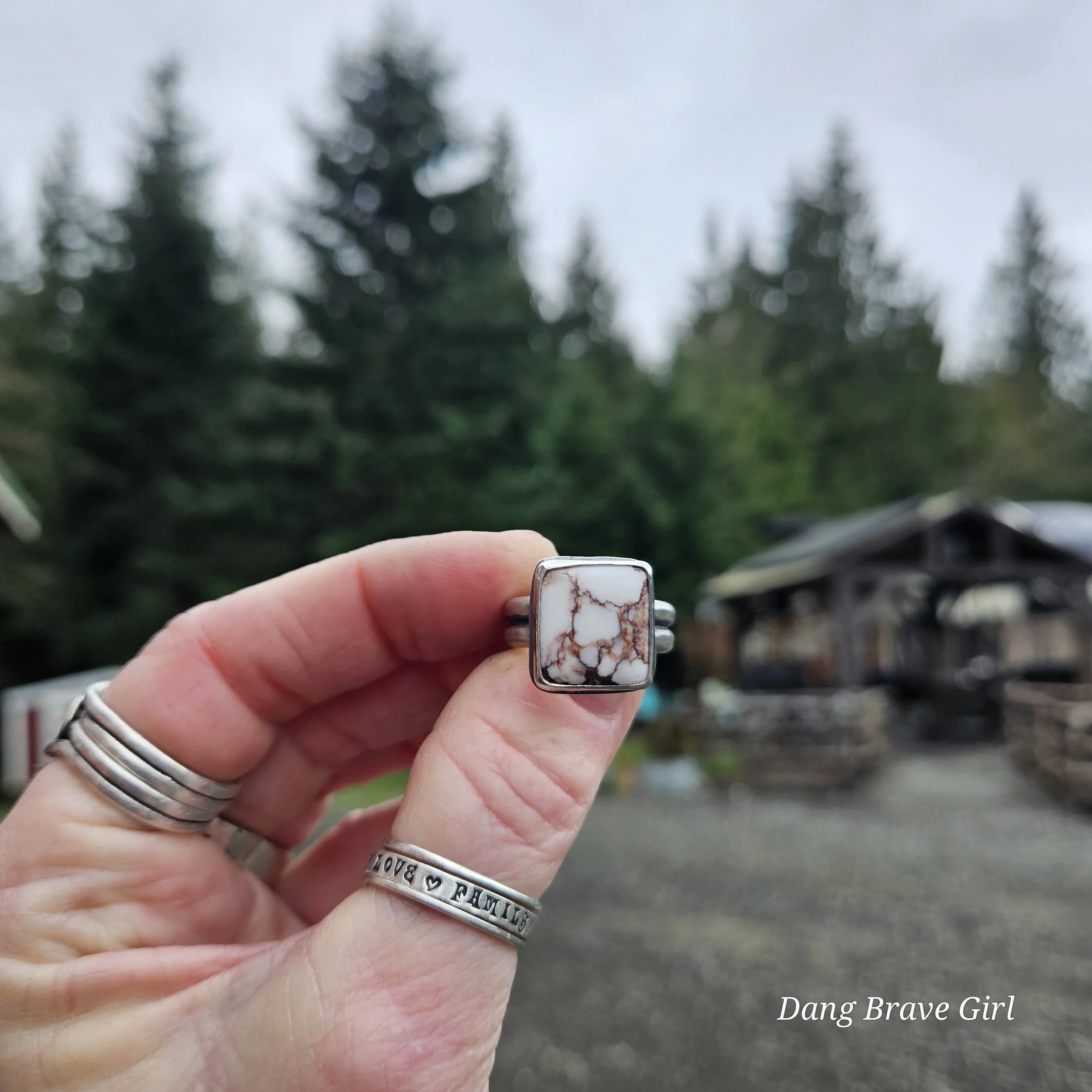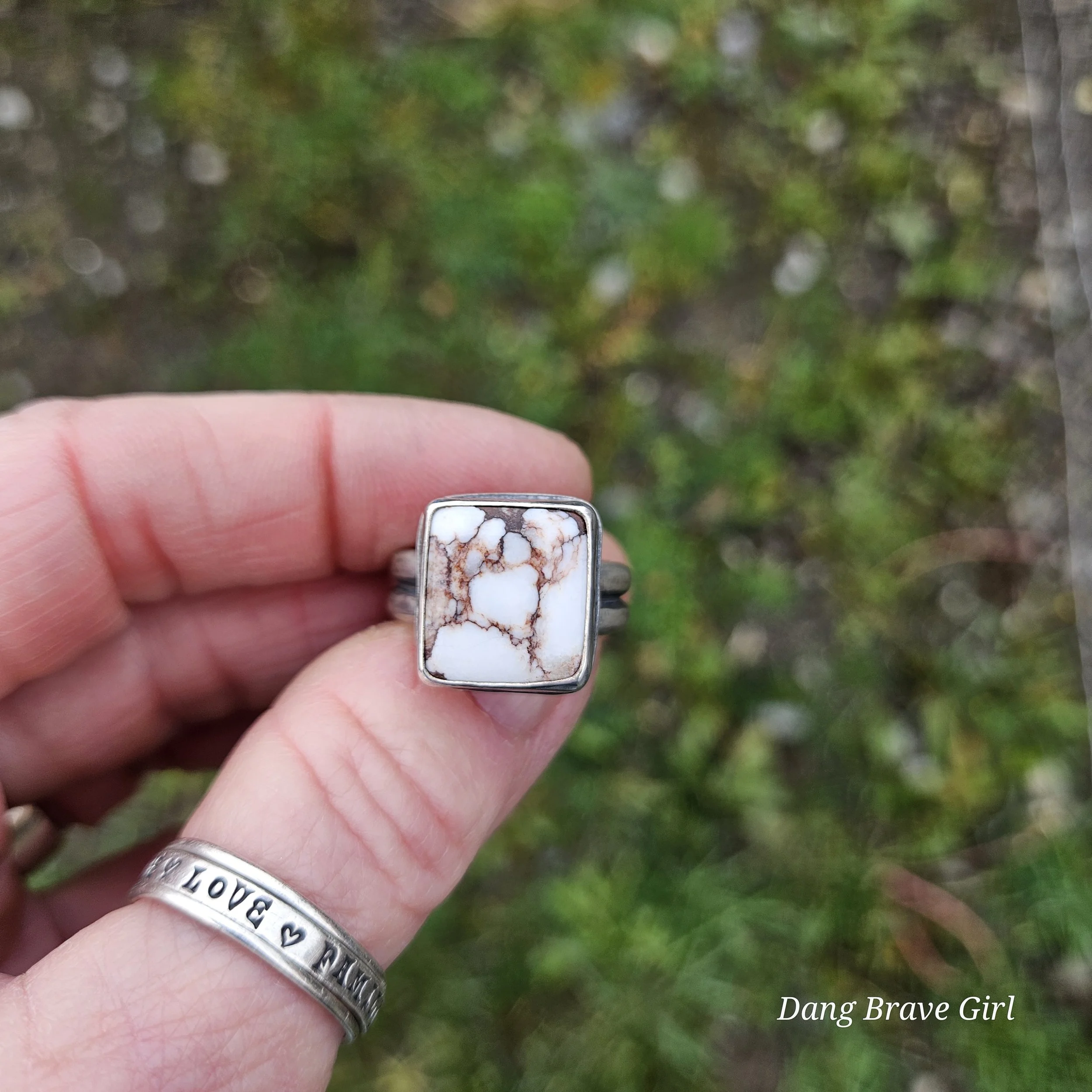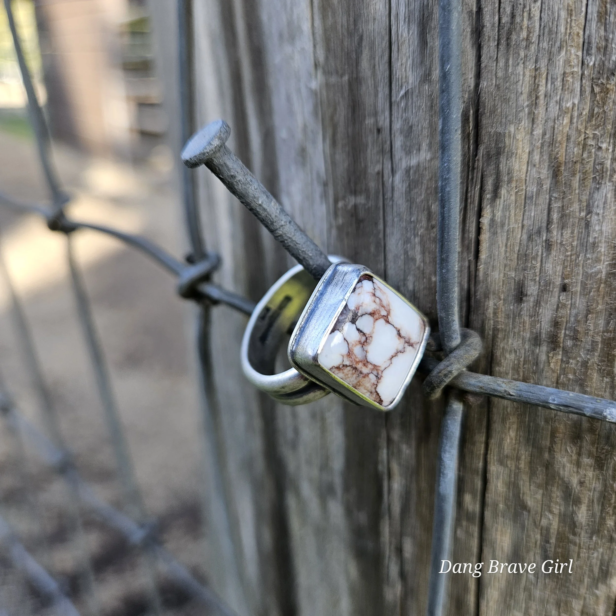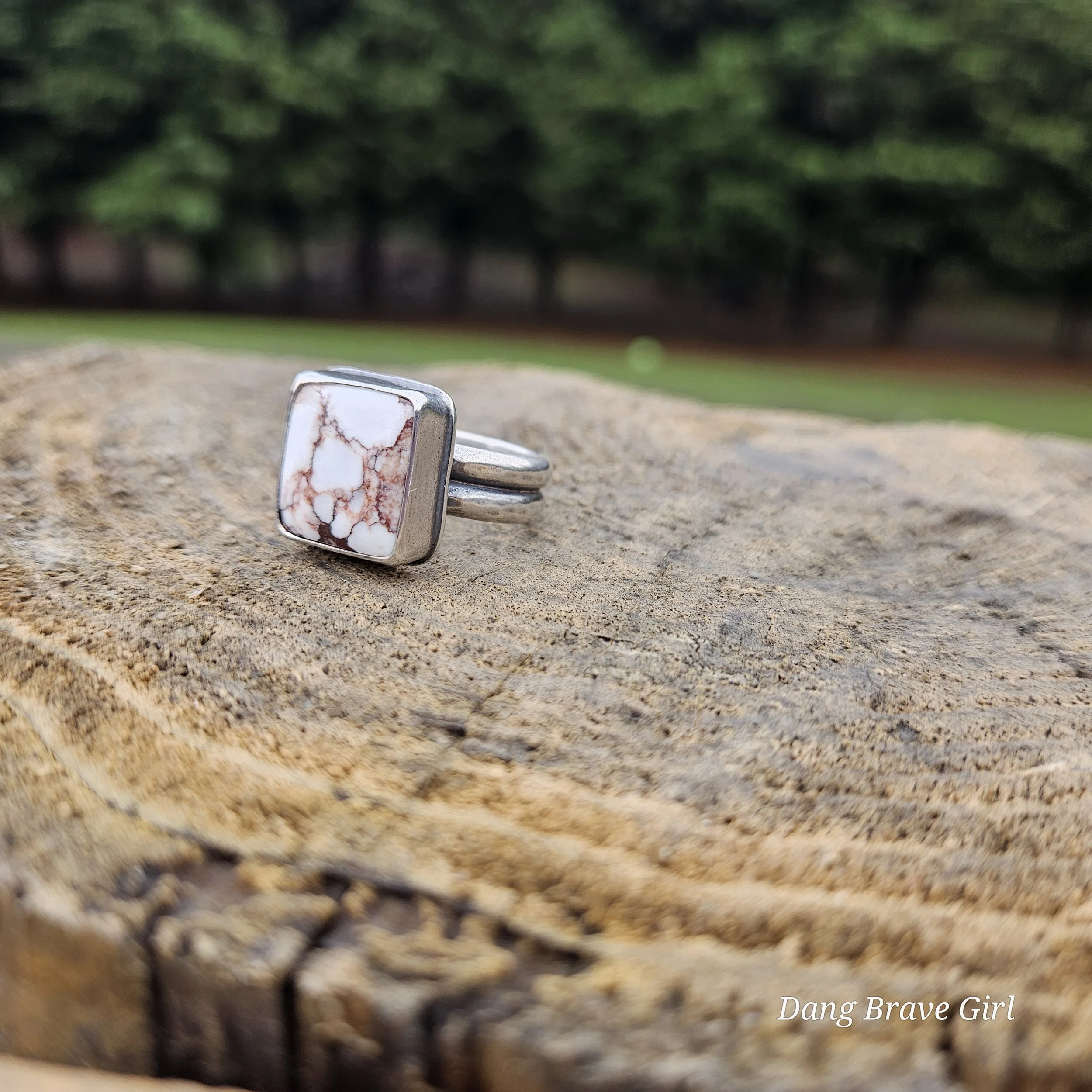 This great chunk of Wildhorse has a home in fine and sterling silver on top of a comfortable but sturdy shank in a size 8.5. It measures 5/8” wide and tall and is finished with a lightly hammered texture, rich patina and soft polish.