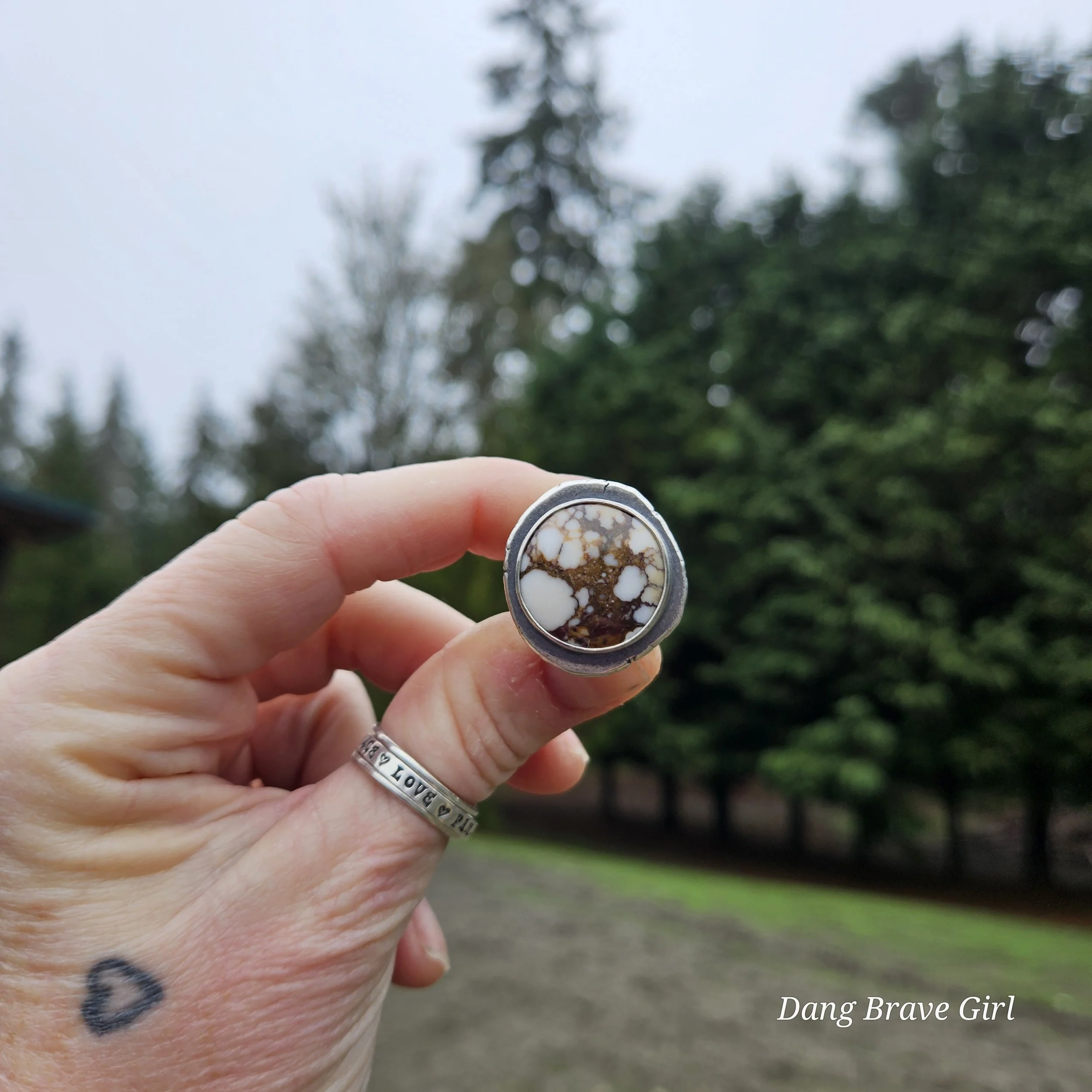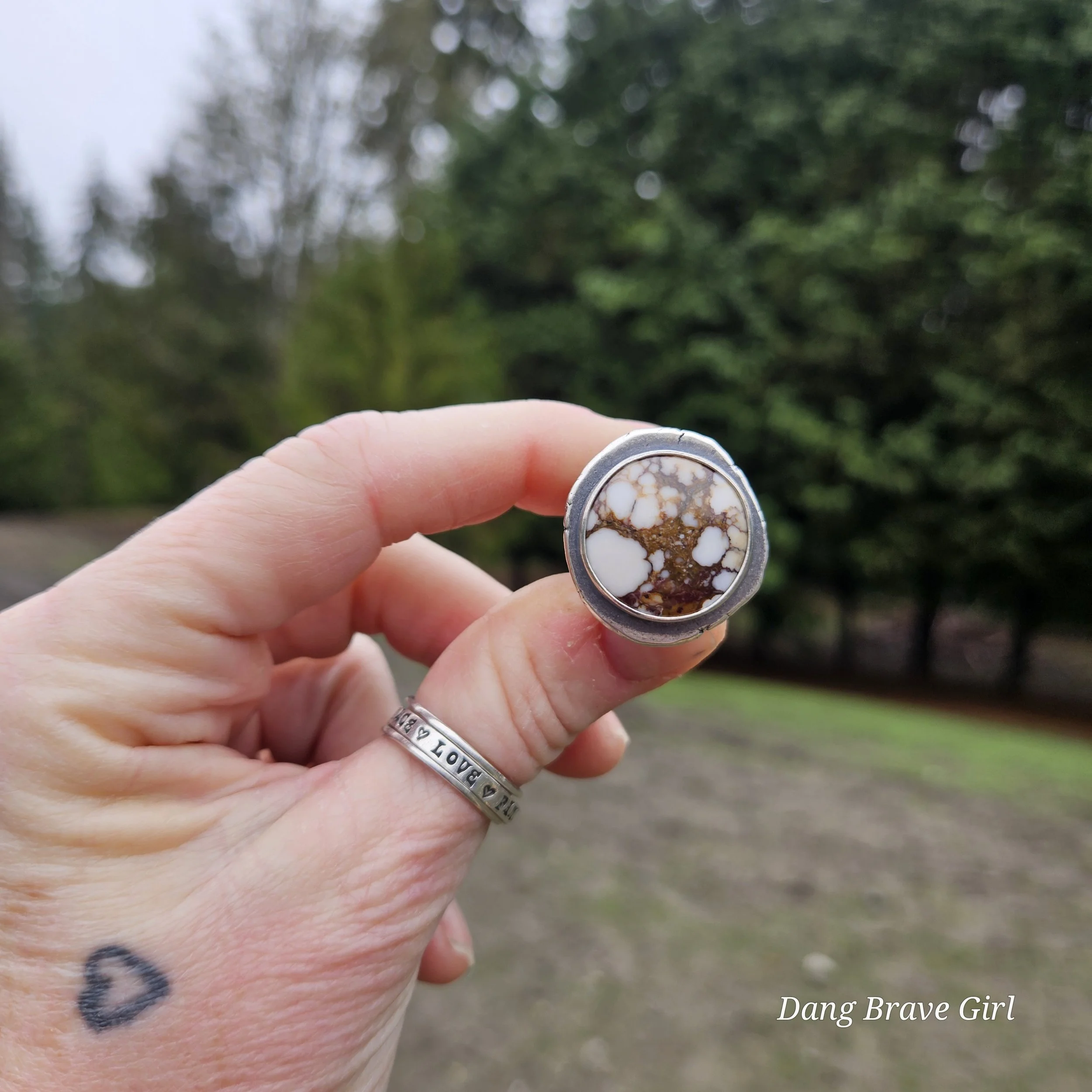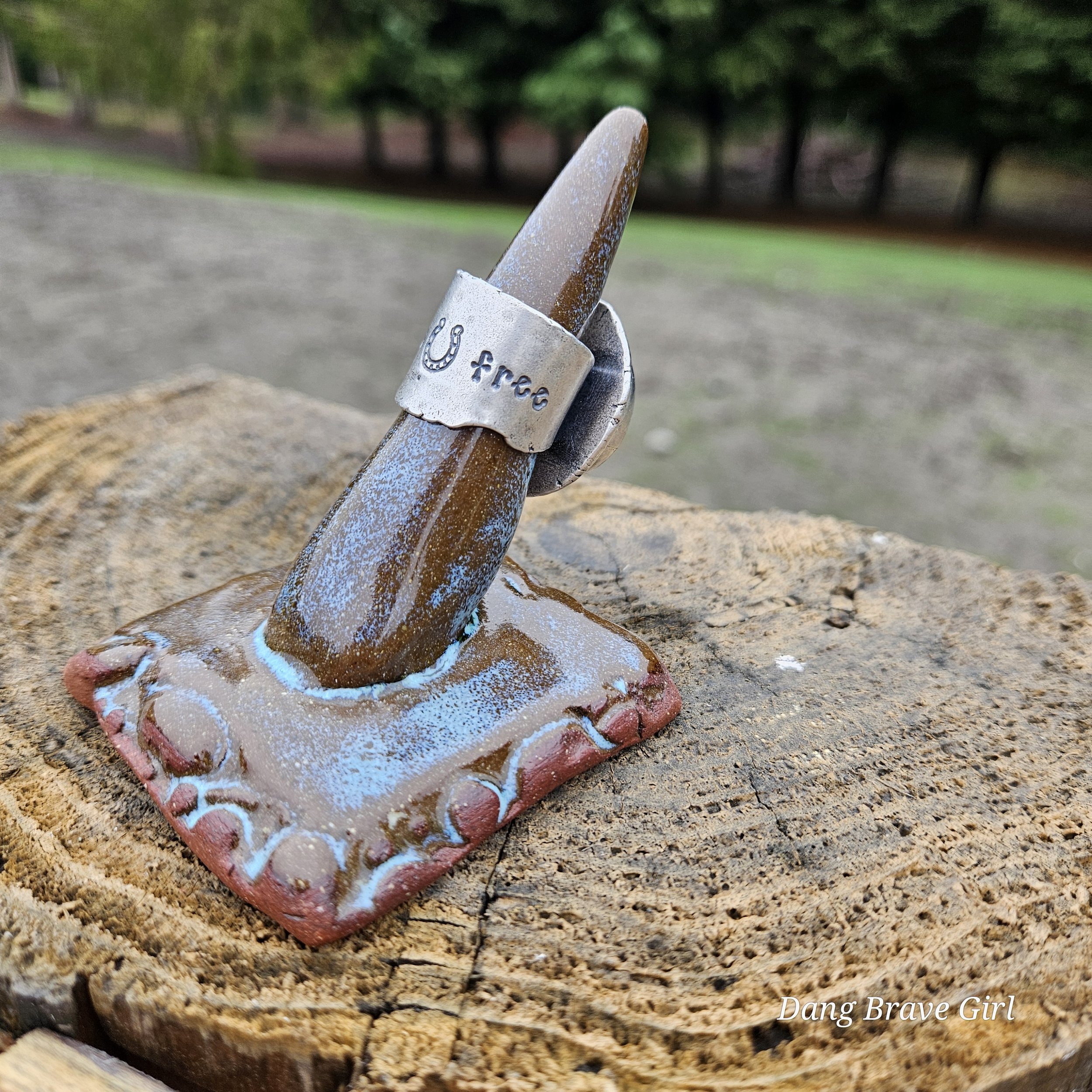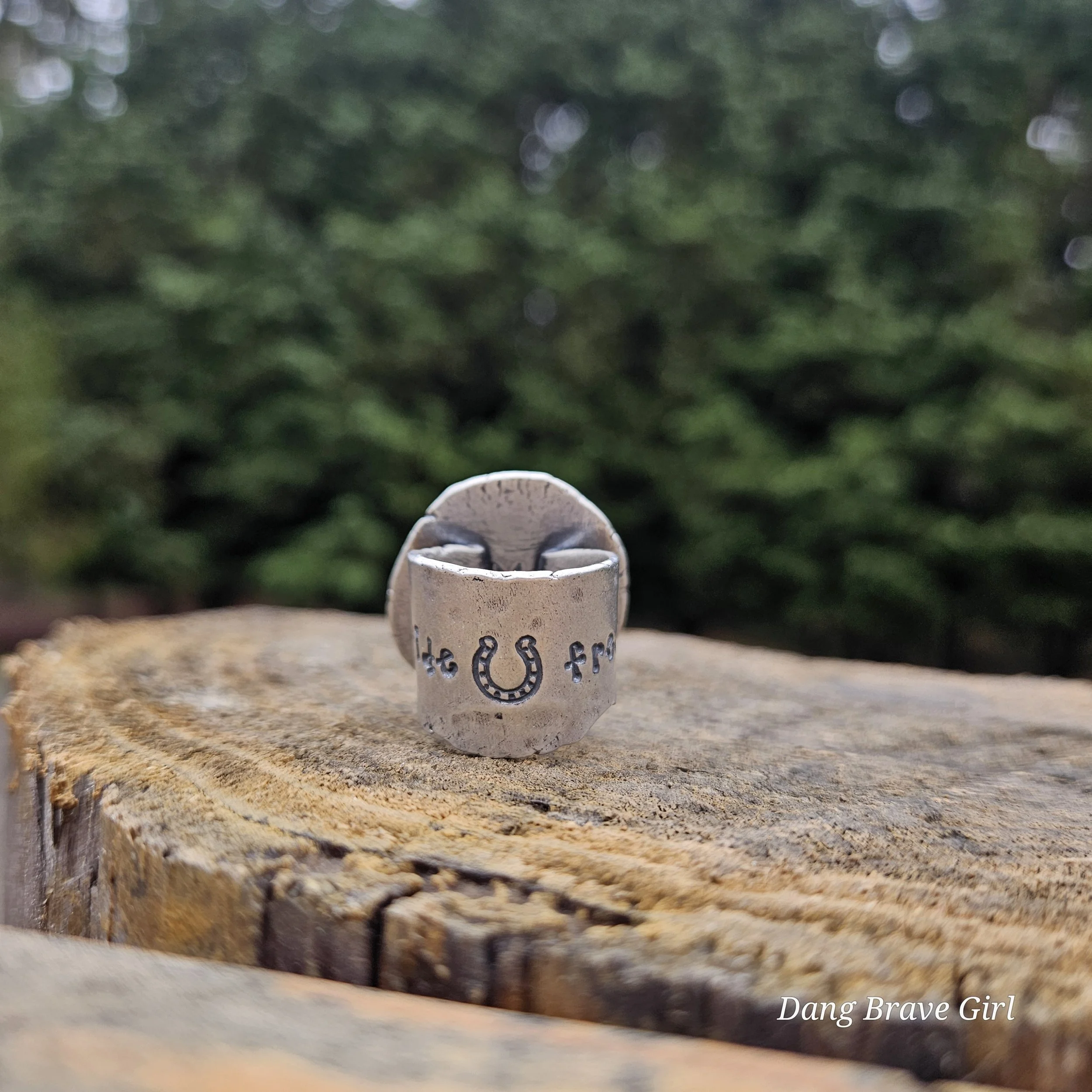The ring face measures 1” and the band is 5/8” at it widest. It is hand stamped with the sentiment ‘ride free’, along with a horseshoe and is a size 6.5. It’s finished with a rich patina and soft polish, highlighting the stone and the rustic style.