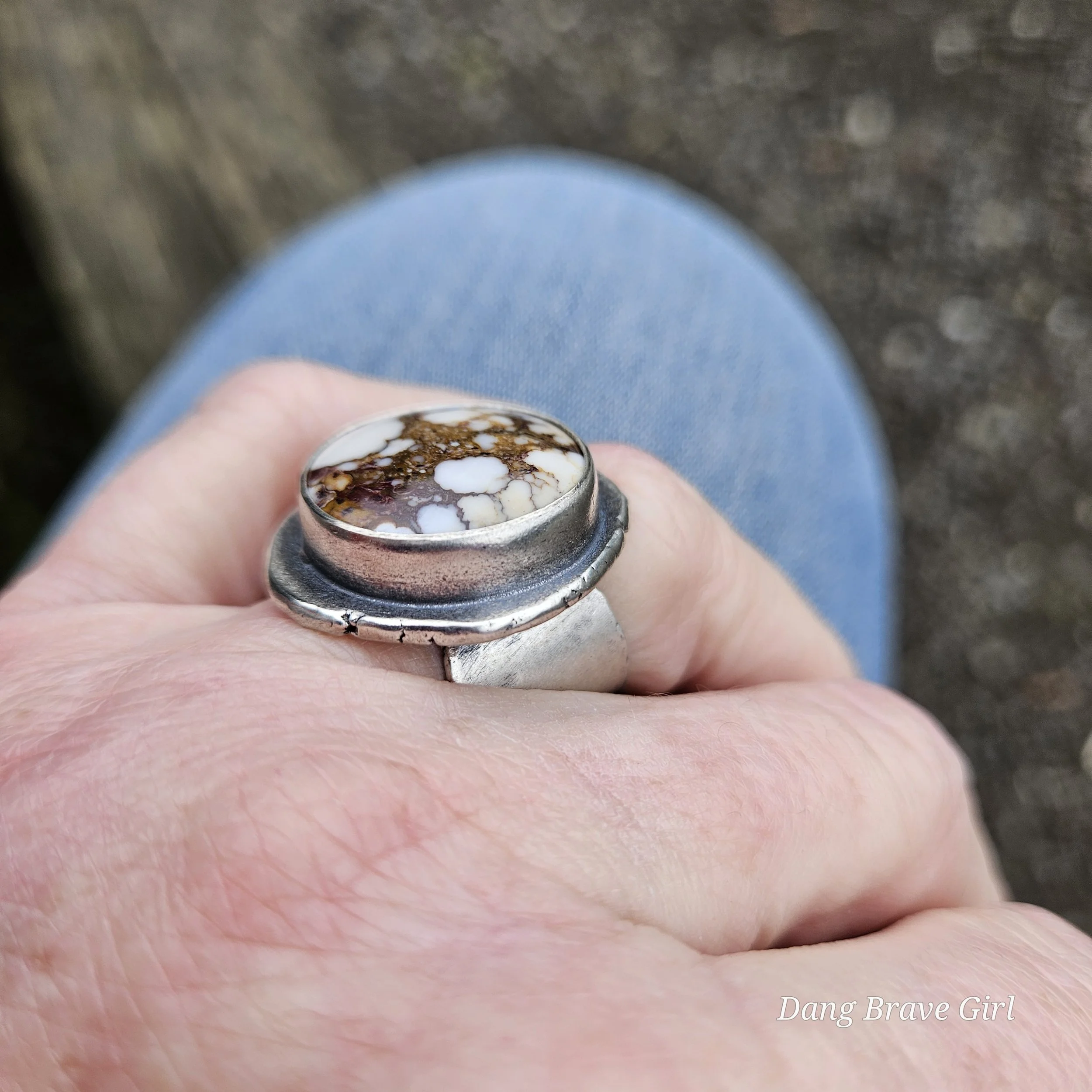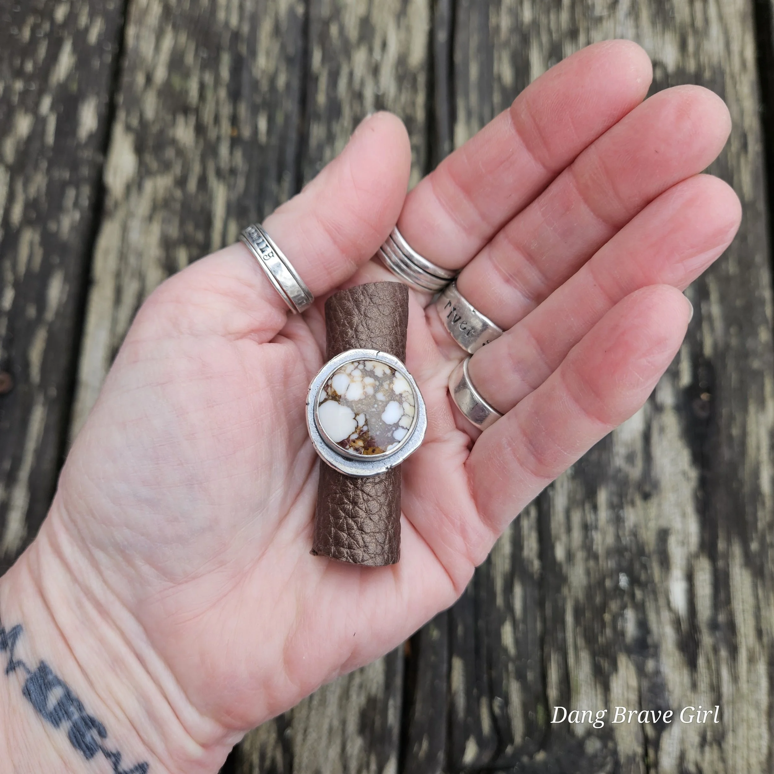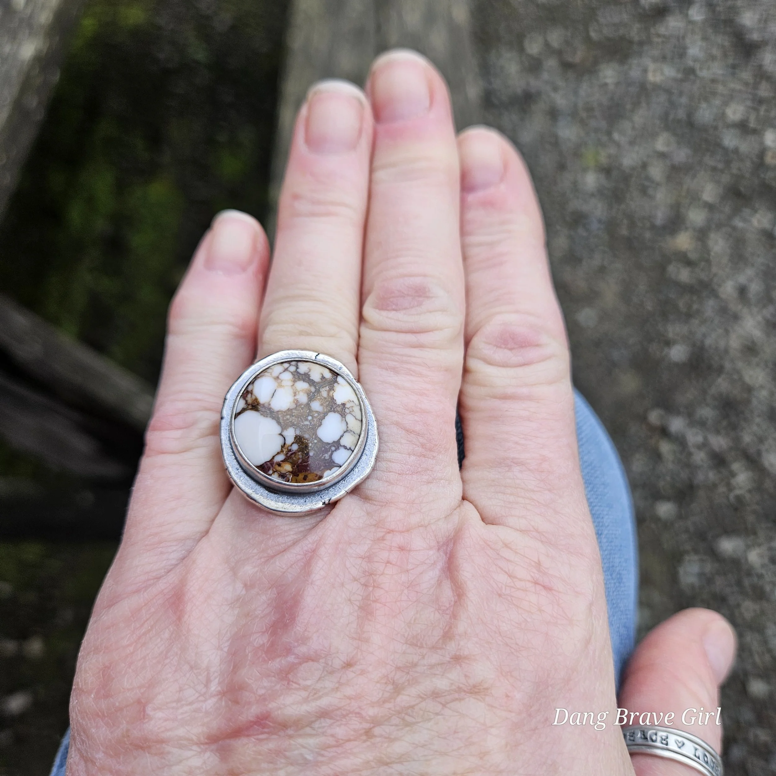The ring face measures 1” and the band is 5/8” at it widest. It is hand stamped with the sentiment ‘ride free’, along with a horseshoe and is a size 6.5. It’s finished with a rich patina and soft polish, highlighting the stone and the rustic style.