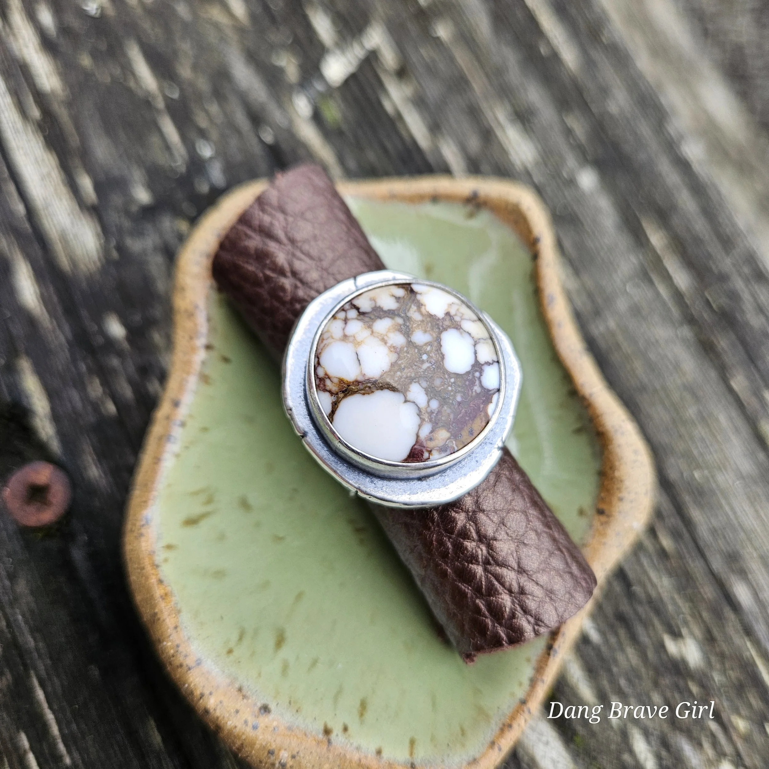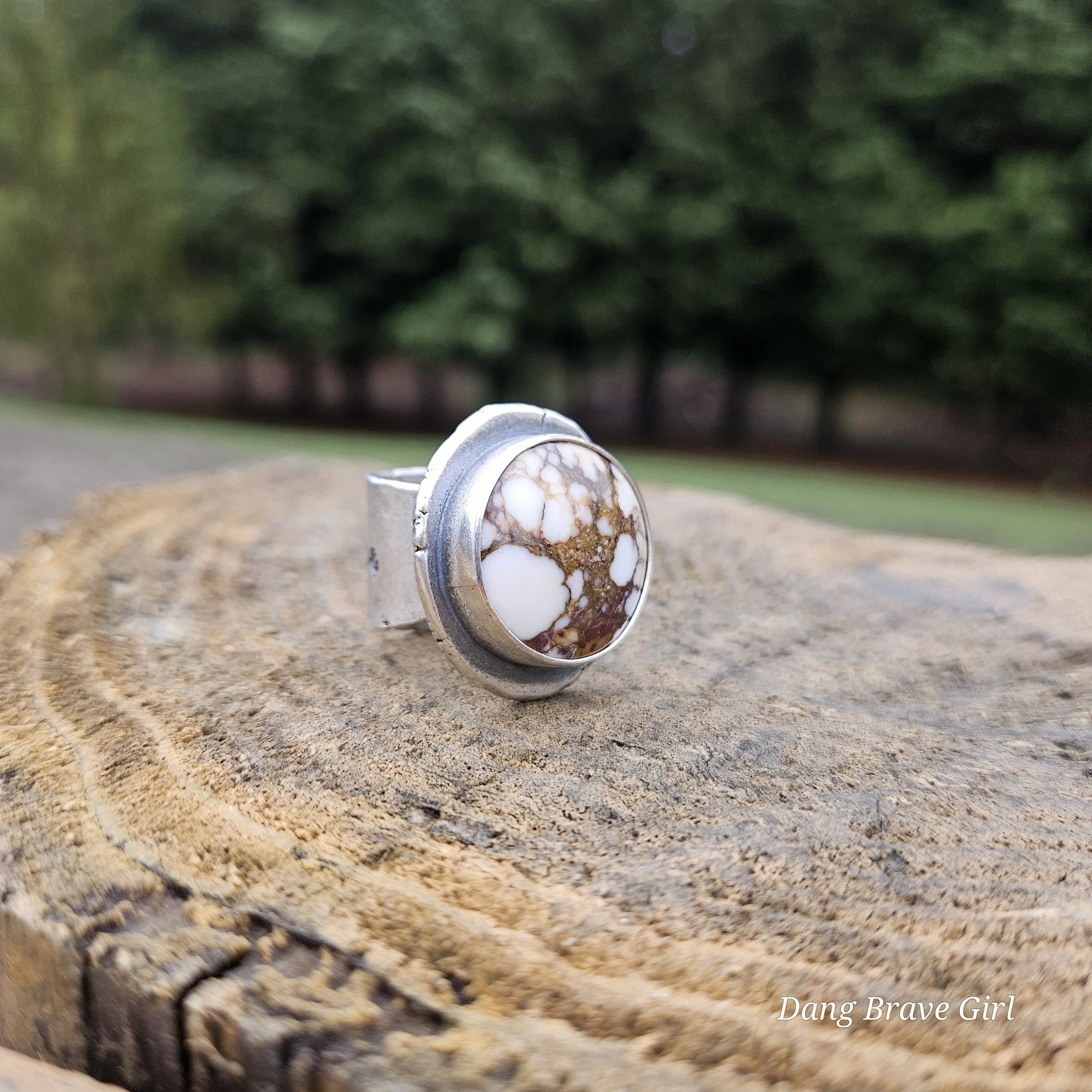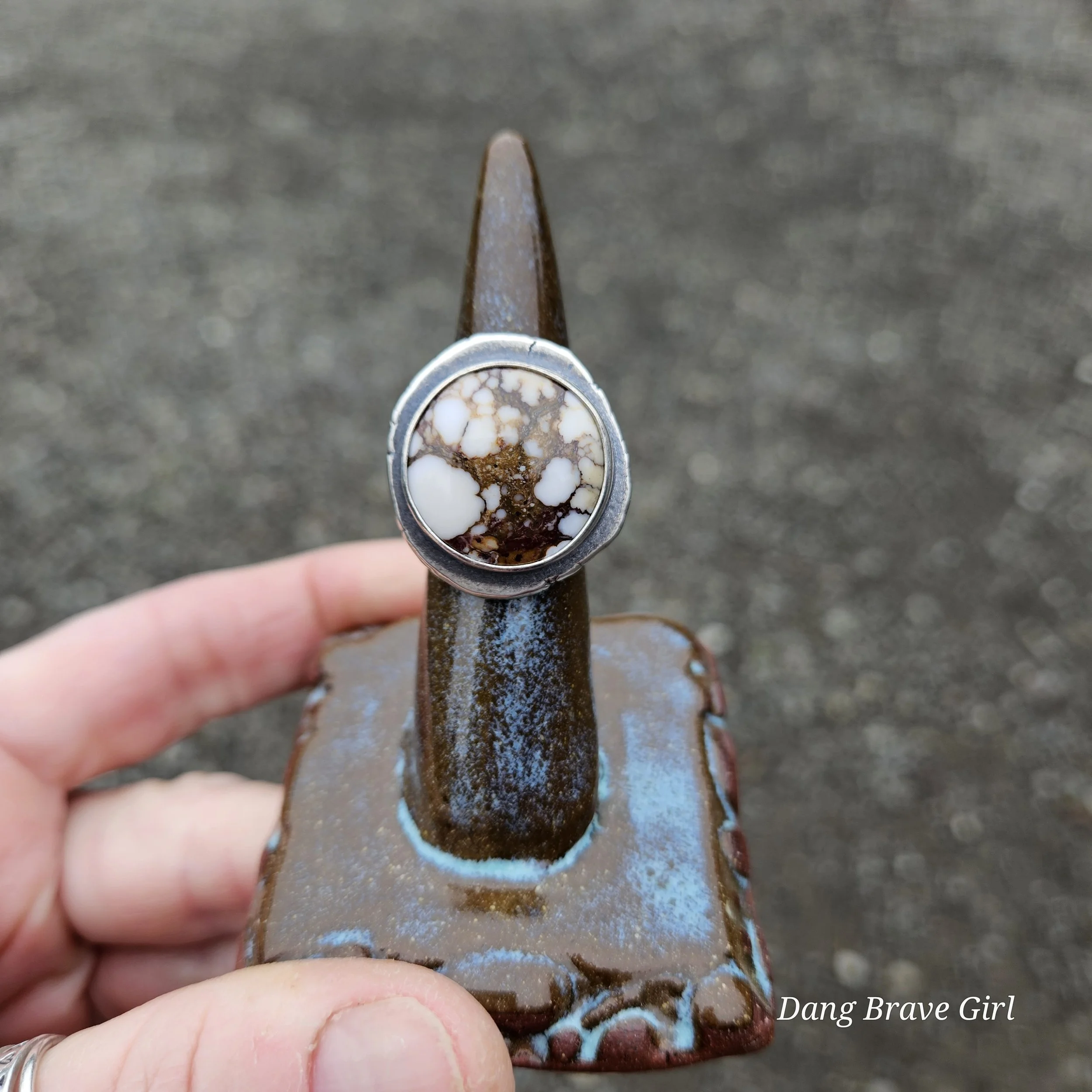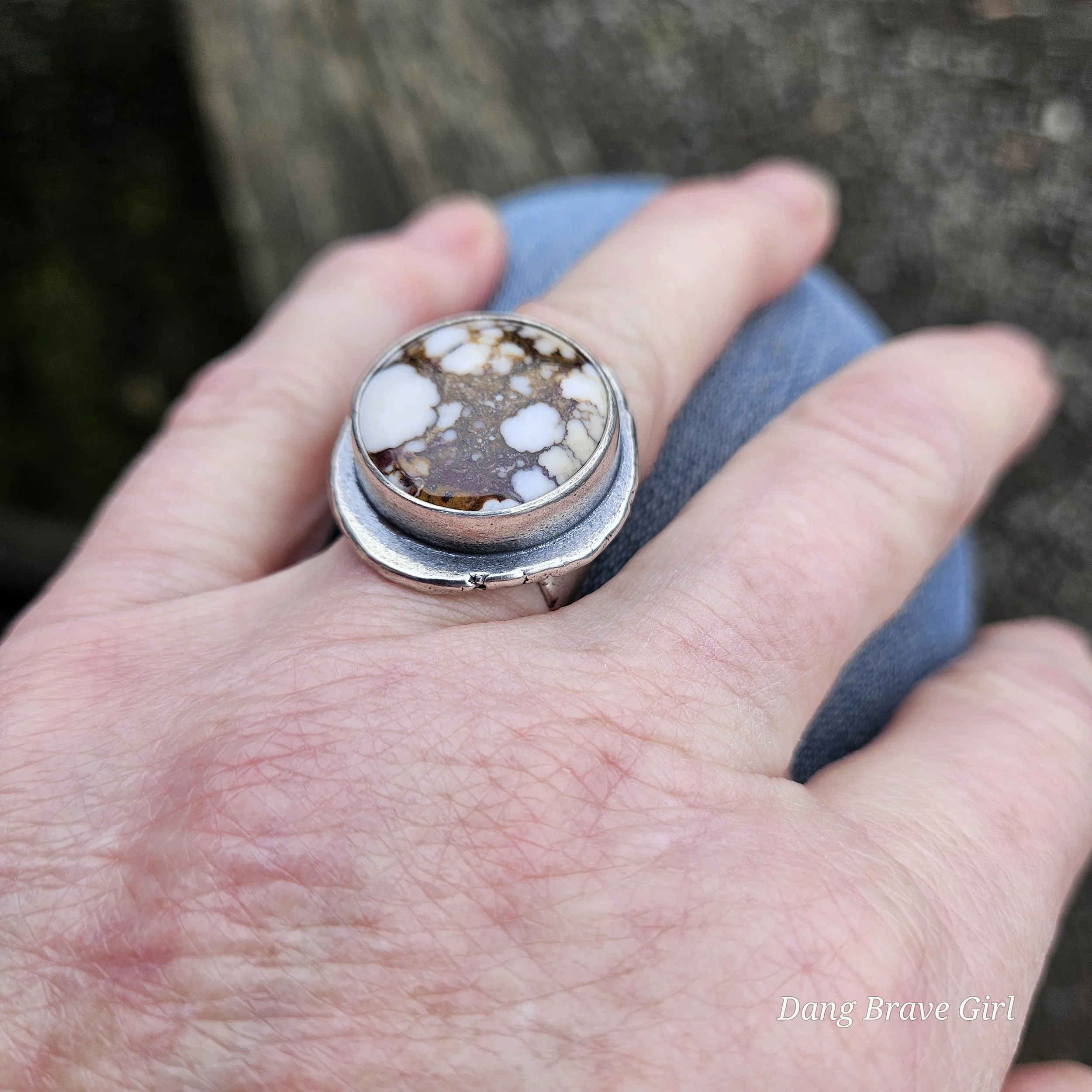 The ring face measures 1” and the band is 5/8” at it widest. It is hand stamped with the sentiment ‘ride free’, along with a horseshoe and is a size 6.5. It’s finished with a rich patina and soft polish, highlighting the stone and the rustic style.