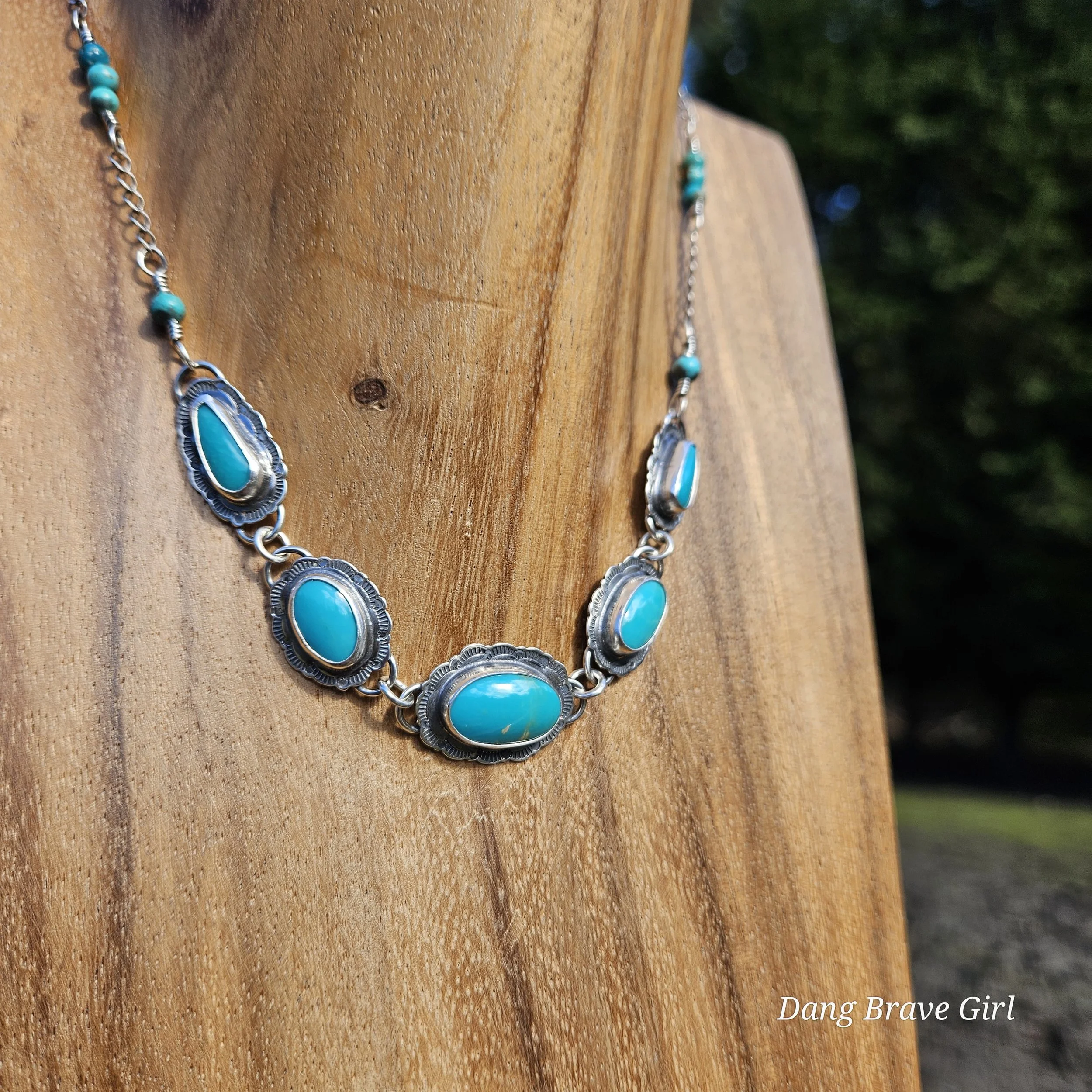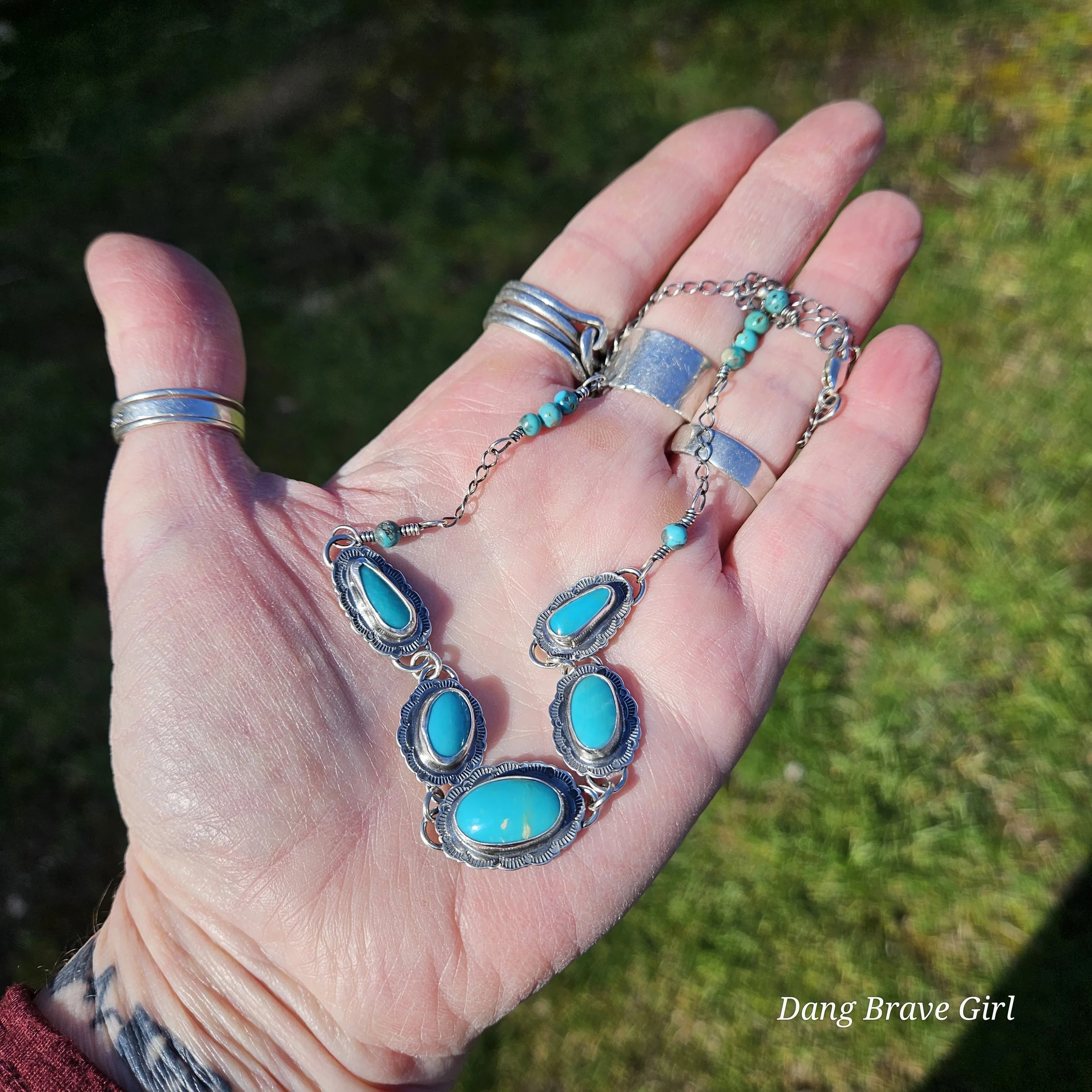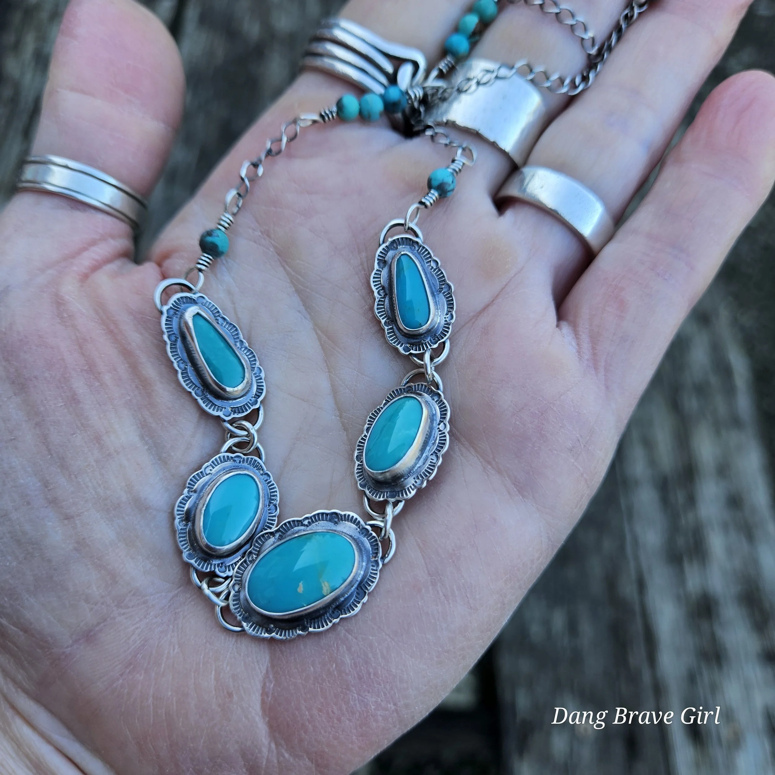 I made a home for the 5 Kingman Turquoise stones in fine and sterling silver, surrounding them with hand stamped details and placing them close together in a choker style necklace.