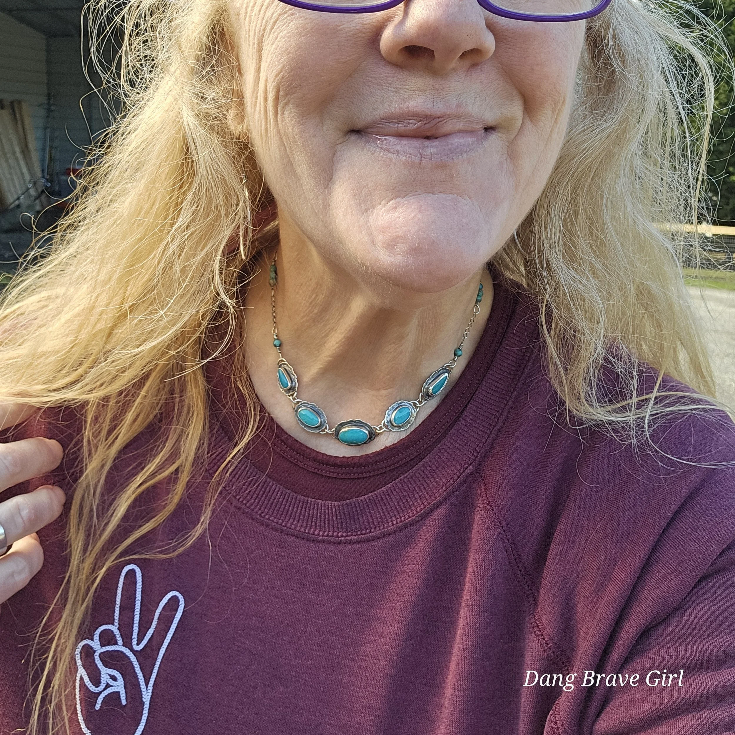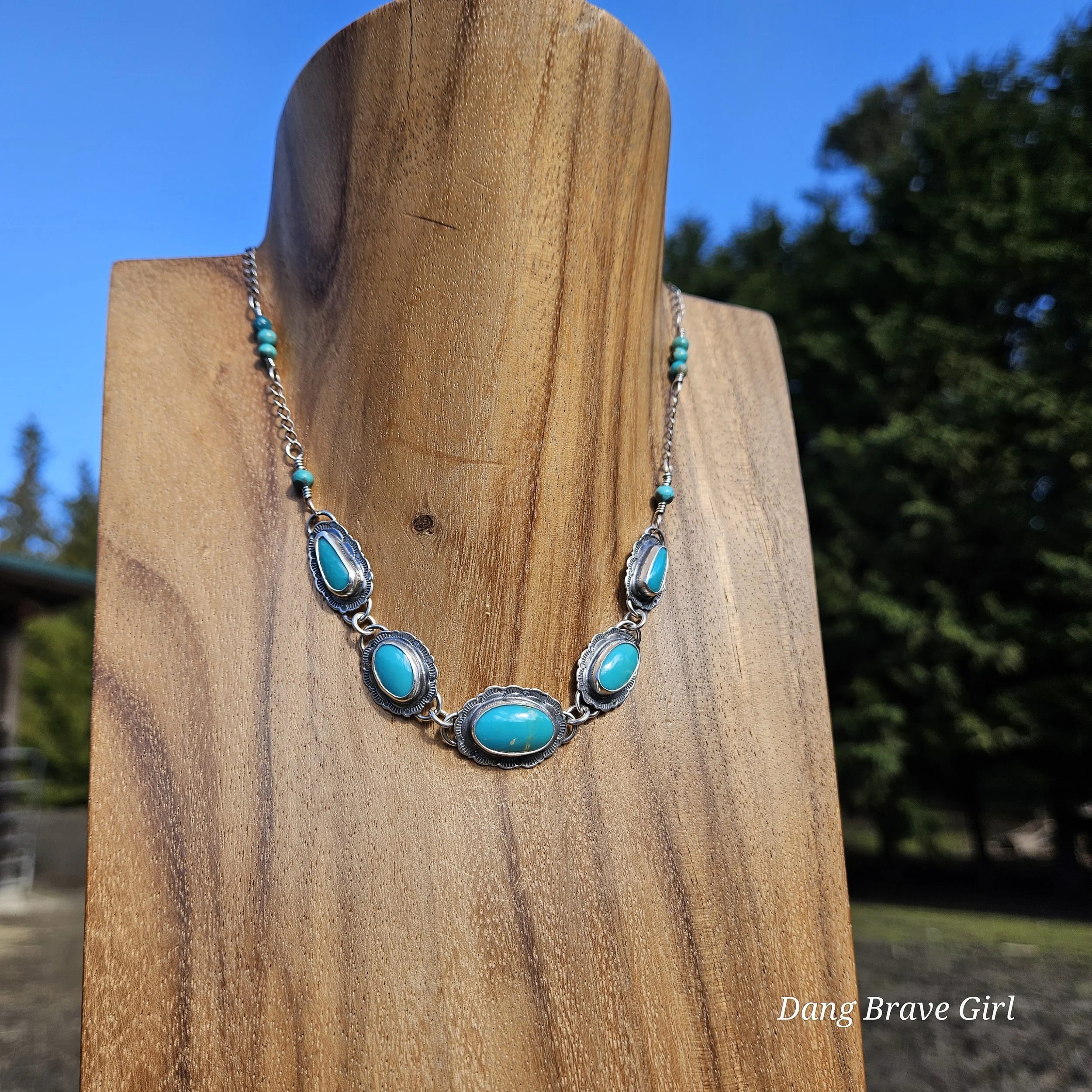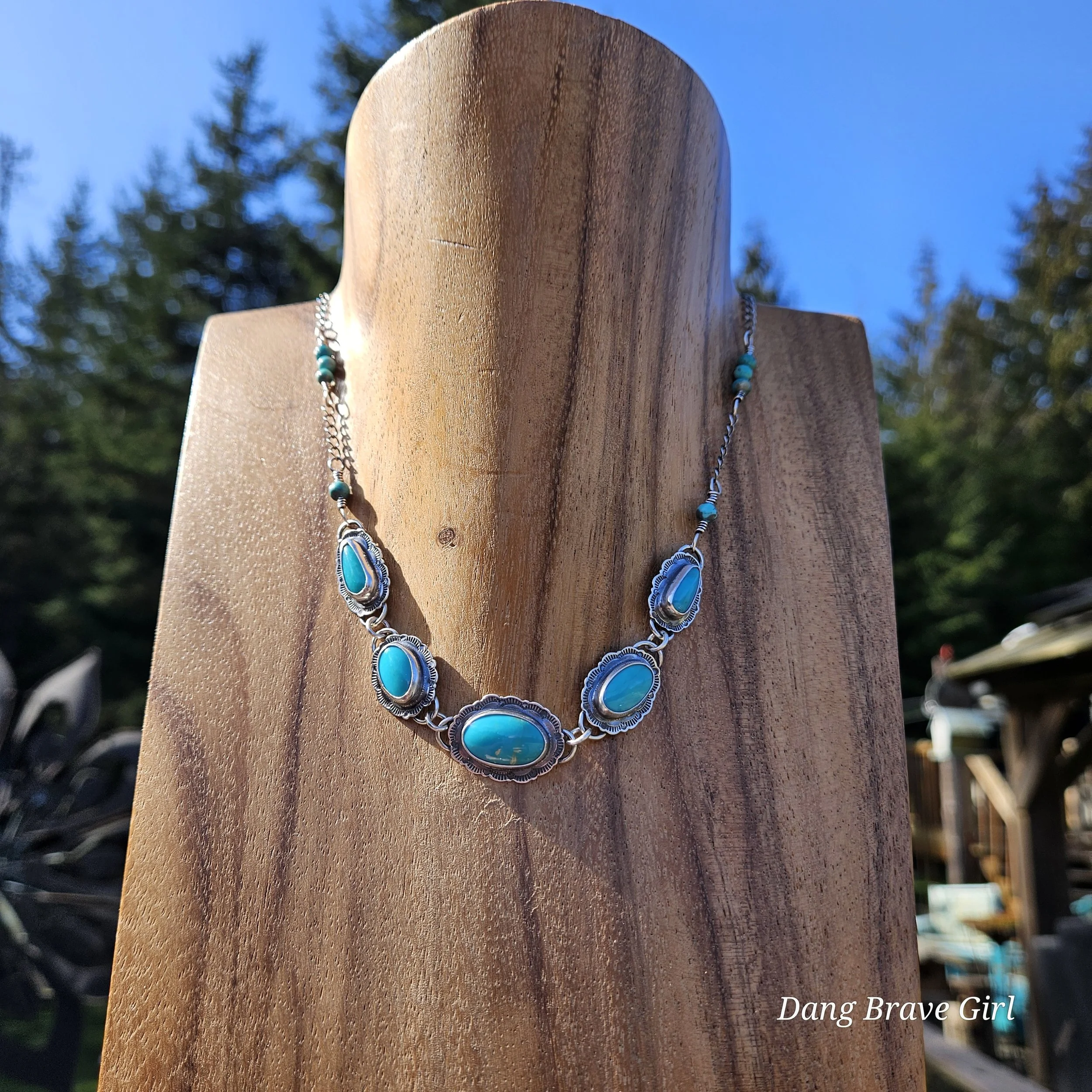 I made a home for the 5 Kingman Turquoise stones in fine and sterling silver, surrounding them with hand stamped details and placing them close together in a choker style necklace.