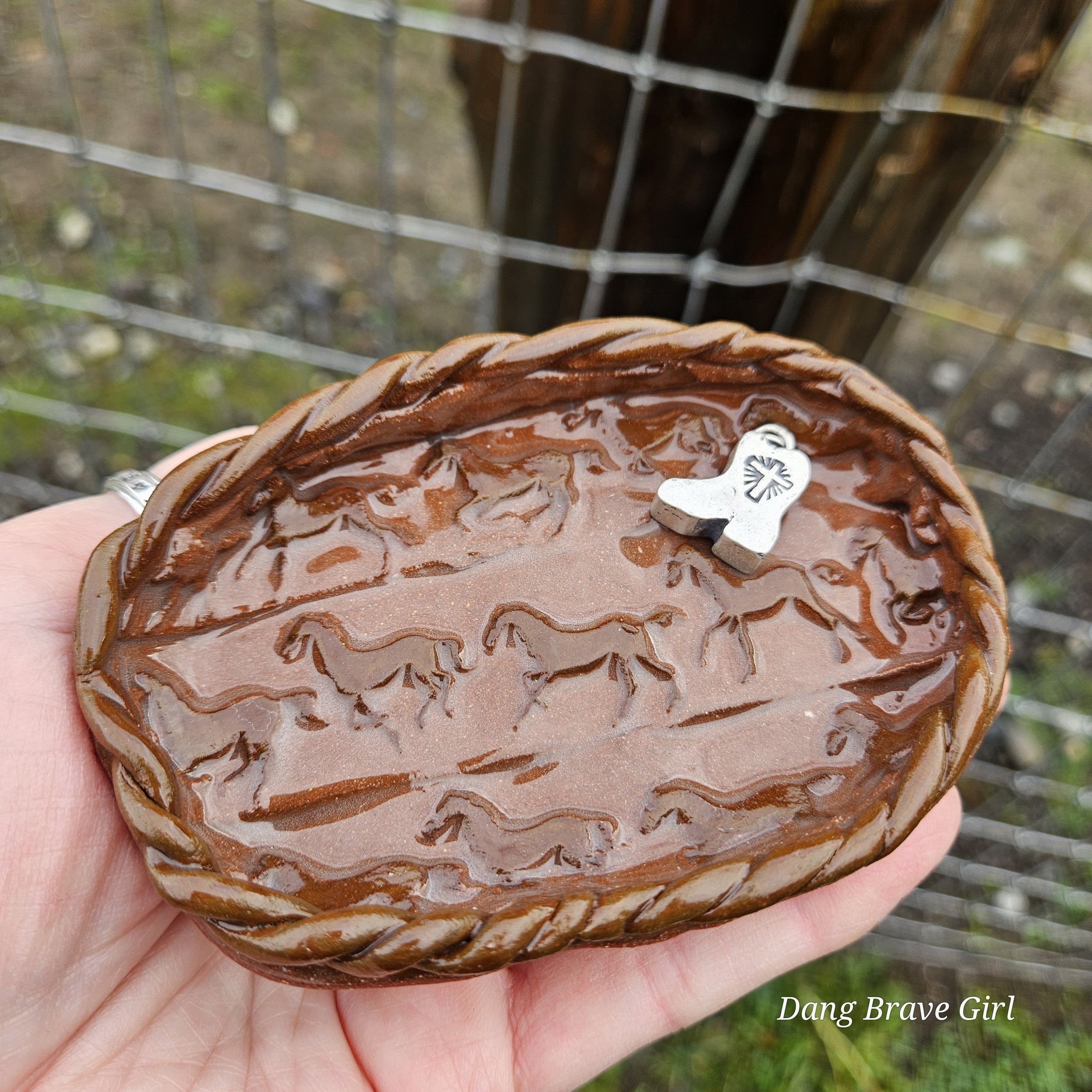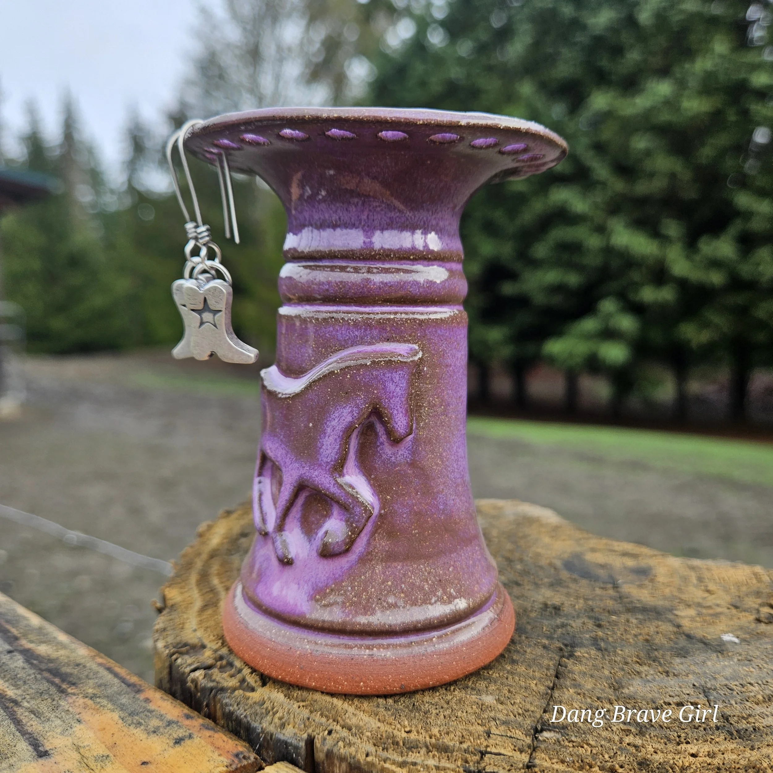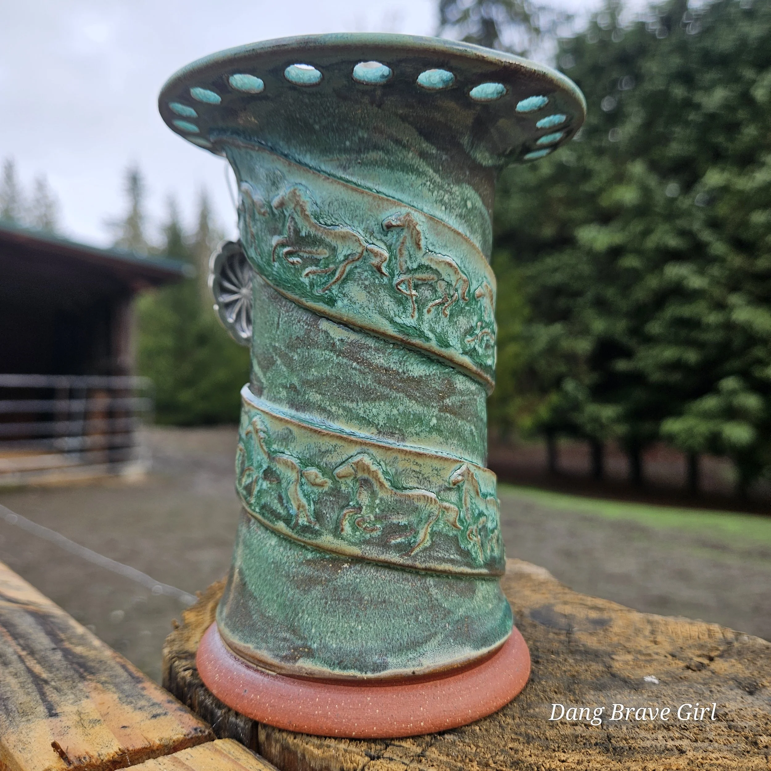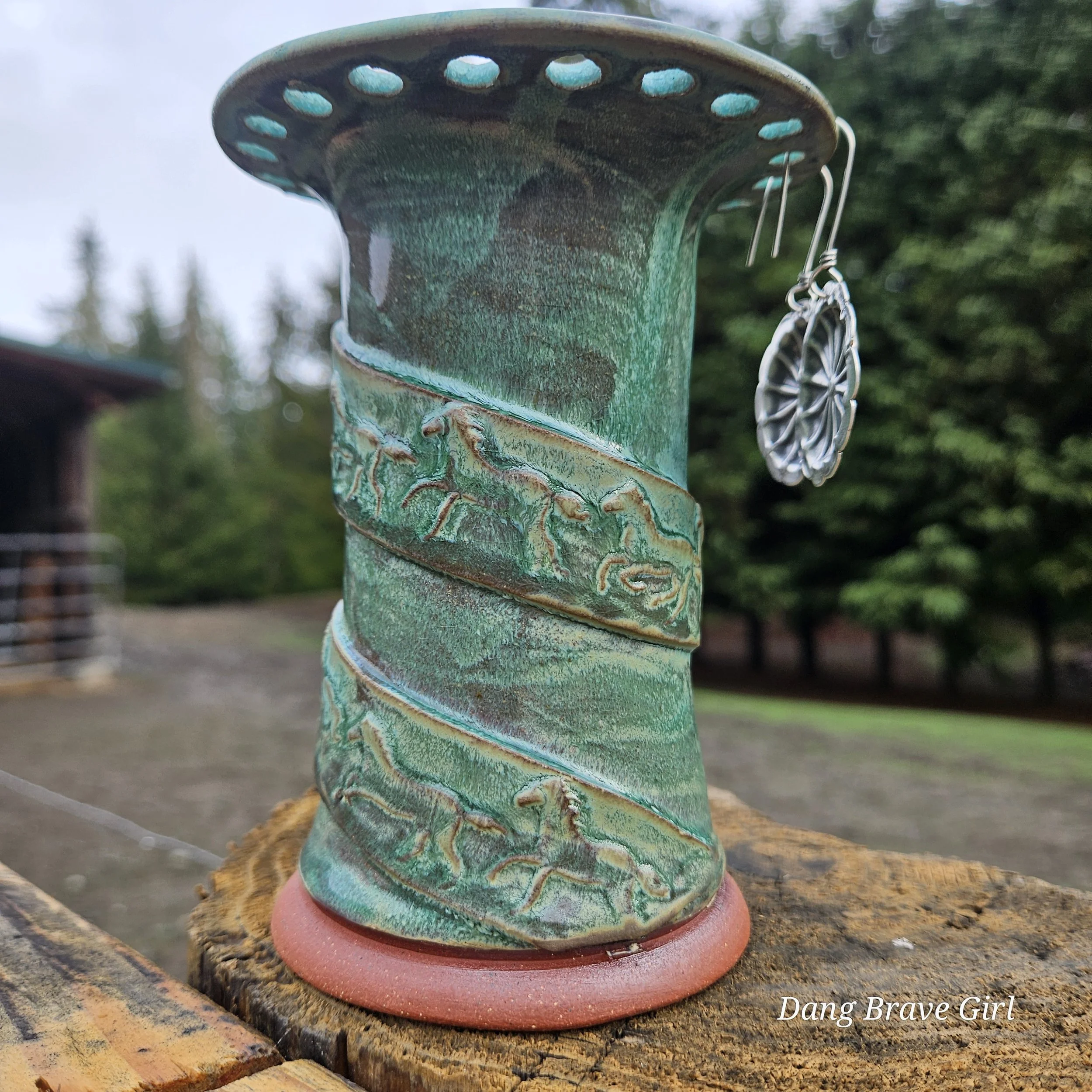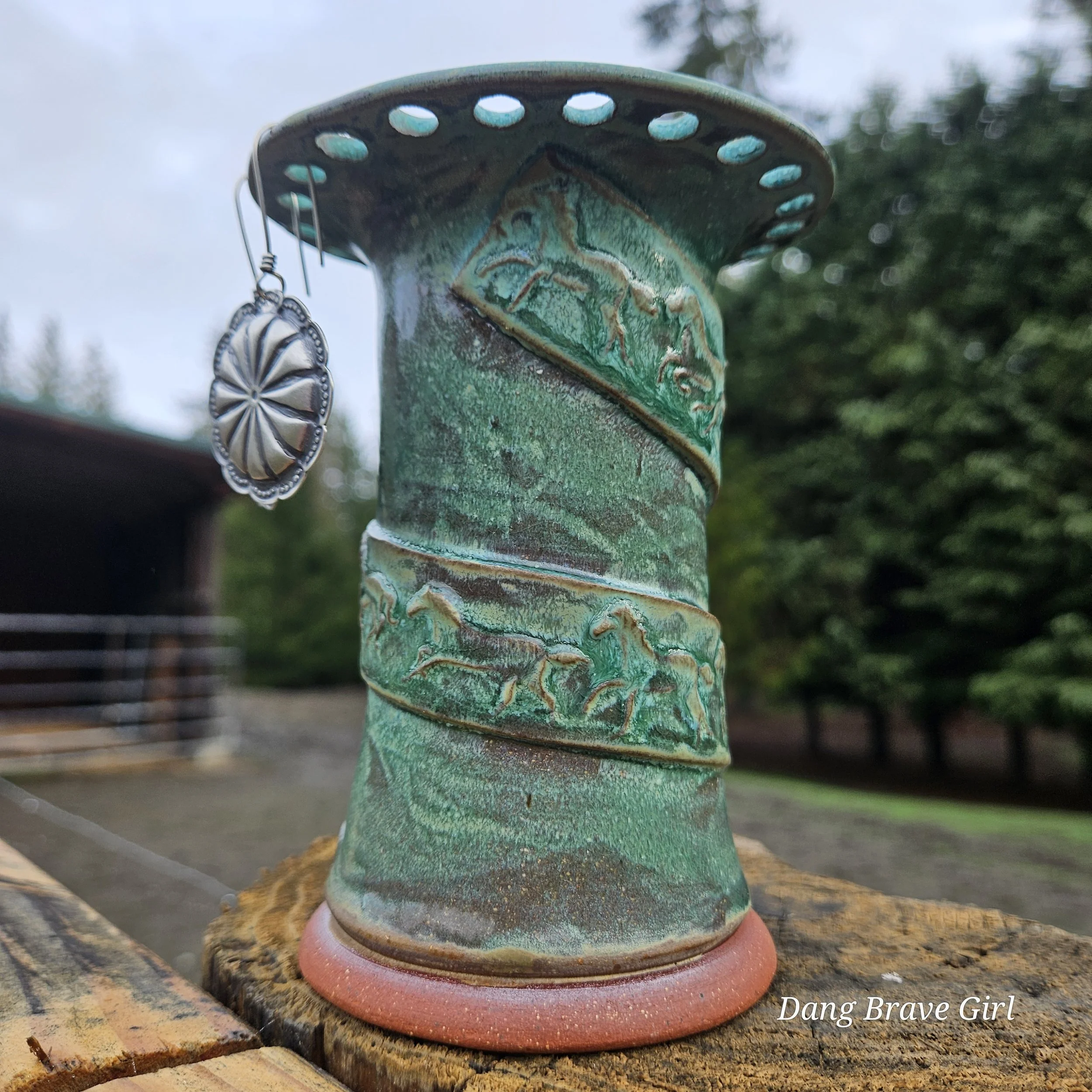 Handmade by the DBH with Oregon Red clay, this earring holder is wrapped and layered with wild horses off for a trail ride or round up. The Weathered Bronze glaze is out of this world cool.