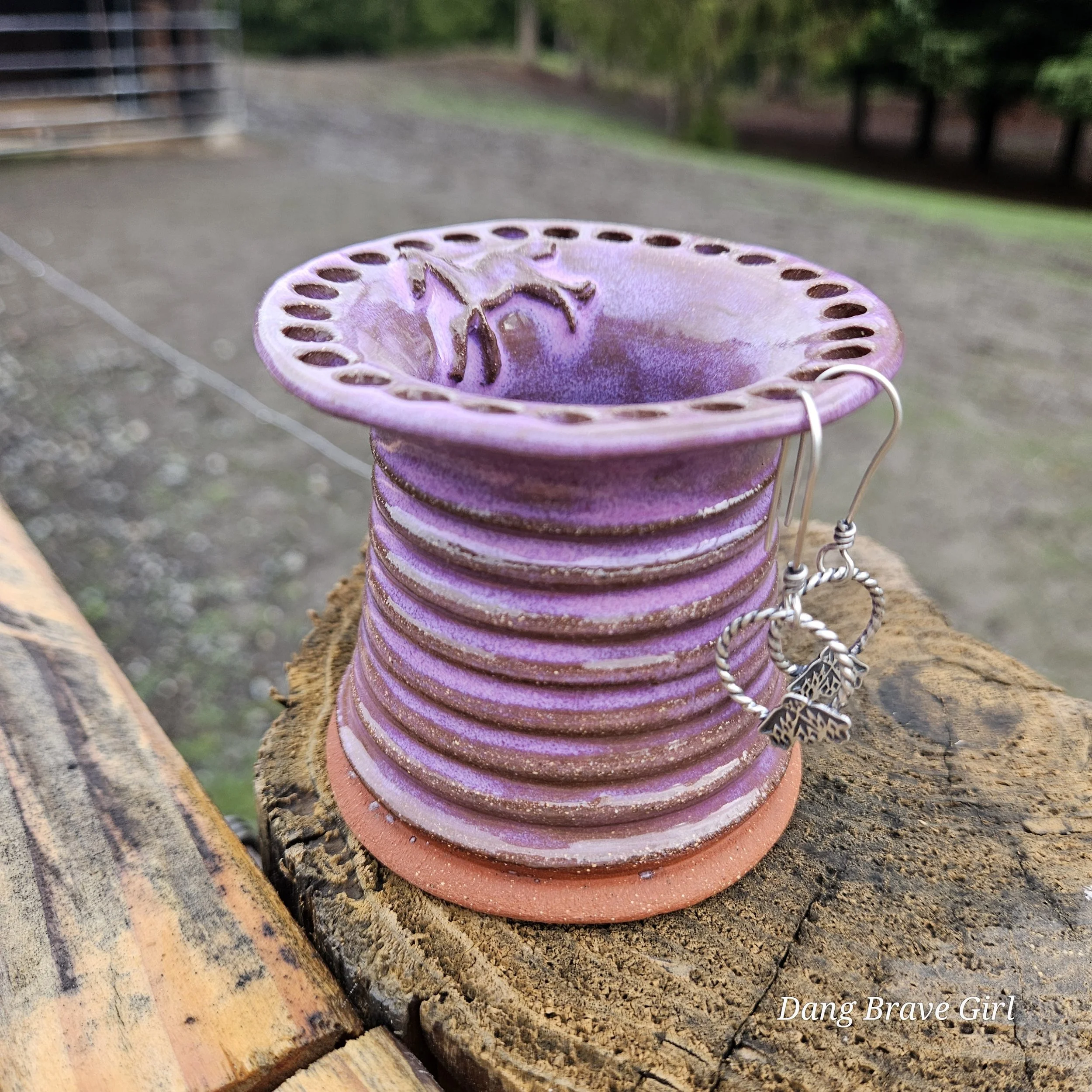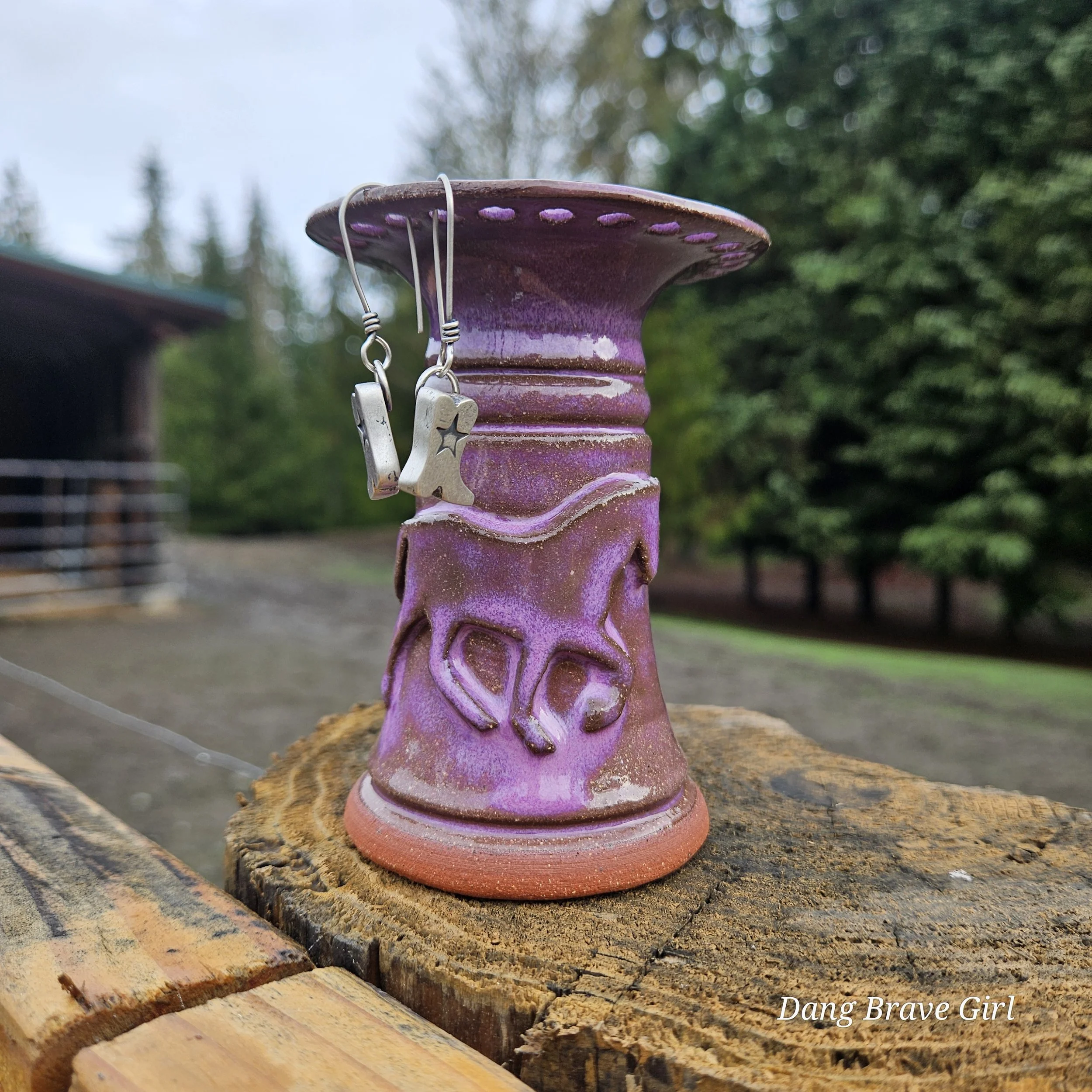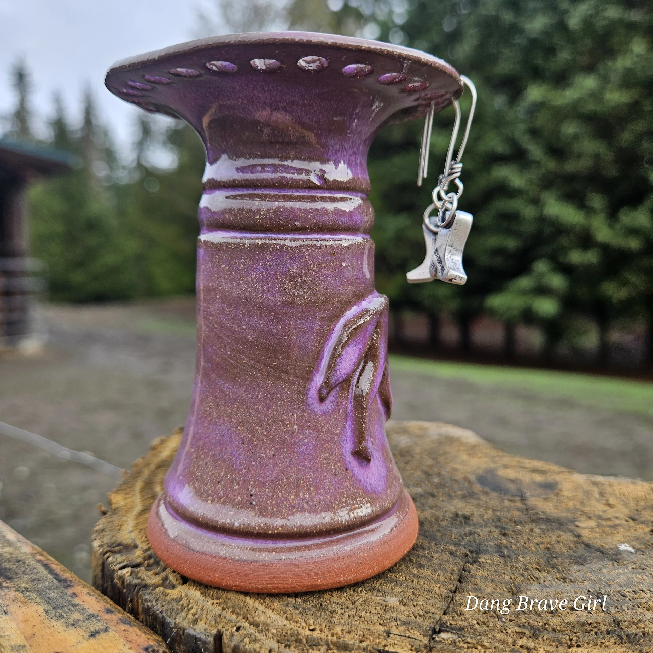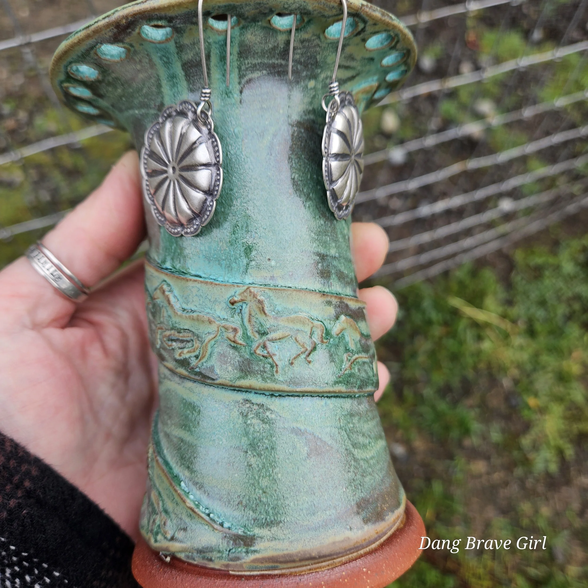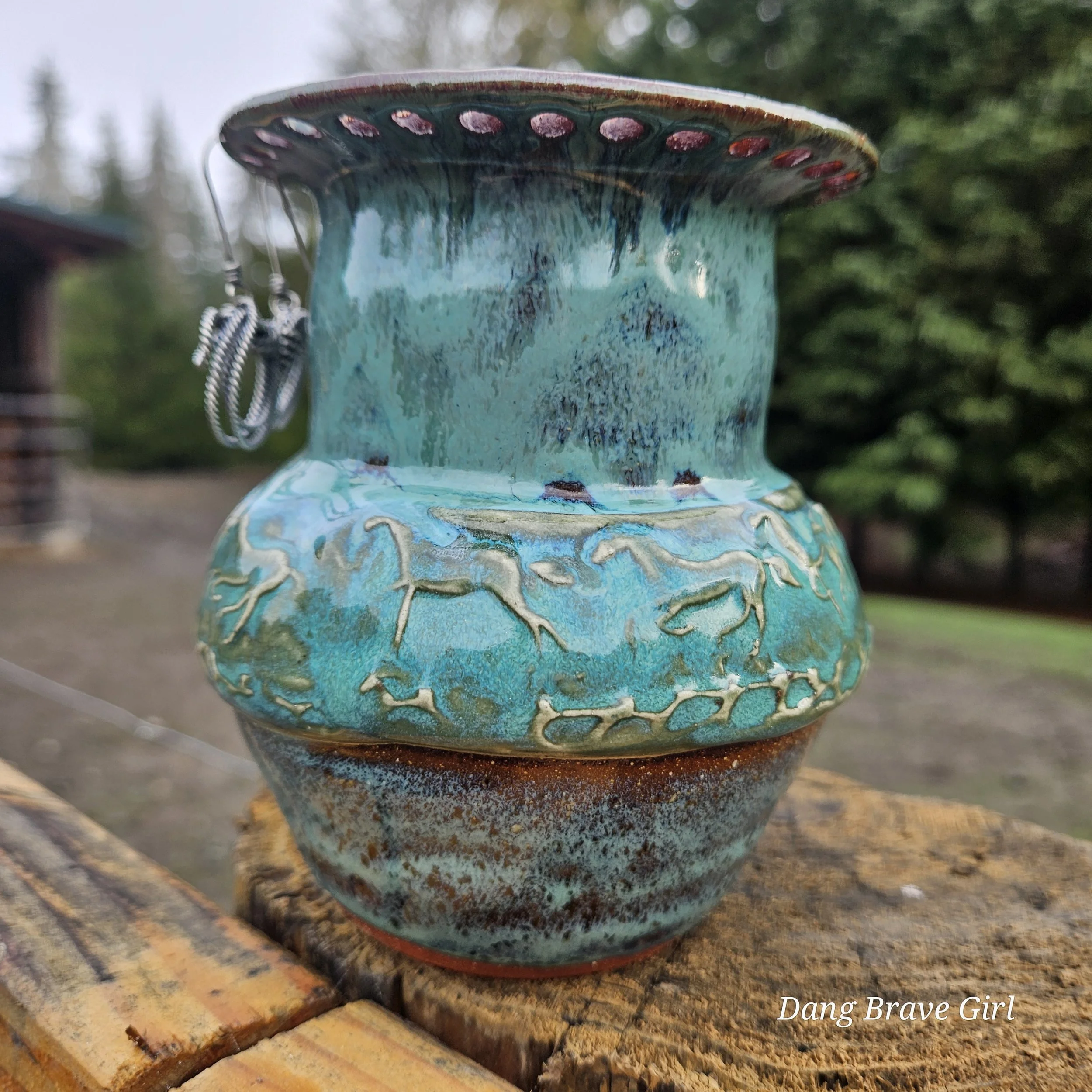 Handmade by the DBH with Oregon Red clay, this earring holder is wrapped and layered with wild horses off for a trail ride or round up. The Weathered Bronze glaze is out of this world cool.