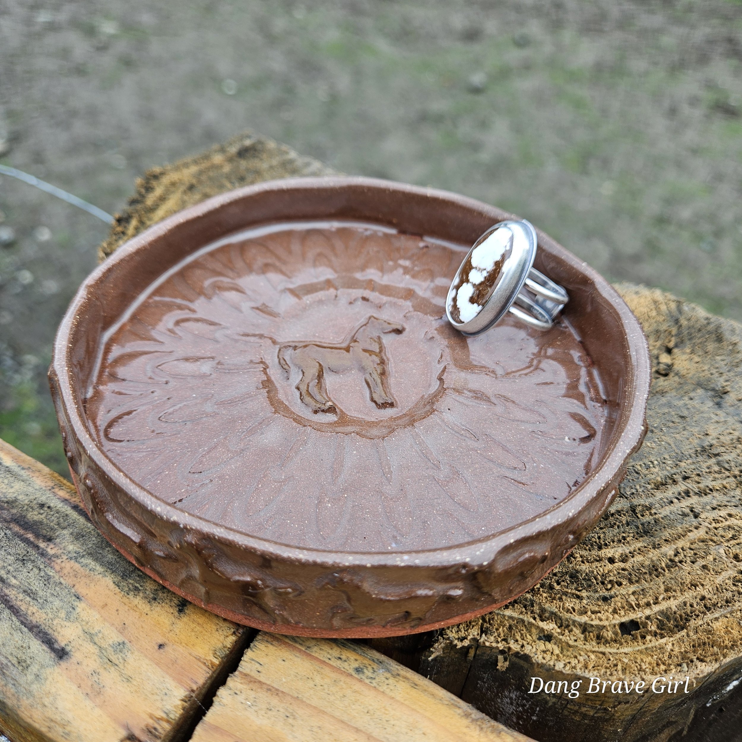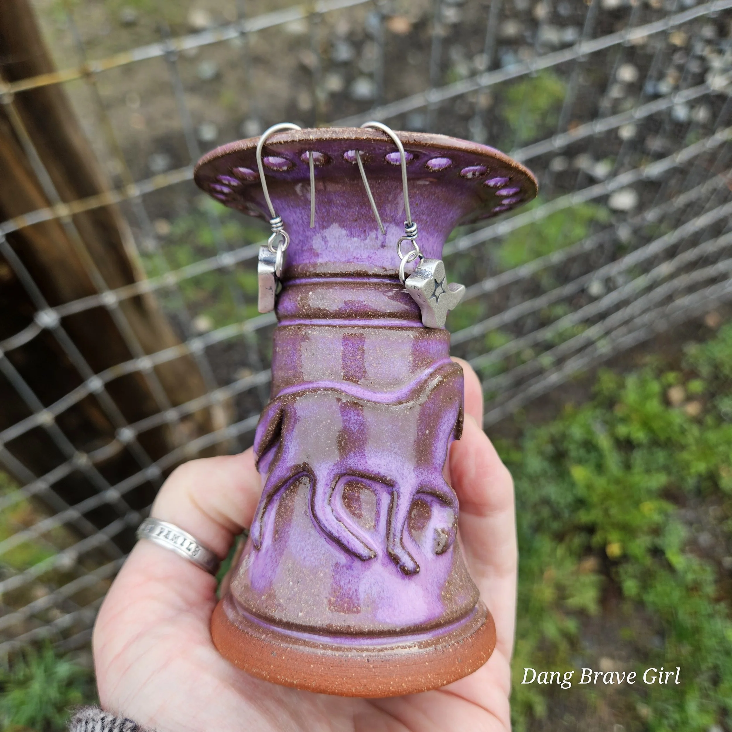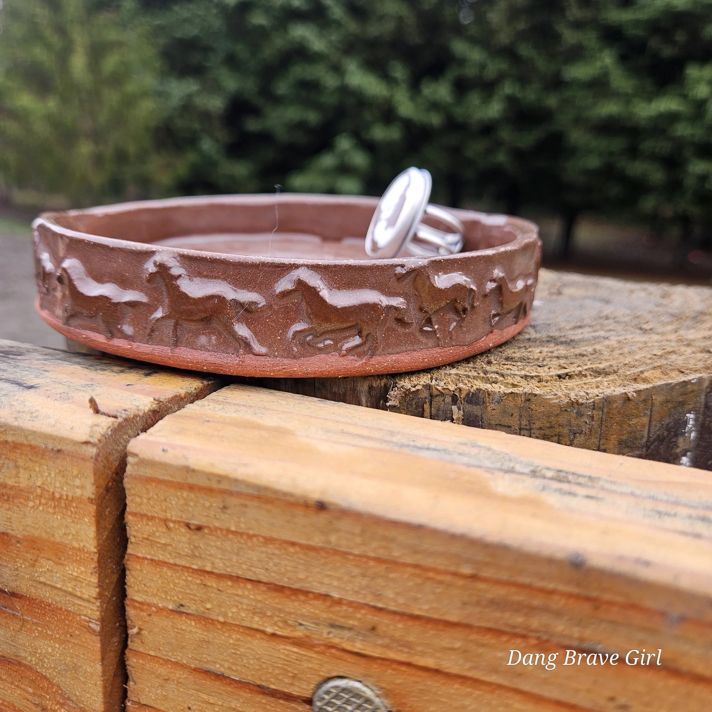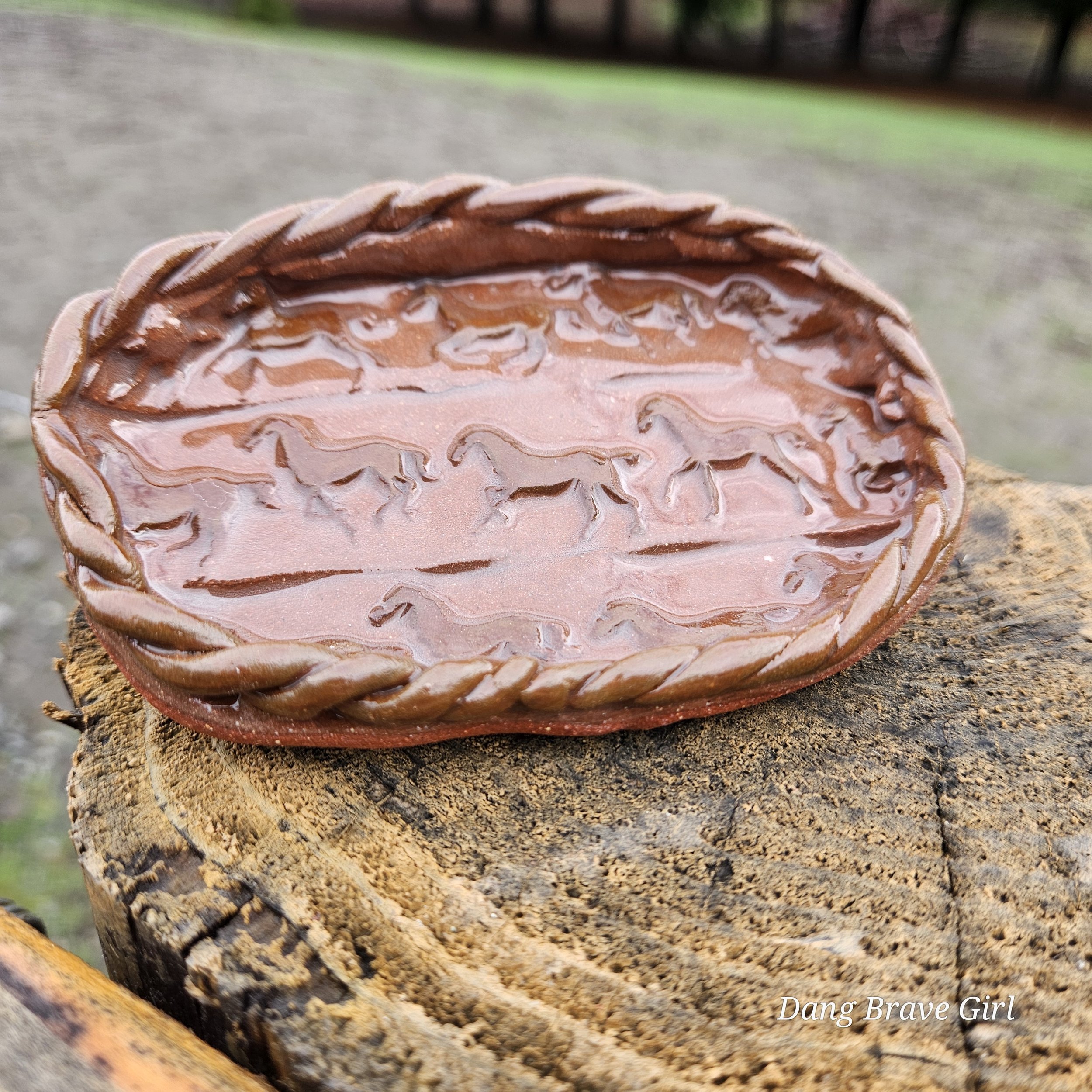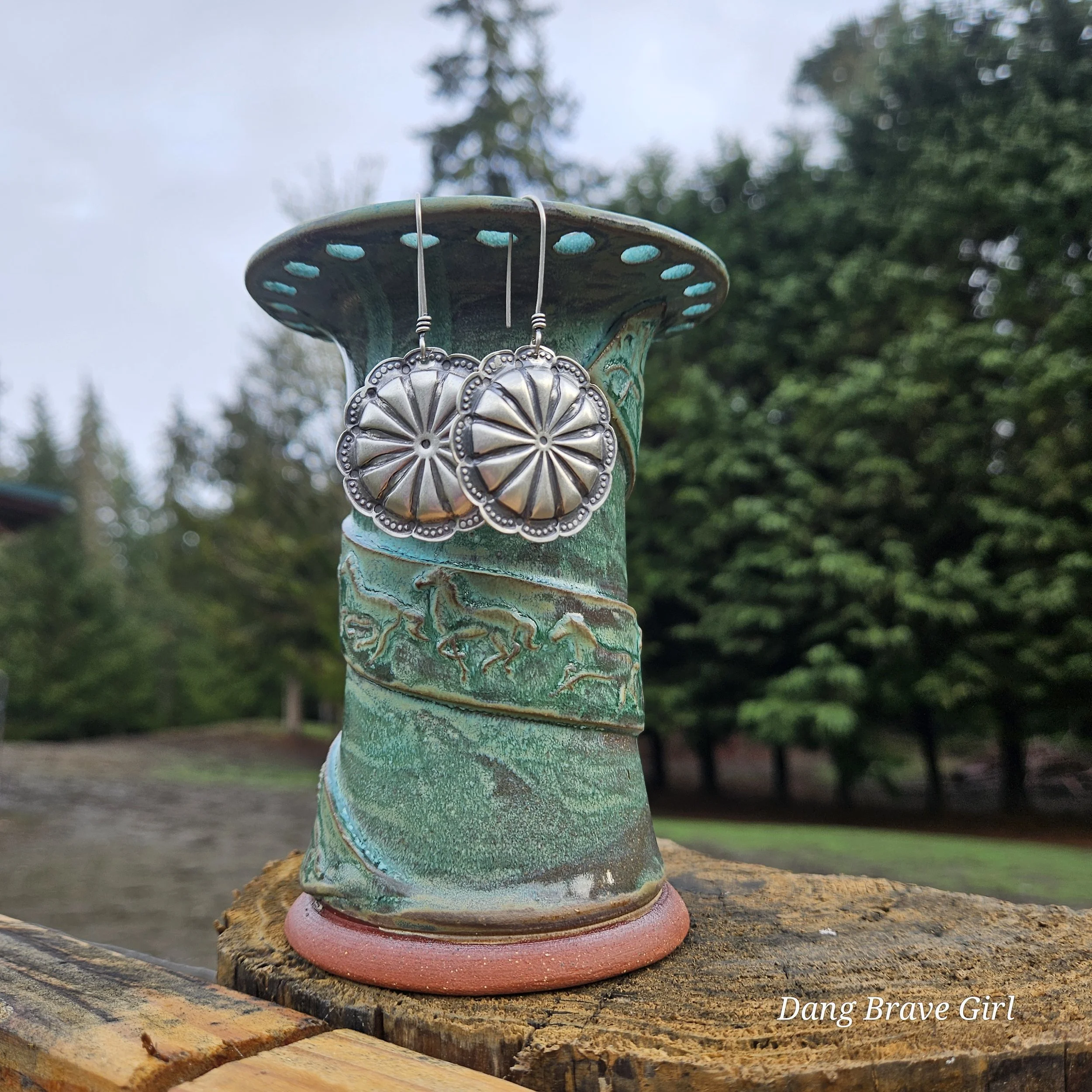 Handmade by the DBH with Oregon Red clay, this earring holder is wrapped and layered with wild horses off for a trail ride or round up. The Weathered Bronze glaze is out of this world cool.