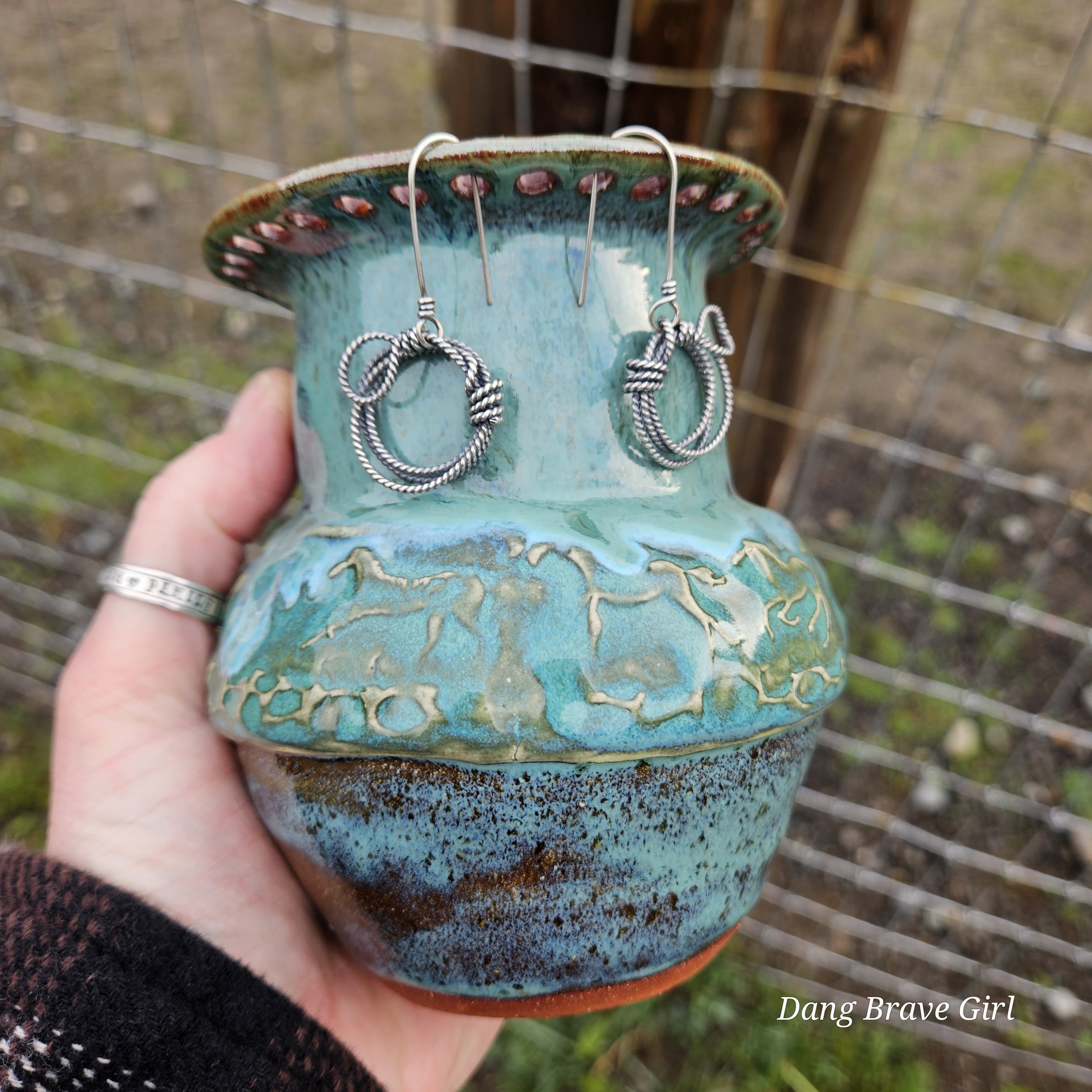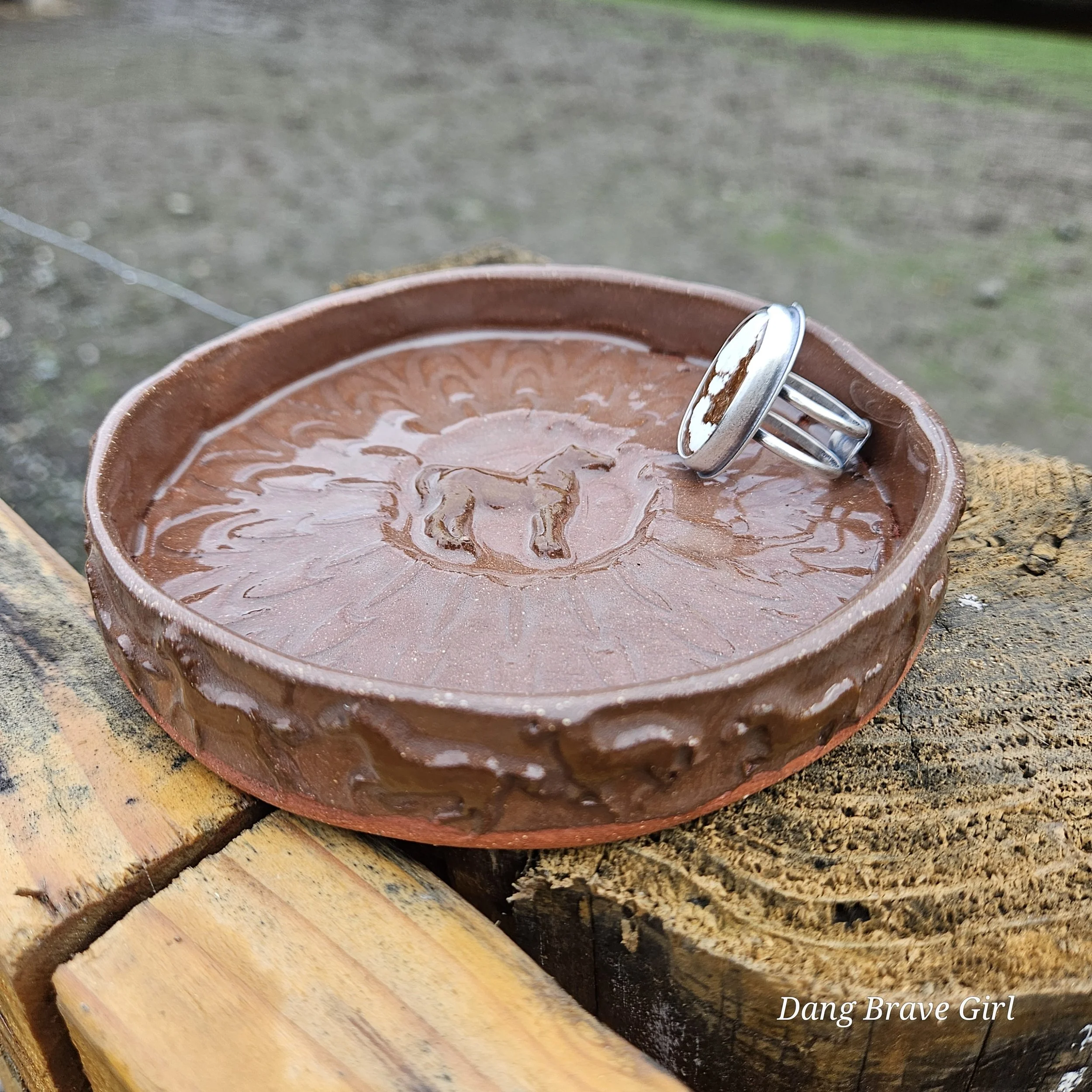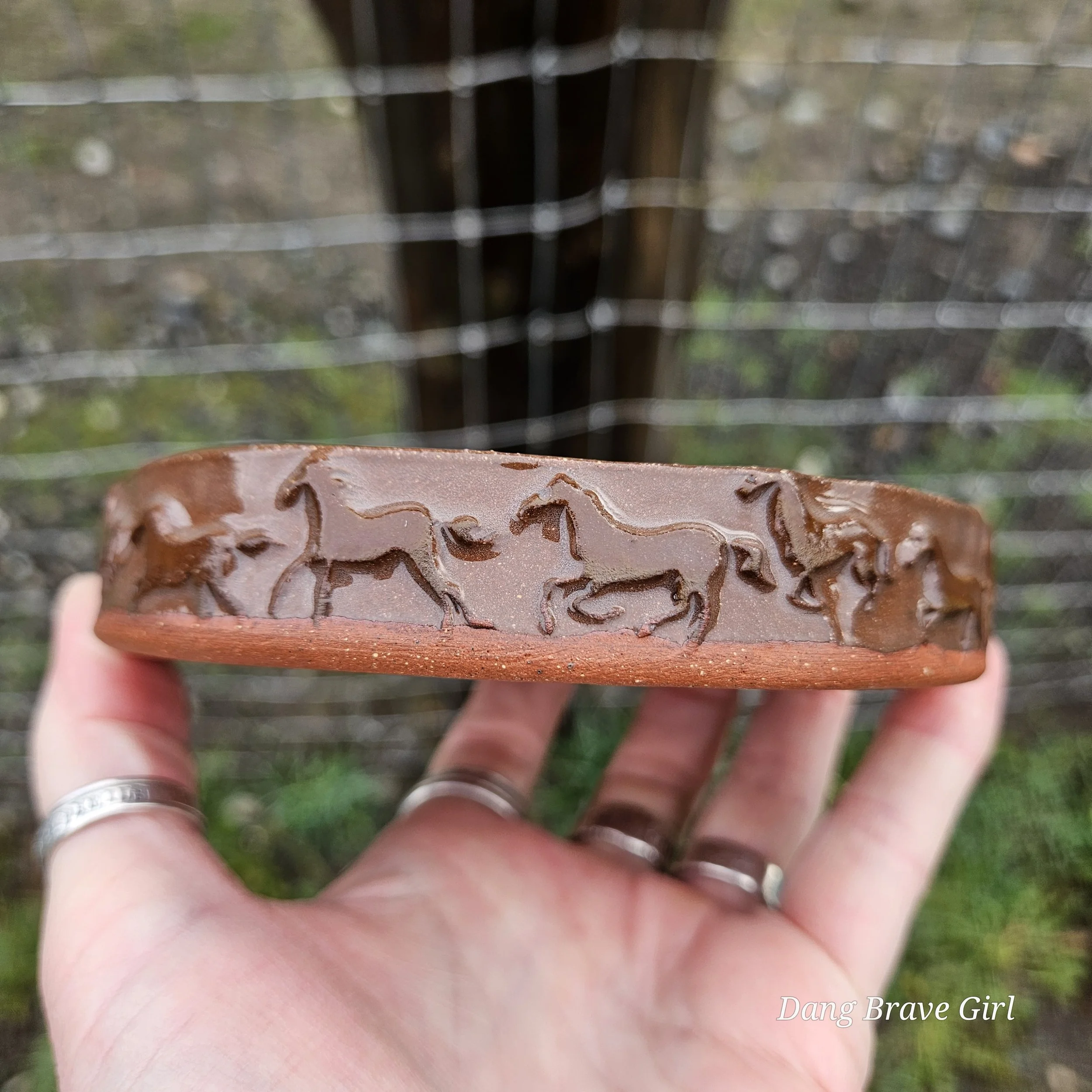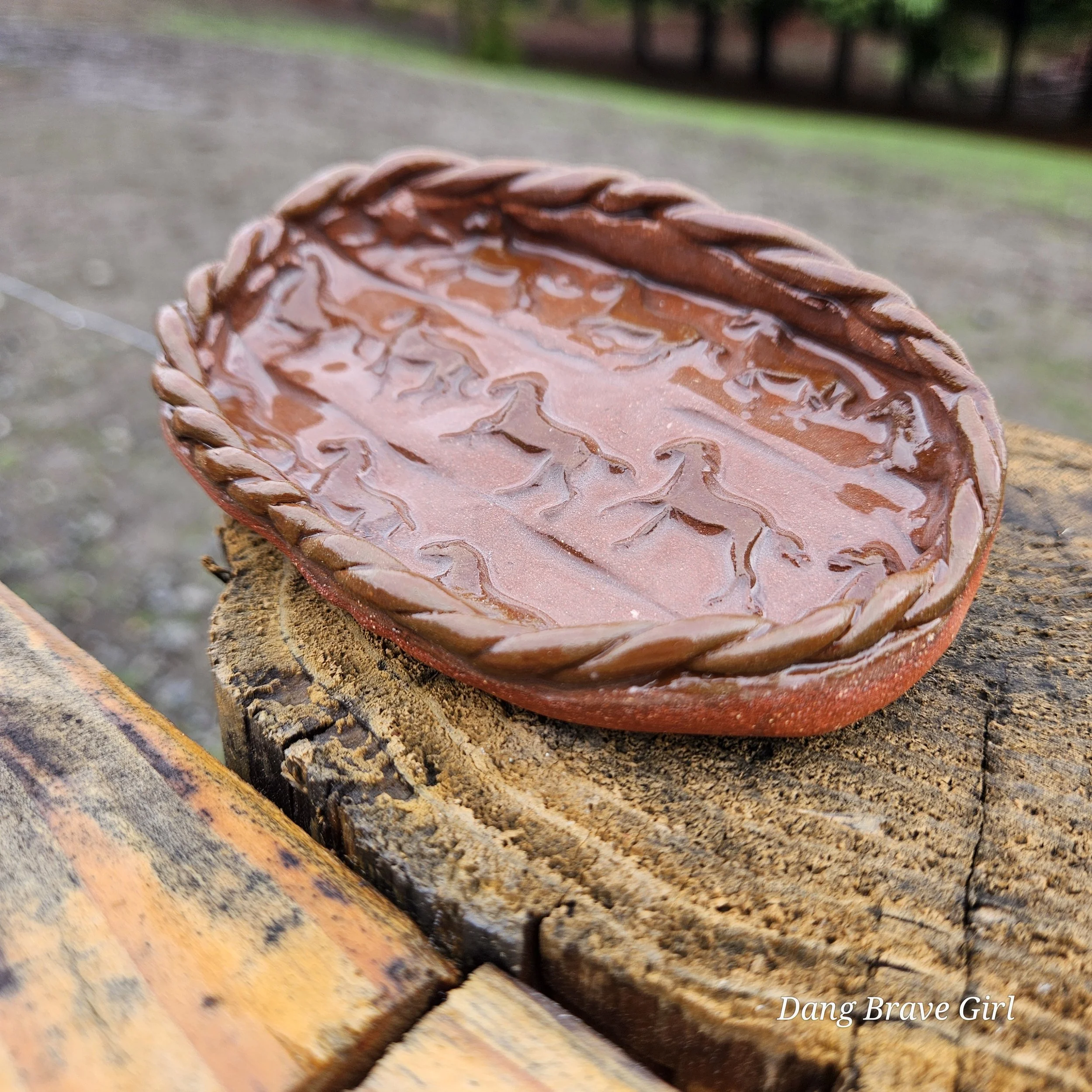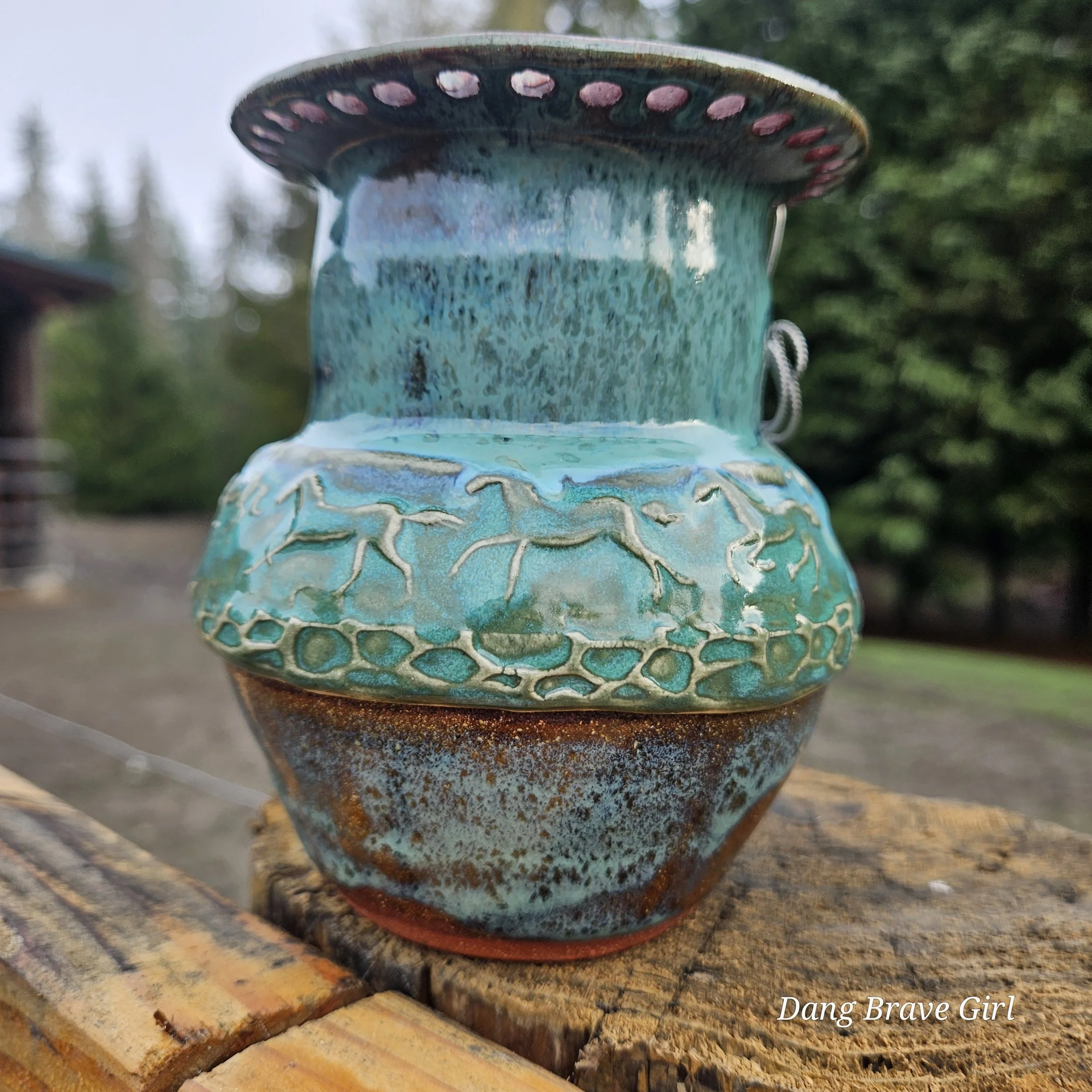 Handmade by the DBH with Oregon Red clay, this earring holder is wrapped and layered with wild horses off for a trail ride or round up. The Weathered Bronze glaze is out of this world cool.