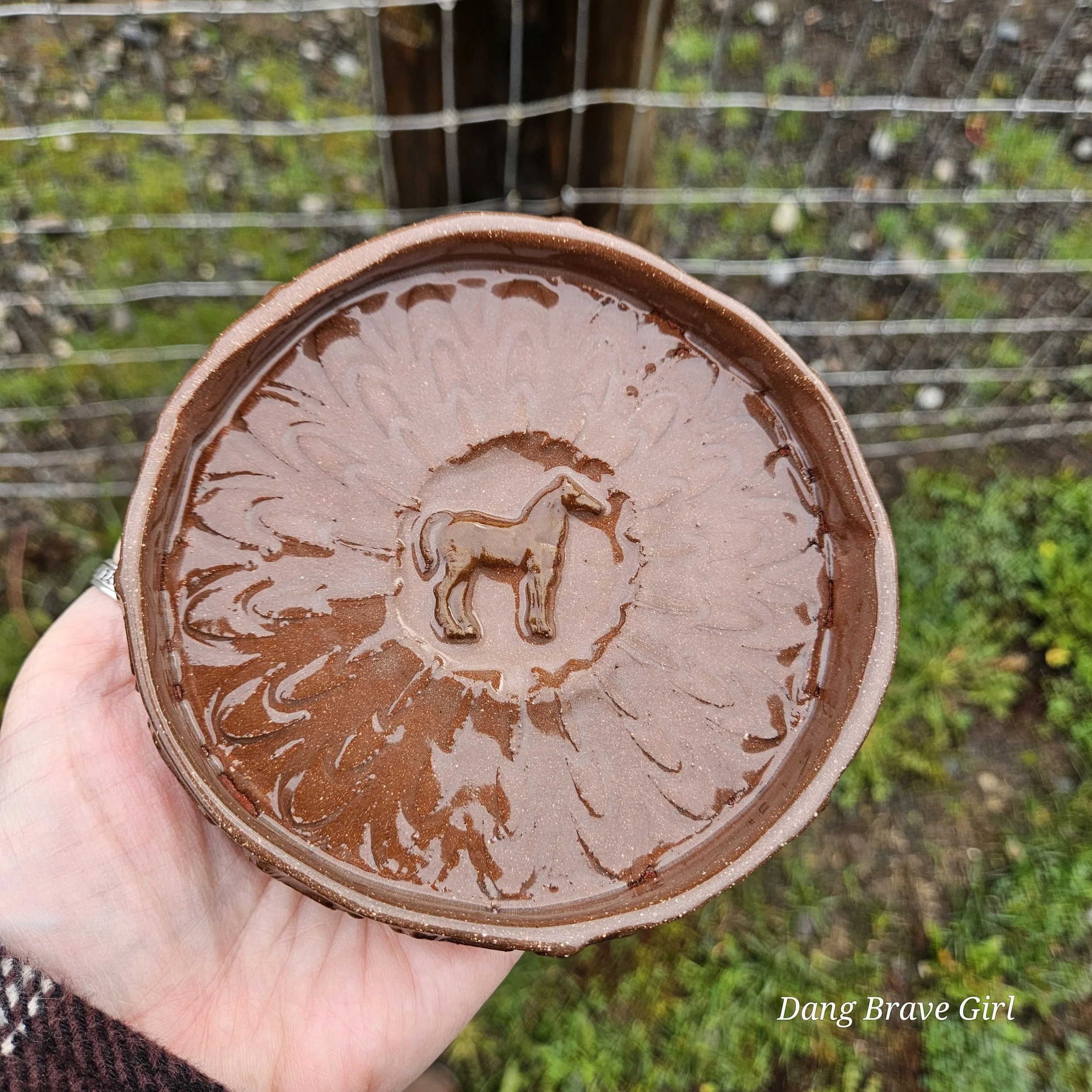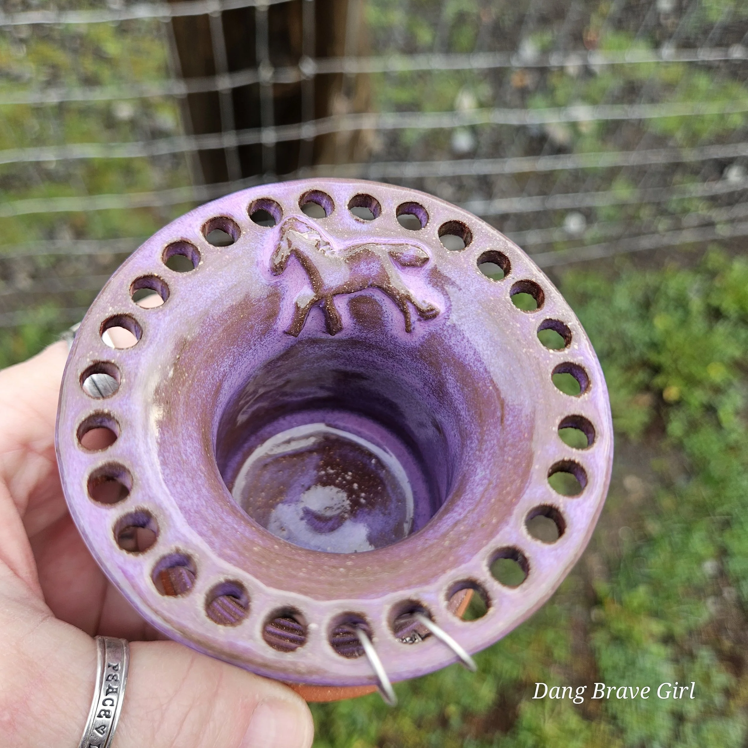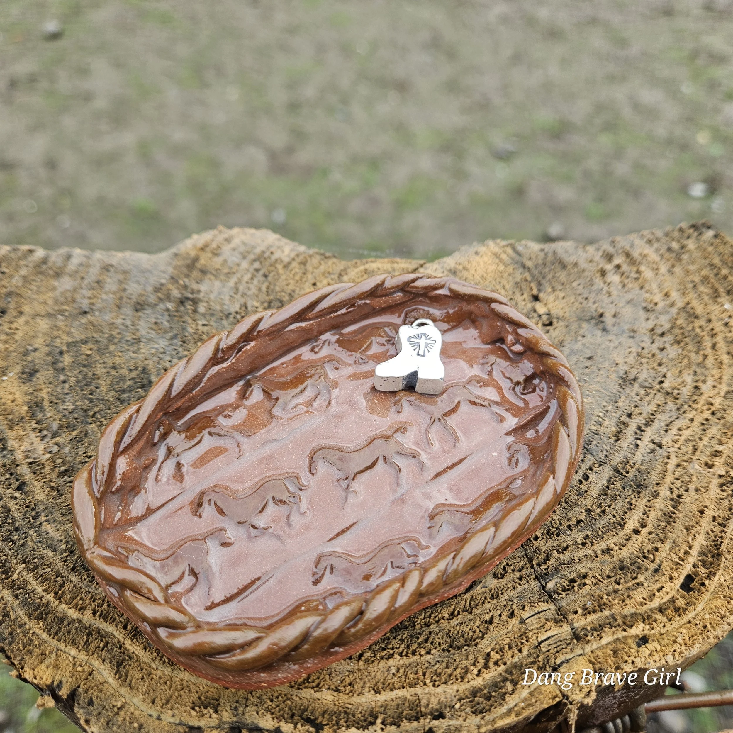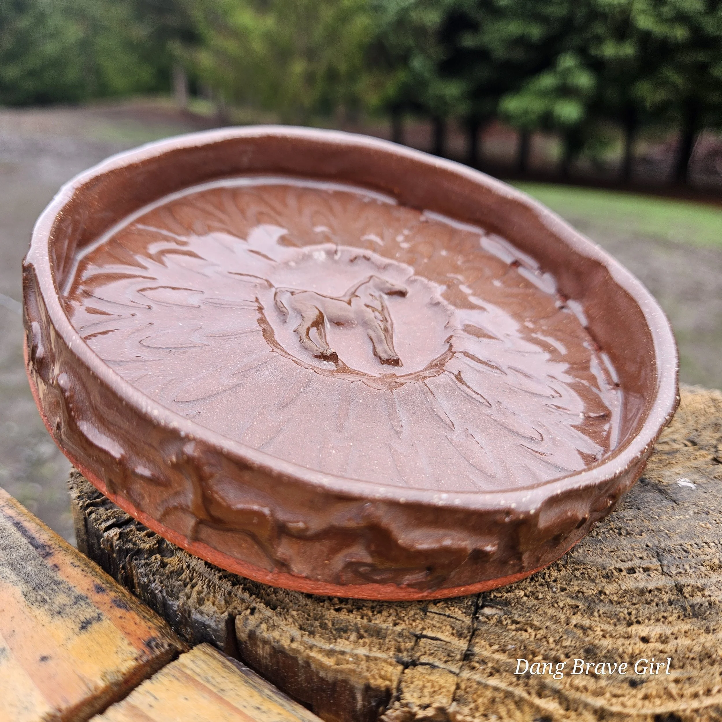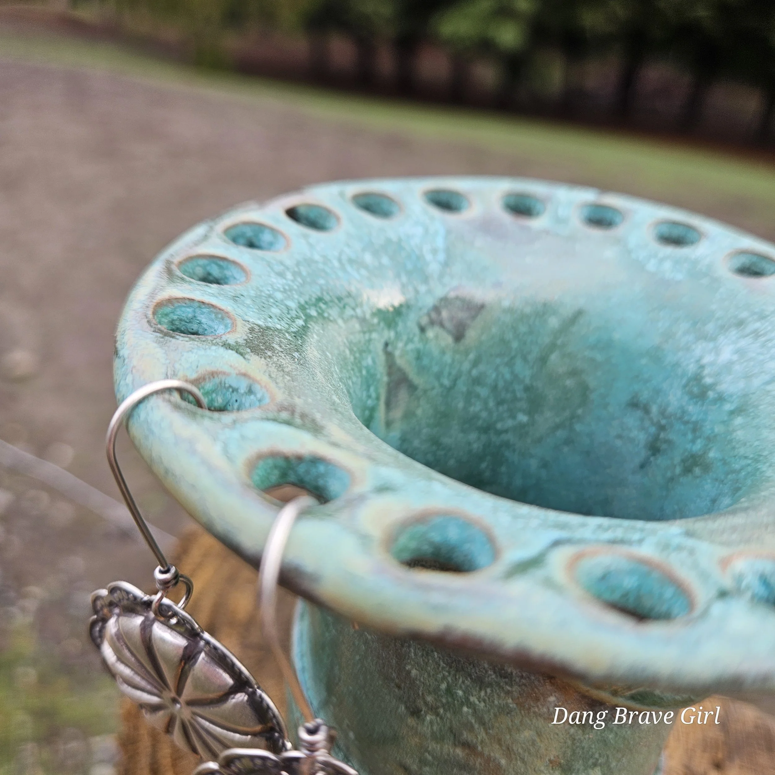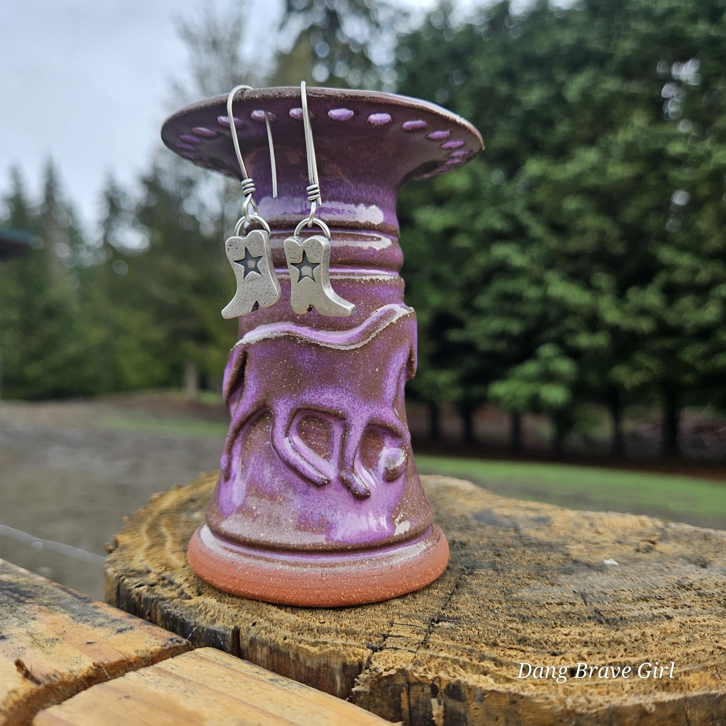 Handmade by the DBH with Oregon Red clay, this earring holder is wrapped and layered with wild horses off for a trail ride or round up. The Weathered Bronze glaze is out of this world cool.