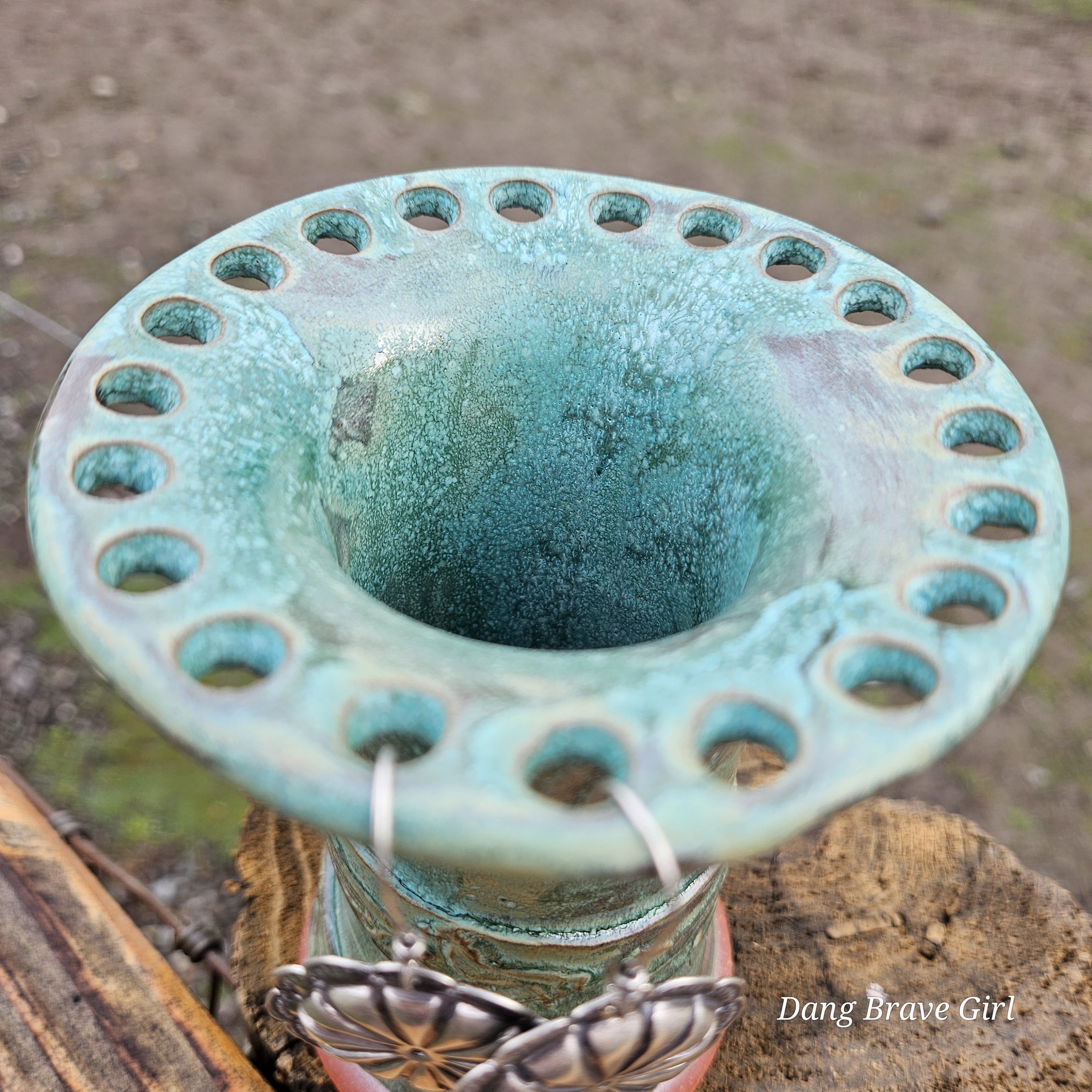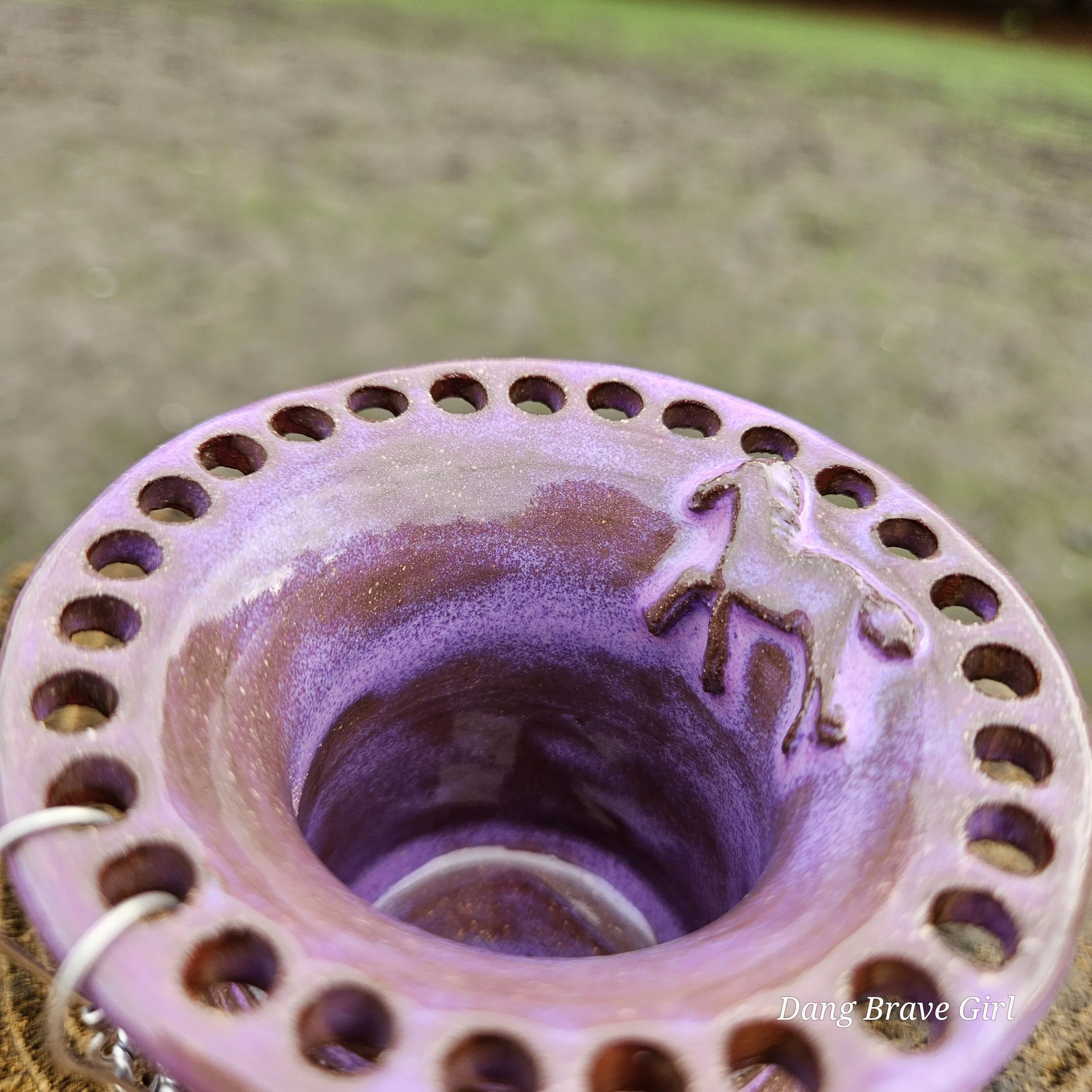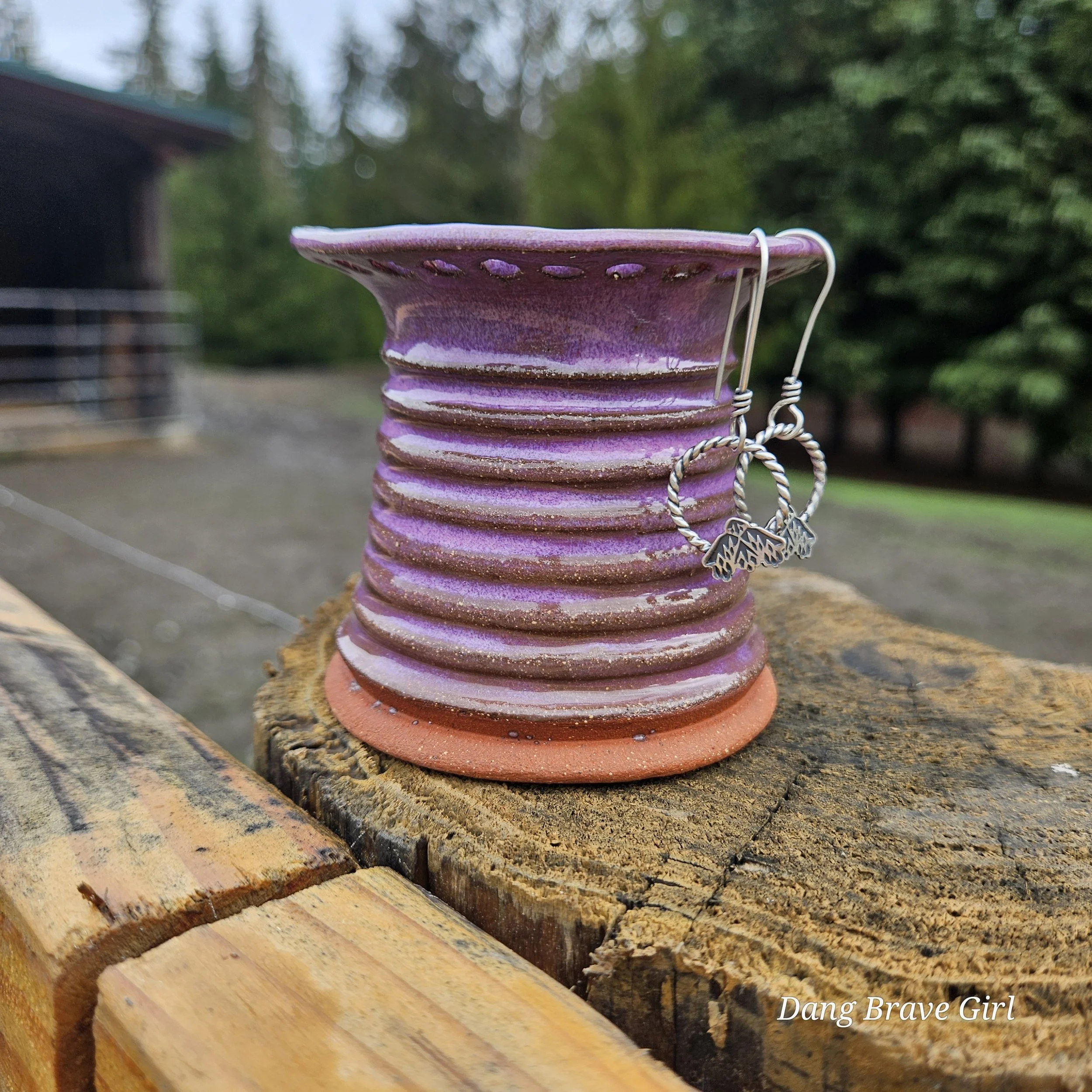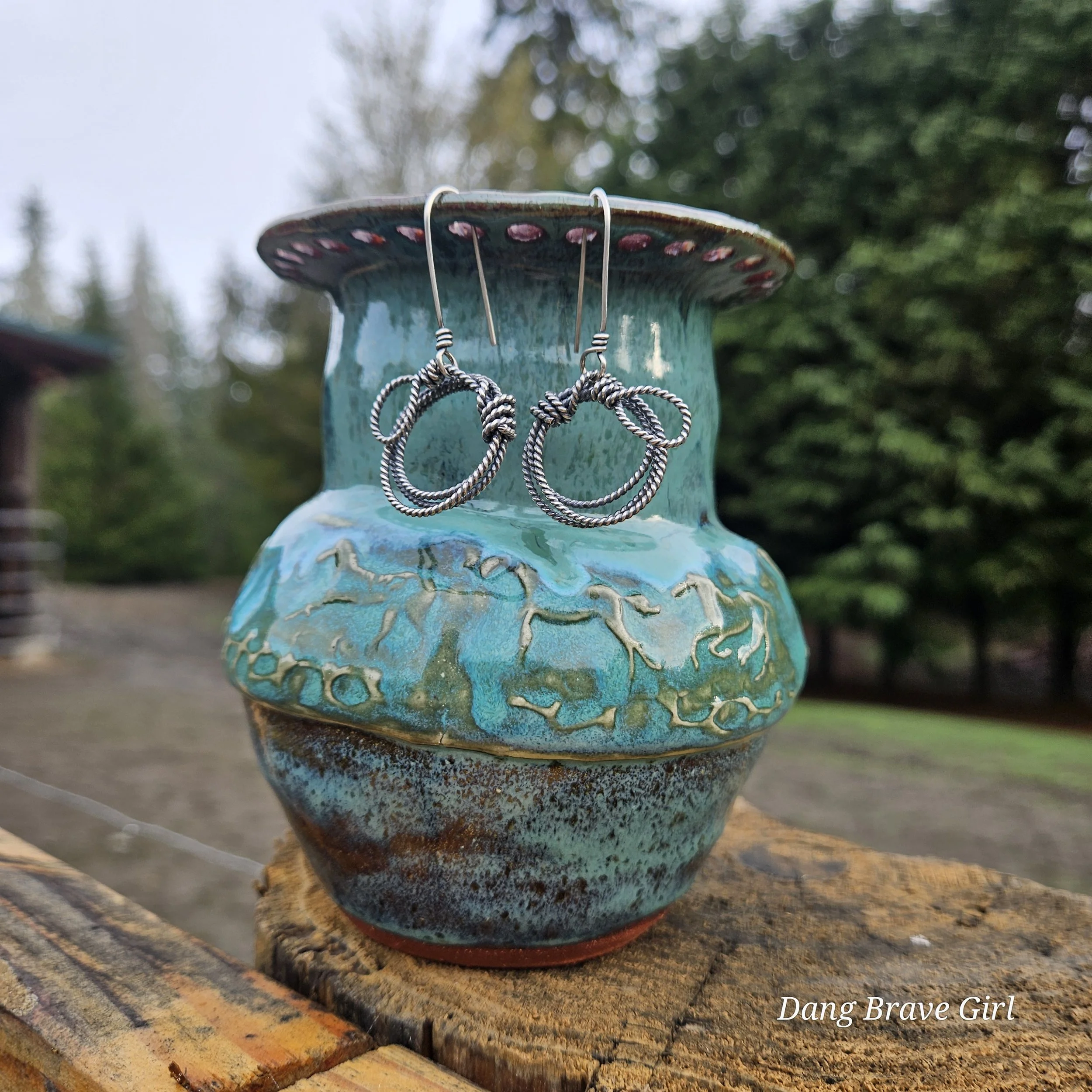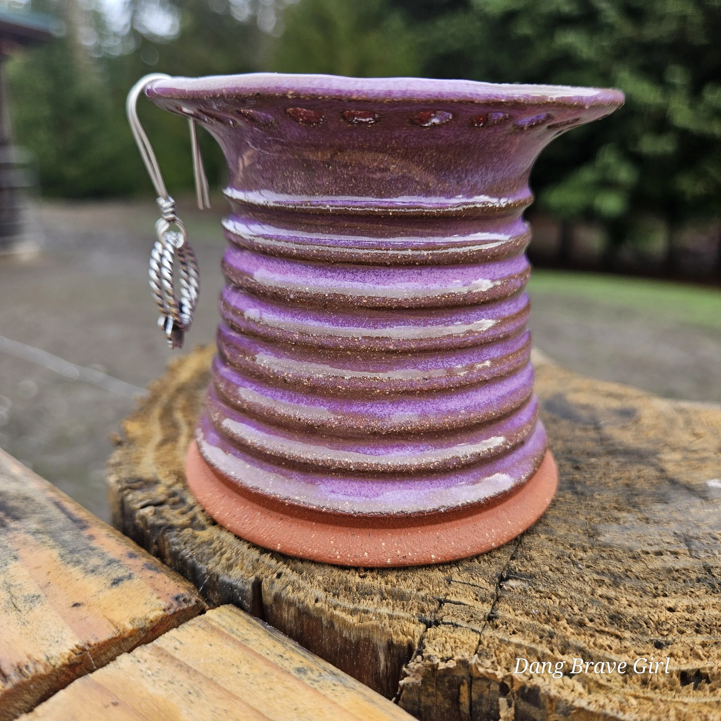 Handmade by the DBH with Oregon Red clay, this earring holder is wrapped and layered with wild horses off for a trail ride or round up. The Weathered Bronze glaze is out of this world cool.