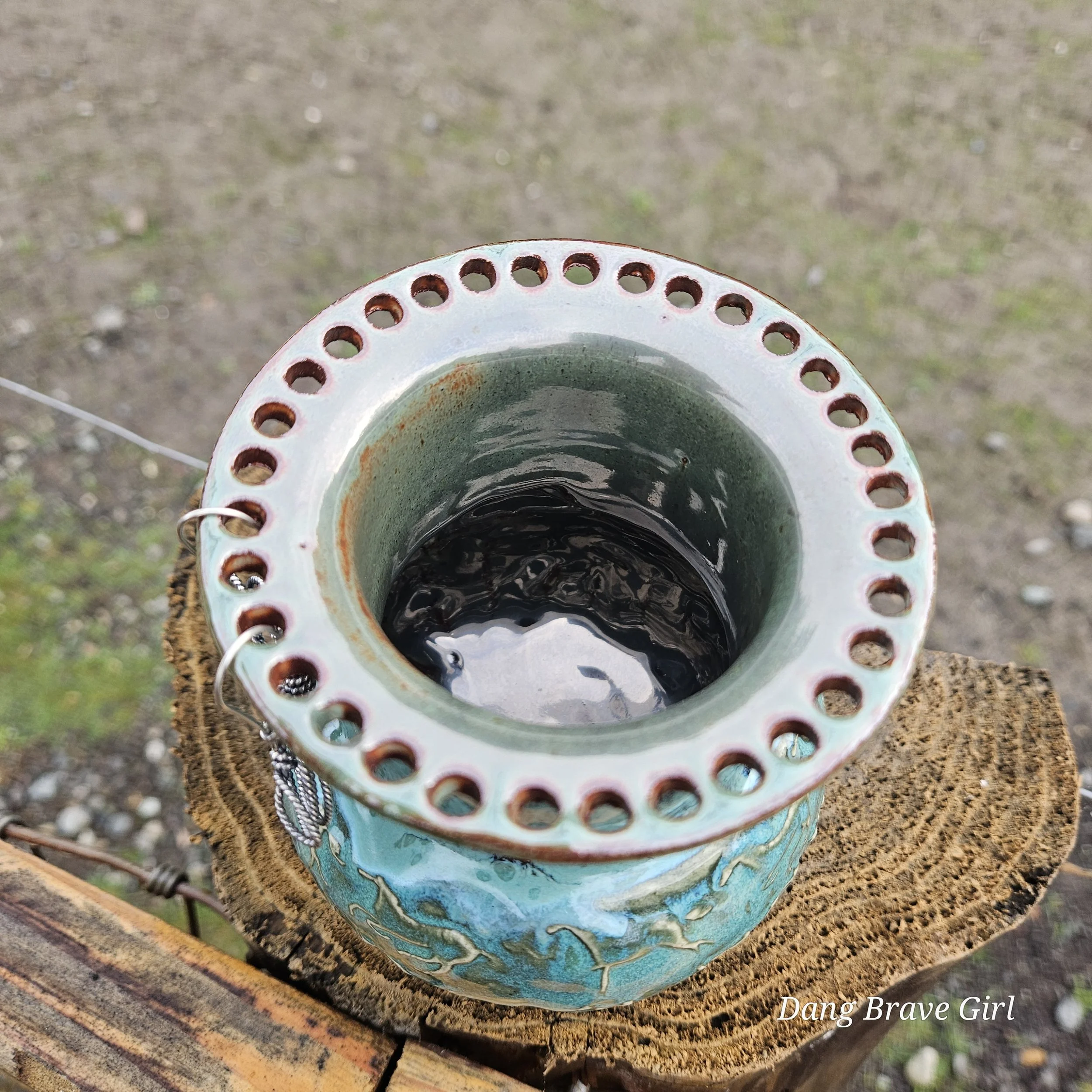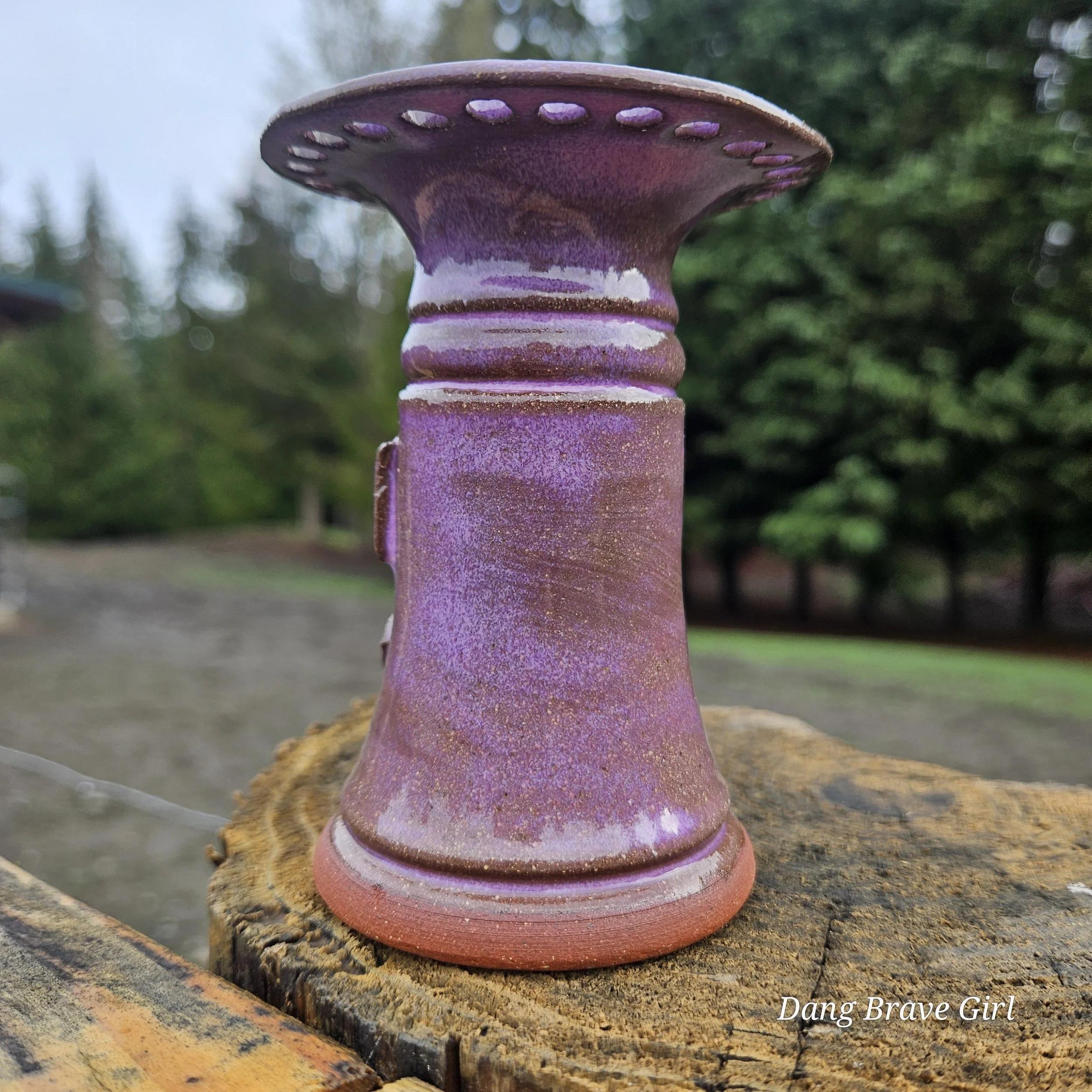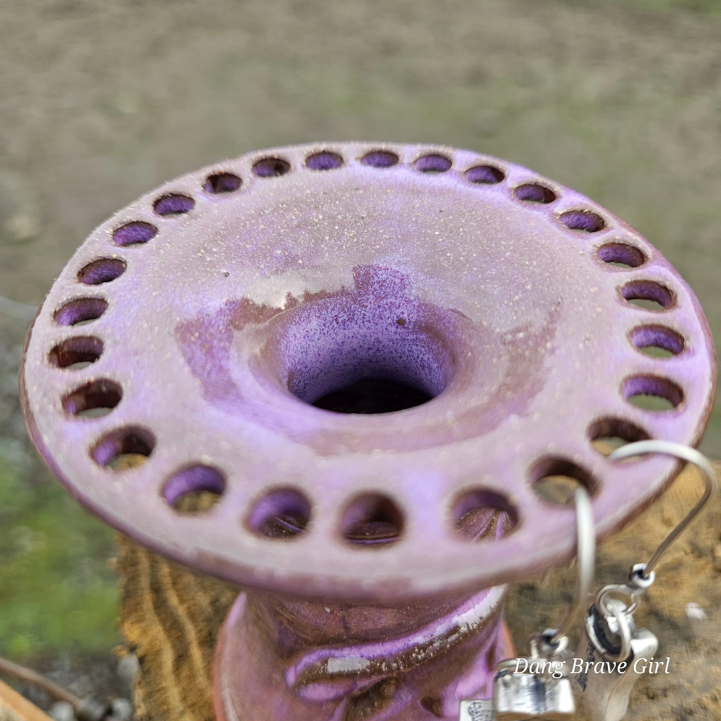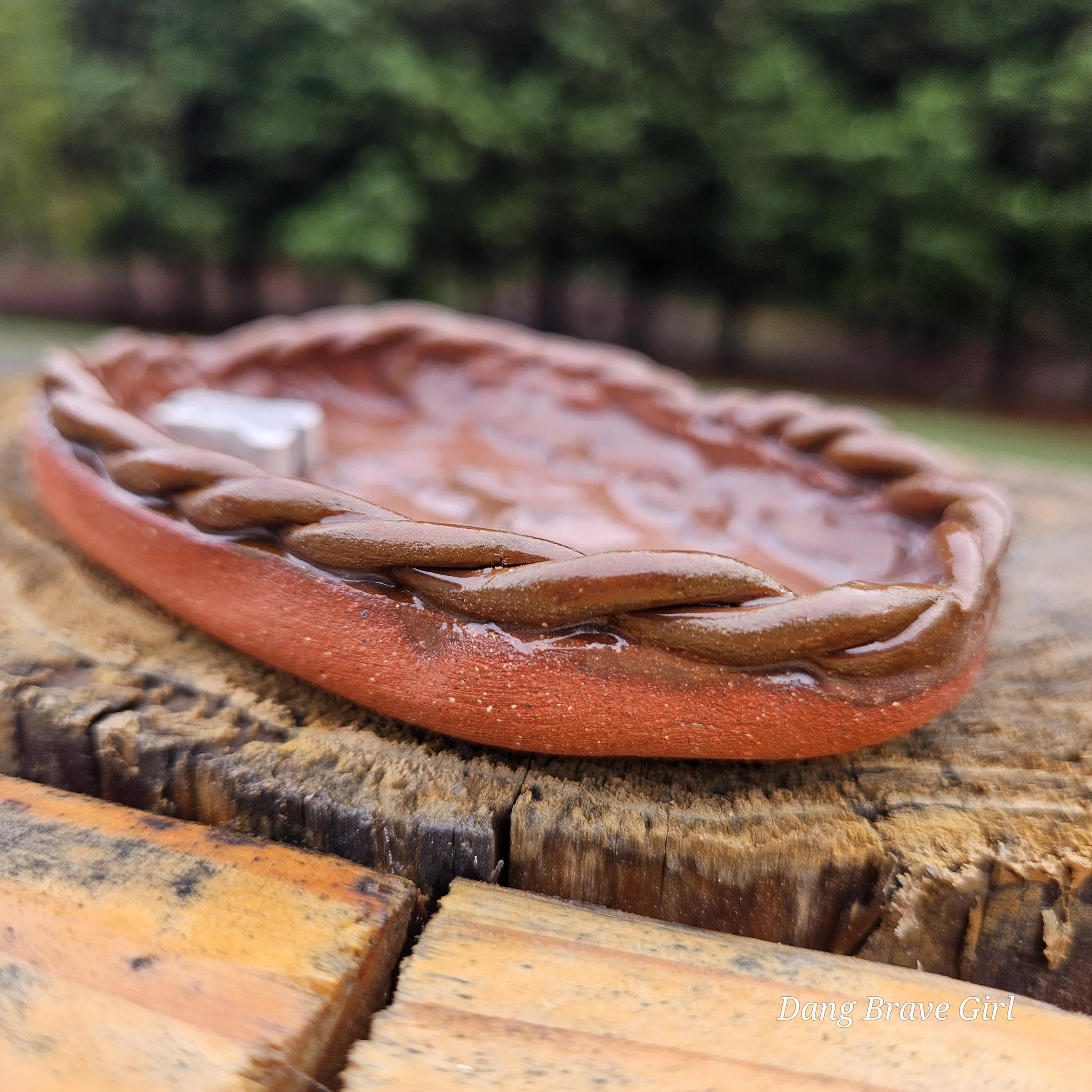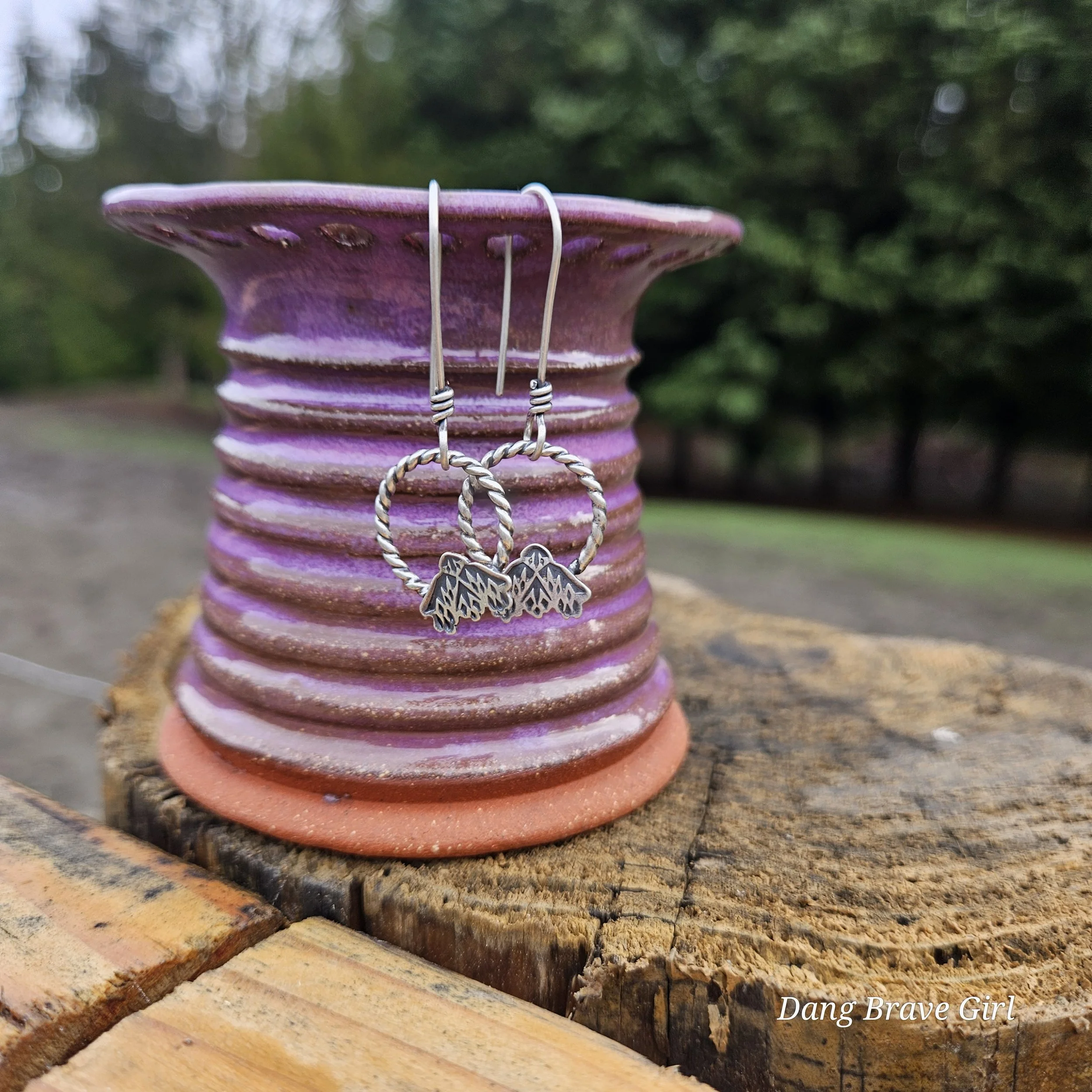 Handmade by the DBH with Oregon Red clay, this earring holder is wrapped and layered with wild horses off for a trail ride or round up. The Weathered Bronze glaze is out of this world cool.