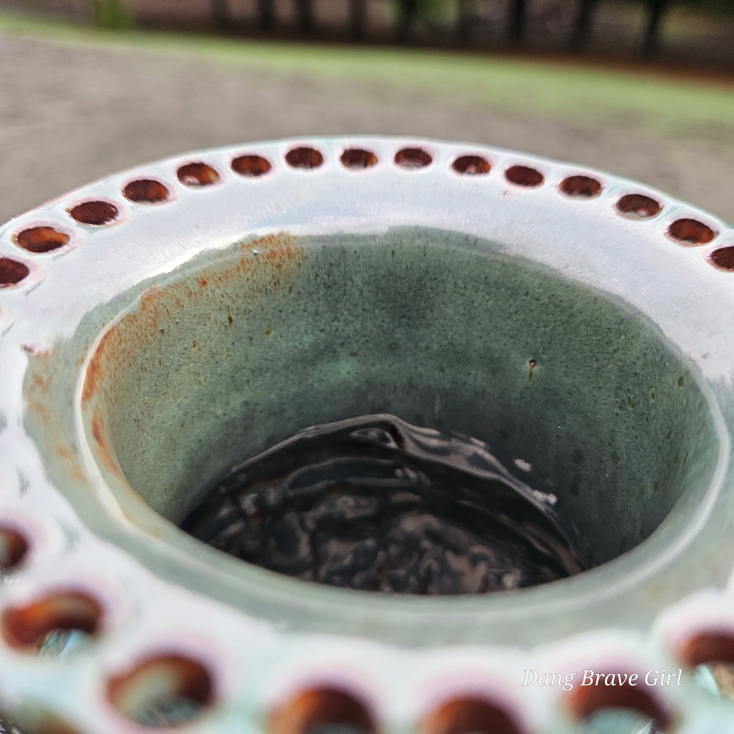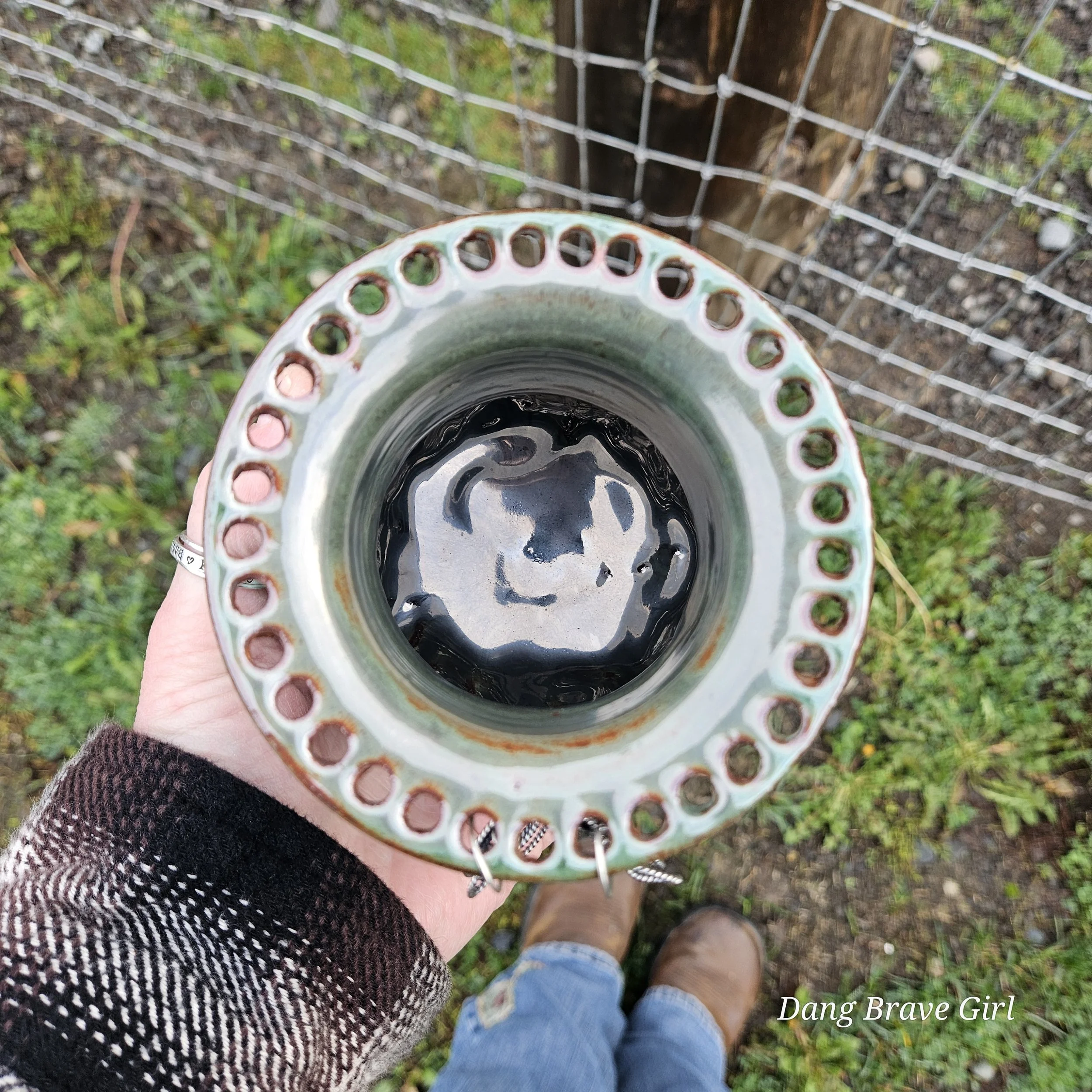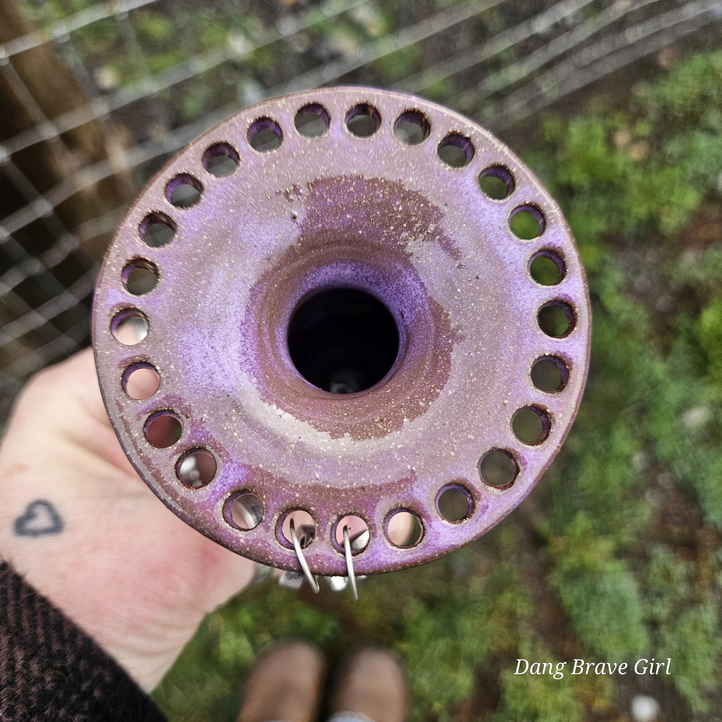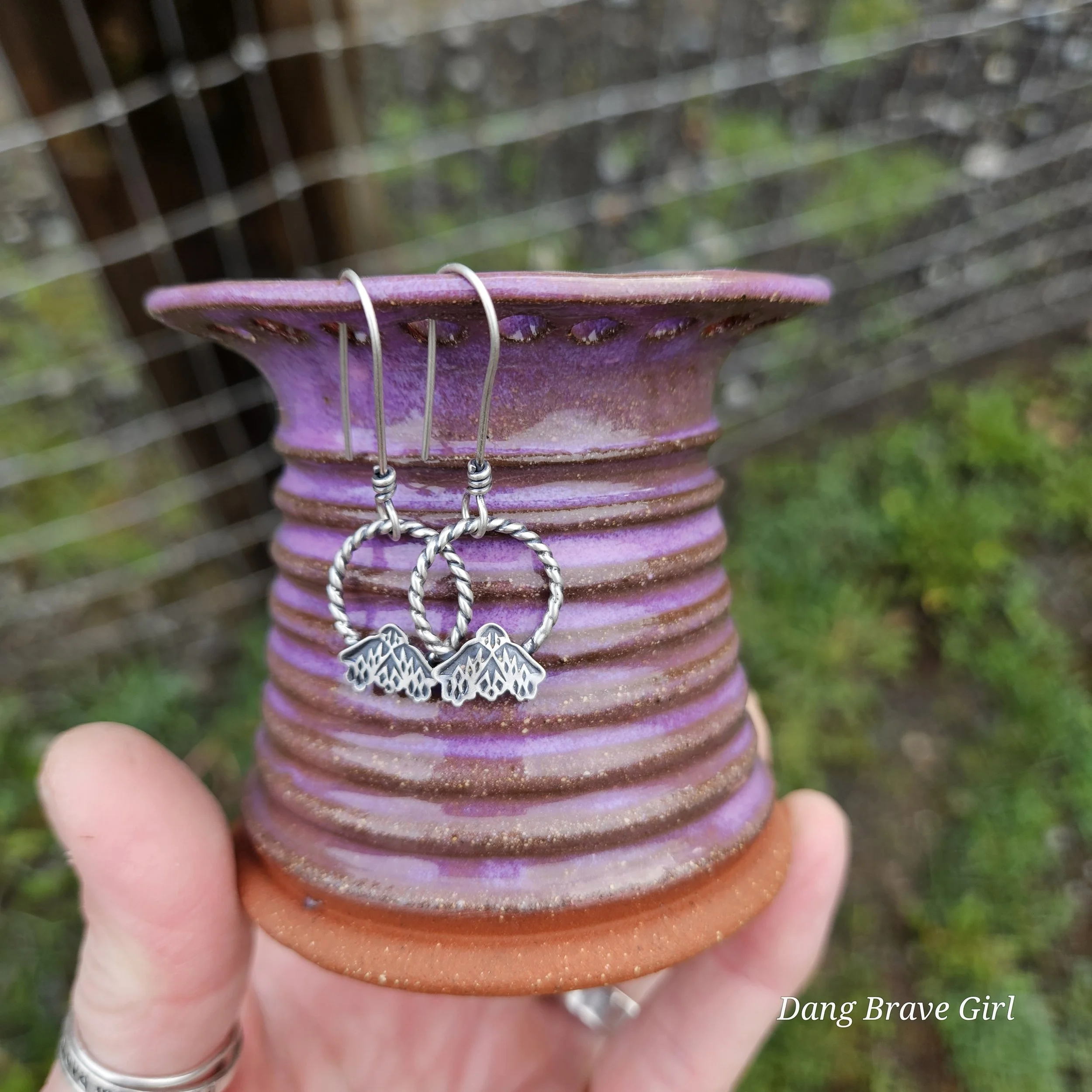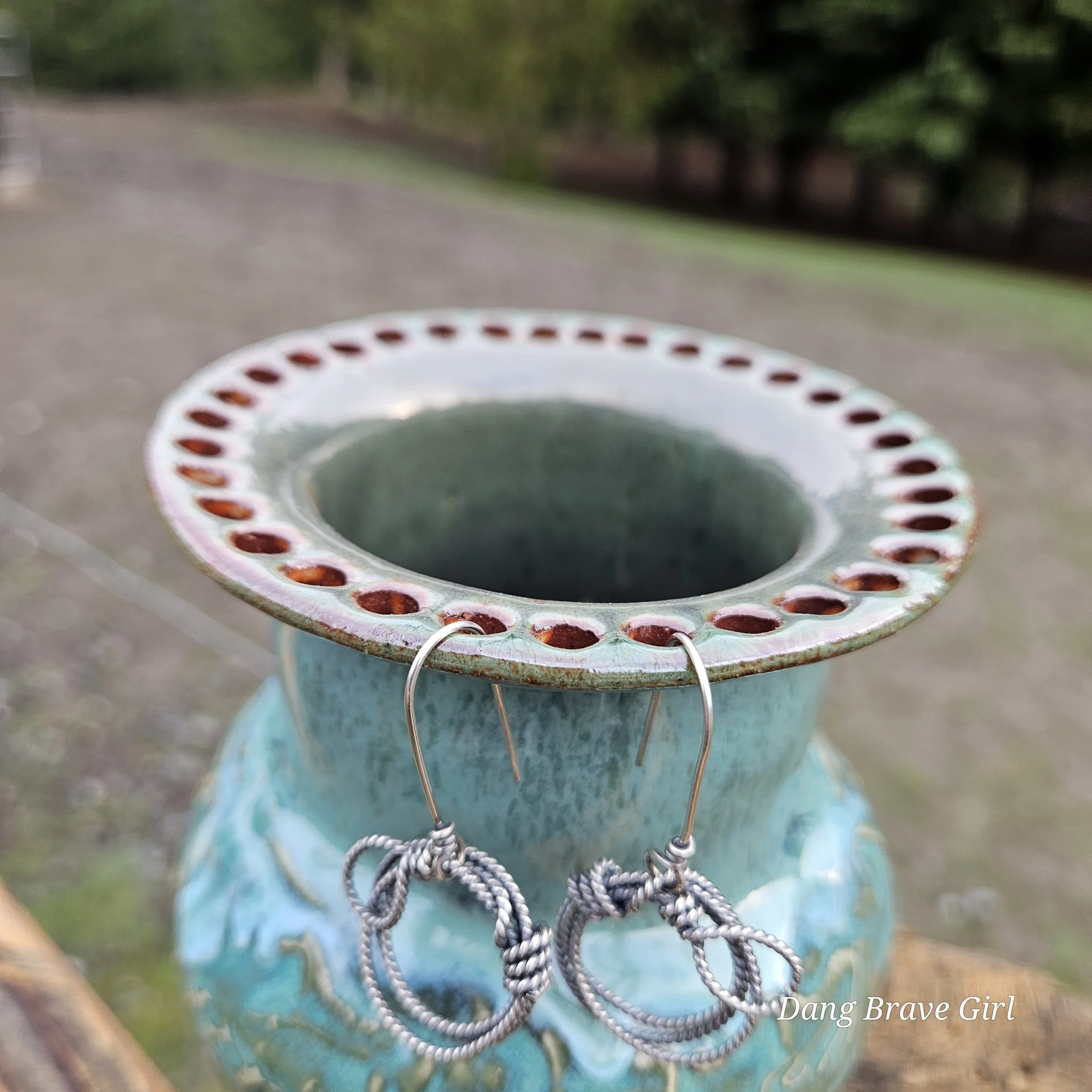 Handmade by the DBH with Oregon Red clay, this earring holder is wrapped and layered with wild horses off for a trail ride or round up. The Weathered Bronze glaze is out of this world cool.