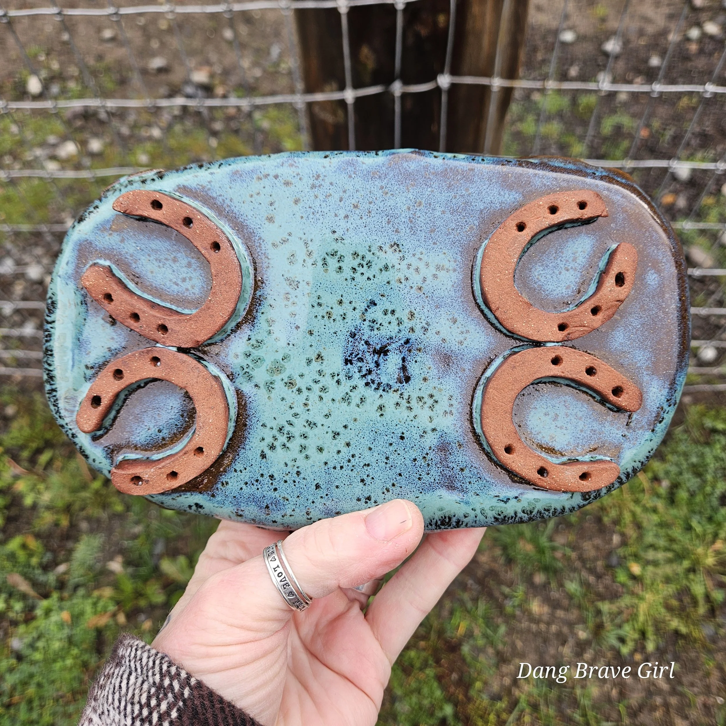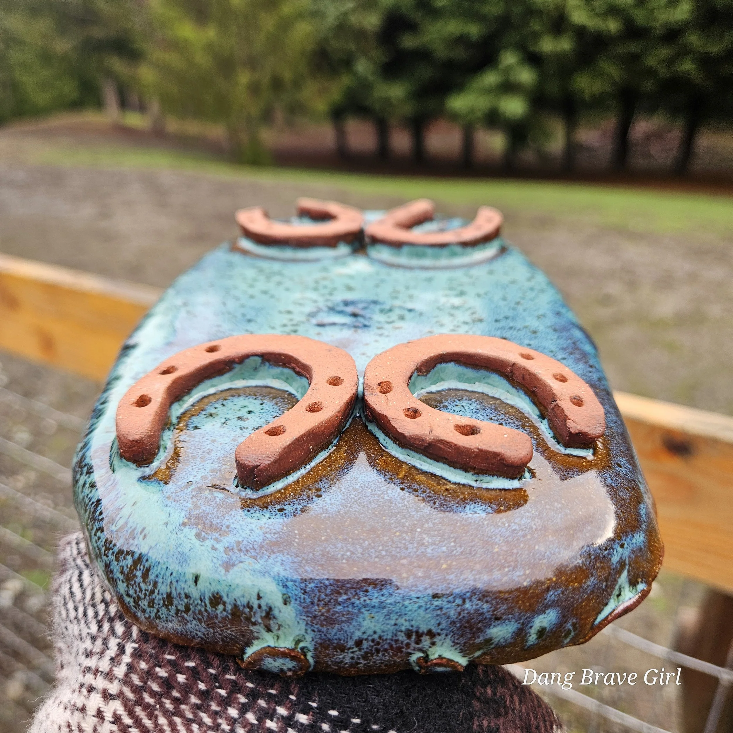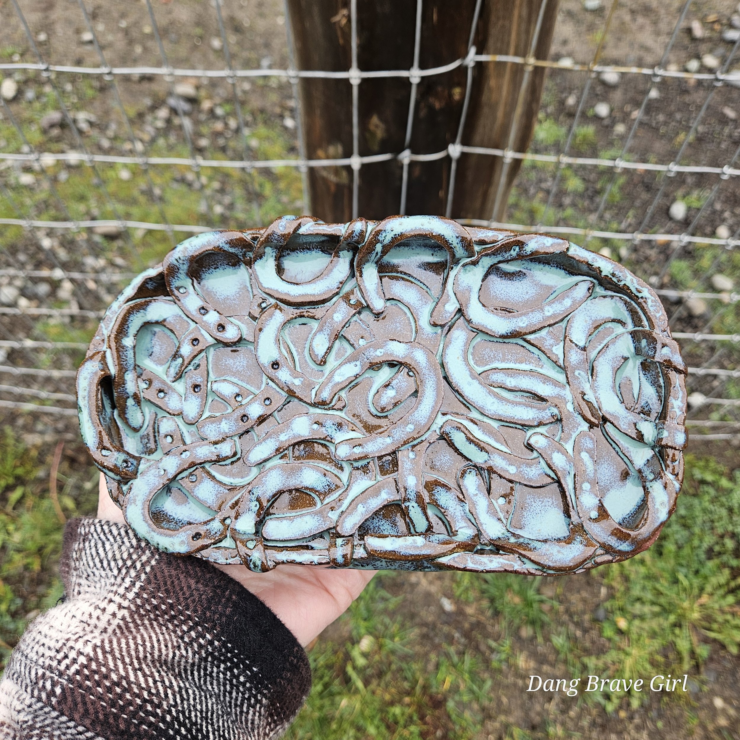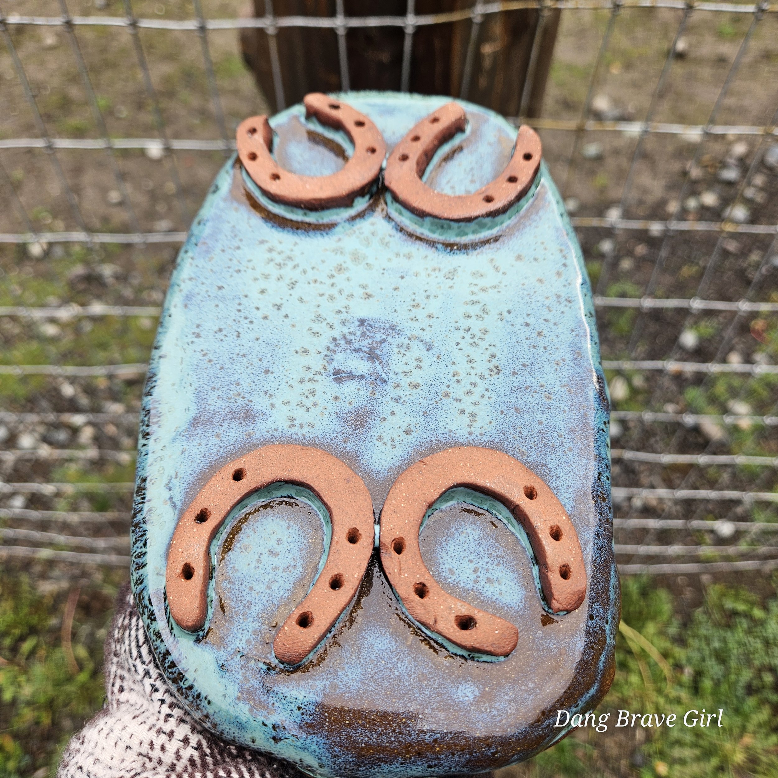 Handmade by the DBH, this Oregon Red clay tray is FILLED with horseshoes! I think there are 22 layered in there but you better count for yourself! It even has 4 horseshoe feet on the bottom…how cool is that. It is finished with Floating Blue glaze.