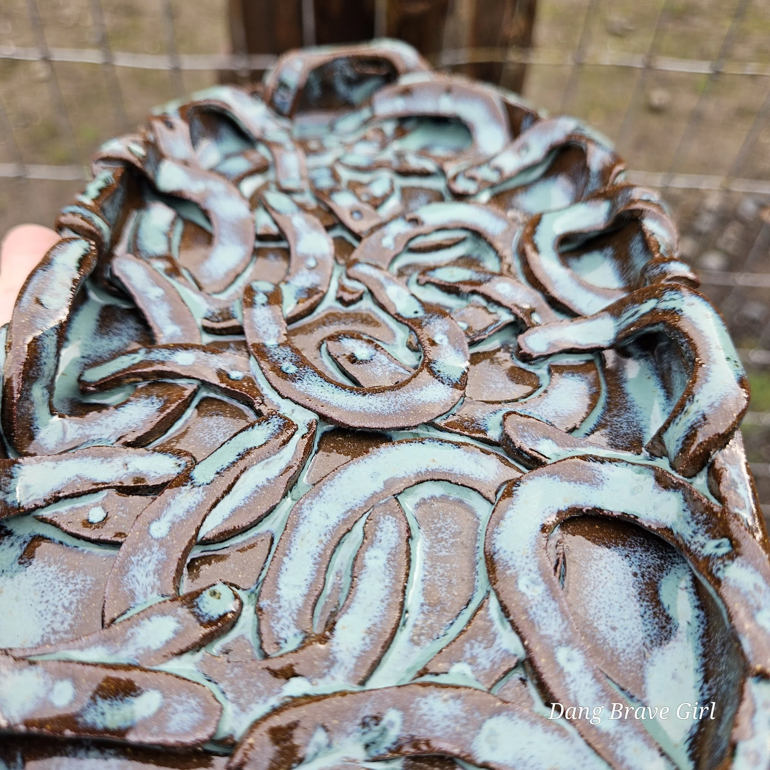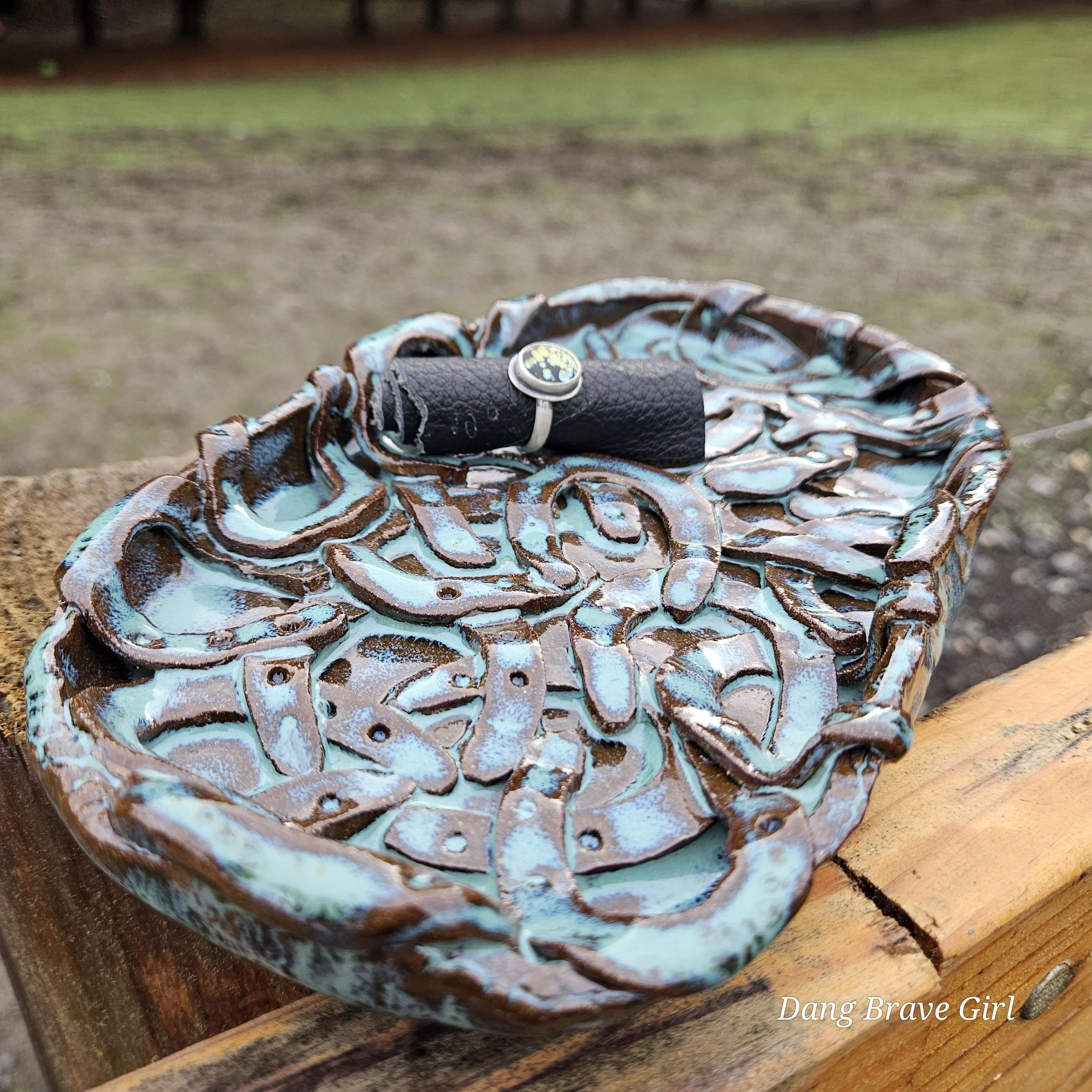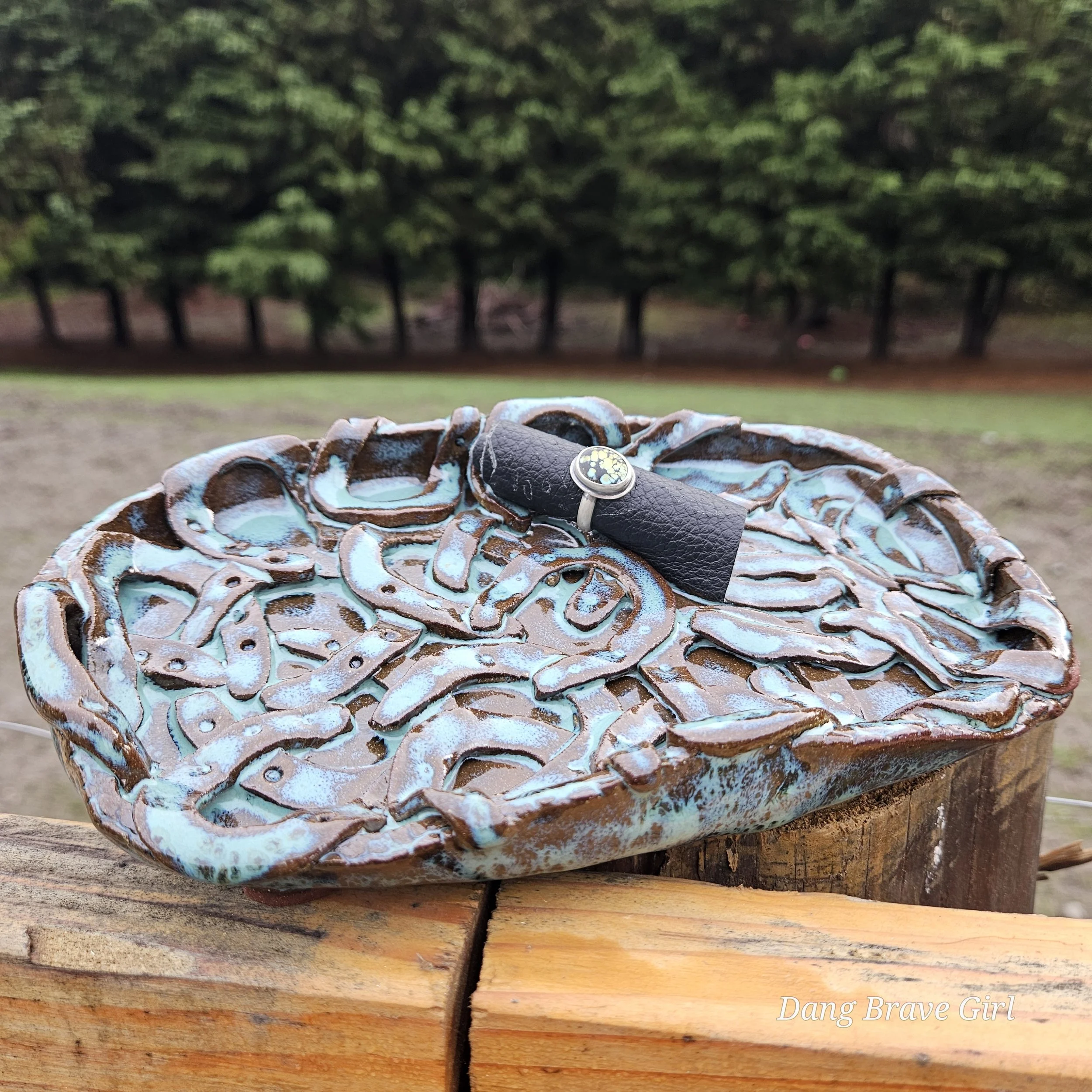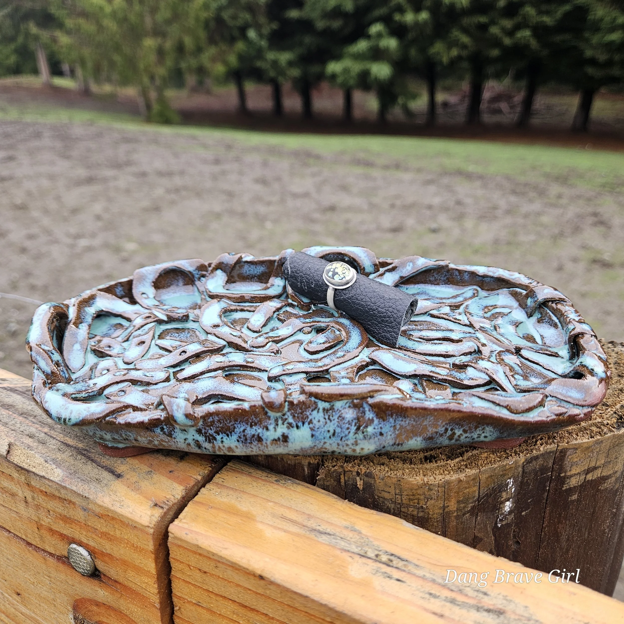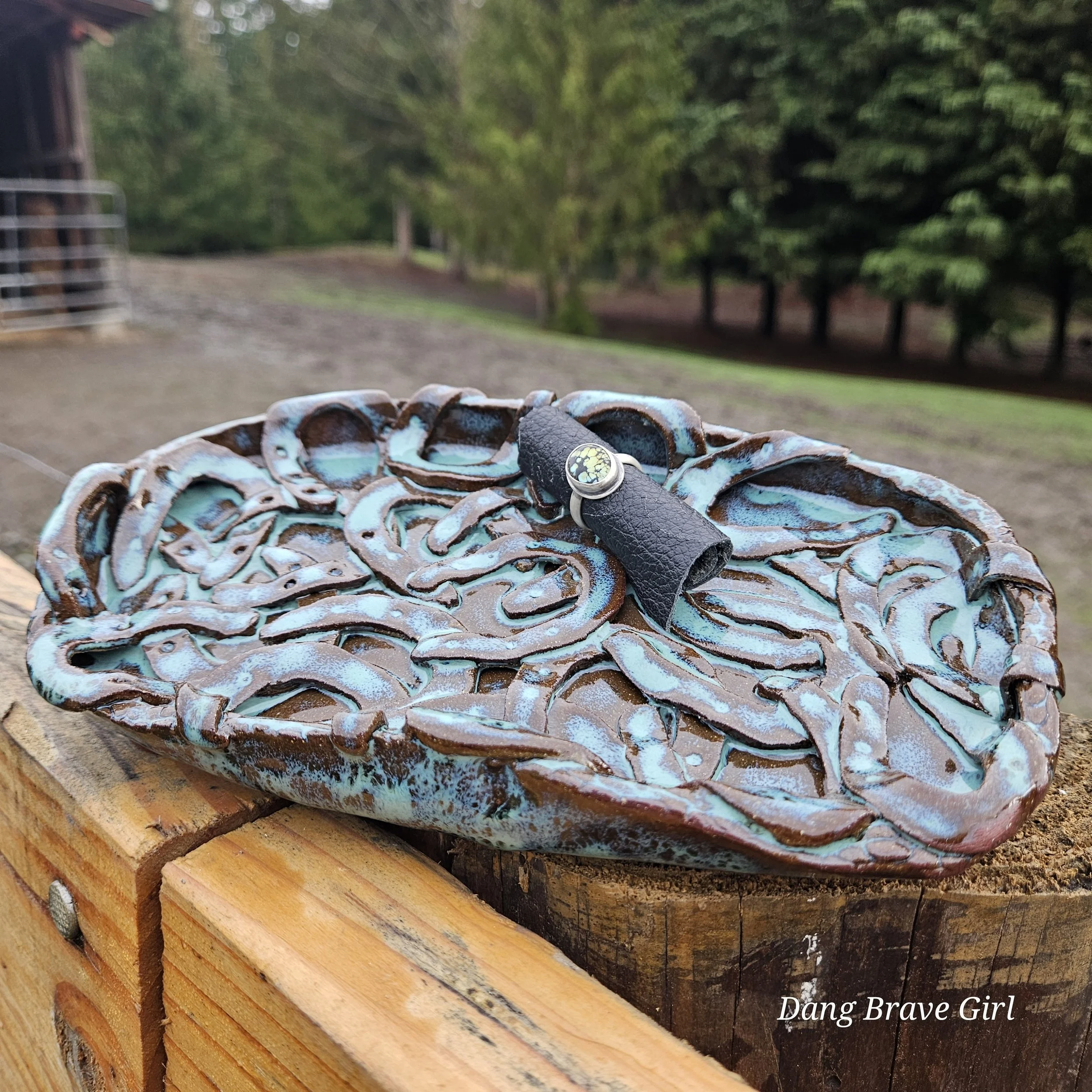 Handmade by the DBH, this Oregon Red clay tray is FILLED with horseshoes! I think there are 22 layered in there but you better count for yourself! It even has 4 horseshoe feet on the bottom…how cool is that. It is finished with Floating Blue glaze.