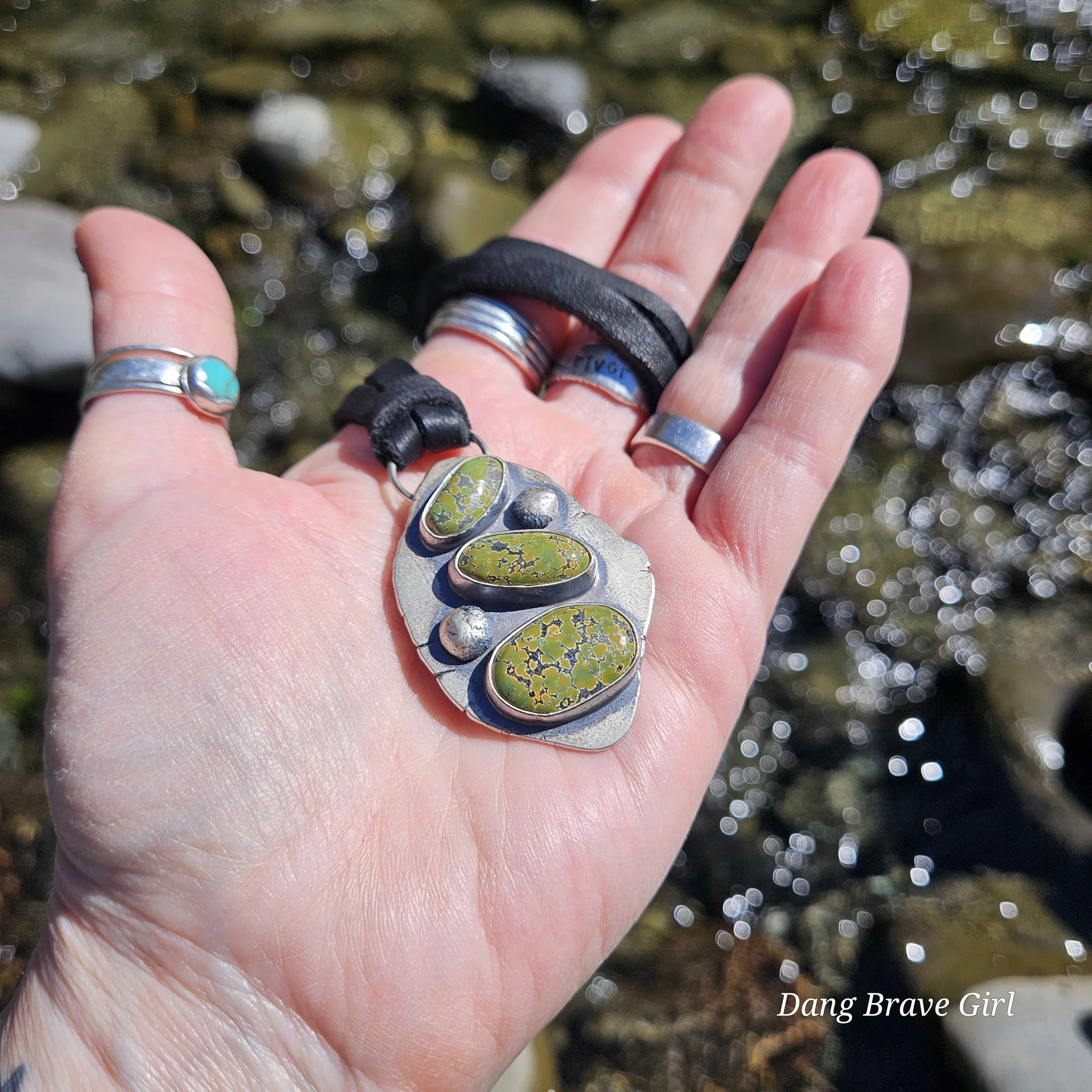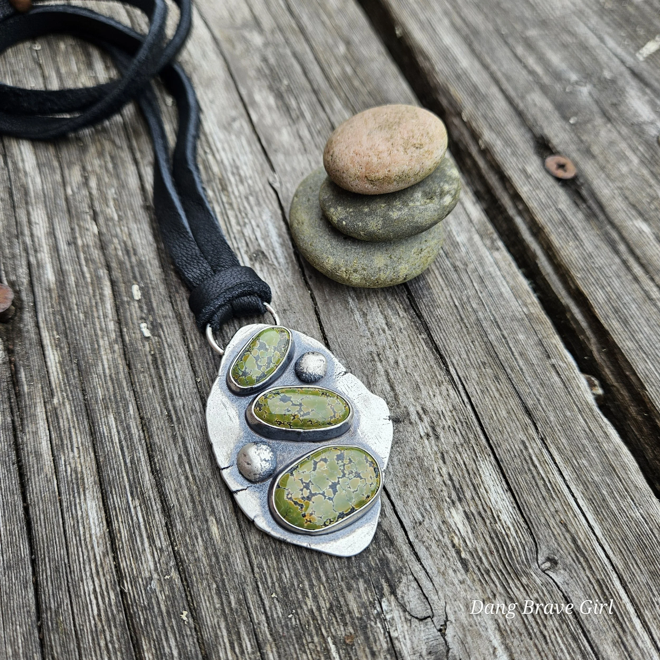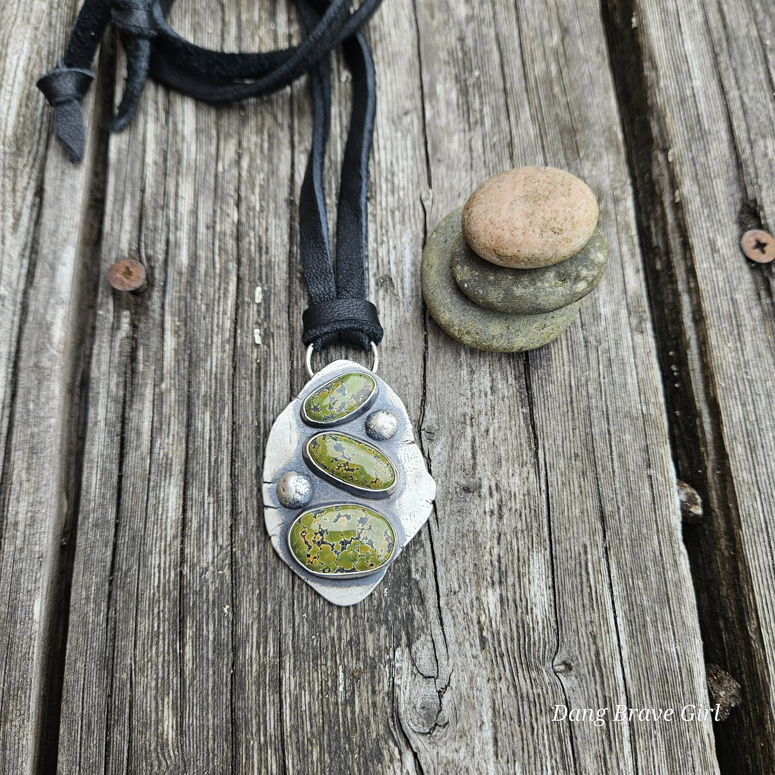 Three lovely stones of Bamboo Mountain Turquoise and two handmade sterling silver rocks make up this chunky stack. It’s weighty (nearly 27 grams), unique and substantial….and amazing!