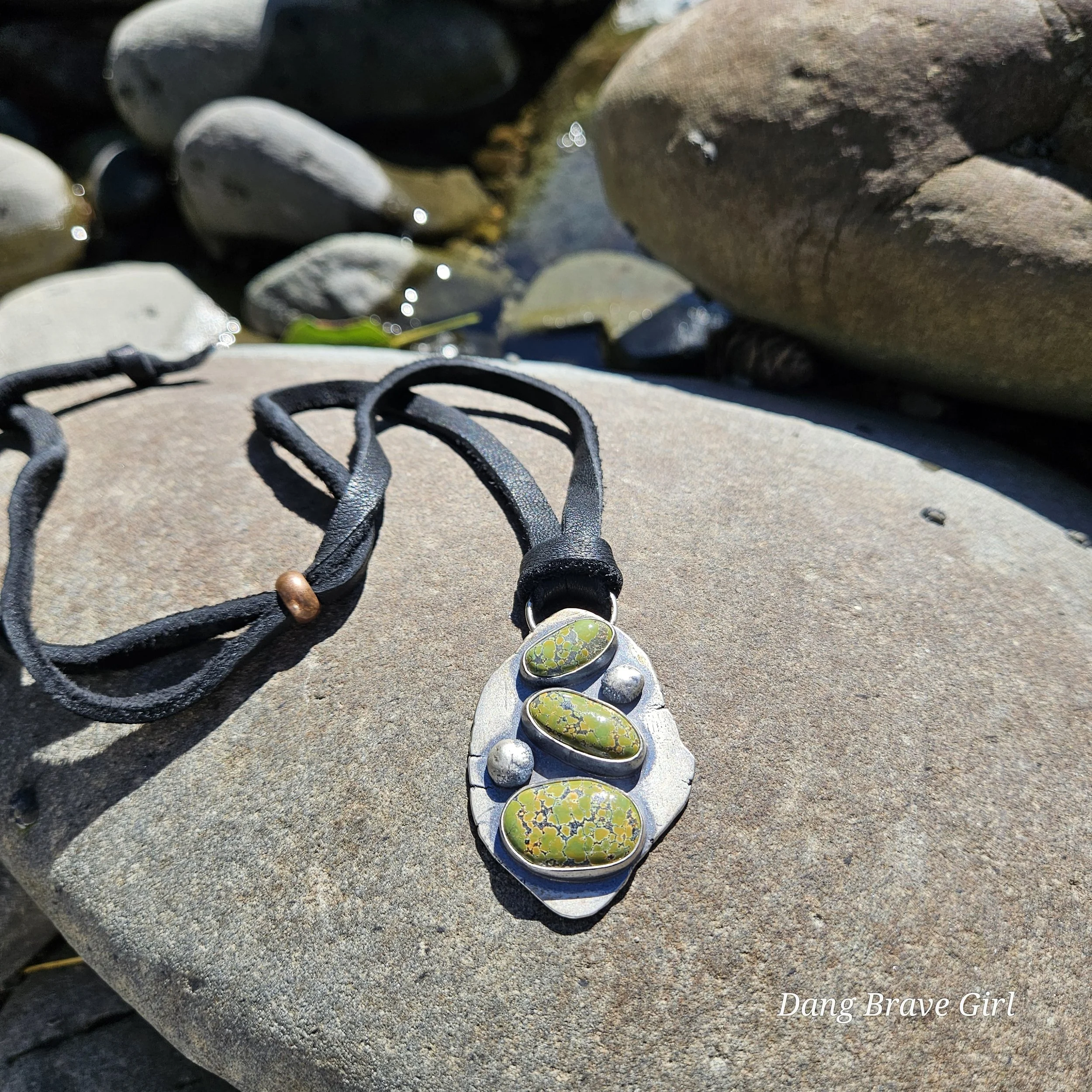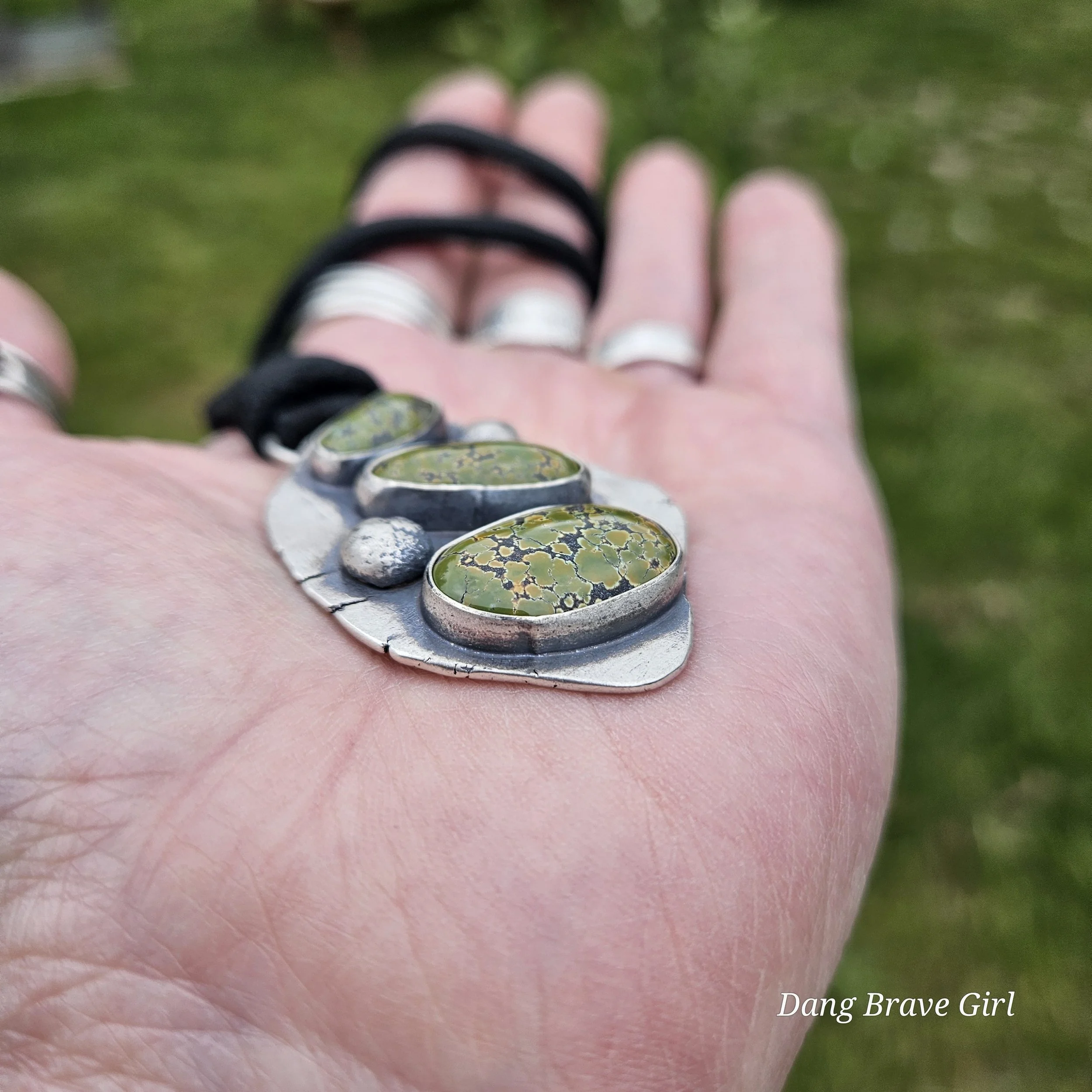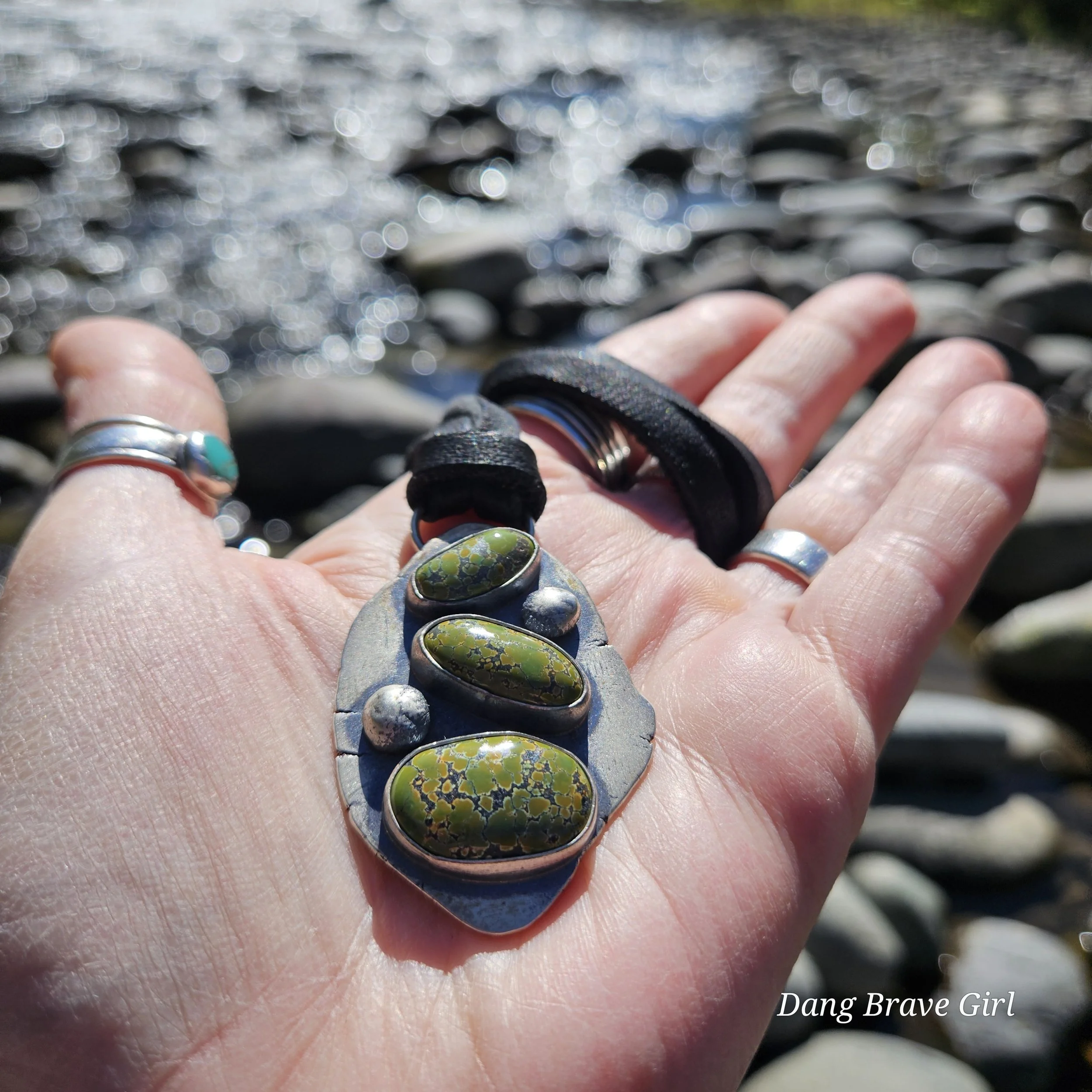 Three lovely stones of Bamboo Mountain Turquoise and two handmade sterling silver rocks make up this chunky stack. It’s weighty (nearly 27 grams), unique and substantial….and amazing!