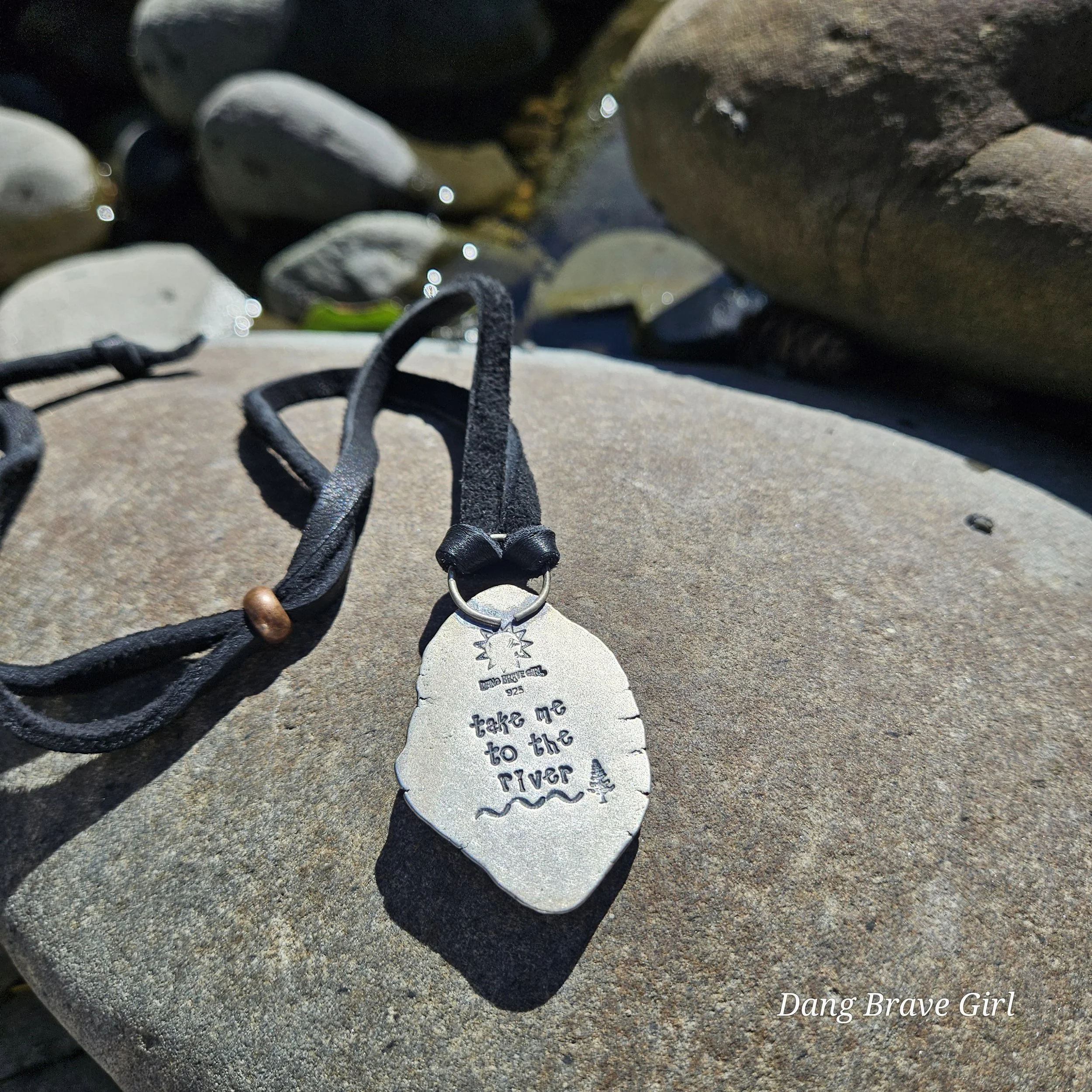 It measures 1 3/8” wide, over 2 1/4” tall, including the bail and is finished with the reminder hand stamped on the back, a rich patina, sweet polish and generously adjustable length of complimenting black leather.