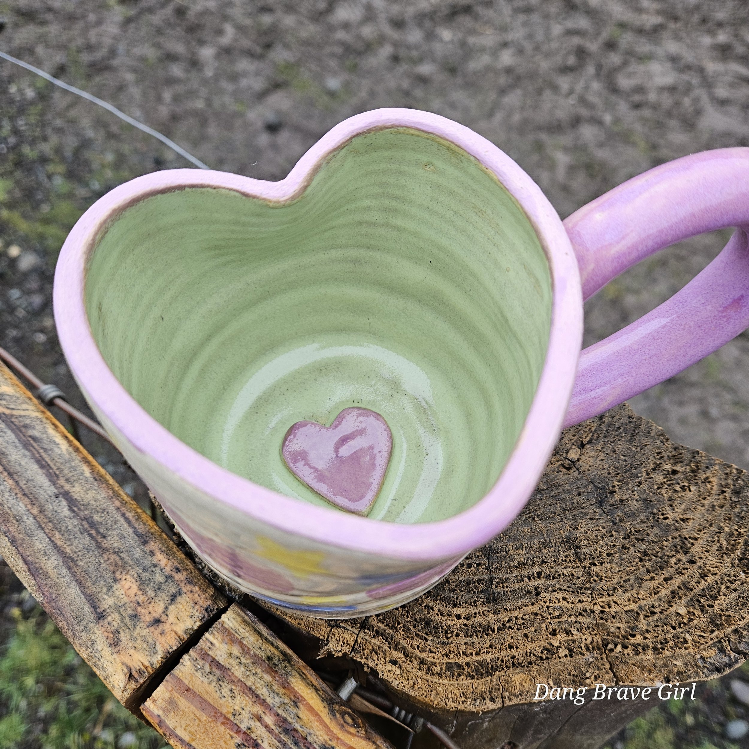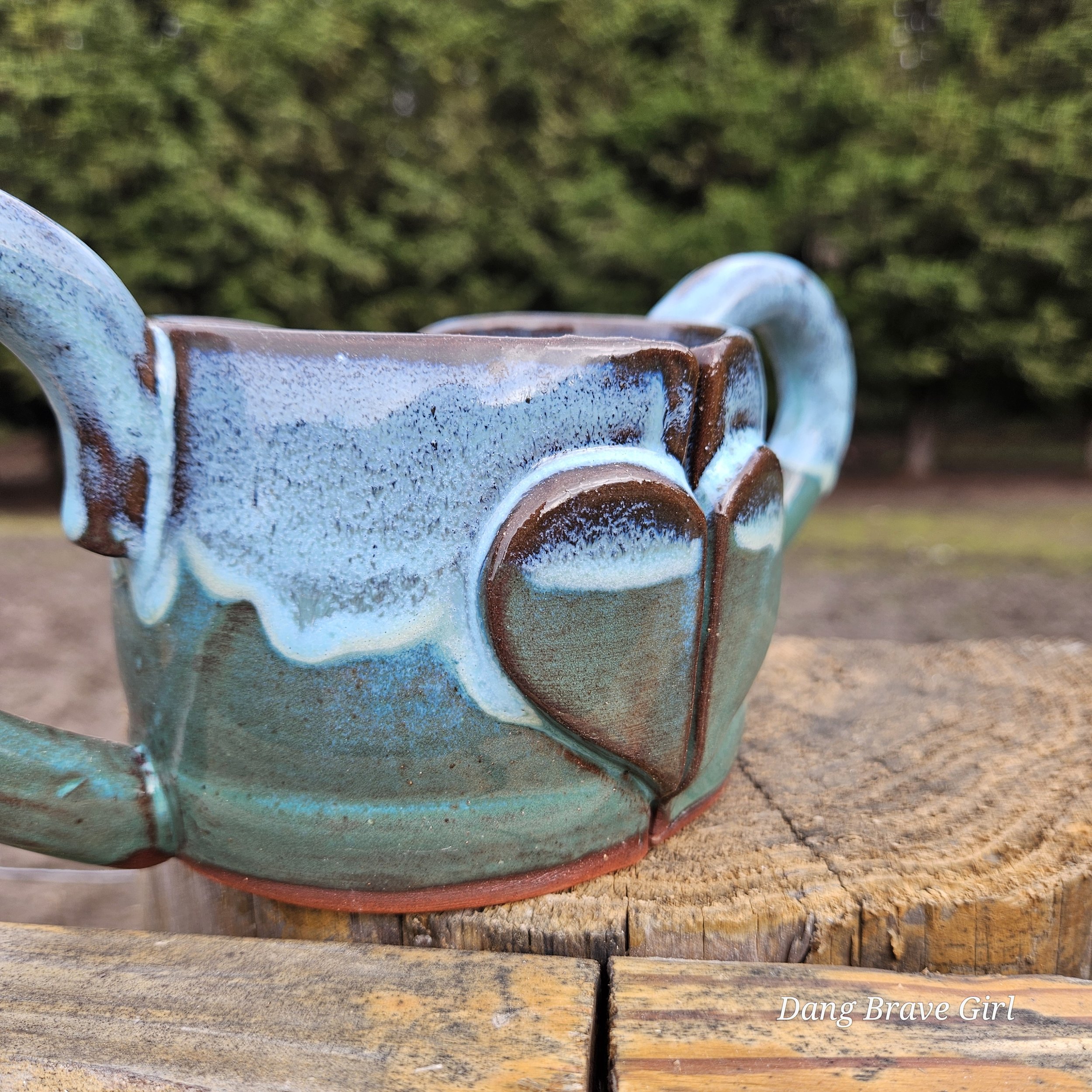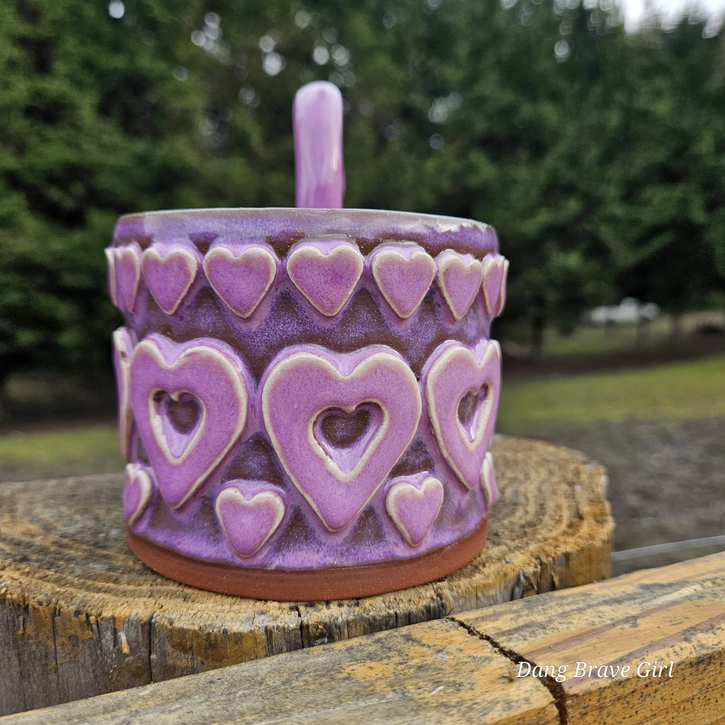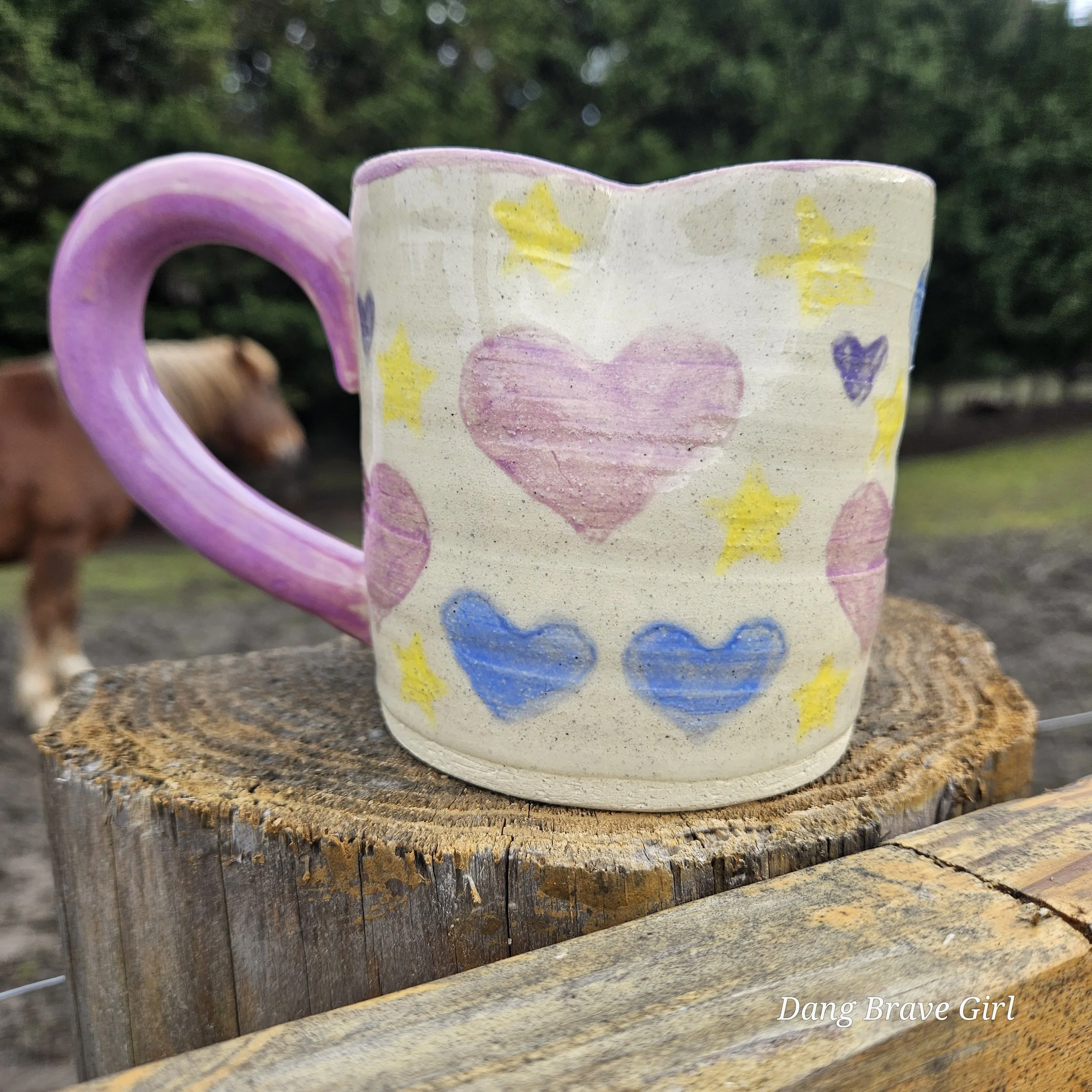 Handmade by the DBH with a creamy white stoneware, this heart shaped mug is hand painted with different colored hearts all the way around. It’s even got a surprise at the bottom of the mug on the inside! Highlighted with my new favorite glaze….fairy dust!