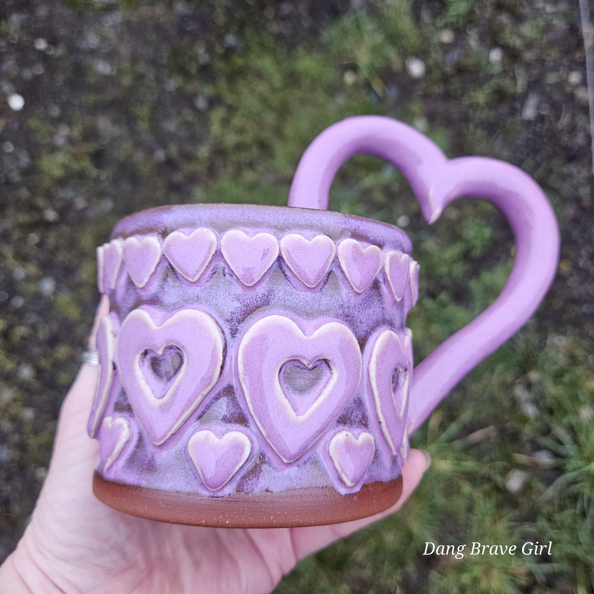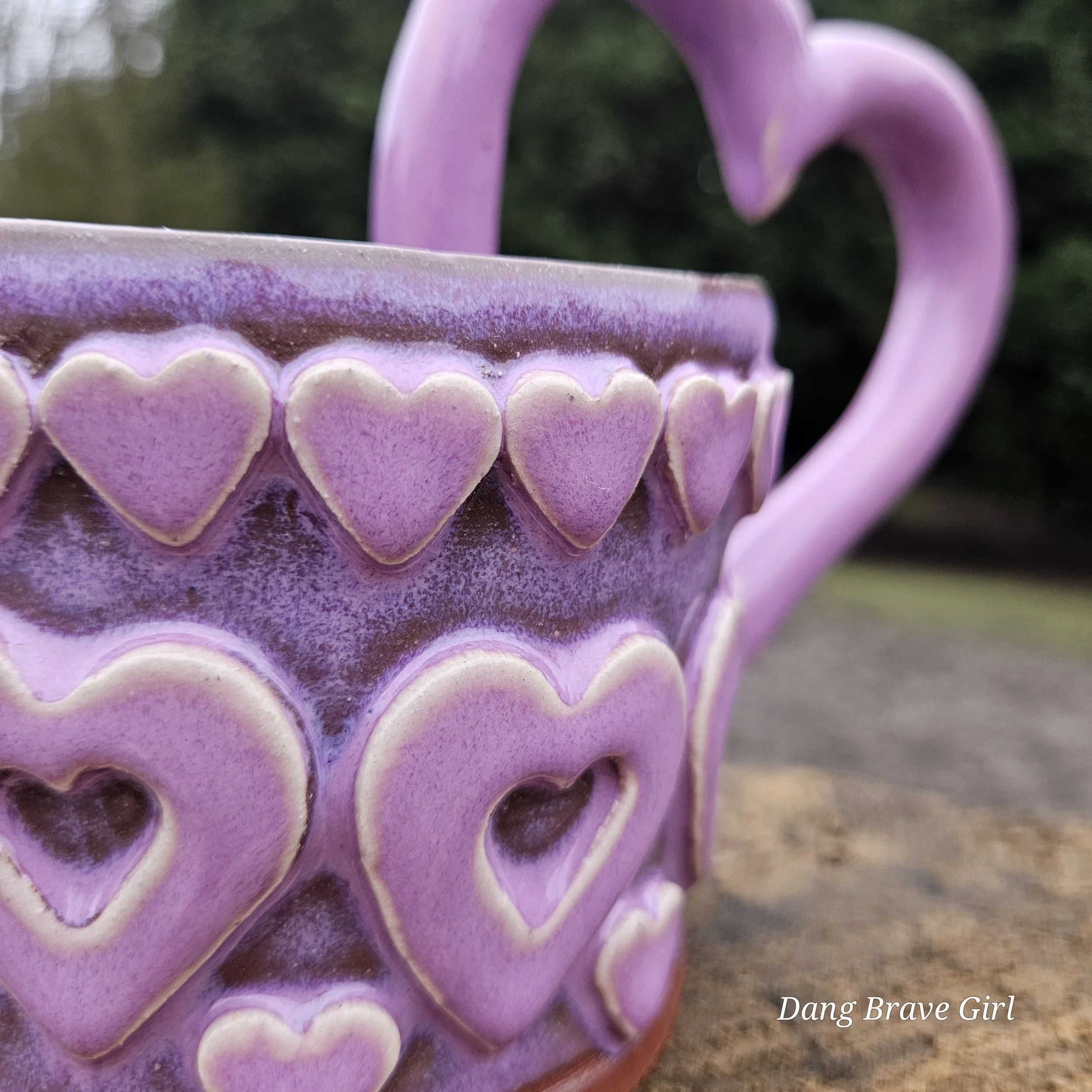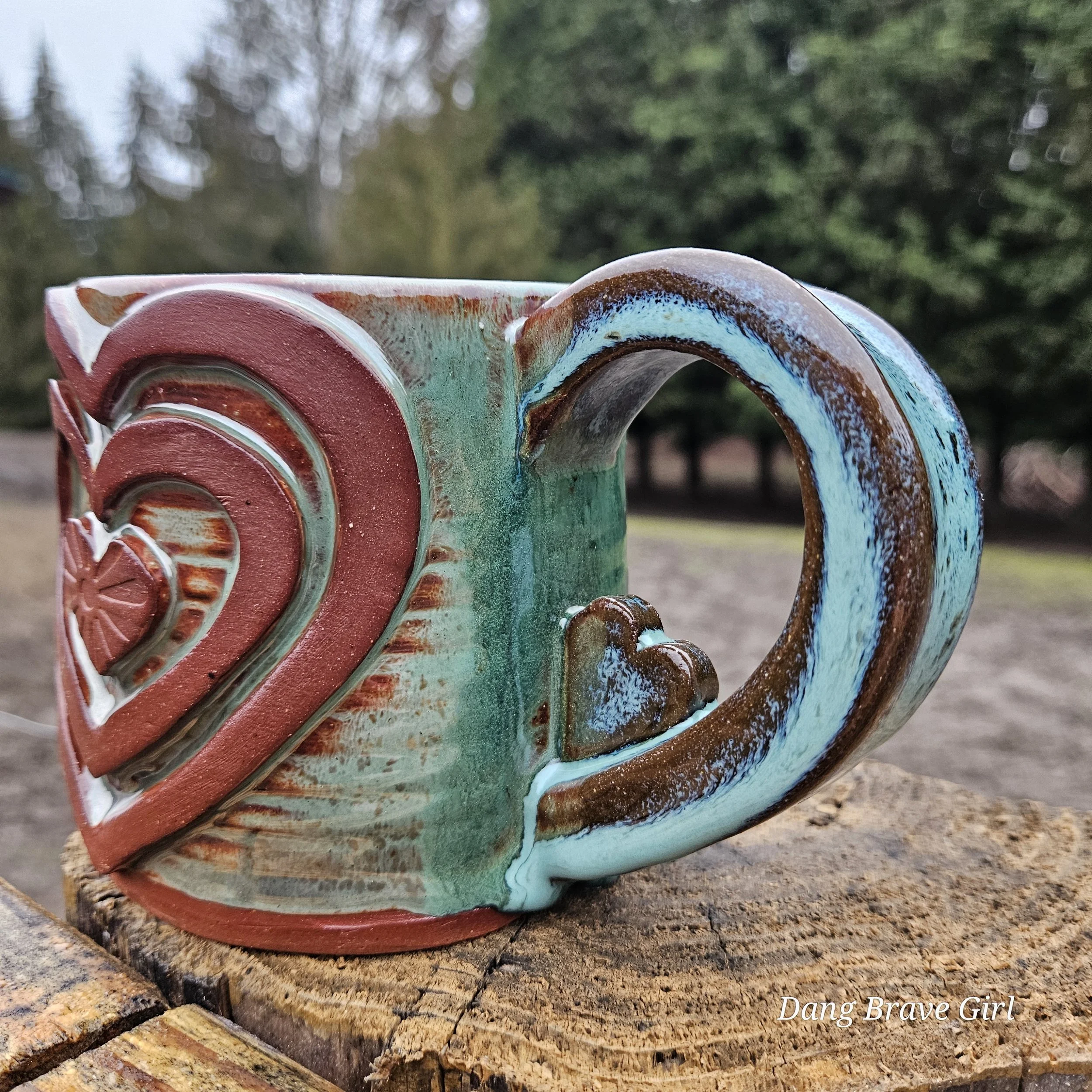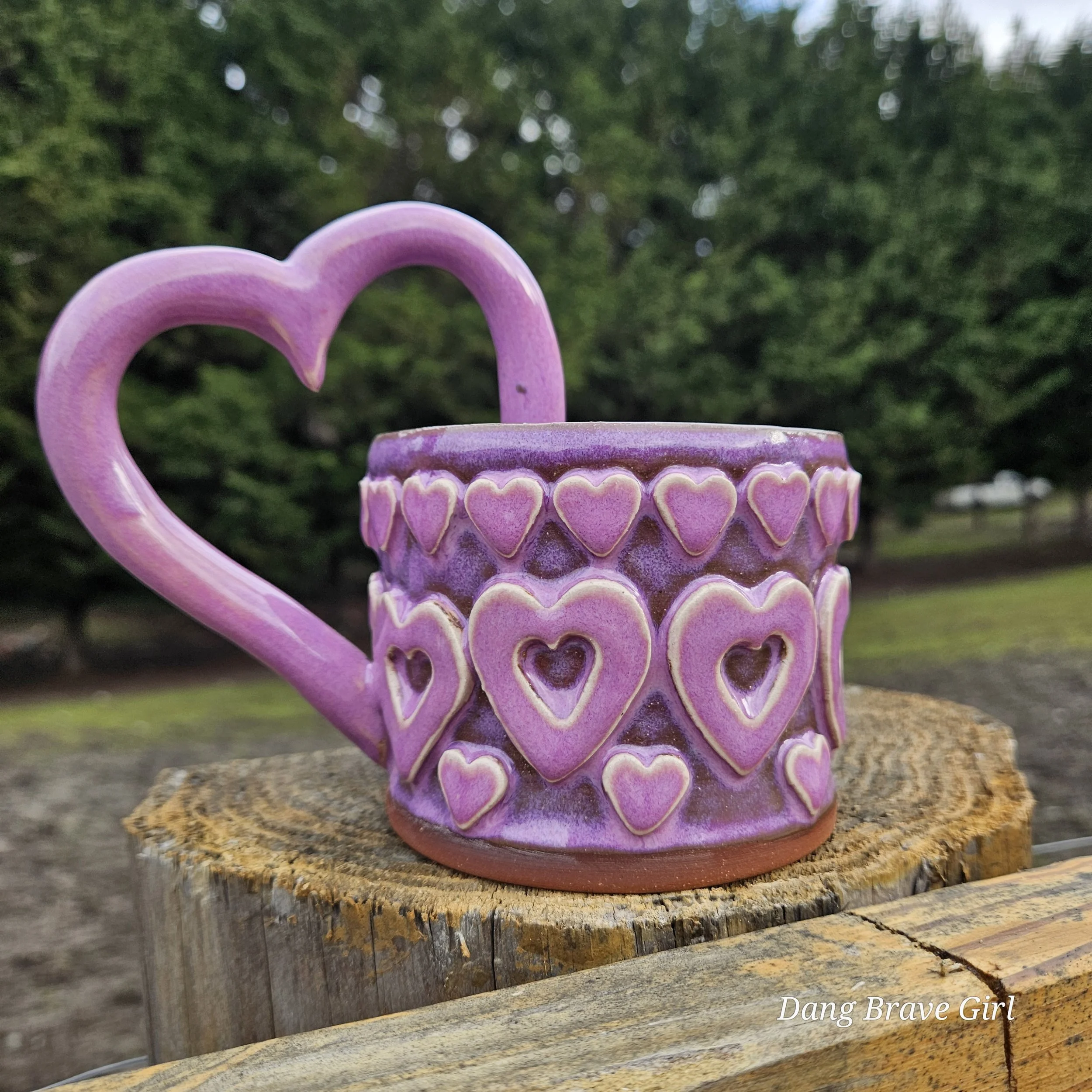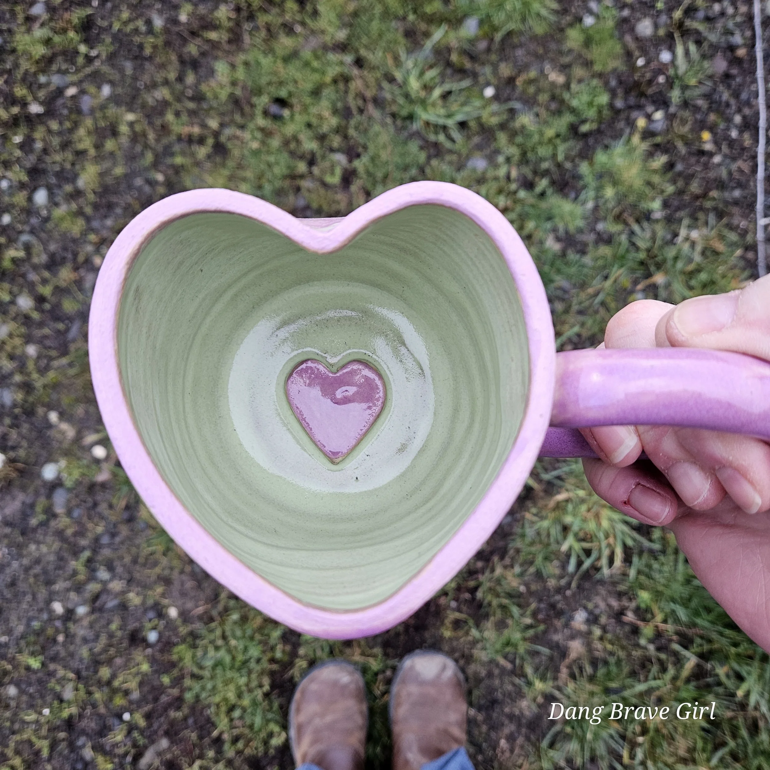 Handmade by the DBH with a creamy white stoneware, this heart shaped mug is hand painted with different colored hearts all the way around. It’s even got a surprise at the bottom of the mug on the inside! Highlighted with my new favorite glaze….fairy dust!