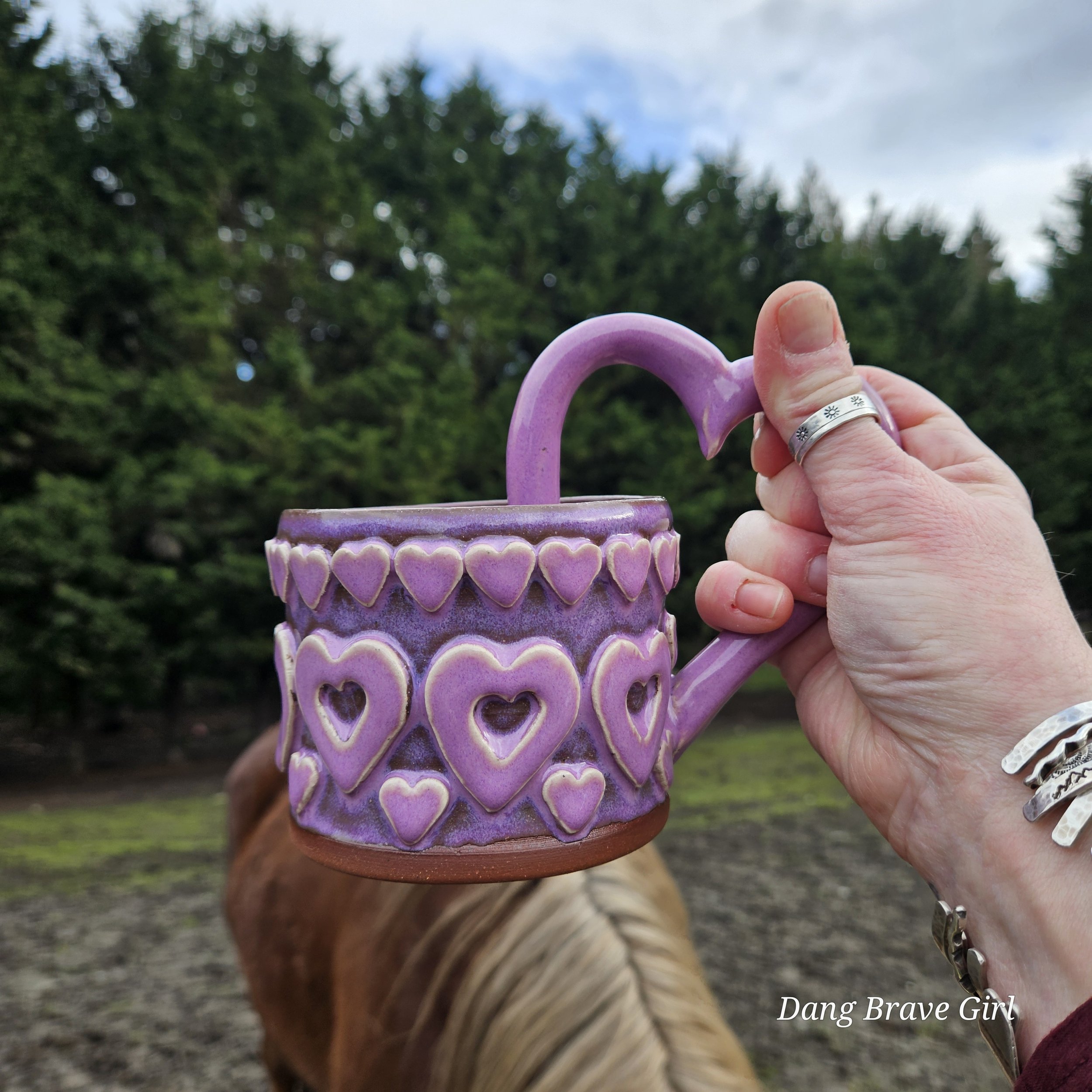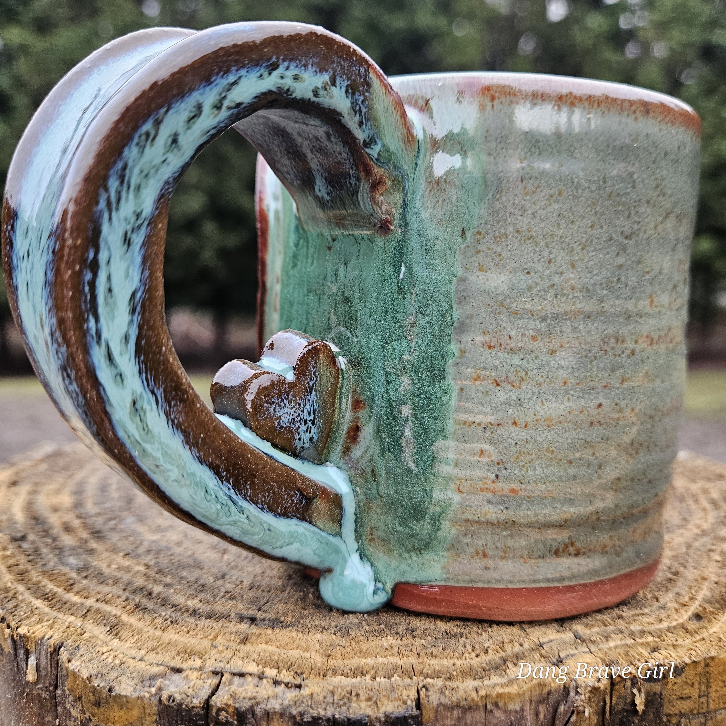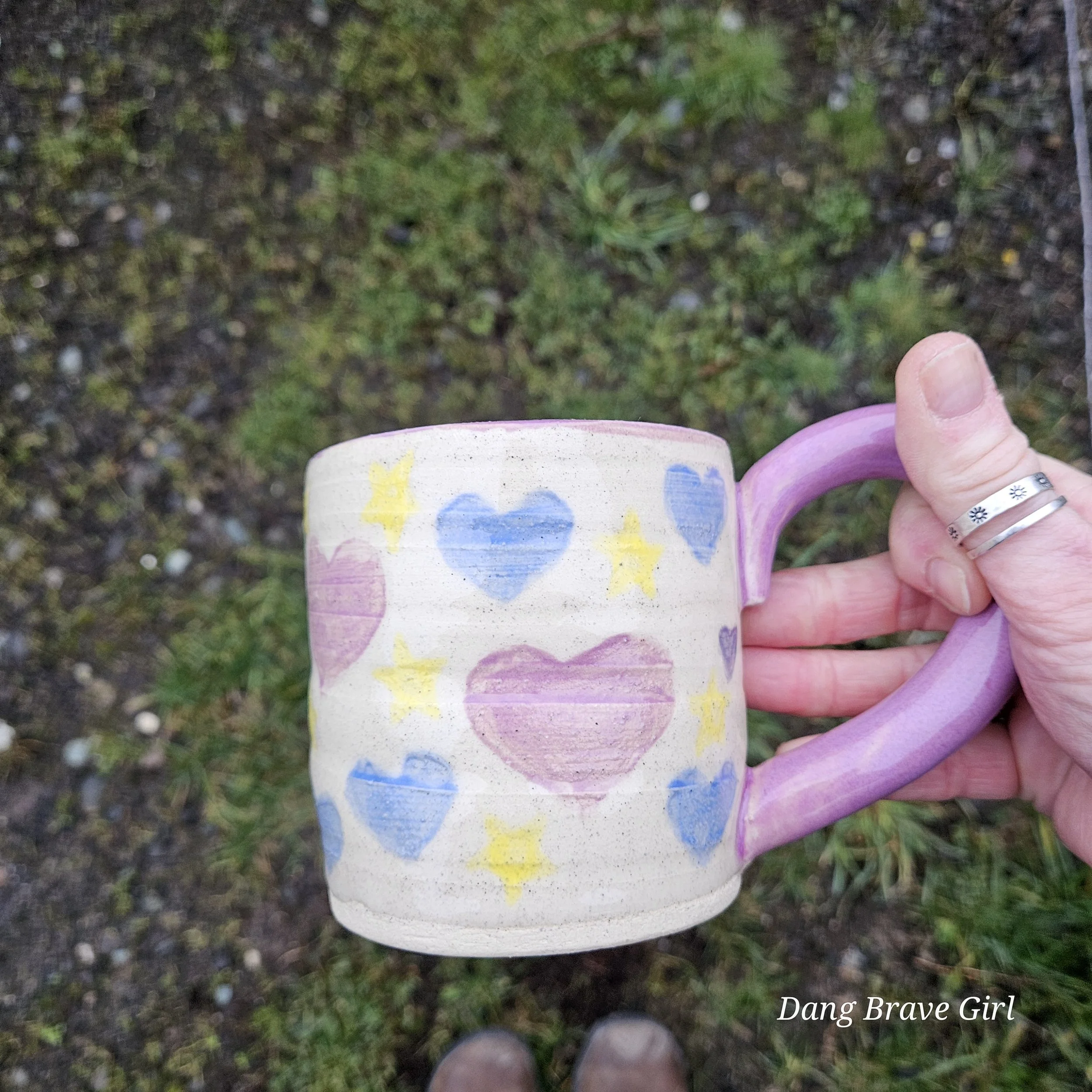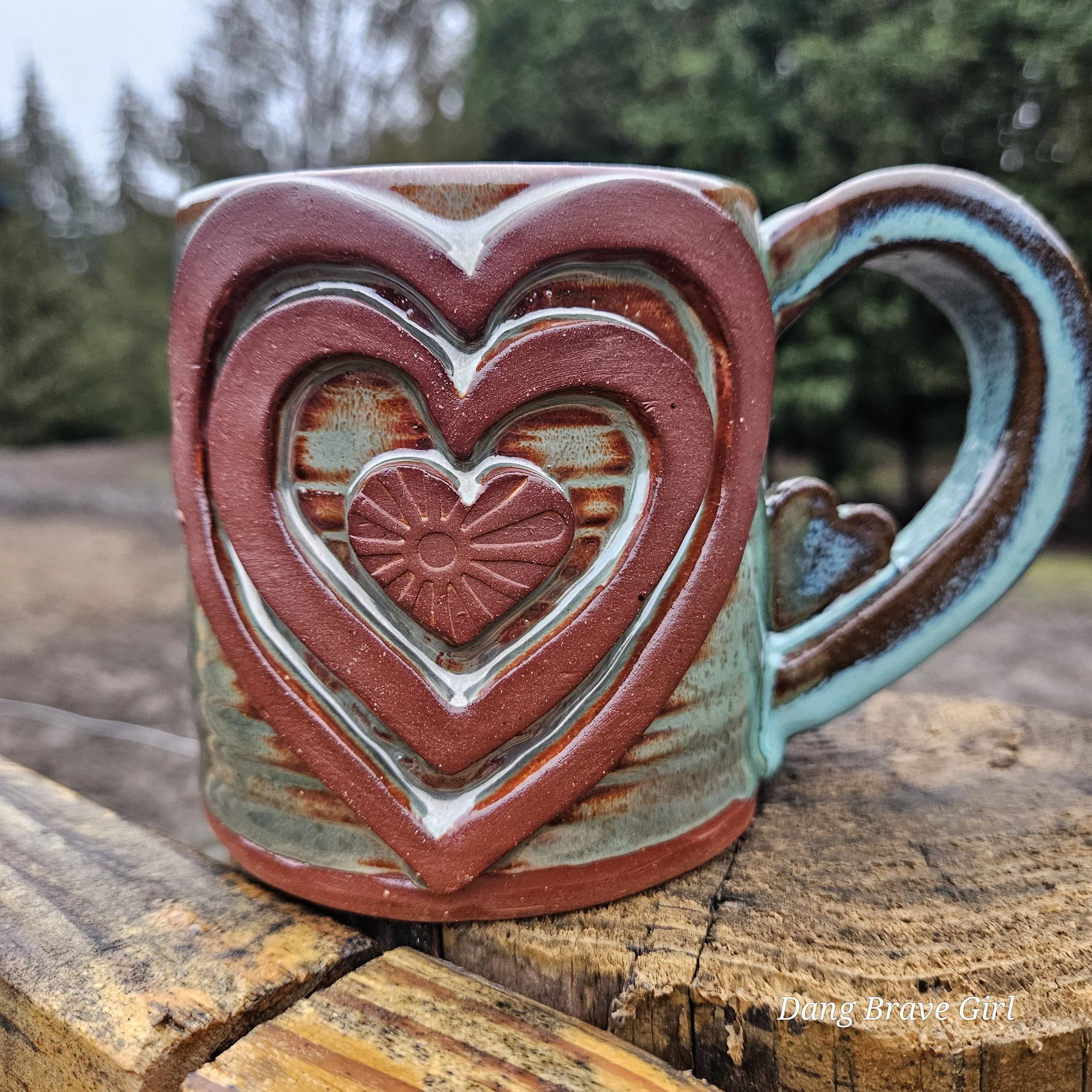 Handmade by the DBH with a creamy white stoneware, this heart shaped mug is hand painted with different colored hearts all the way around. It’s even got a surprise at the bottom of the mug on the inside! Highlighted with my new favorite glaze….fairy dust!