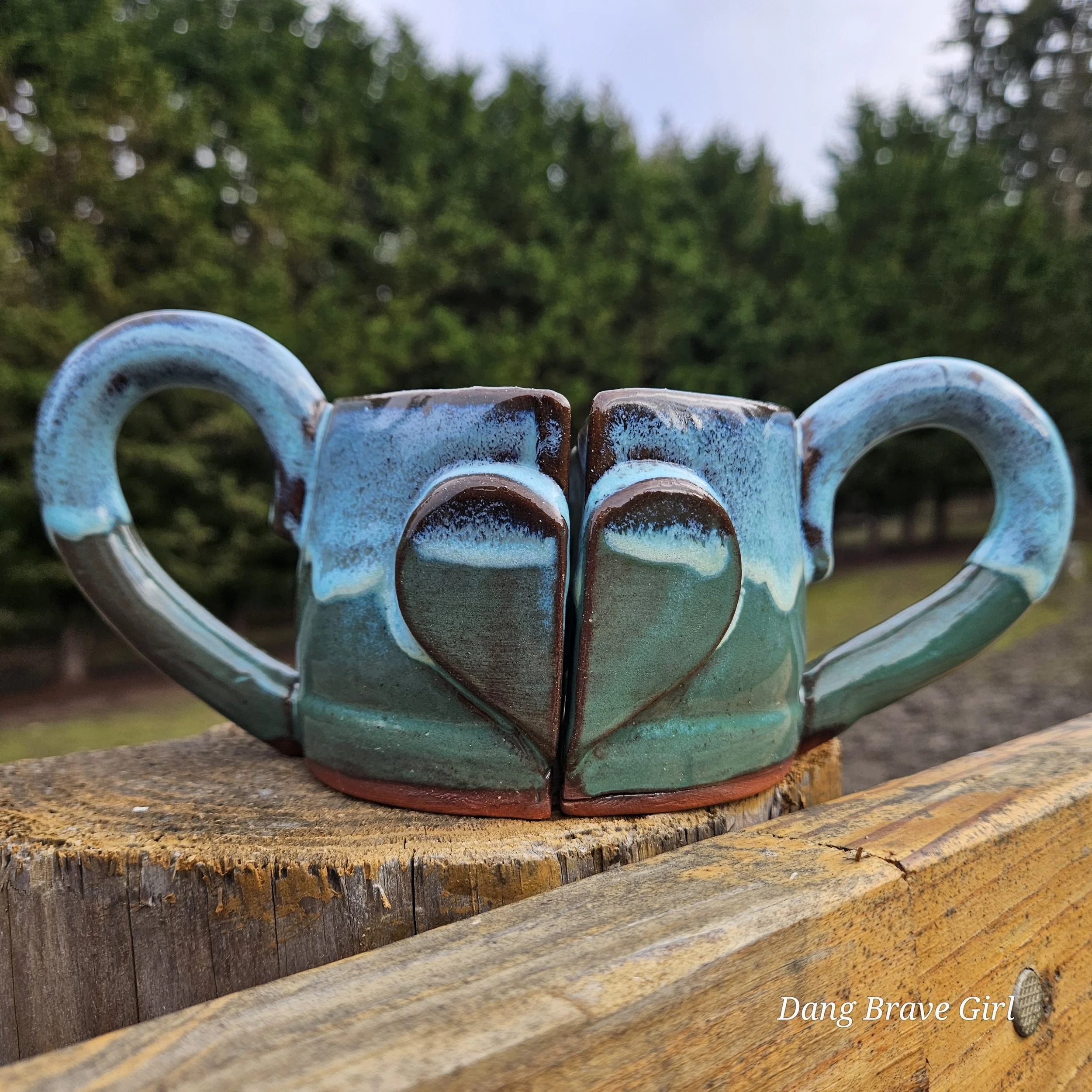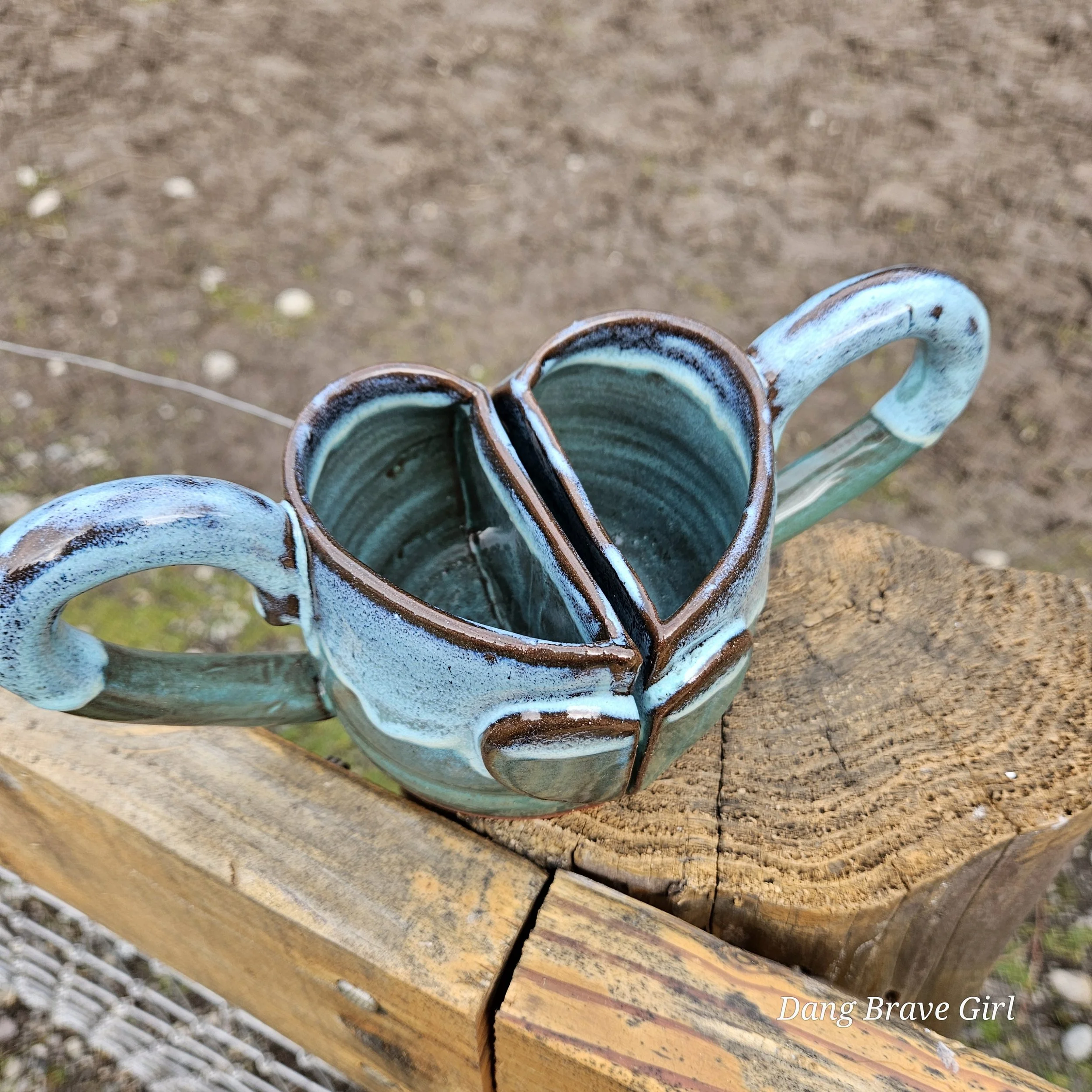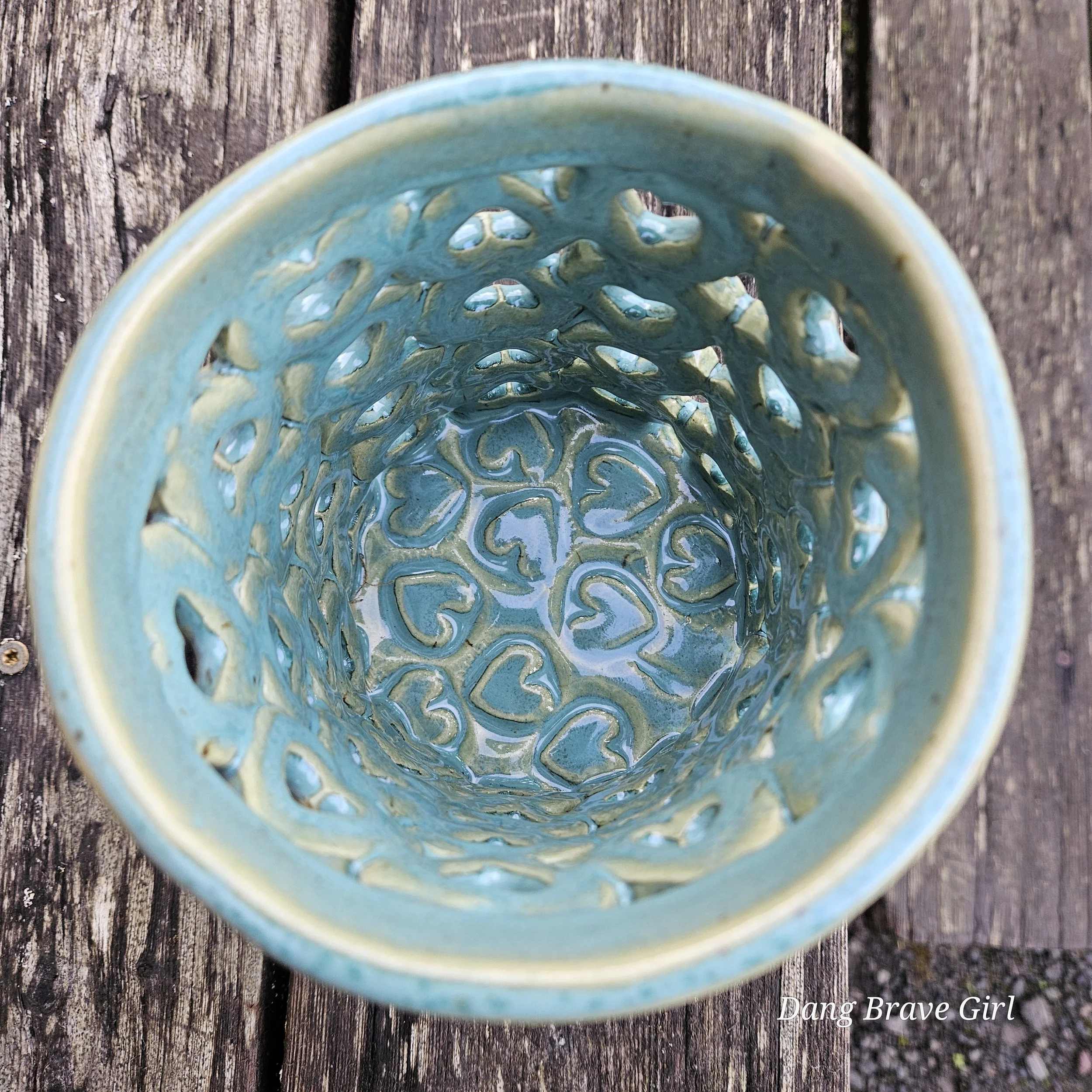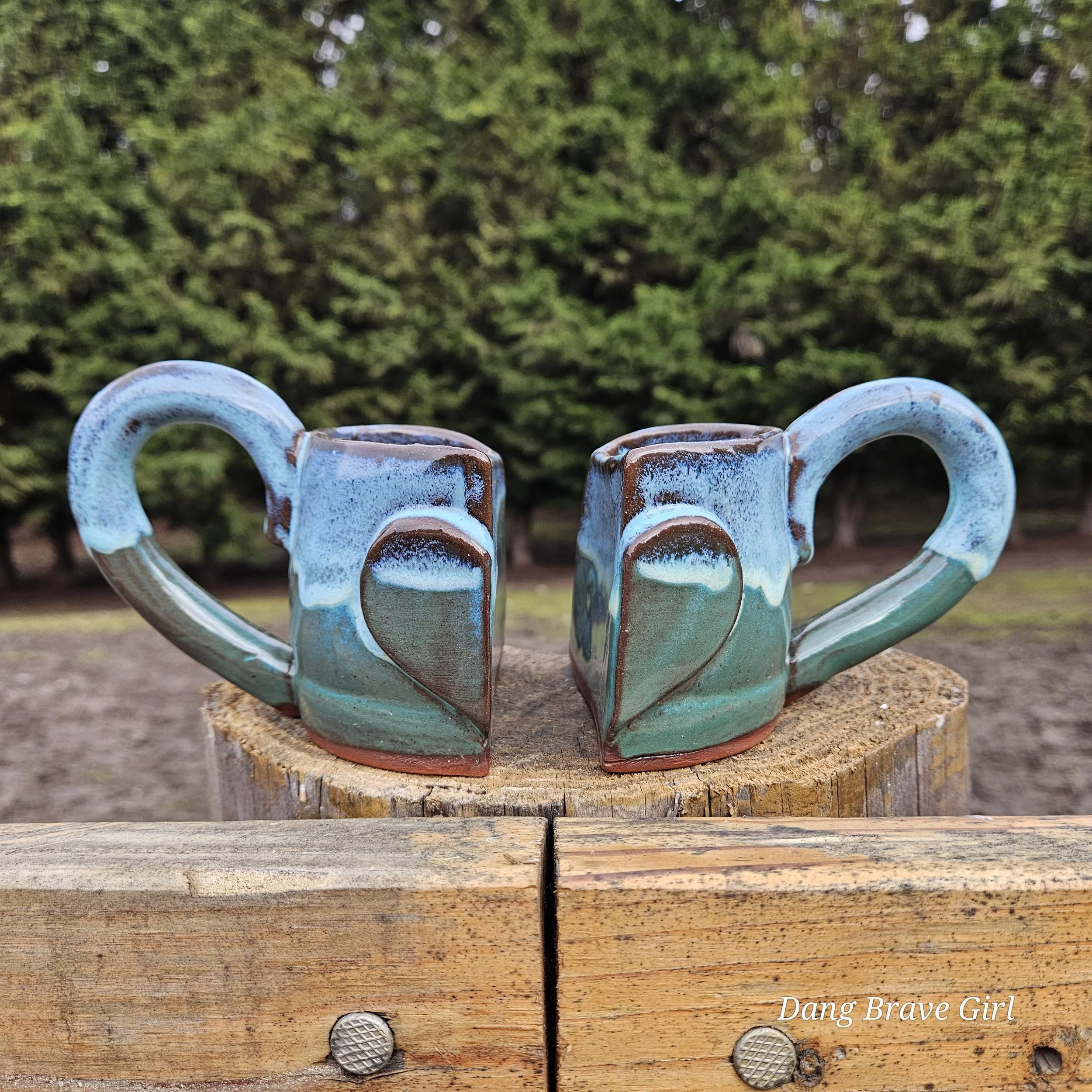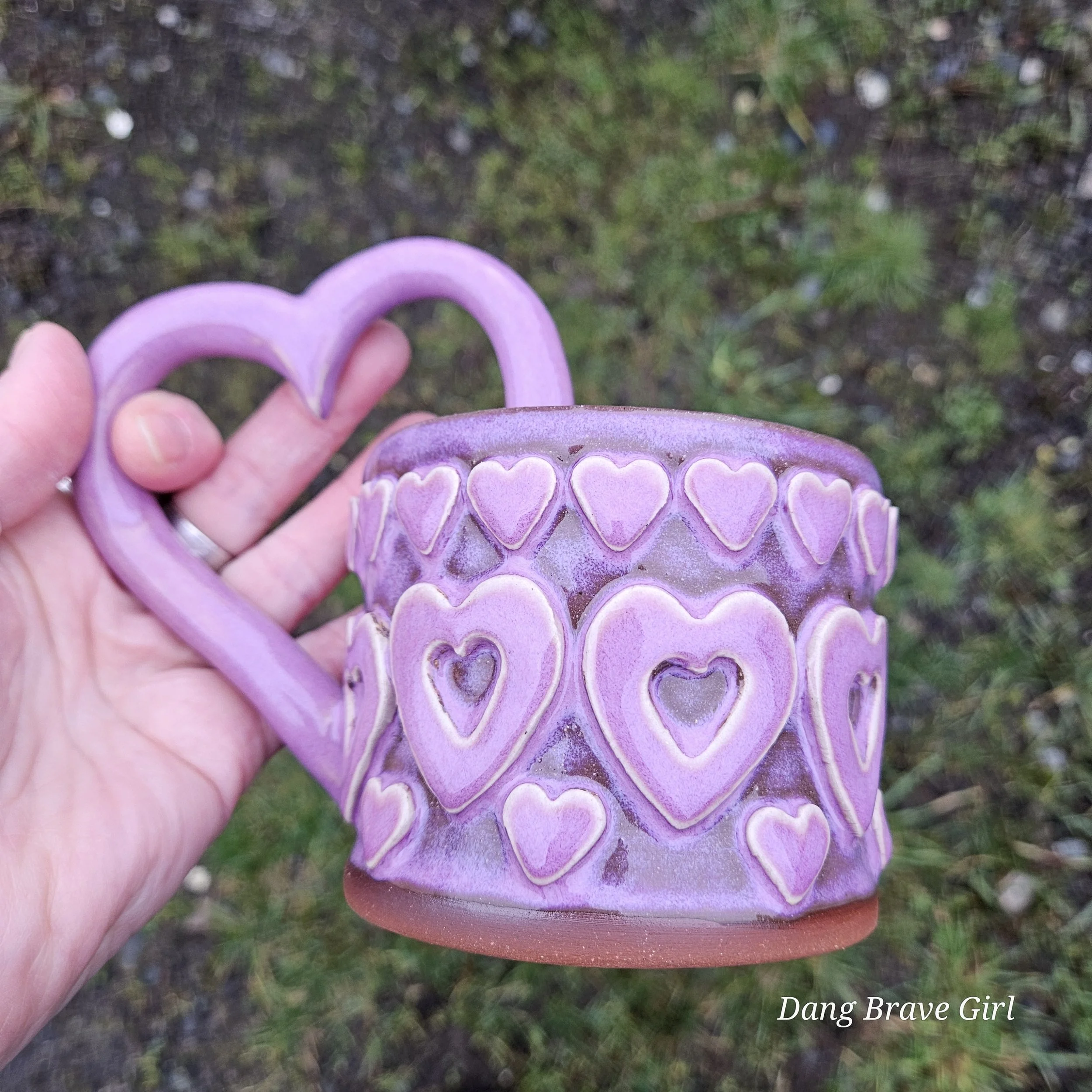 Handmade by the DBH with a creamy white stoneware, this heart shaped mug is hand painted with different colored hearts all the way around. It’s even got a surprise at the bottom of the mug on the inside! Highlighted with my new favorite glaze….fairy dust!